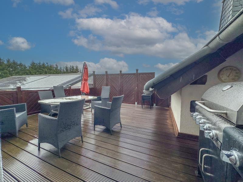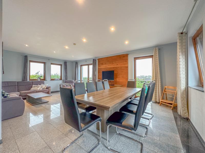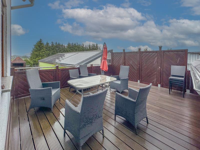 Dit huis kenmerkt zich door rust en ruimte. Het is de perfecte keuze als je met een vrienden of familie groep lekker tijd wil doorbrengen. Door de ligging, boven op een heuvel in een natuurrijk gebied in het gehuchtje Feuerscheid, geniet van prachtige vergezichten. De woonkamer biedt genoeg ruimte voor gezellig samen zijn. Het dakterras is de plek waar je lekker kan BBQ-en en van het uitzicht geniet. De ruime tuin met speeltoestellen en spa-bad (tegen betaling) maken het geheel af