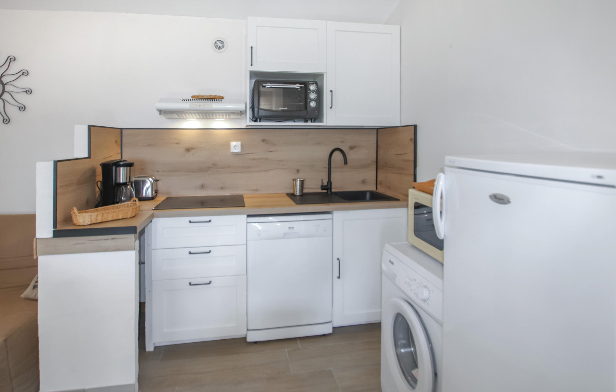 Keuken heeft warm/koud waterEl.fornuis en ovenKoelkastAfzuigkapVriesvakKoffiezetapparaatMagnetronWasmachineVaatwasserStofzuiger1 TVWC, zonder wastafel
