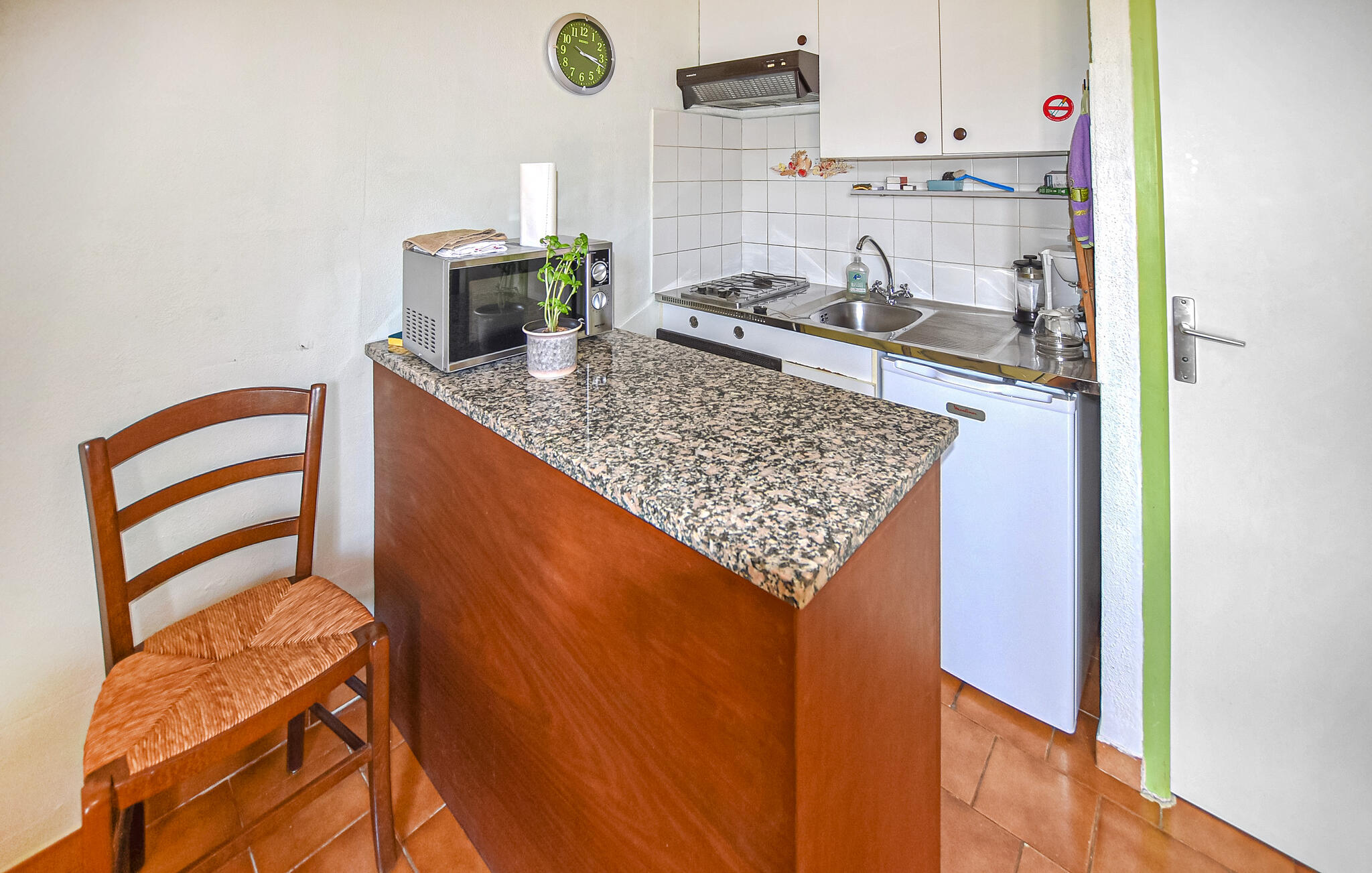 Keuken heeft warm/koud waterElektrisch fornuis met ovenKoelkastAfzuigkapVriesvakKoffiezetapparaatMagnetronGezamenlijke wasmachineWC, zonder wastafel