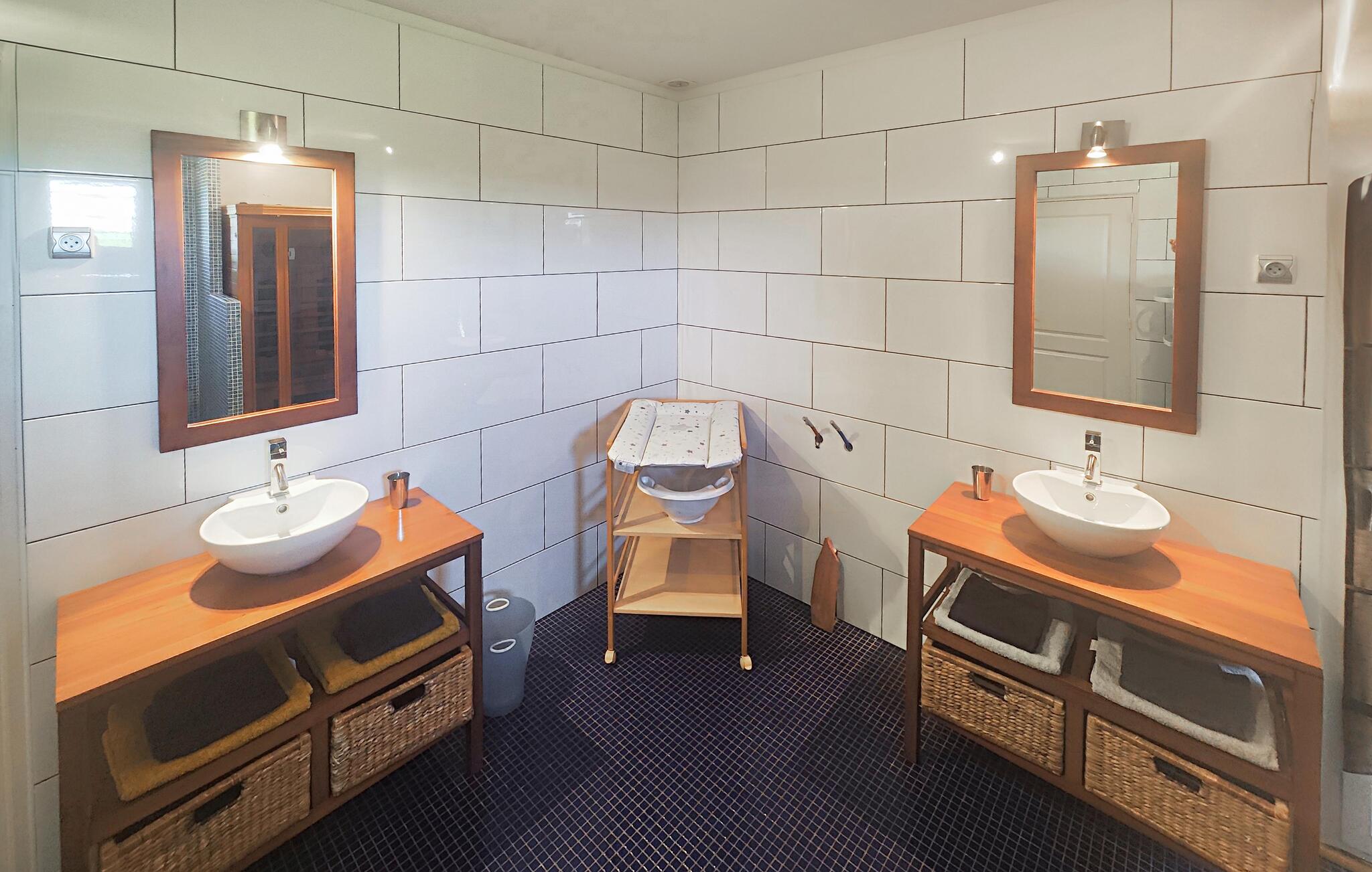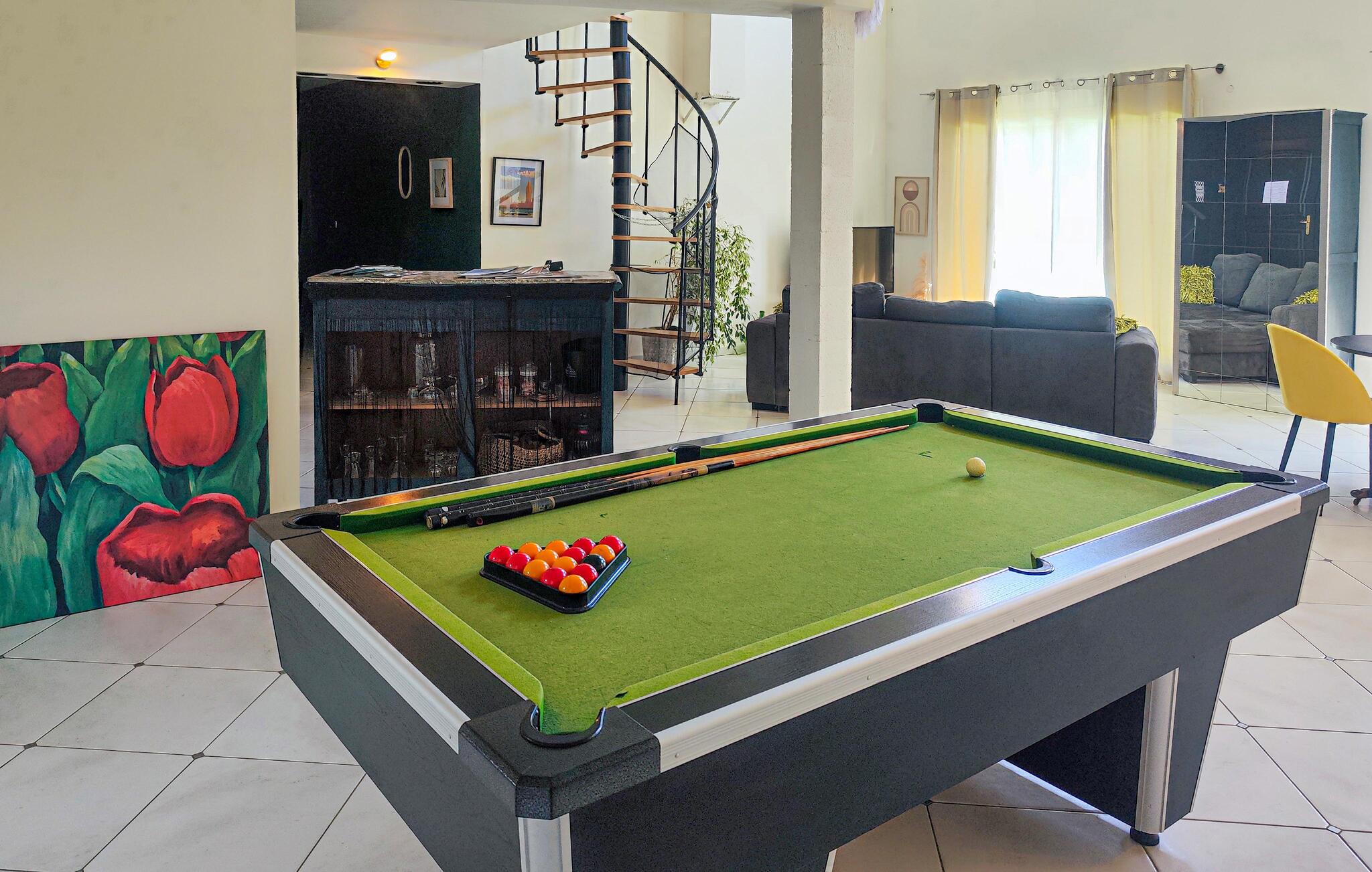 Dit moderne vakantiehuis op een landelijke locatie verwelkomt je met een licht en ruim interieur dat je veel ruimte biedt voor ontspannen dagen met je geliefden. Plan je activiteiten tijdens harmonieuze maaltijden, neem het tegen elkaar op aan de pooltafel en sluit een bewogen dag af met een leuke spelletjesavond op de gezellige bank.