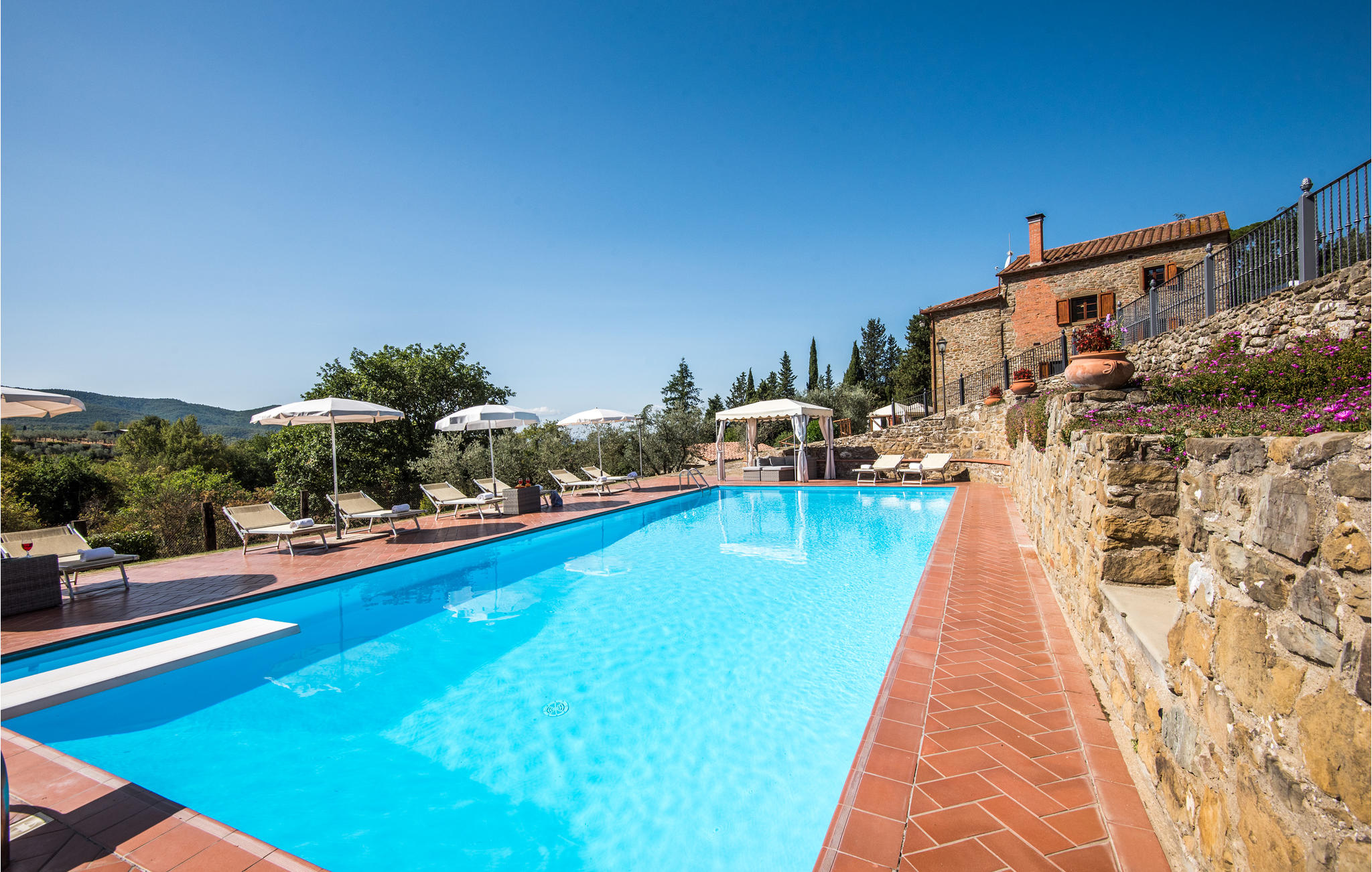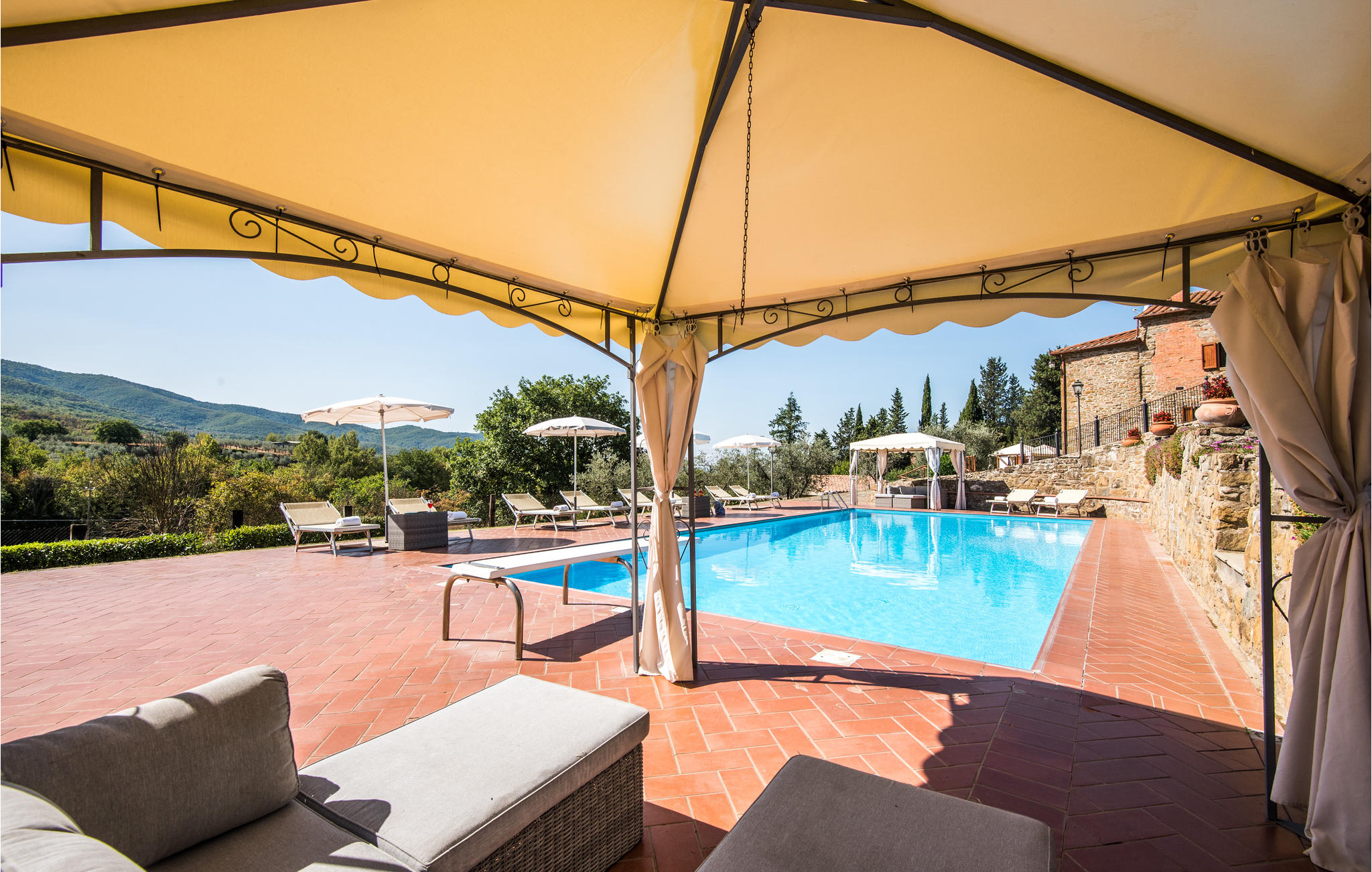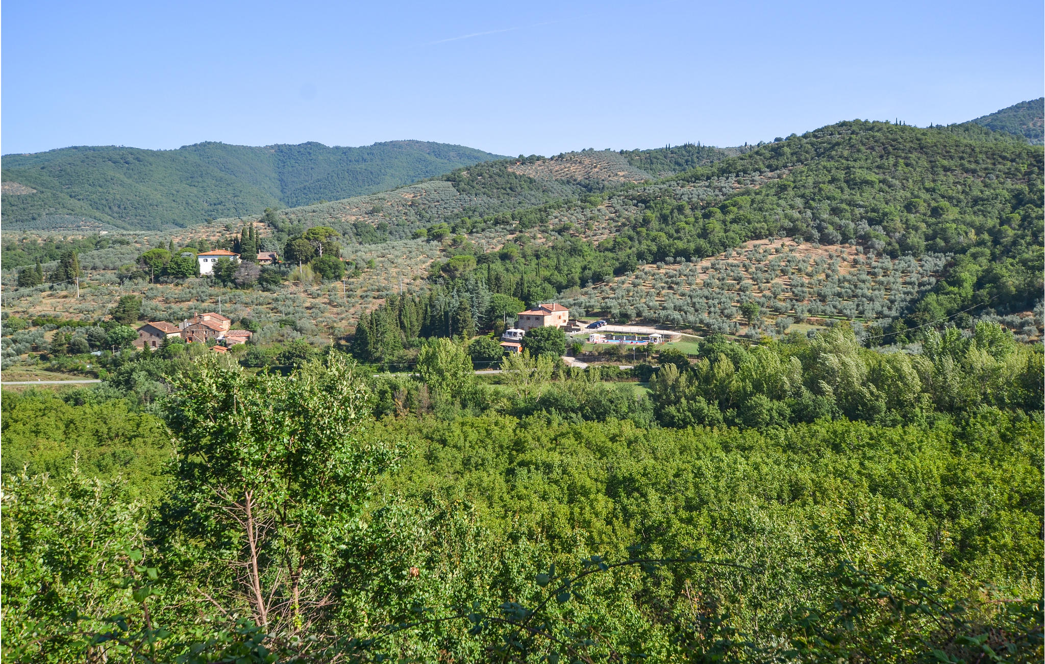 Op ongeveer 7 km van Castiglion Fiorentino ligt deze voormalige boerderij in een rustig zijdal, op een romantisch geïsoleerde positie. De inrichting is functioneel in rustieke Toscaanse stijl; de twee verdiepingen zijn alleen verbonden door een buitentrap. Voor het huis is er een overdekt terras met uitzicht op de vallei; ook diverse andere zitjes met barbecue, een buitenkeuken en een wasruimte. Ventilatoren in de slaapkamers en horren voor alle ramen aanwezig. Op het uitgestrekte parkachtige terrein kunnen gasten exclusief gebruik maken van het ruime zwembad met zonneterras - dit alles genesteld in olijfgaarden die overgaan in eikenbossen. Ideaal voor vakantiegangers die rust zoeken. Tegelijkertijd kunt u van hieruit gemakkelijk verschillende interessante excursiebestemmingen bereiken: Arezzo (22 km), Cortona (17 km), Montepulciano (35 km), Pienza (45 km) en het meer van Trasimeno (30 km). Castiglion Fiorentino biedt een pittoresk historisch centrum met diverse restaurants en bars, een kleurrijke weekmarkt en in de zomer diverse historische stadsfeesten rond het bovengelegen kasteel.