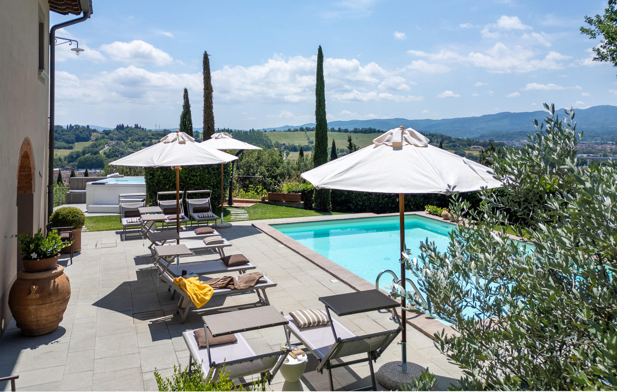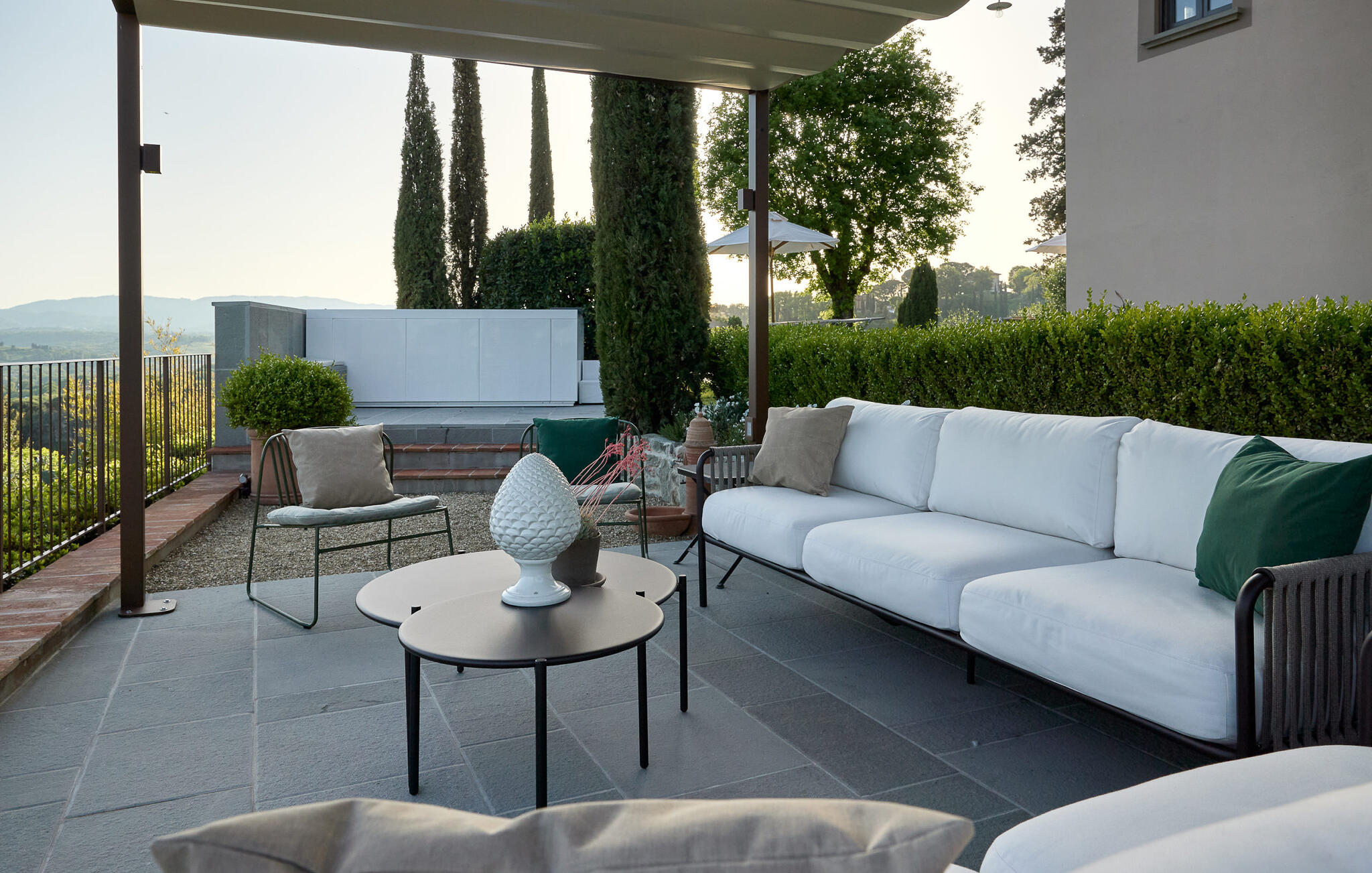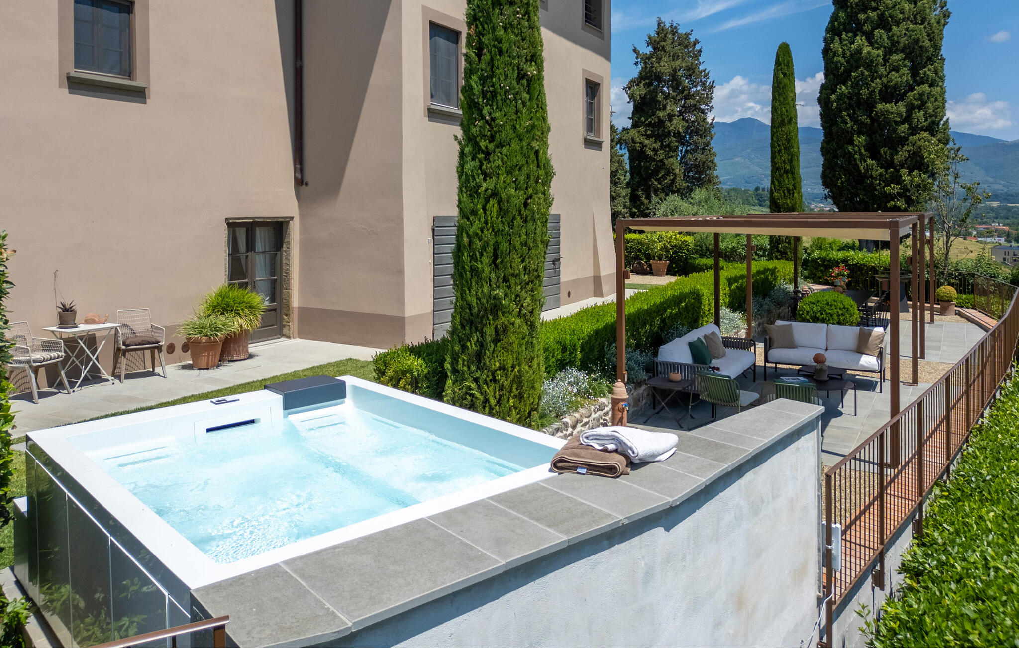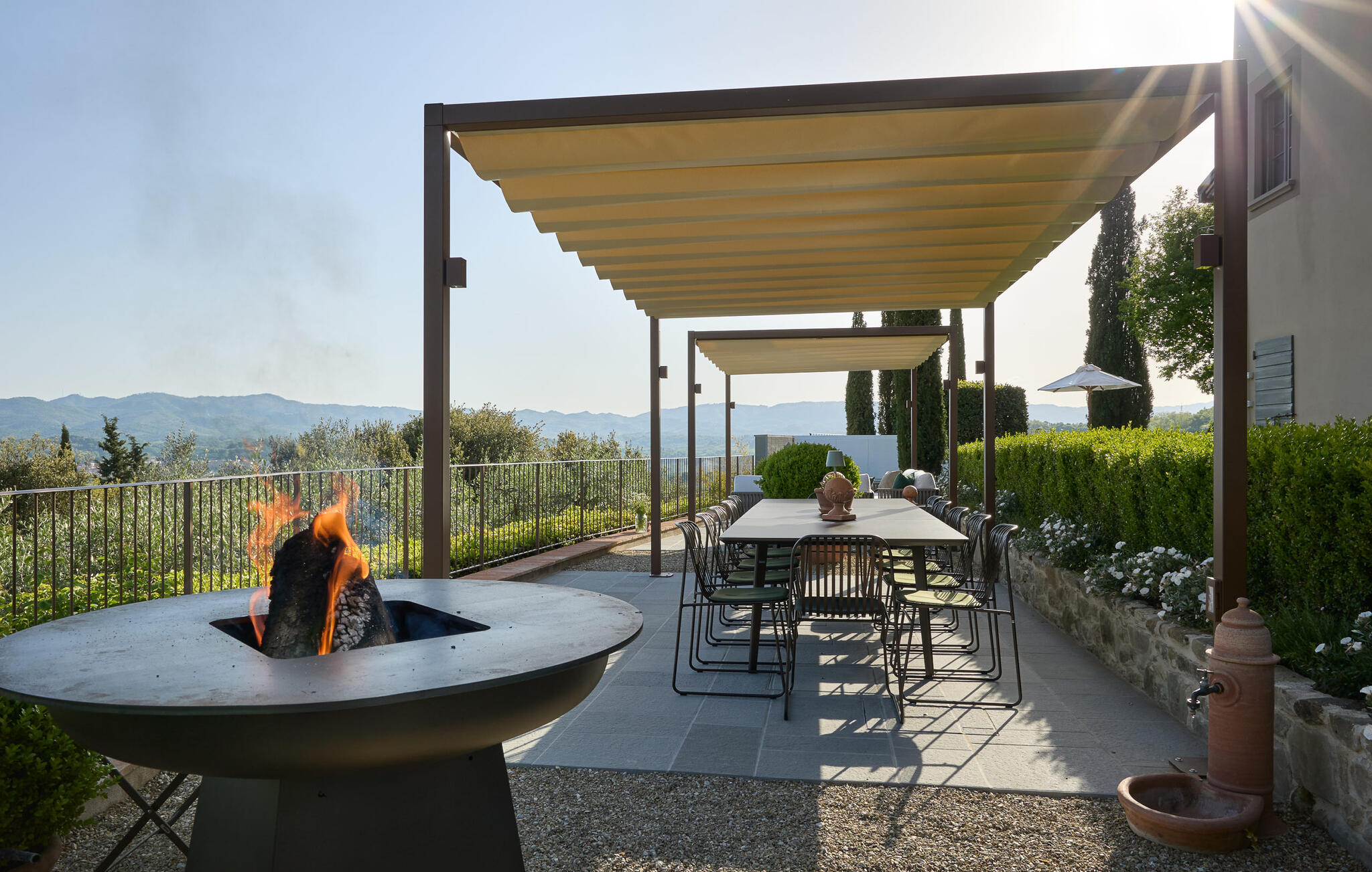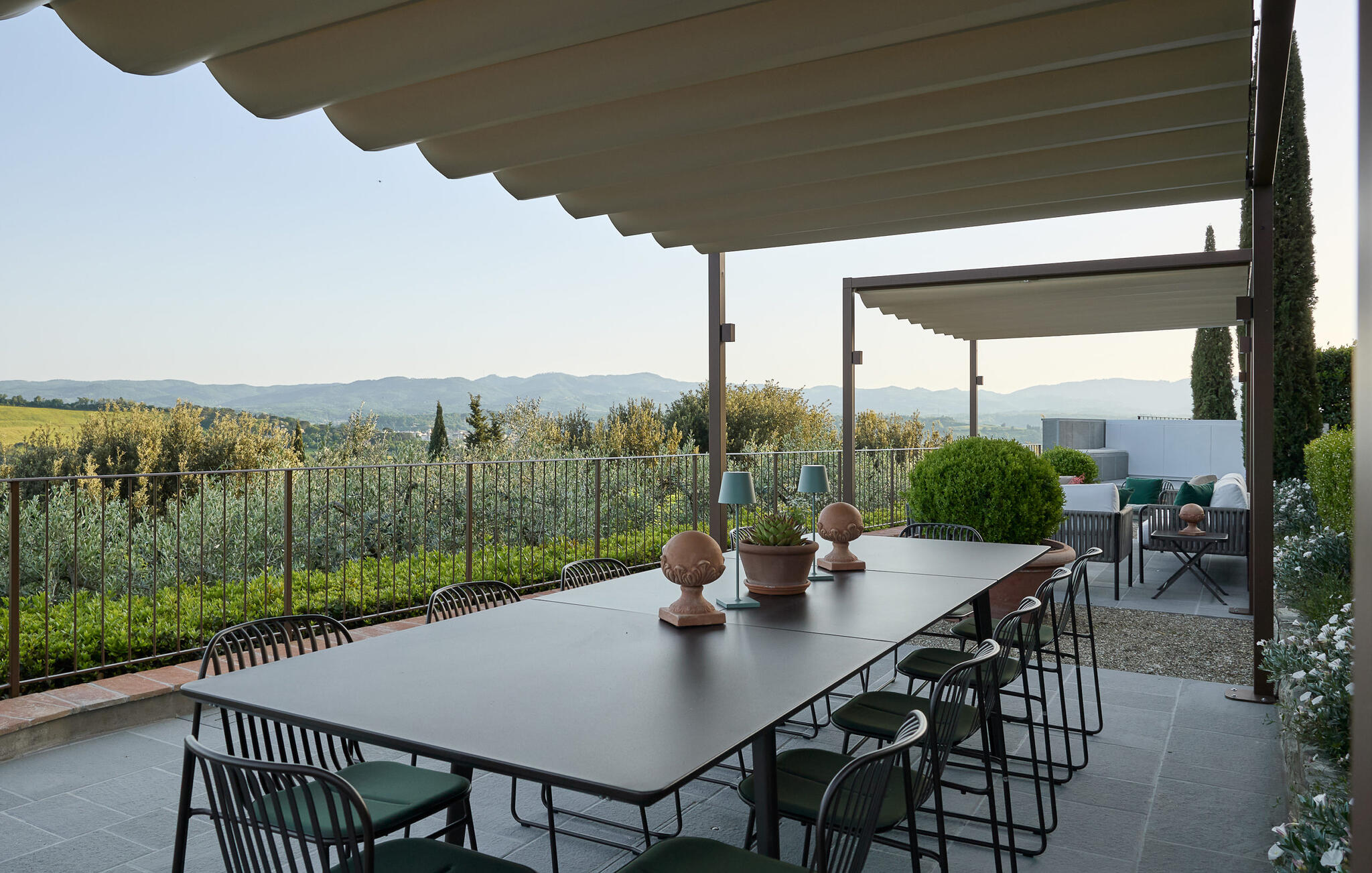 Het prachtige panoramische uitzicht vergezelt je in de buitenruimte terwijl je ontspant in de whirlpool of op comfortabele ligstoelen of samenkomt voor stimulerende gesprekken onder het genot van een glas wijn in de elegante lounges. Neem een ontspannen duik in het zwembad en vier jullie tijd samen met sfeervolle barbecue-avonden.