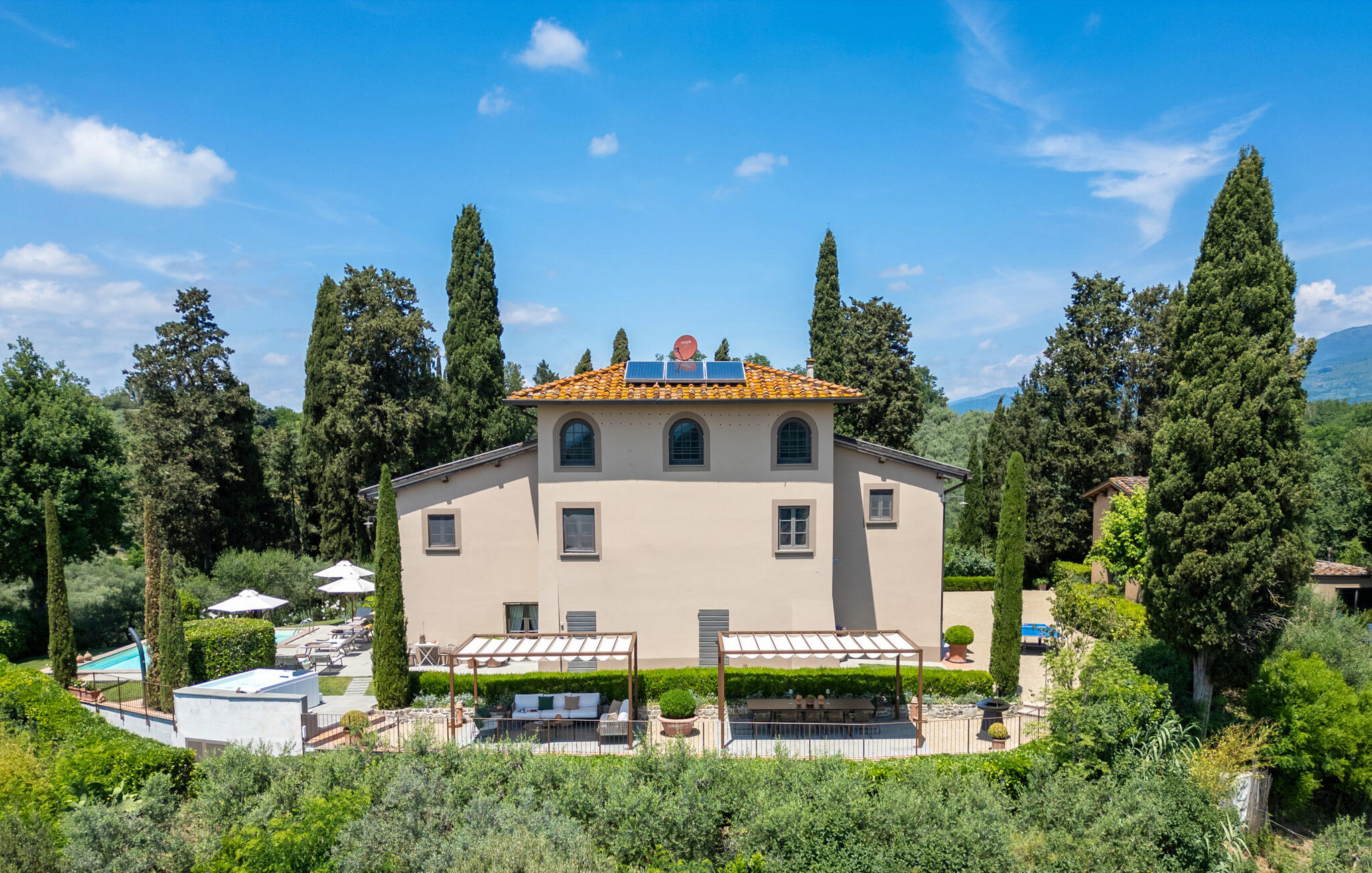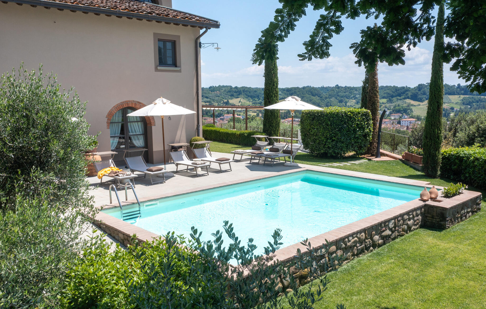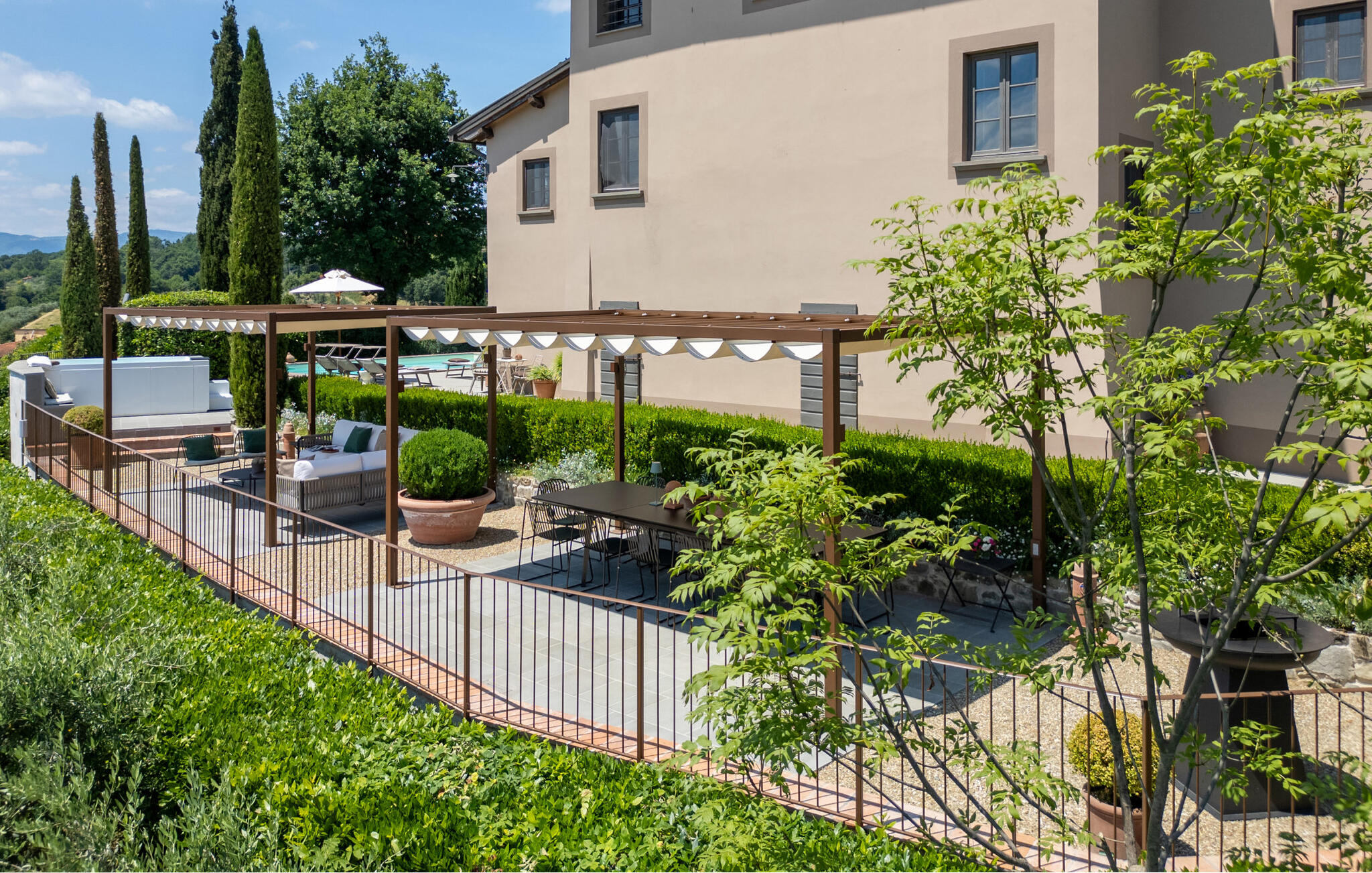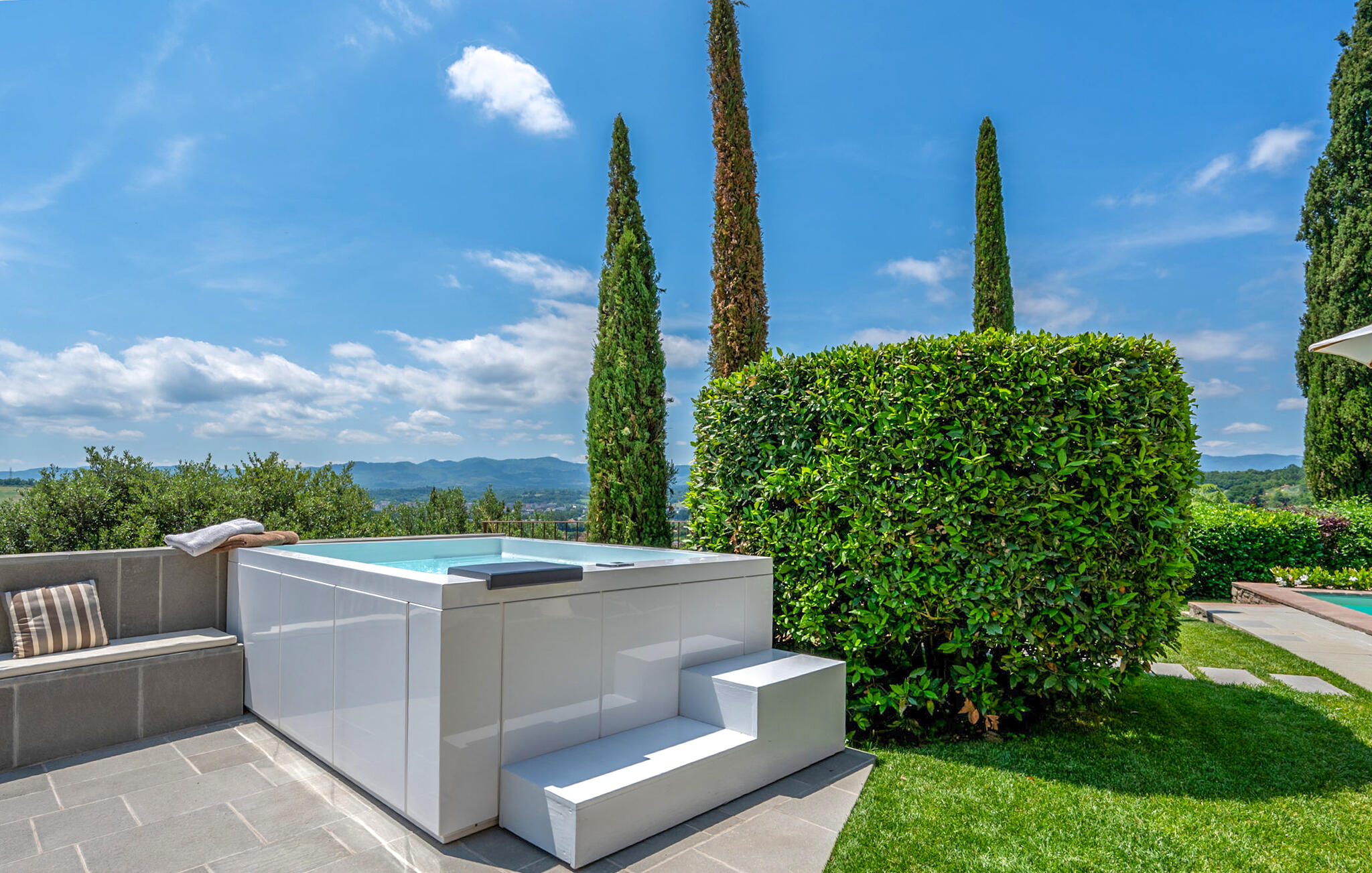 Het prachtige panoramische uitzicht vergezelt je in de buitenruimte terwijl je ontspant in de whirlpool of op comfortabele ligstoelen of samenkomt voor stimulerende gesprekken onder het genot van een glas wijn in de elegante lounges. Neem een ontspannen duik in het zwembad en vier jullie tijd samen met sfeervolle barbecue-avonden.