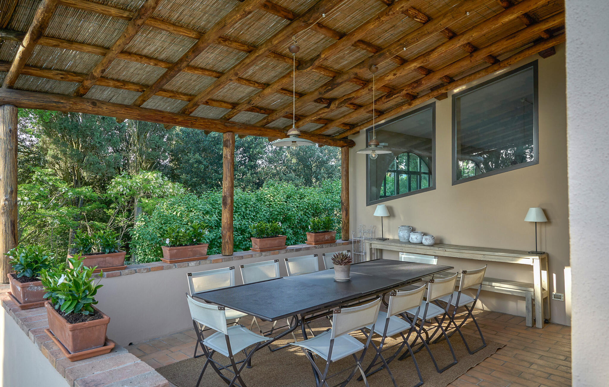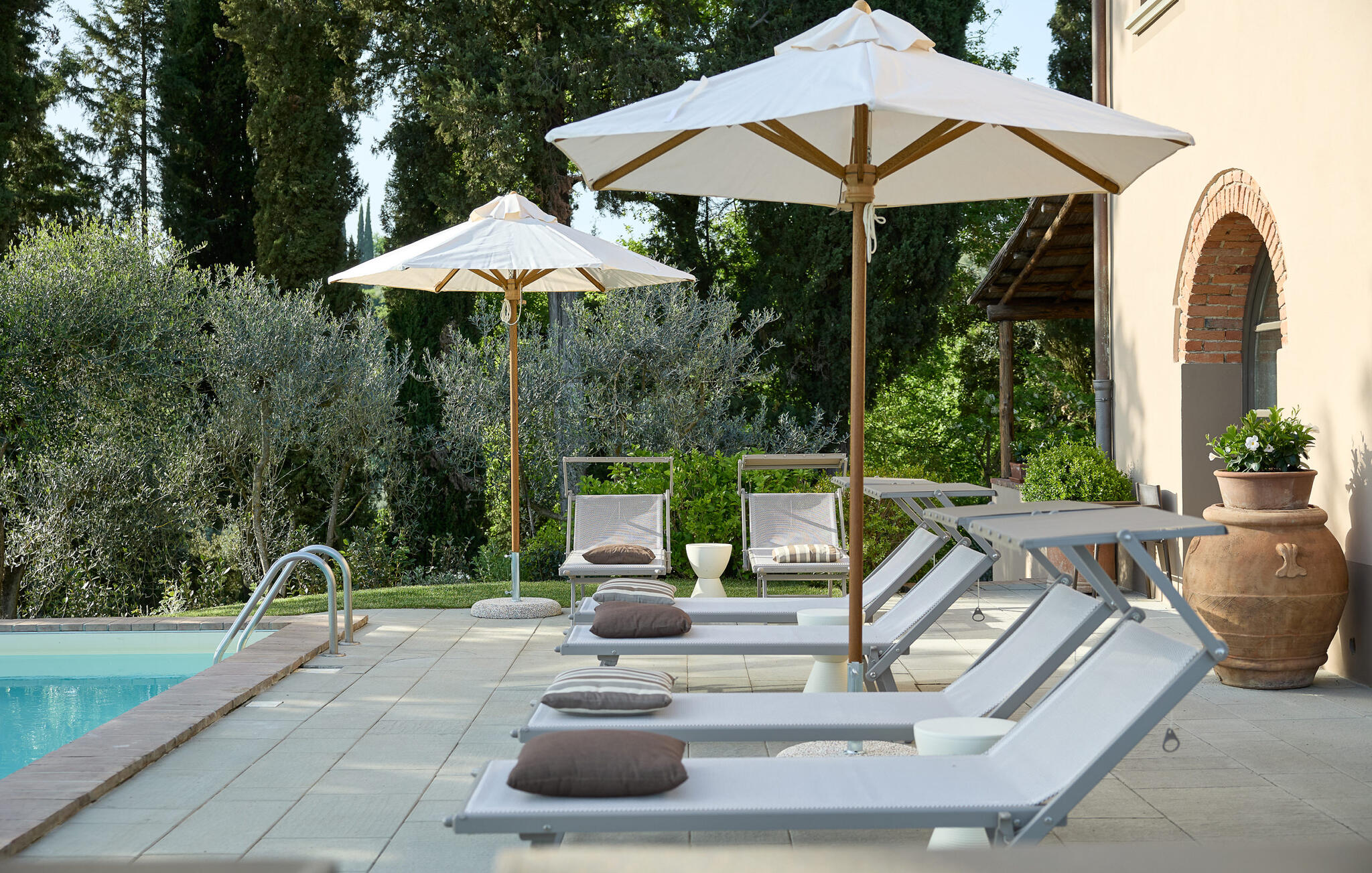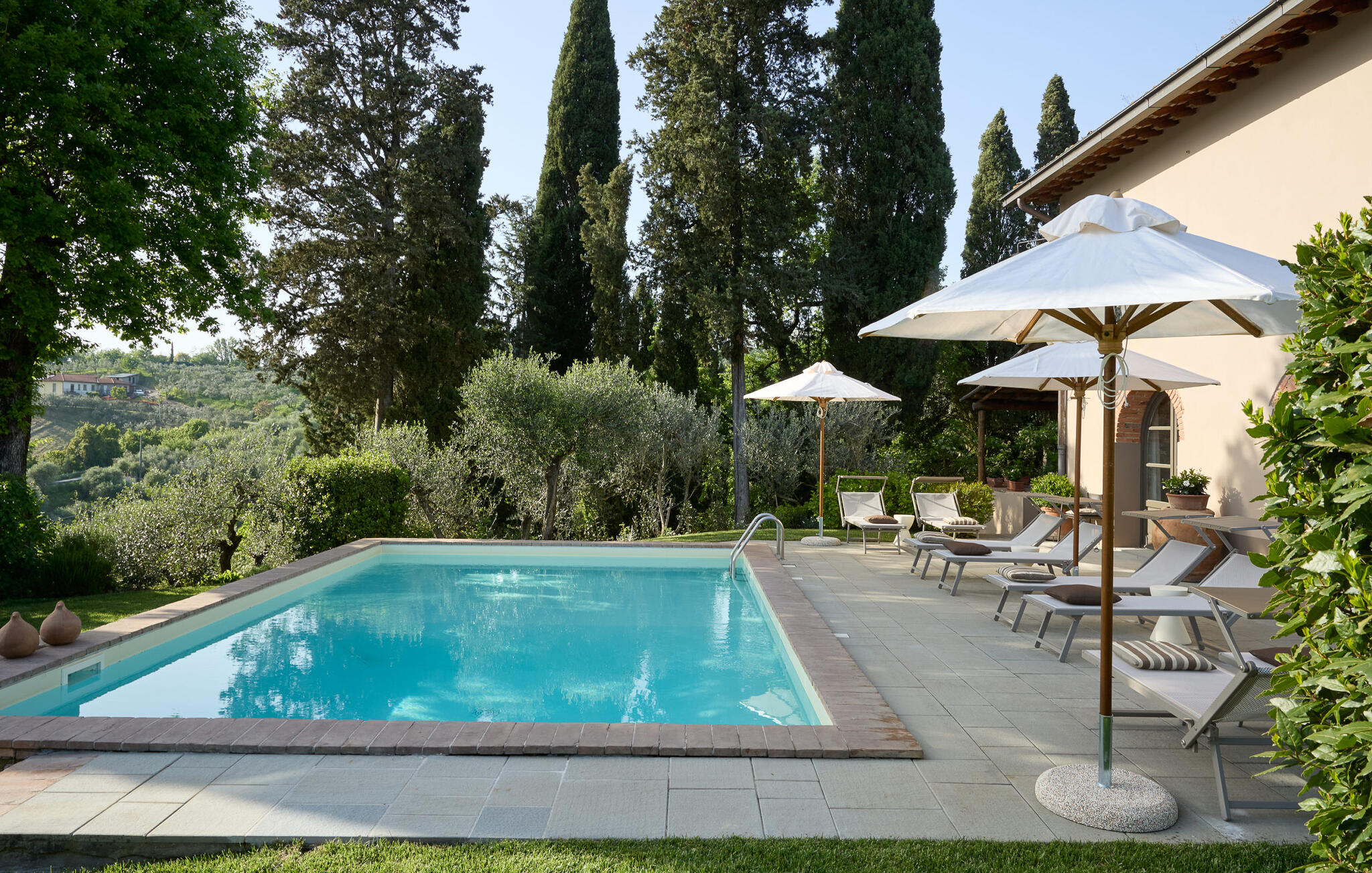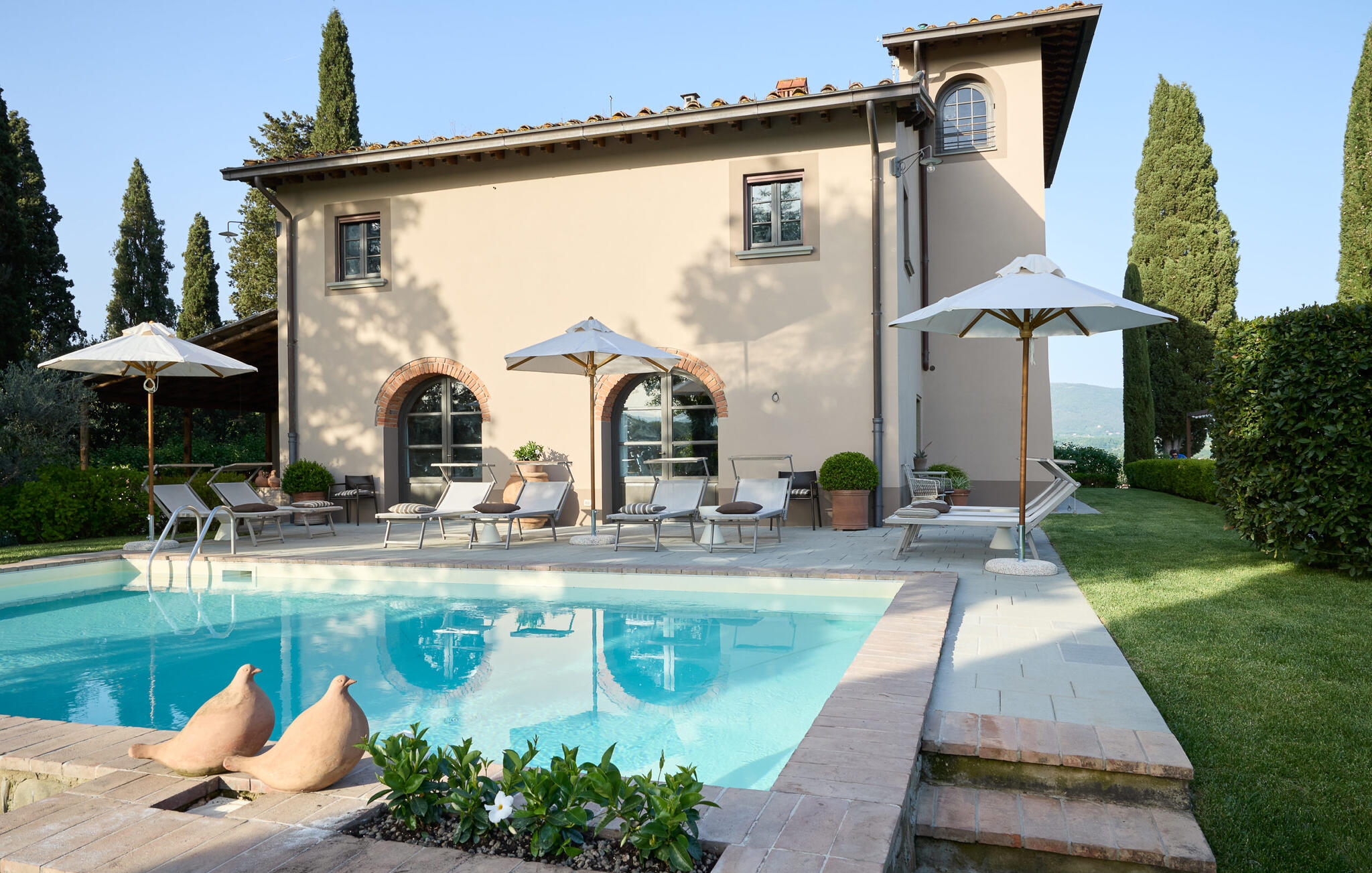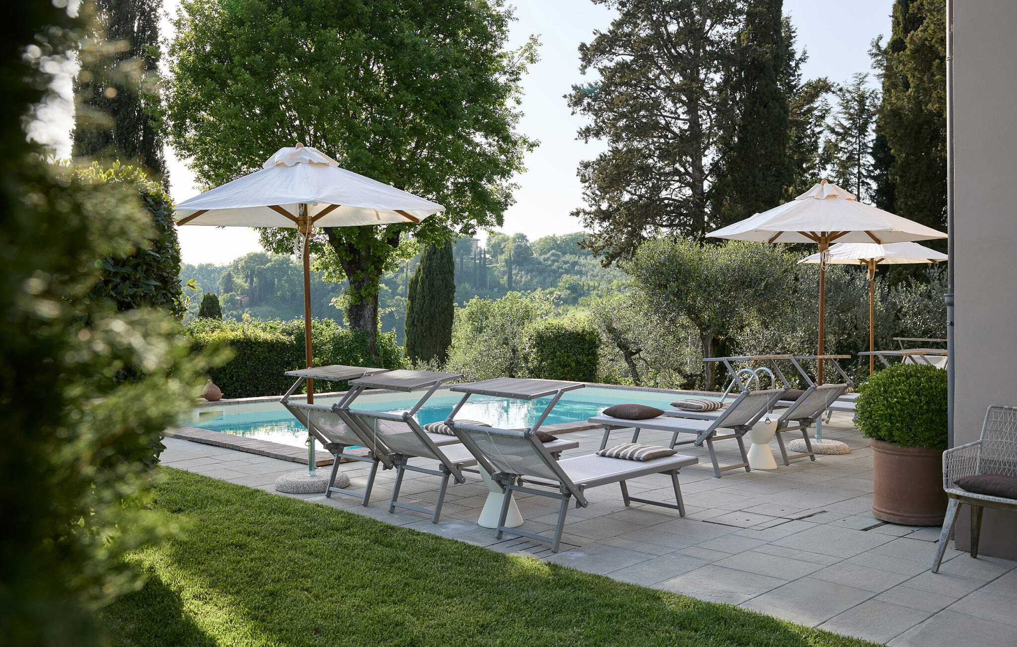 Het prachtige panoramische uitzicht vergezelt je in de buitenruimte terwijl je ontspant in de whirlpool of op comfortabele ligstoelen of samenkomt voor stimulerende gesprekken onder het genot van een glas wijn in de elegante lounges. Neem een ontspannen duik in het zwembad en vier jullie tijd samen met sfeervolle barbecue-avonden.