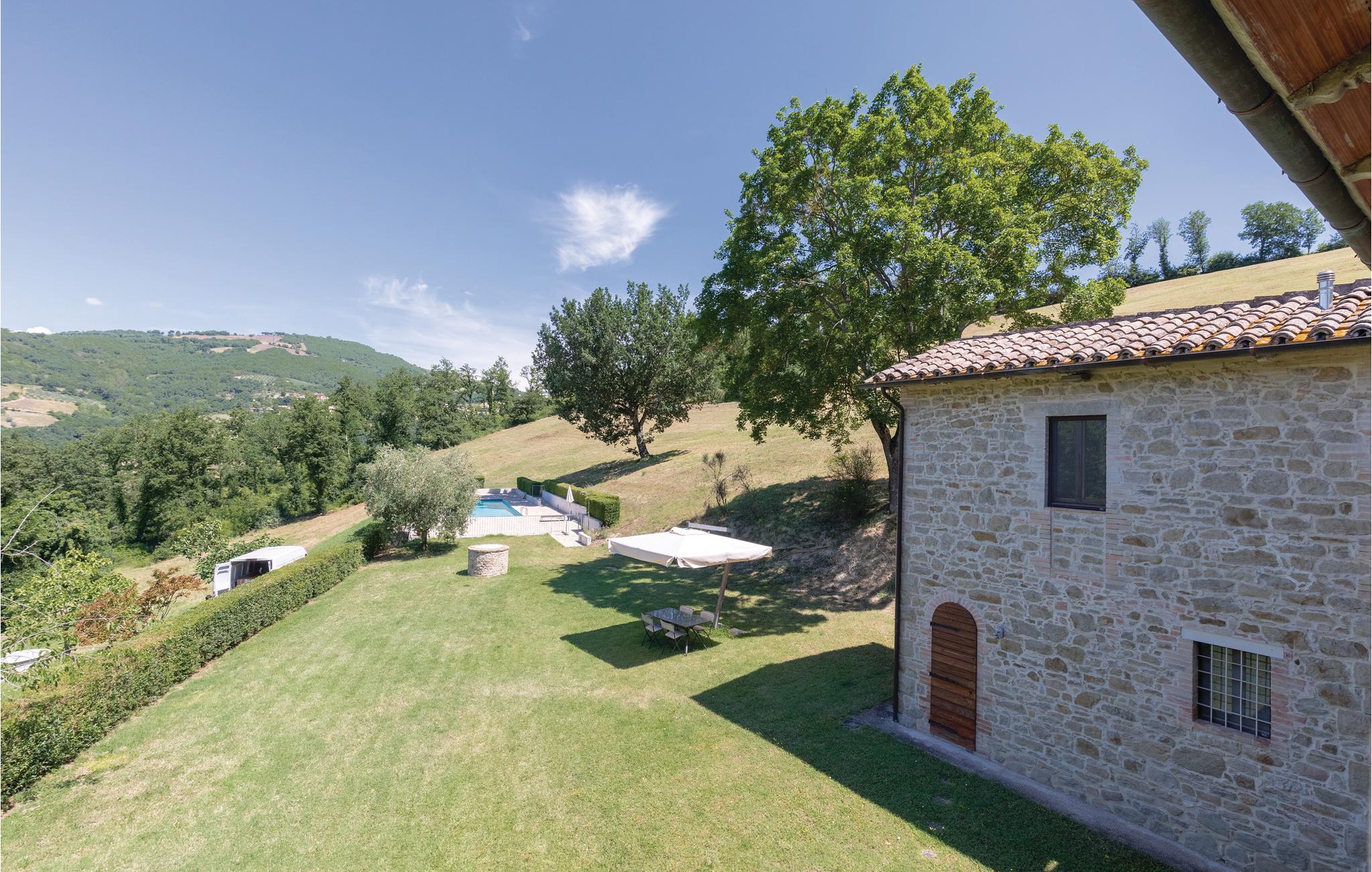 Historisch landhuis met 2 appartementen en een ander, kleiner appartement in het aangrenzende torentje. Zeer mooie, verhoogde ligging boven een grote vallei, omgeven door een eikenbos. Elk appartement heeft een eigen buitenruimte. Het zwembad met een groot zonneterras, met fantastisch uitzicht, wordt gedeeld met onder andere de gasten van een schuur bij de ingang van het pand, die 2 slaapplaatsen biedt. Goede mogelijkheden voor mooie wandelingen. Medium comfort inrichting. 3 km Pianello (levensmiddelenwinkels), 6 km Valfabbrica (allerlei winkels), 19 km Assisi, 20 km Perugia, 30 km Gubbio, 45 km Trasimenomeer. S. IUP751-752-753-588.