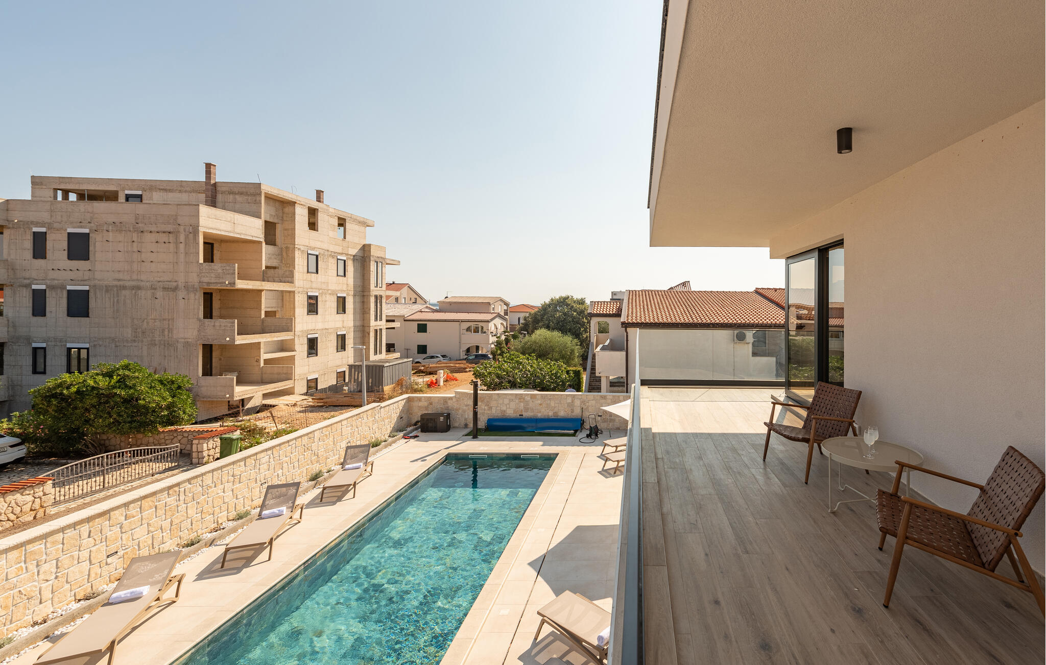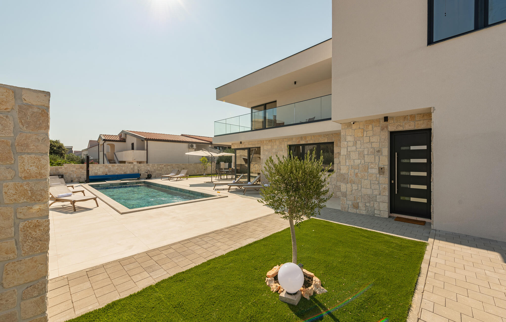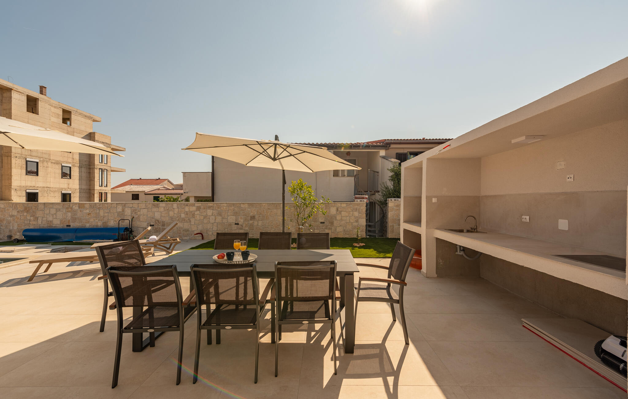 Geniet van de rust op het terras of bereid lokale specialiteiten in de goed uitgeruste zomerkeuken. De zon zal je verleiden om vele uren door te brengen in je privézwembad of op het zonneterras, waar je jezelf kunt verfrissen of gewoon lekker kunt luieren.