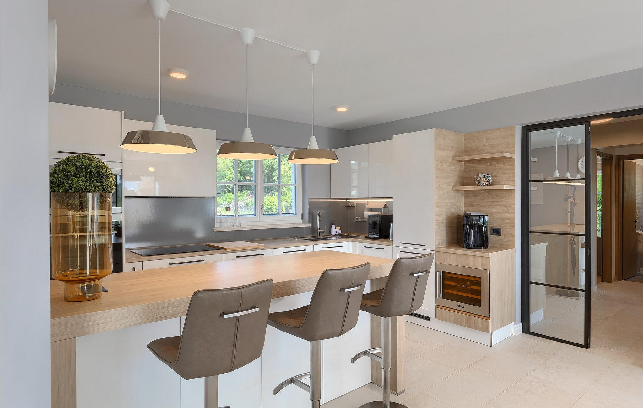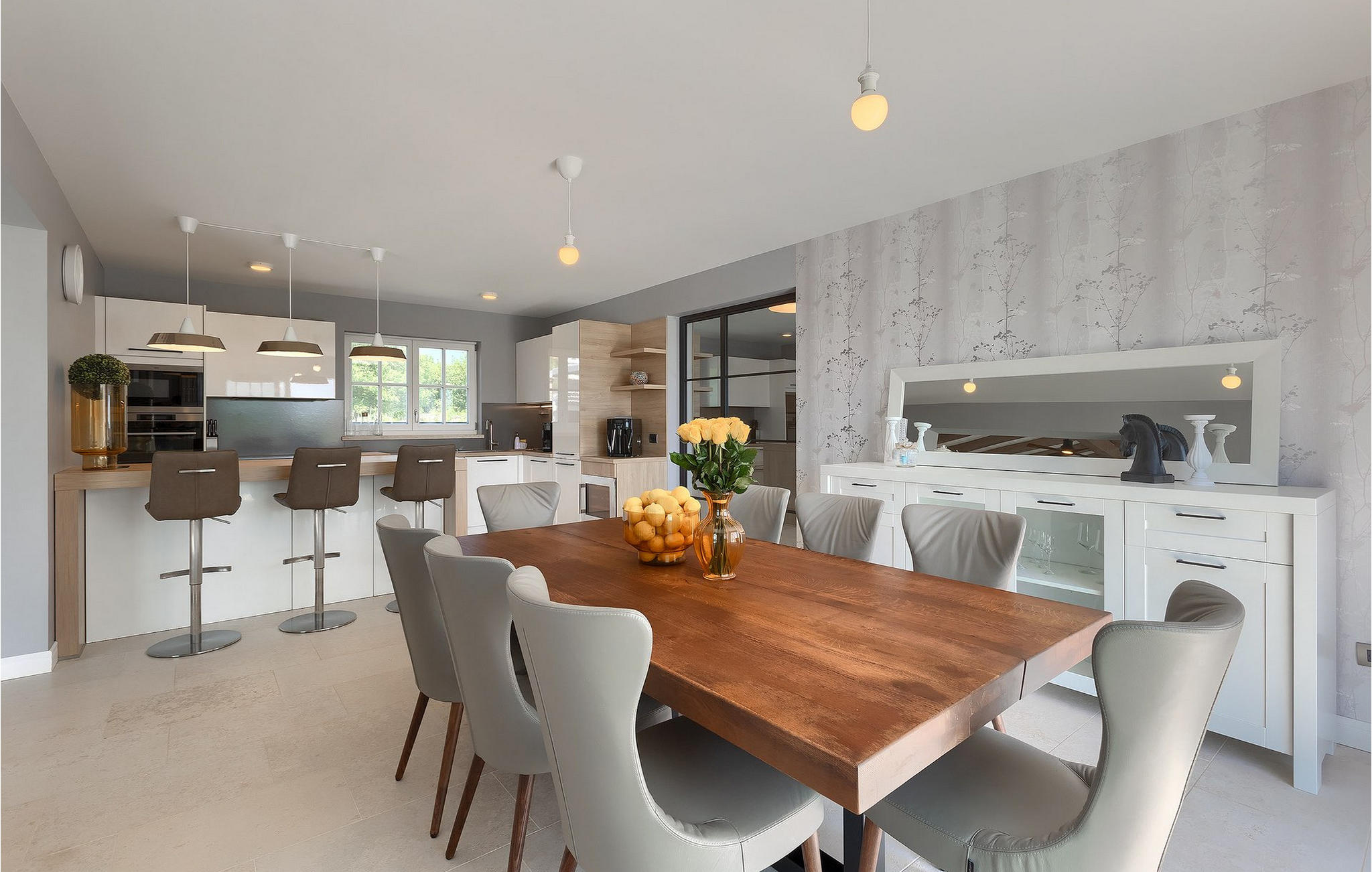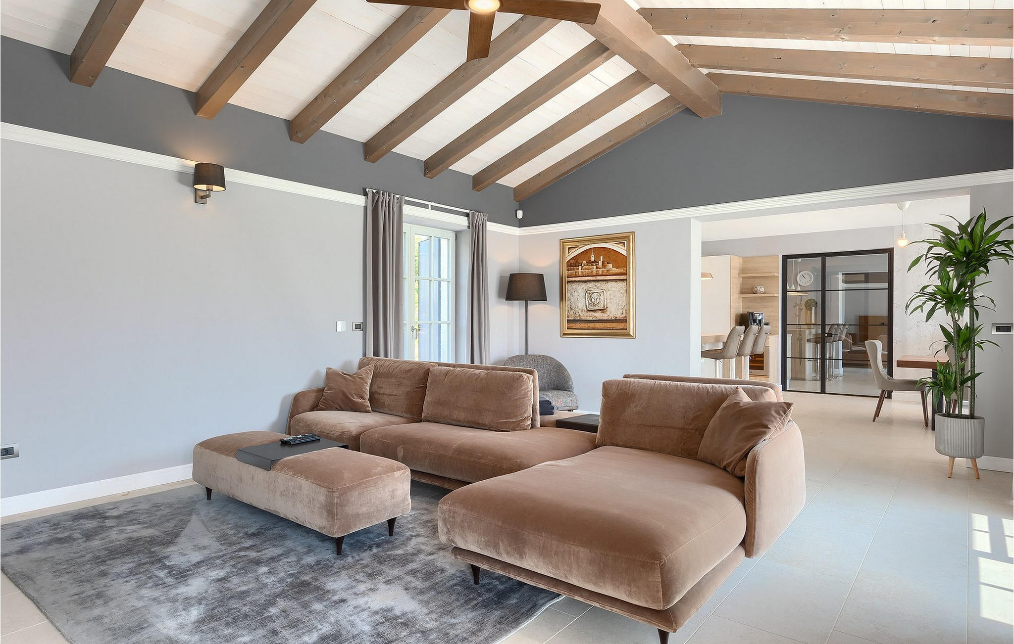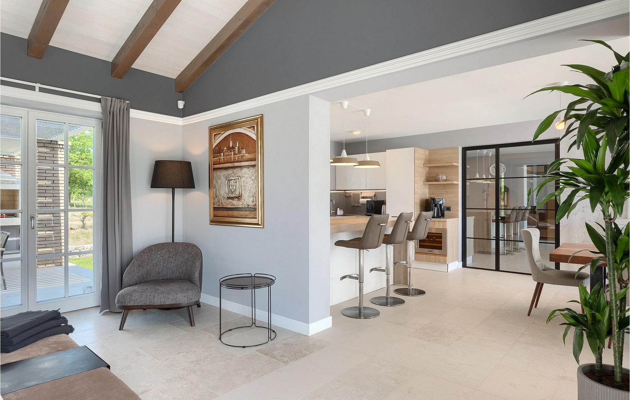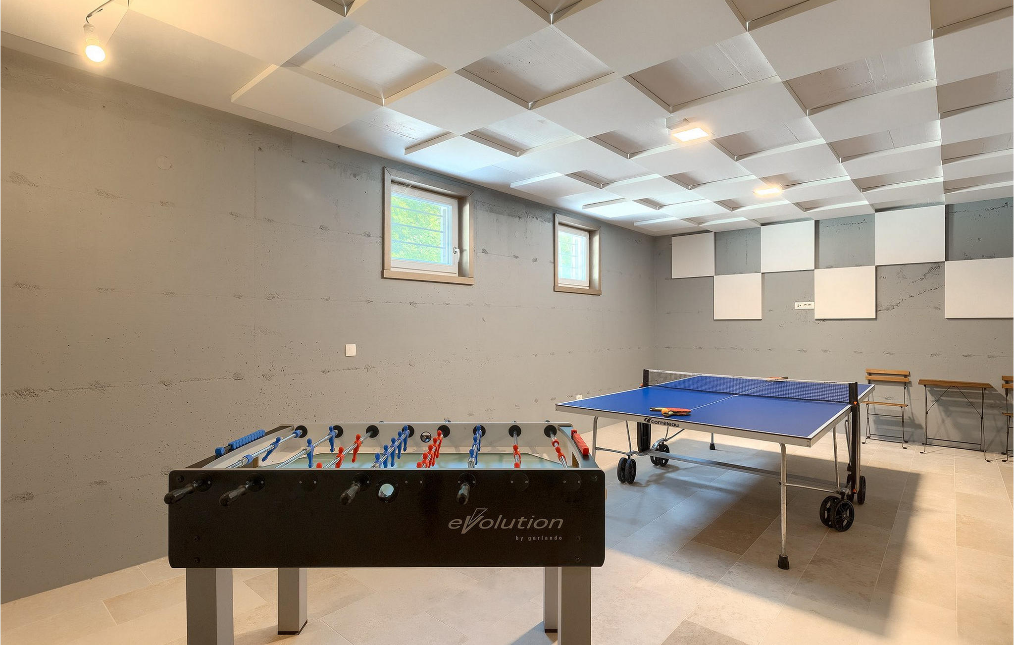 Als je de villa binnenkomt kom je direct bij het trappenhuis dat je naar de eerste verdieping met de slaapkamers brengt of naar de kelder met de entertainmentruimte waar je kunt darten, tafeltennissen en tafelvoetballen. Op de begane grond vind je een grote eetkamer met een moderne, volledig uitgeruste keuken die doorloopt in de gezellige en trendy woonkamer met open haard. Er zijn ook 3 slaapkamers, twee met een tweepersoonsbed, een met een eenpersoonsbed en een extra bed voor een extra gast of verschillende slaapkameropties. De kamers op de begane grond hebben een directe uitgang naar het zwembad, zodat je wakker kunt worden met uitzicht op het heldere water en de groene bomen op de achtergrond.