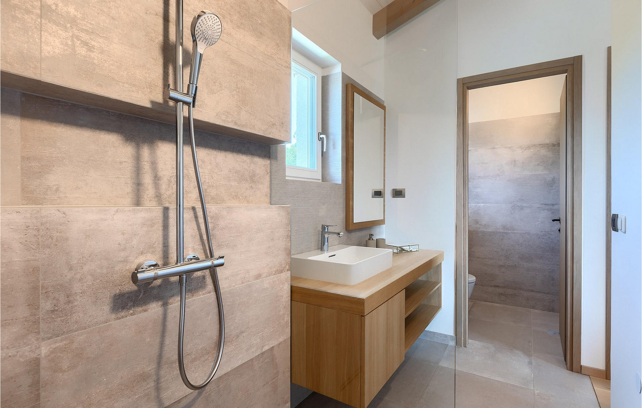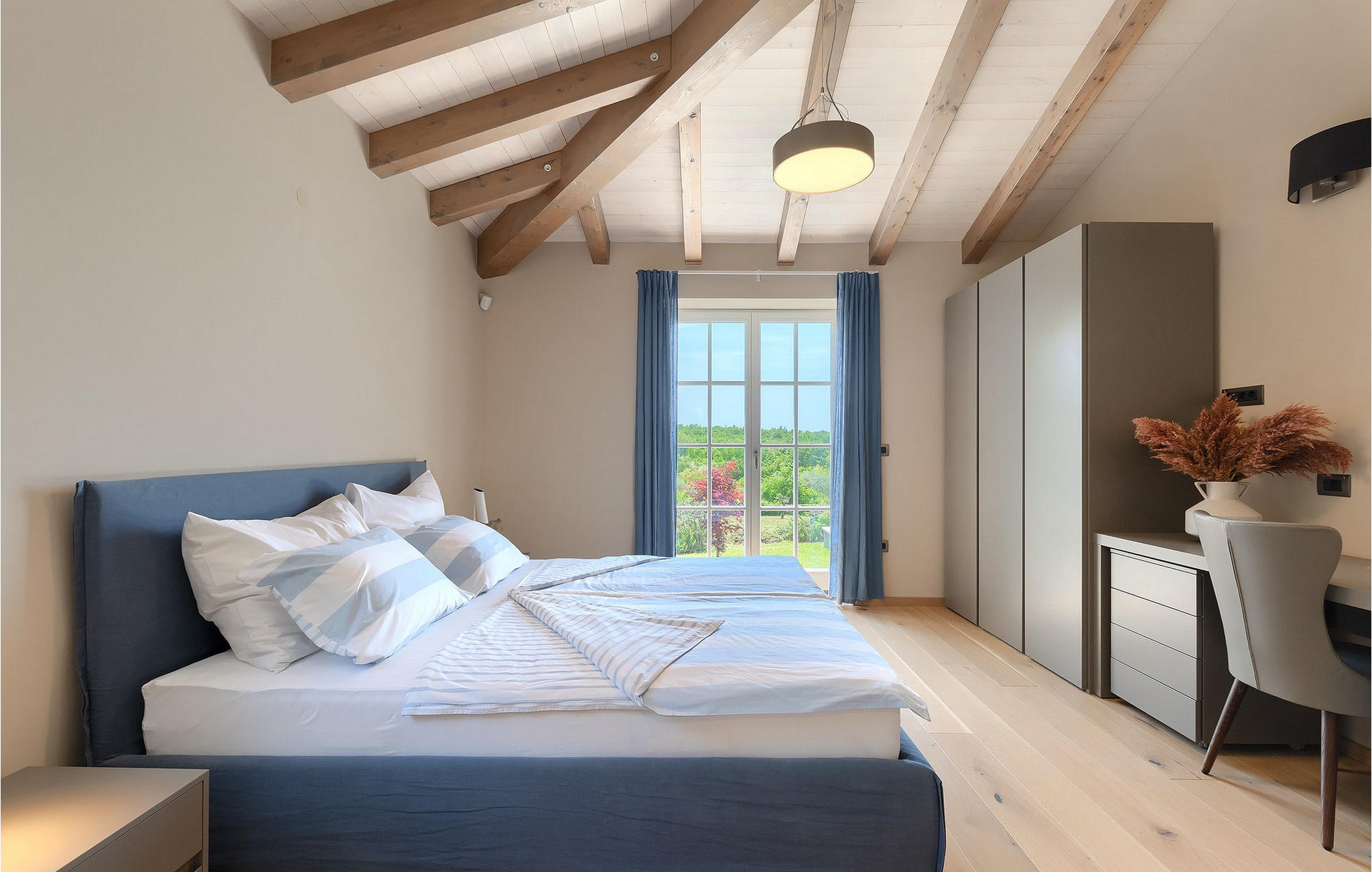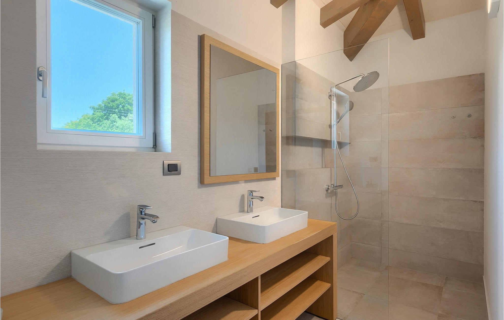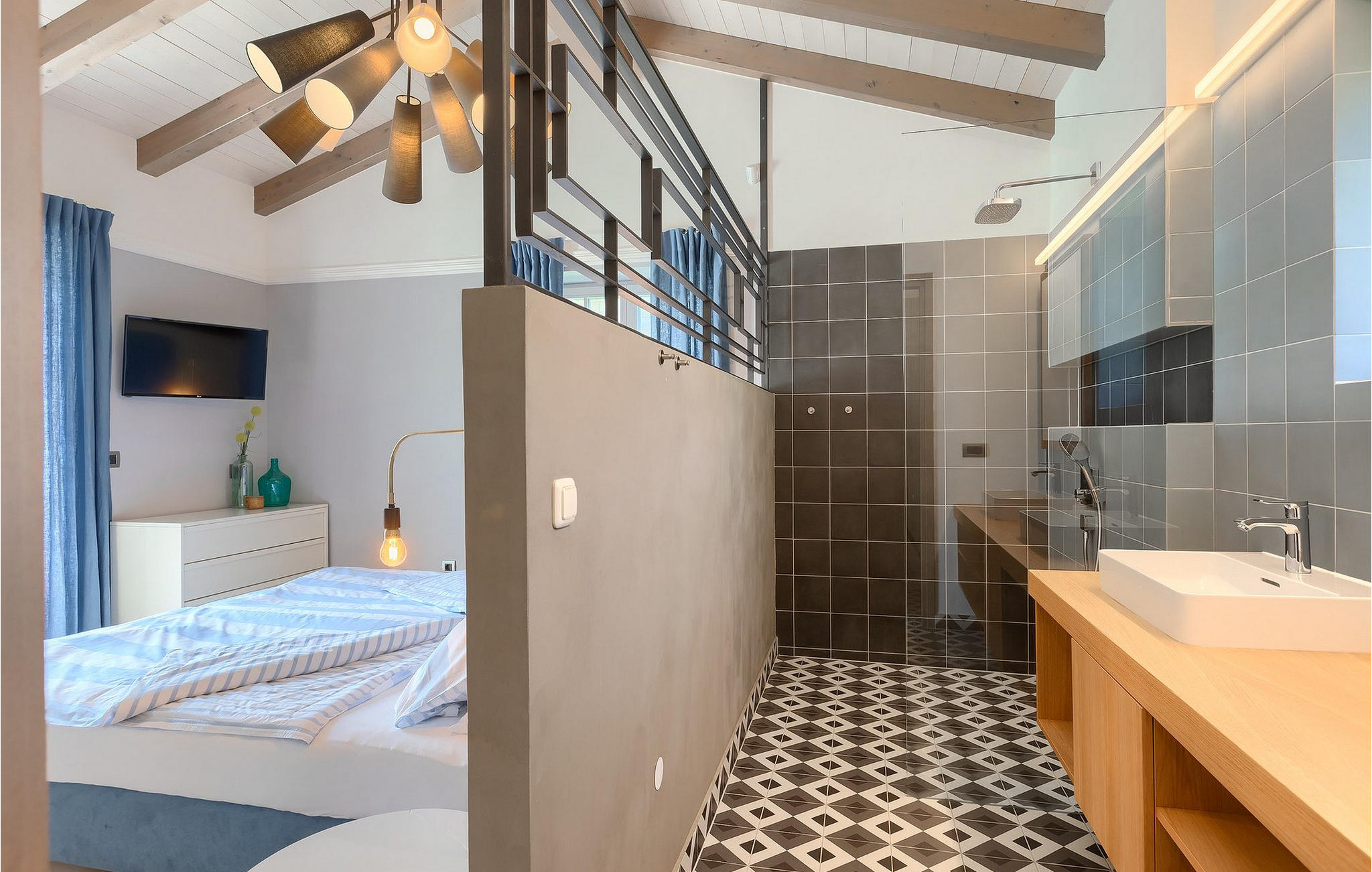 De eerste verdieping heeft 2 slaapkamers, beide met een elegante eigen badkamer geïntegreerd in de ruimte. Alle slaapkamers zijn zeer elegant ingericht met stijlvolle zorgvuldig geselecteerde details in harmonieuze kleurtonen. De houten balken aan de muren voegen een vleugje rustiek toe aan de moderne flair van het prachtige interieur van Villa Carinzia, zodat u het gevoel krijgt dat uw droomvakantie in Istrië meteen goed begint!