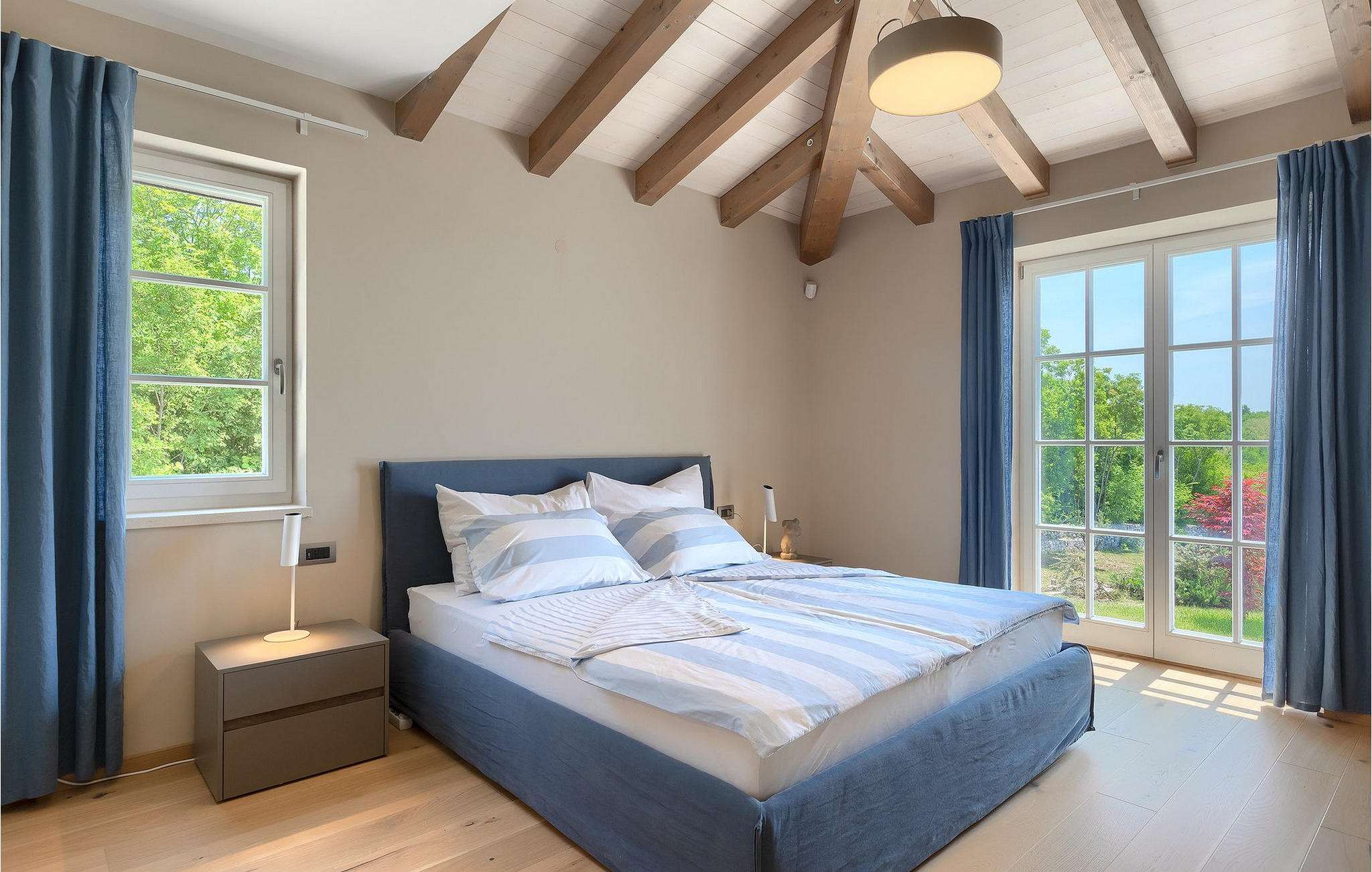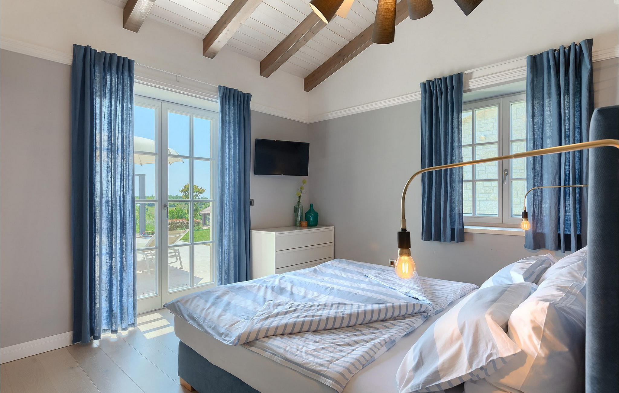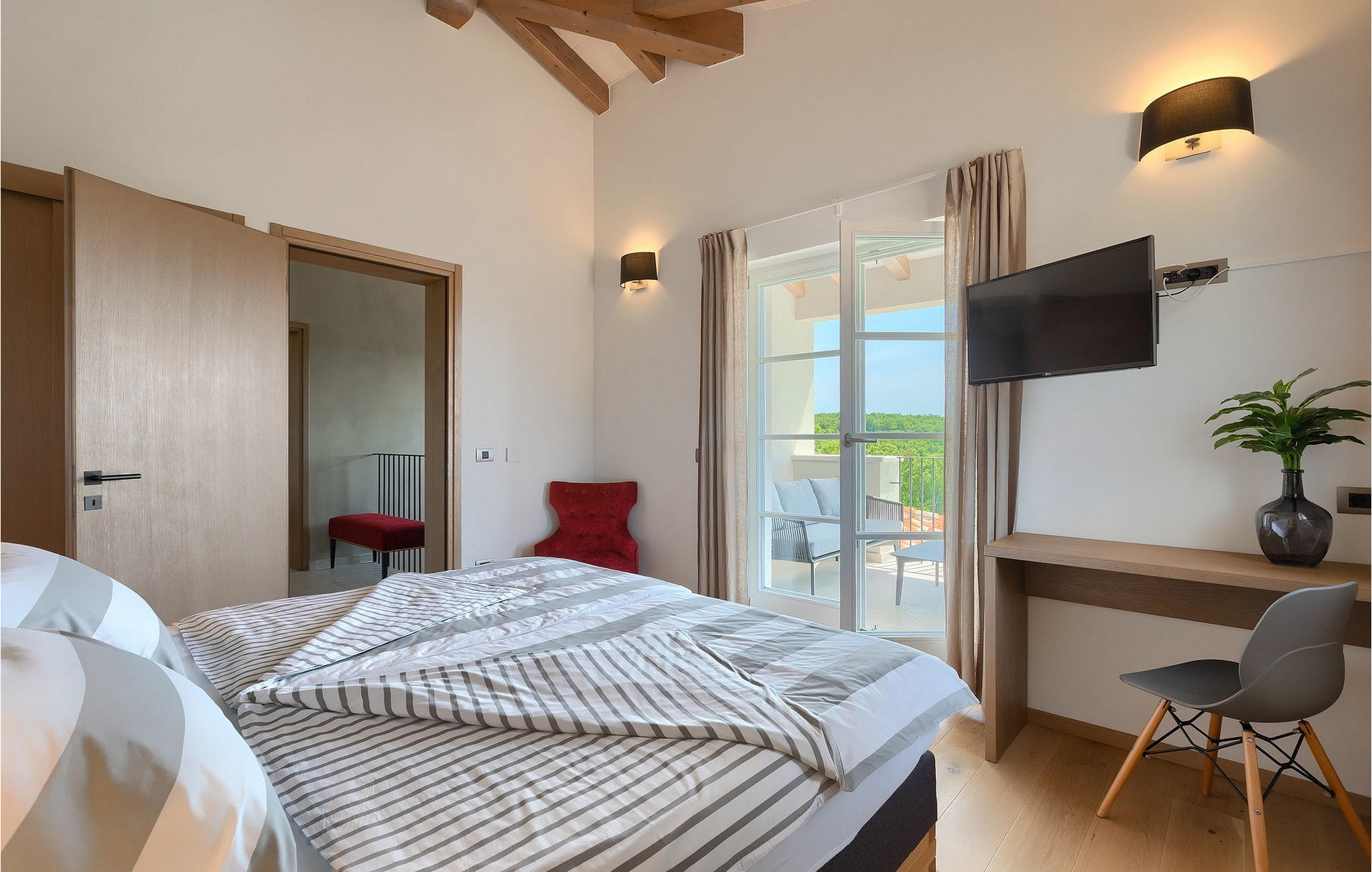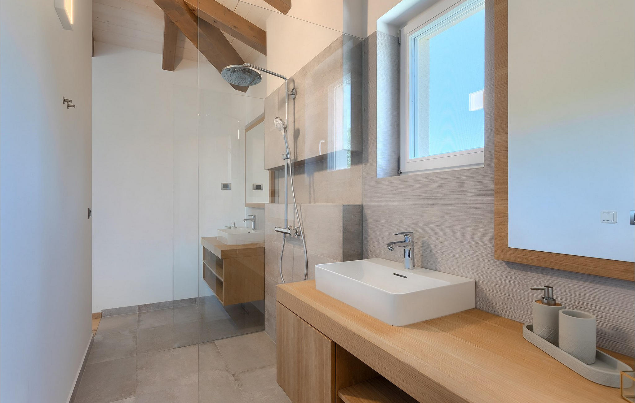 De eerste verdieping heeft 2 slaapkamers, beide met een elegante eigen badkamer geïntegreerd in de ruimte. Alle slaapkamers zijn zeer elegant ingericht met stijlvolle zorgvuldig geselecteerde details in harmonieuze kleurtonen. De houten balken aan de muren voegen een vleugje rustiek toe aan de moderne flair van het prachtige interieur van Villa Carinzia, zodat u het gevoel krijgt dat uw droomvakantie in Istrië meteen goed begint!