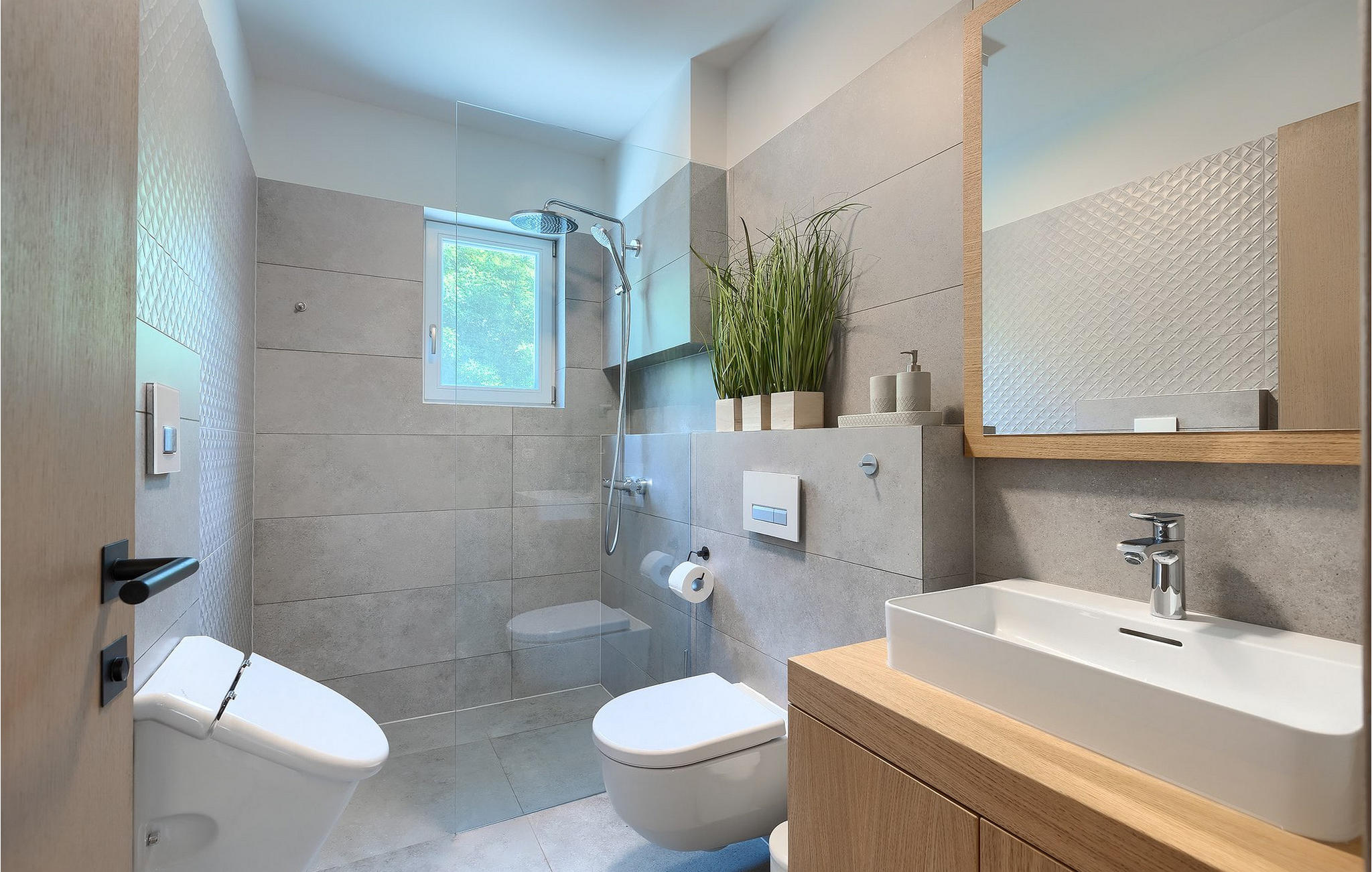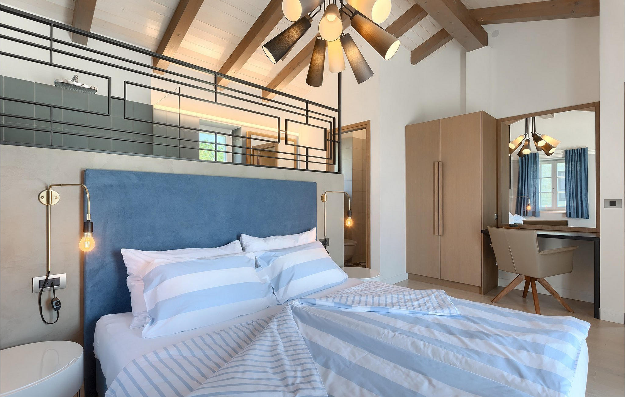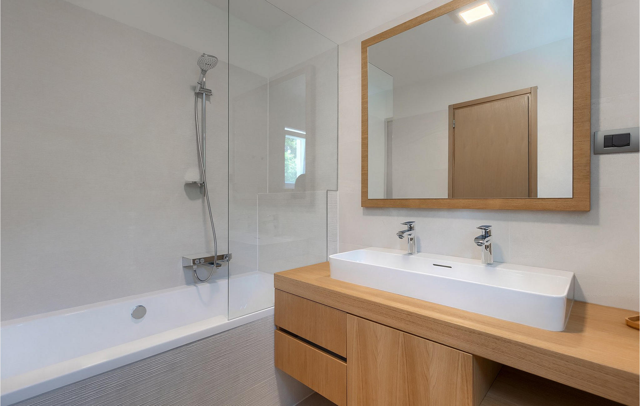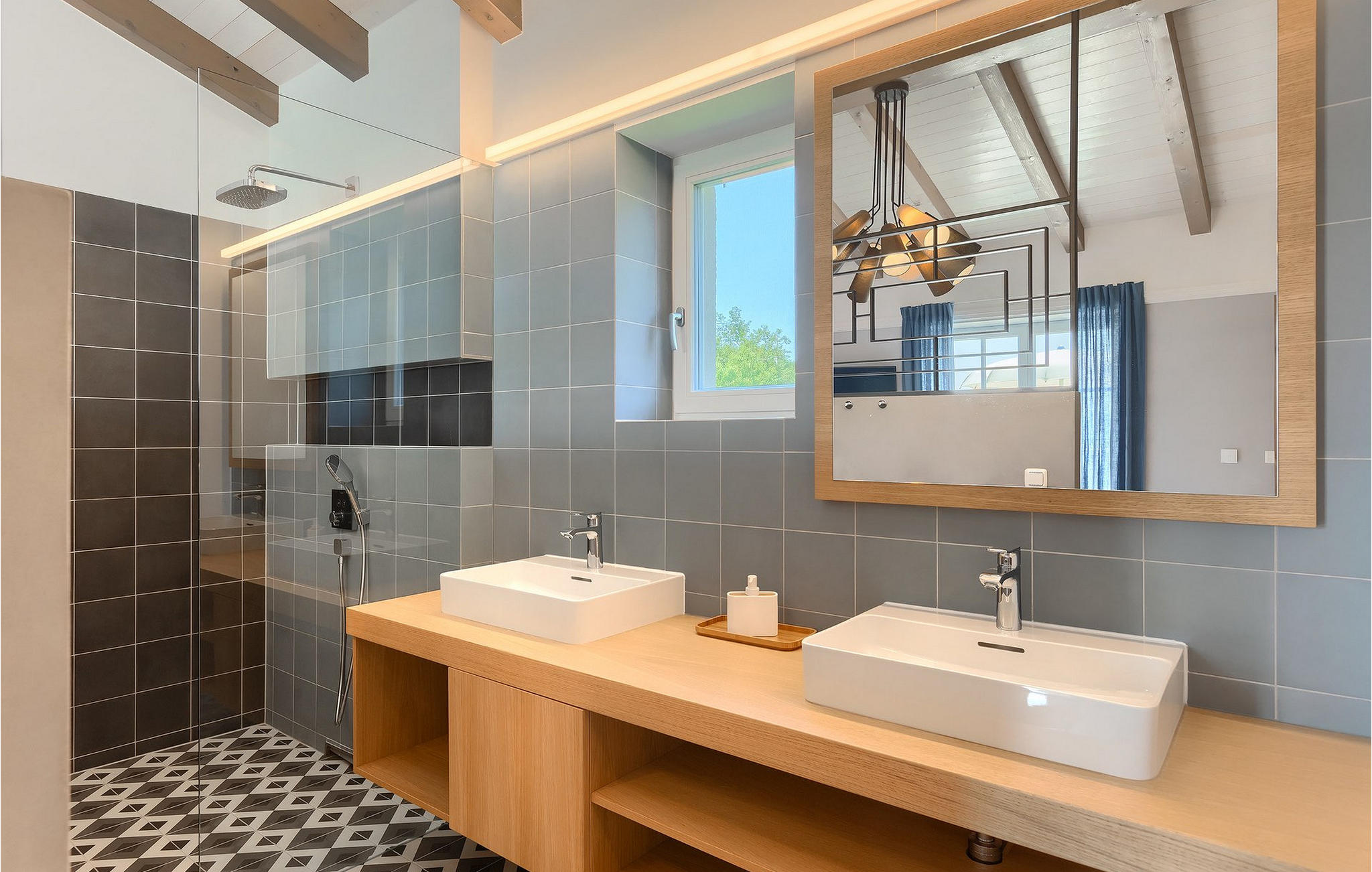 De eerste verdieping heeft 2 slaapkamers, beide met een elegante eigen badkamer geïntegreerd in de ruimte. Alle slaapkamers zijn zeer elegant ingericht met stijlvolle zorgvuldig geselecteerde details in harmonieuze kleurtonen. De houten balken aan de muren voegen een vleugje rustiek toe aan de moderne flair van het prachtige interieur van Villa Carinzia, zodat u het gevoel krijgt dat uw droomvakantie in Istrië meteen goed begint!