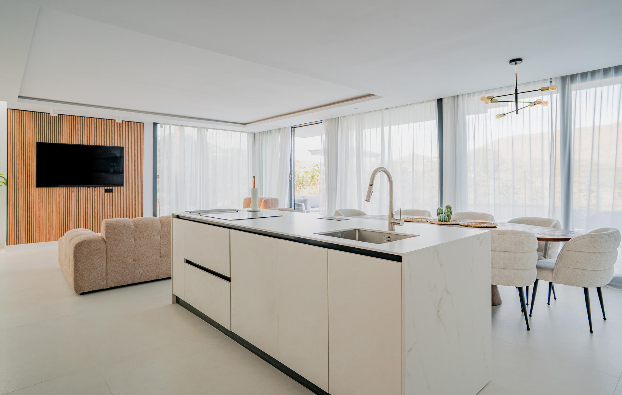 Dit ruime en moderne vakantiehuis op La Cala Golf Resort verwelkomt je met een licht en hoogwaardig interieur, waar je er met vrienden of familie even helemaal tussenuit kunt in een stijlvolle ambiance. Verzin culinaire hoogstandjes en neem plaats in de gezellige eethoek. Maak het jezelf gemakkelijk op de knusse bank voor stimulerende gesprekken en stream een spannende serie na een lange dag.