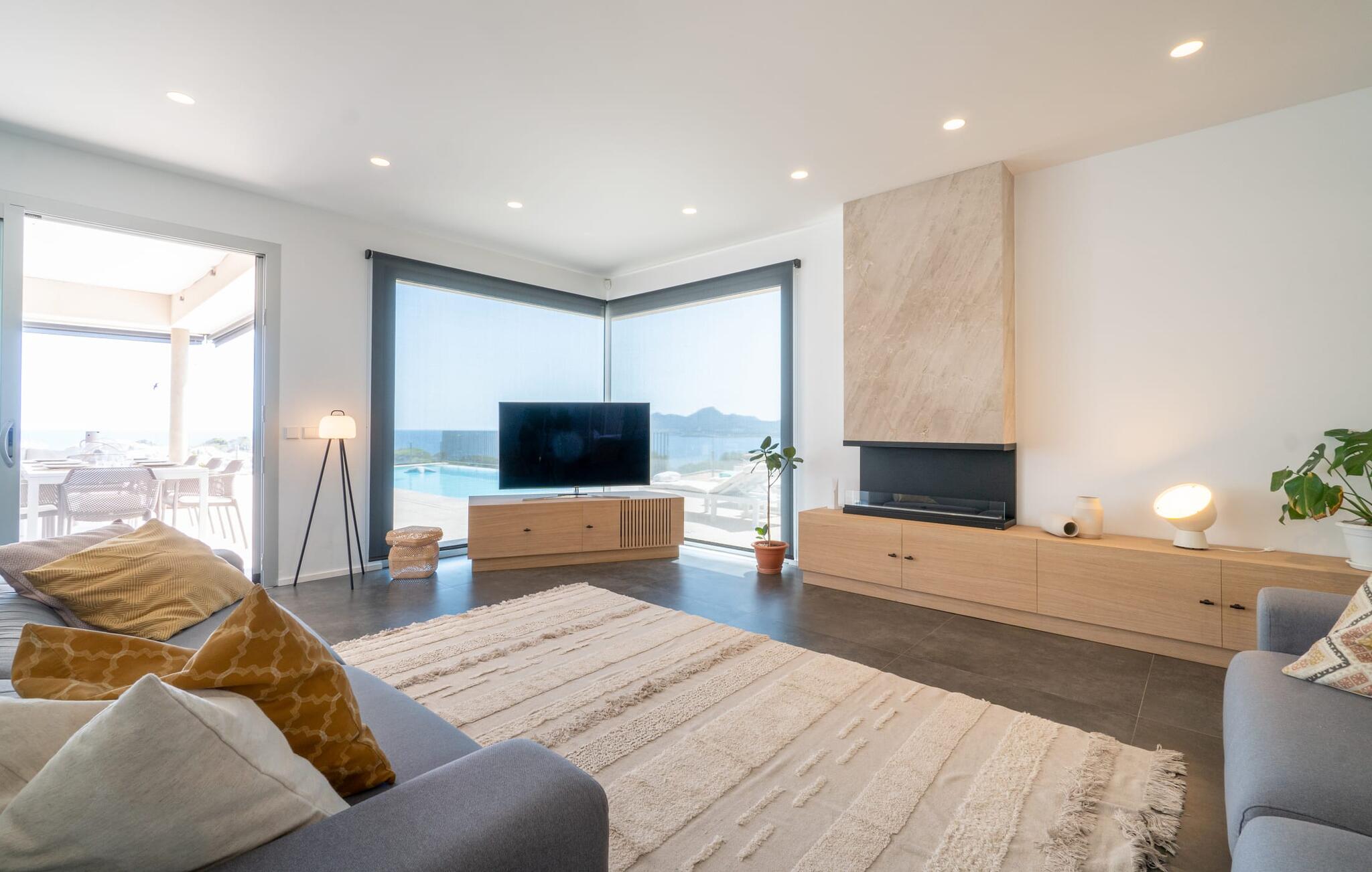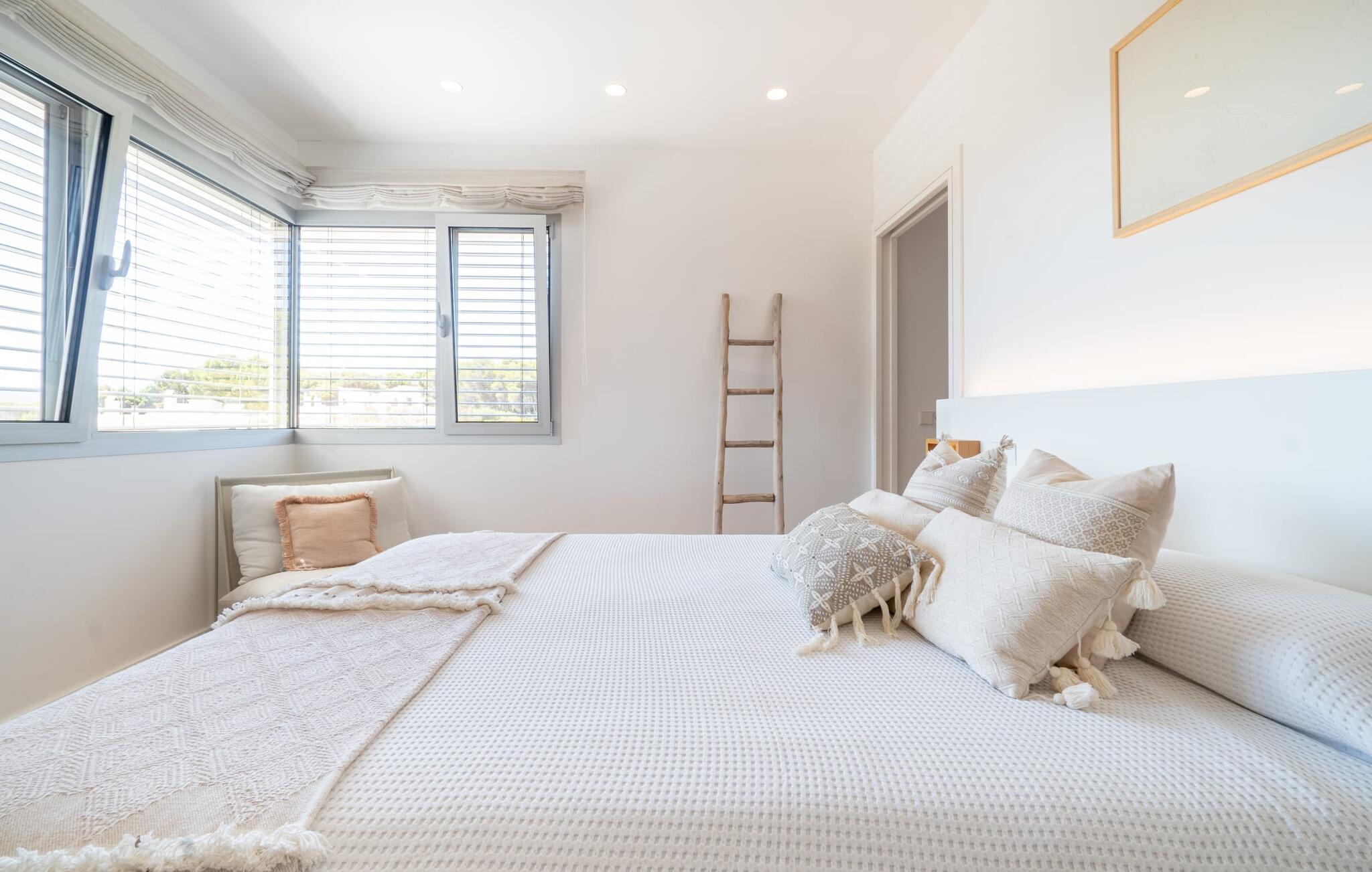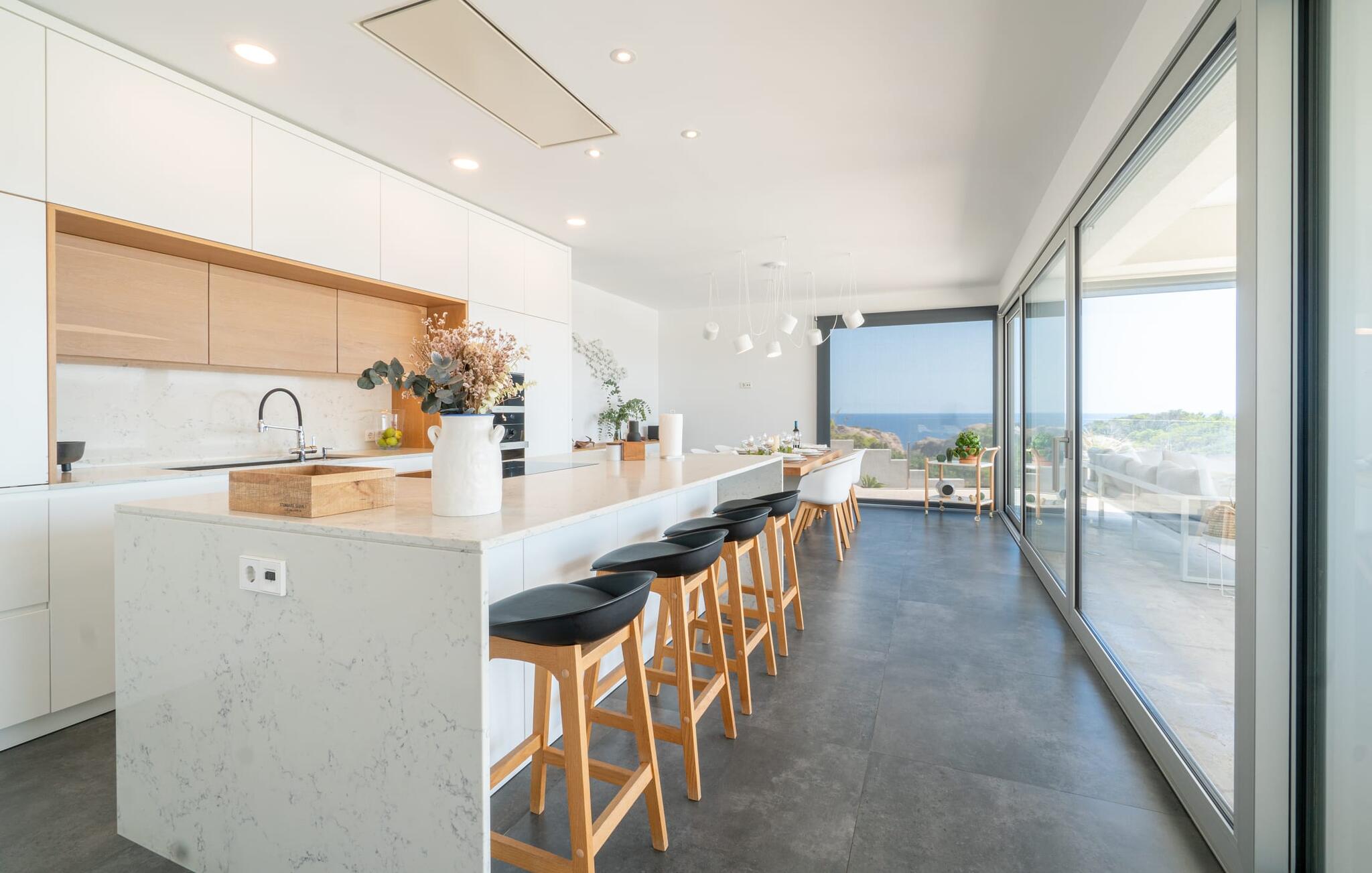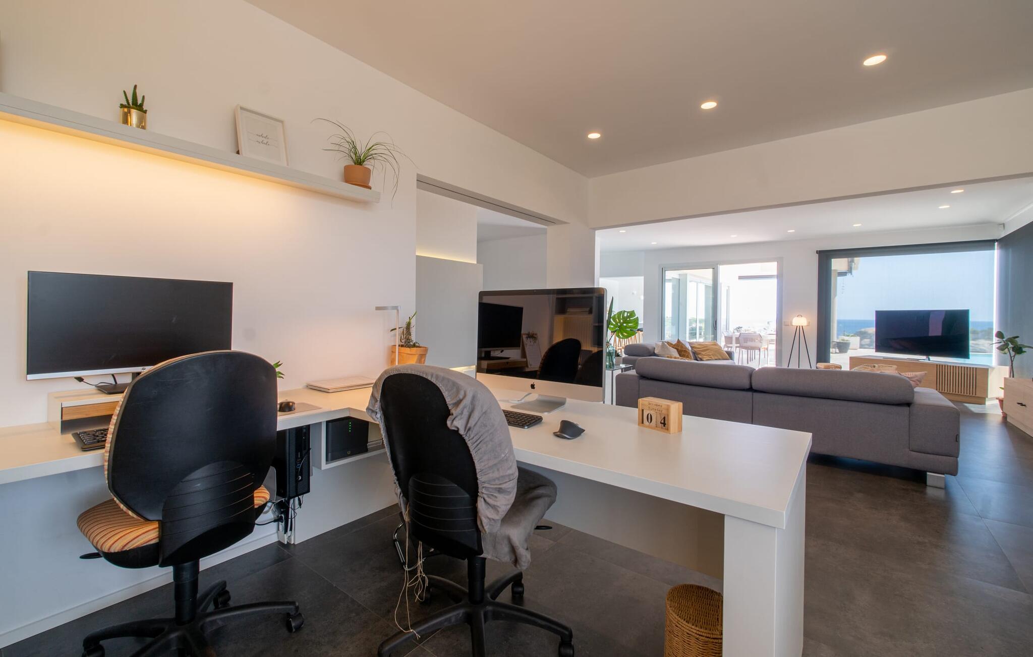 Ook van binnen is deze villa erg chic: de vele ramen laten veel licht binnen en bieden een fantastisch uitzicht op zee. Ze zijn ook voorzien van jaloezieën en rolluiken om ervoor te zorgen dat het huis niet te warm wordt op zonnige dagen. Veel wit en natuurlijke kleuren, gecombineerd met designmeubels en zorgvuldig geselecteerde woonaccessoires, zorgen voor een vriendelijke en stijlvolle sfeer in het hele huis. Op de begane grond zijn er twee smaakvol ingerichte slaapkamers met een gedeelde, moderne badkamer met ligbad, een uitnodigende entree en een praktische wasruimte. De bovenverdieping op zwembadniveau maakt indruk met een grote woonkamer, een ruim gastentoilet met douche en een werkplek die perfect is voor een kantoor aan huis Aansluitingen zijn beschikbaar als je je laptop wilt meenemen. De keuken, uitgerust met hoogwaardige apparatuur, en de open eethoek zijn ook echte hoogtepunten: Vanaf hier kun je genieten van uitzicht op het terras en de zee dankzij ramen van vloer tot plafond. Een extra slaapkamer met dressing en eigen badkamer ronden het wooncomfort af.