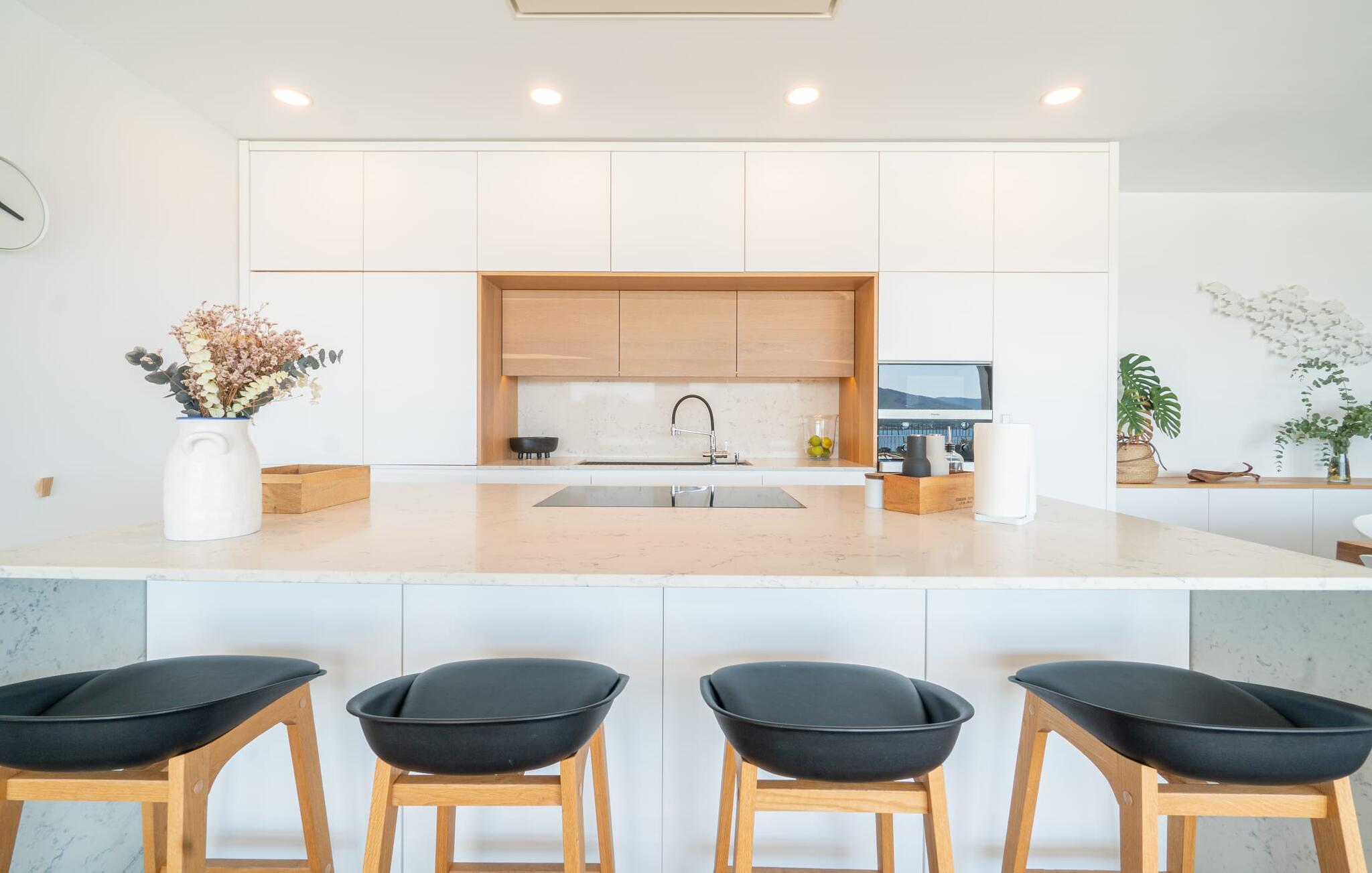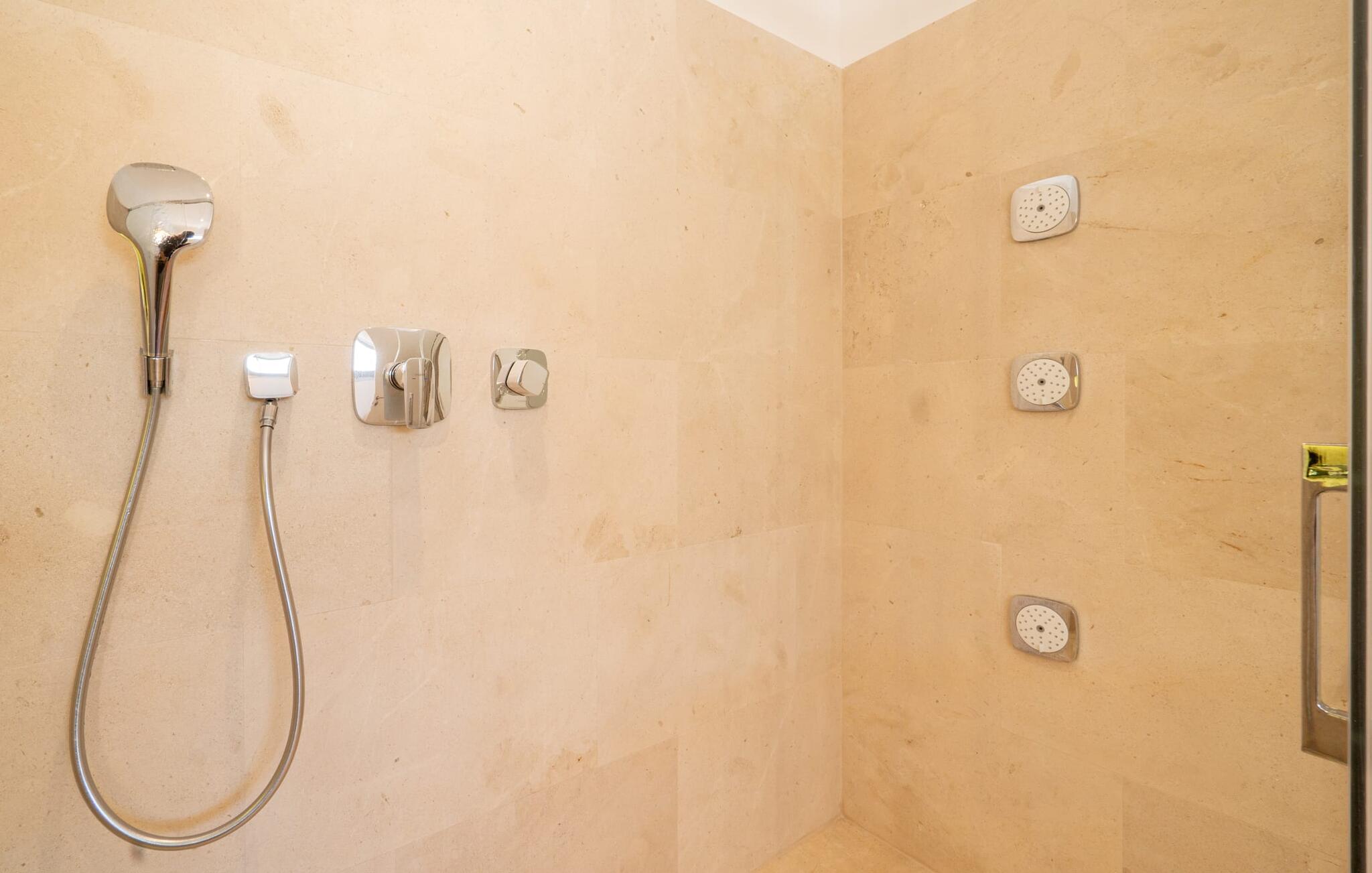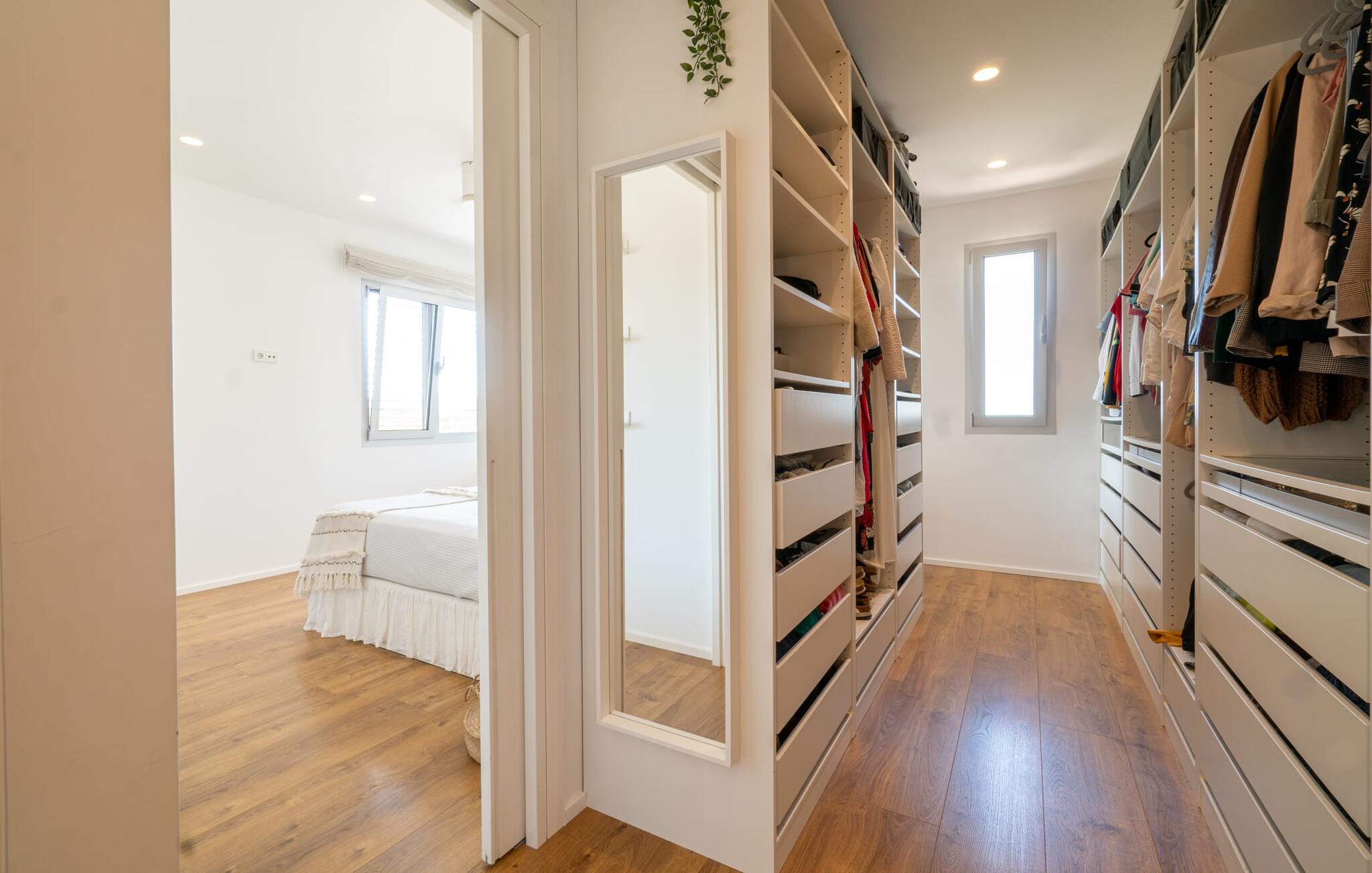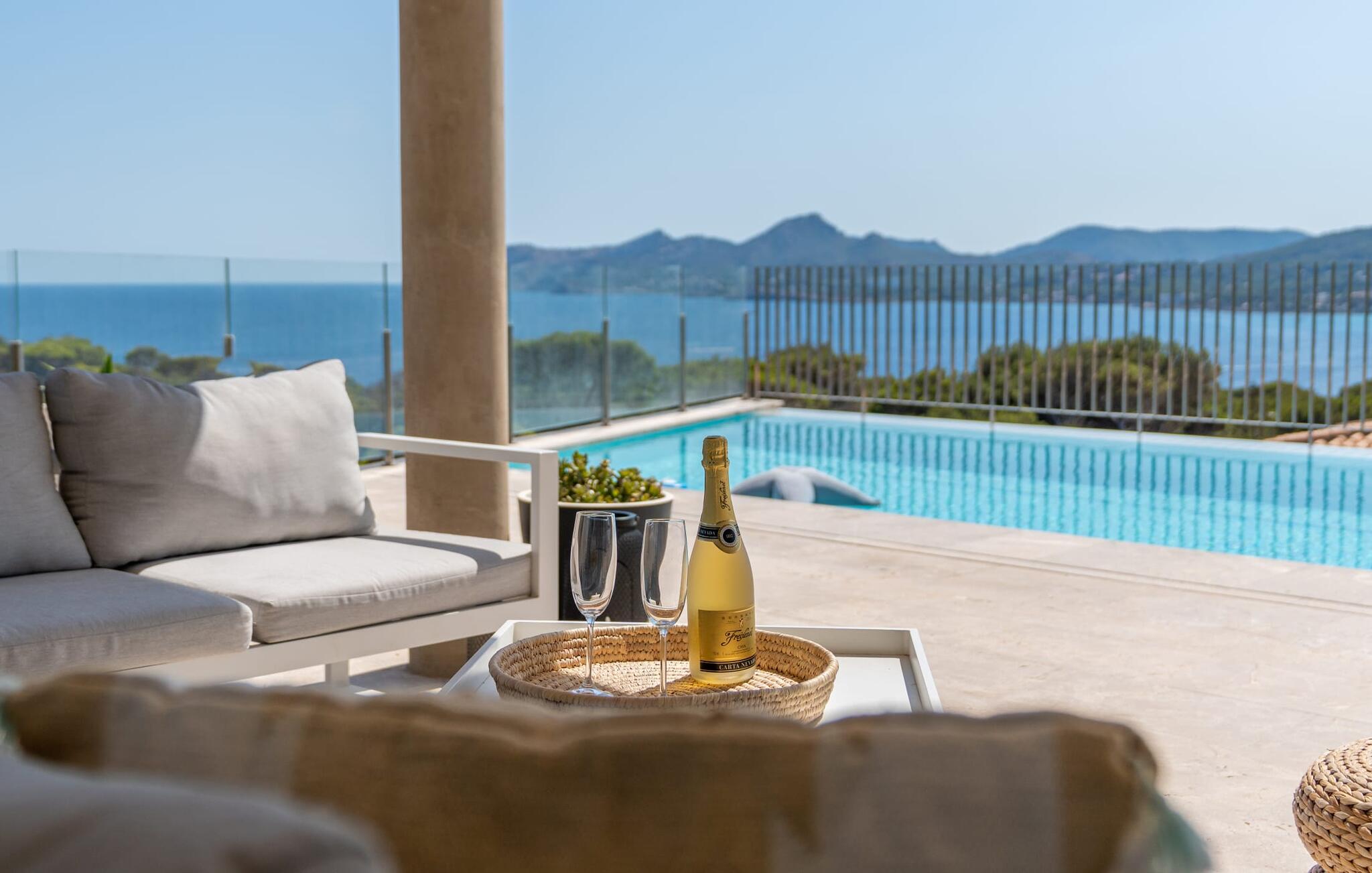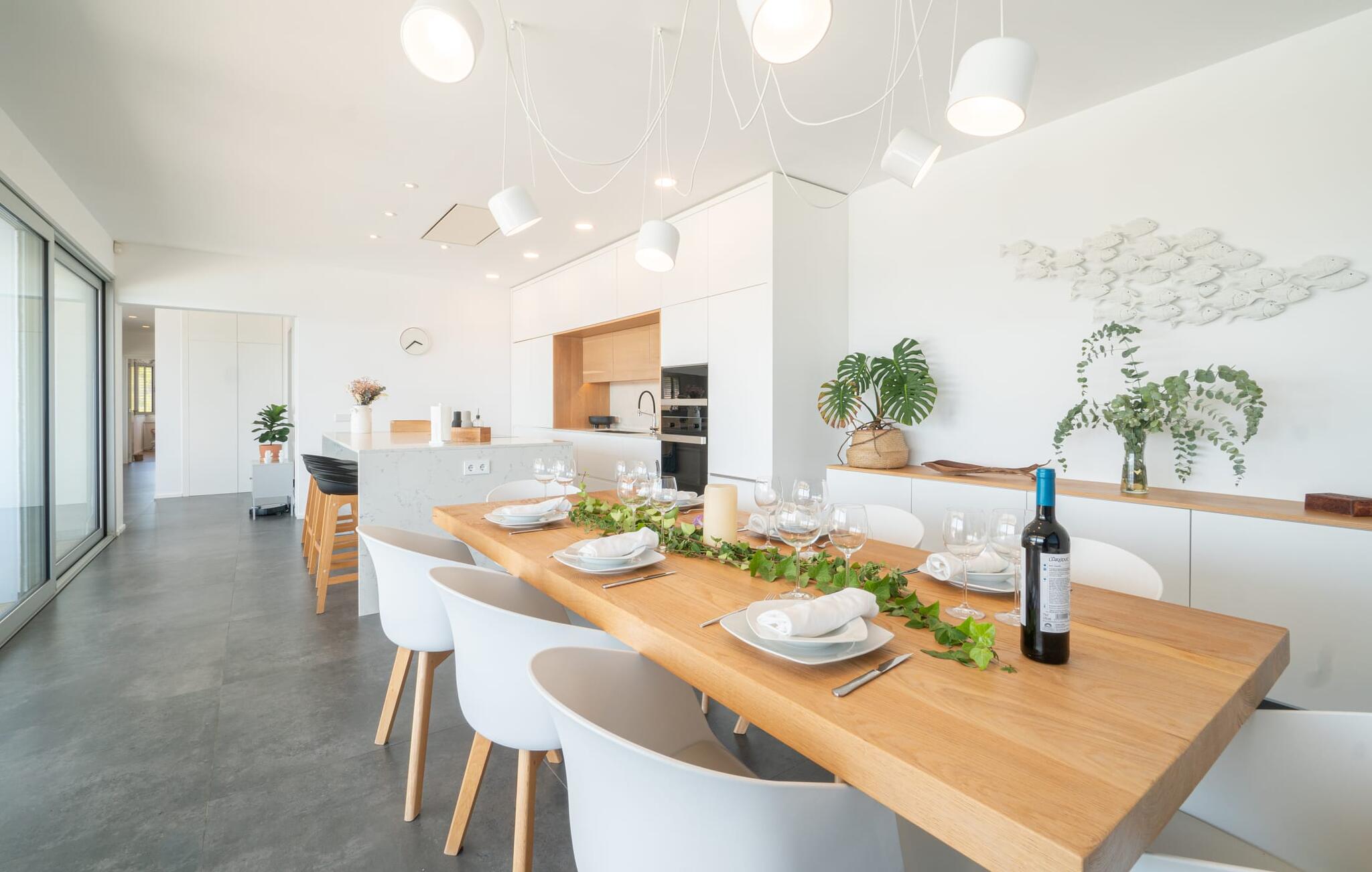 Ook van binnen is deze villa erg chic: de vele ramen laten veel licht binnen en bieden een fantastisch uitzicht op zee. Ze zijn ook voorzien van jaloezieën en rolluiken om ervoor te zorgen dat het huis niet te warm wordt op zonnige dagen. Veel wit en natuurlijke kleuren, gecombineerd met designmeubels en zorgvuldig geselecteerde woonaccessoires, zorgen voor een vriendelijke en stijlvolle sfeer in het hele huis. Op de begane grond zijn er twee smaakvol ingerichte slaapkamers met een gedeelde, moderne badkamer met ligbad, een uitnodigende entree en een praktische wasruimte. De bovenverdieping op zwembadniveau maakt indruk met een grote woonkamer, een ruim gastentoilet met douche en een werkplek die perfect is voor een kantoor aan huis Aansluitingen zijn beschikbaar als je je laptop wilt meenemen. De keuken, uitgerust met hoogwaardige apparatuur, en de open eethoek zijn ook echte hoogtepunten: Vanaf hier kun je genieten van uitzicht op het terras en de zee dankzij ramen van vloer tot plafond. Een extra slaapkamer met dressing en eigen badkamer ronden het wooncomfort af.