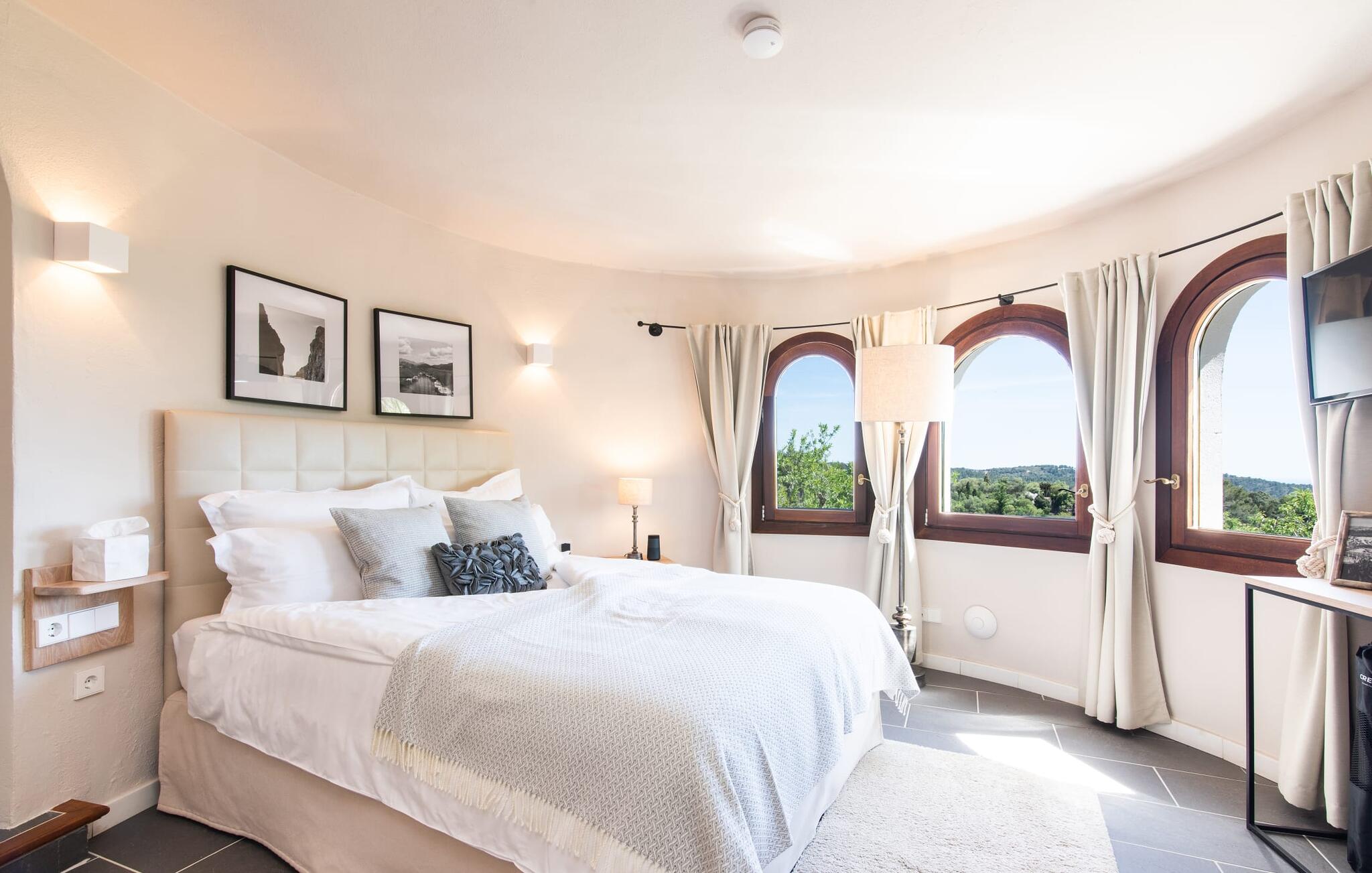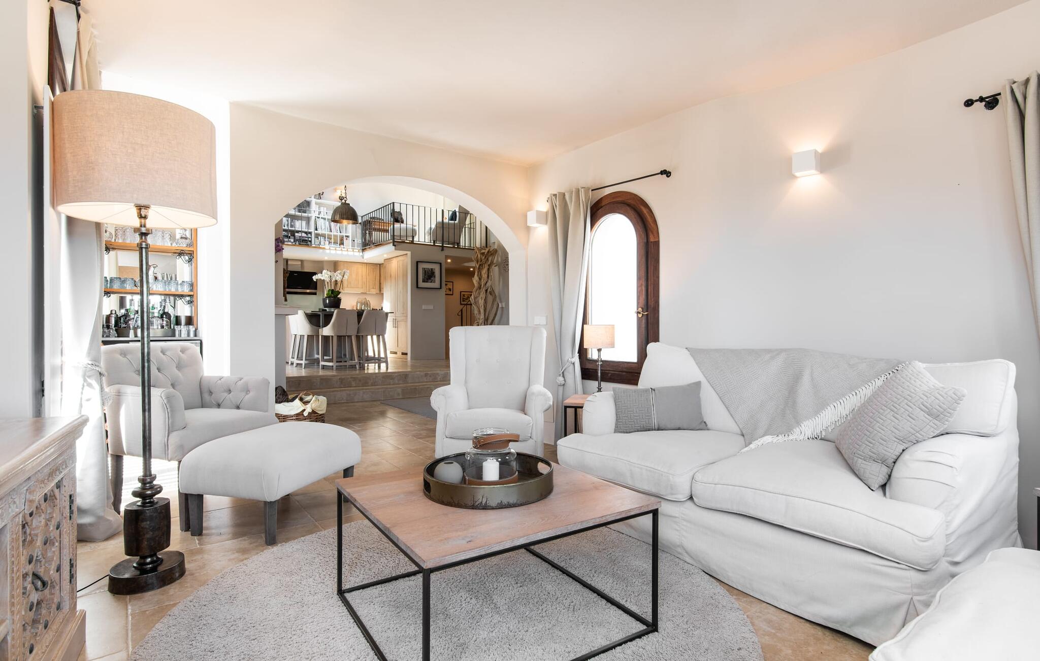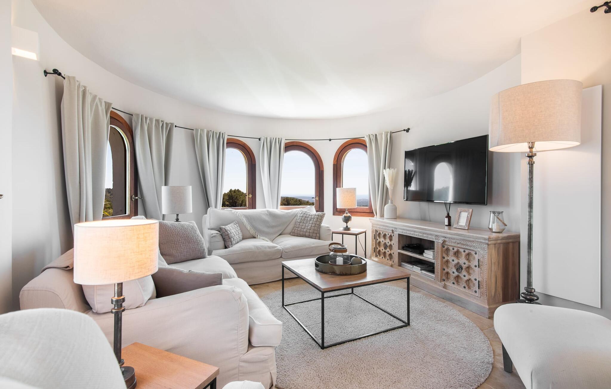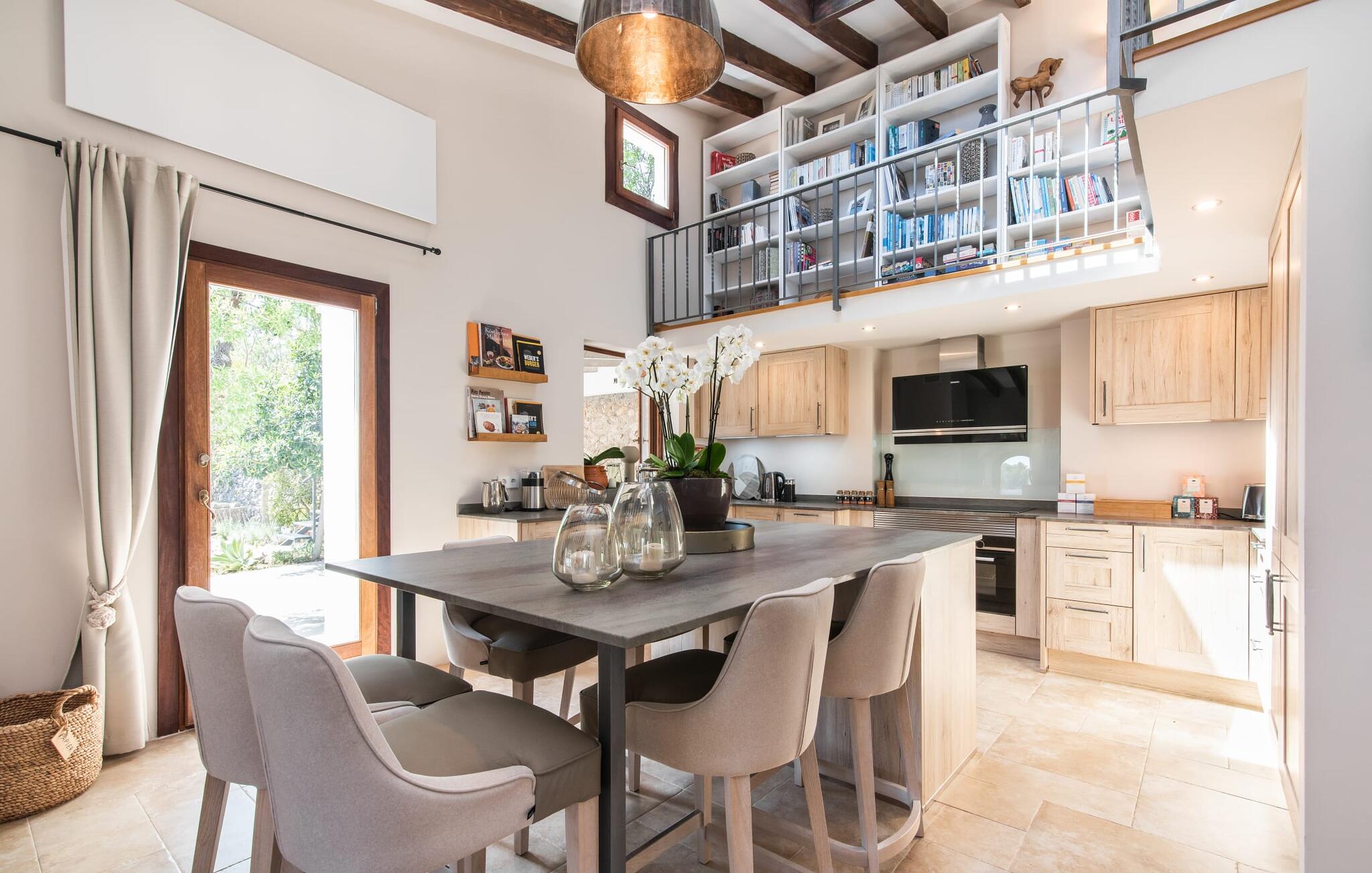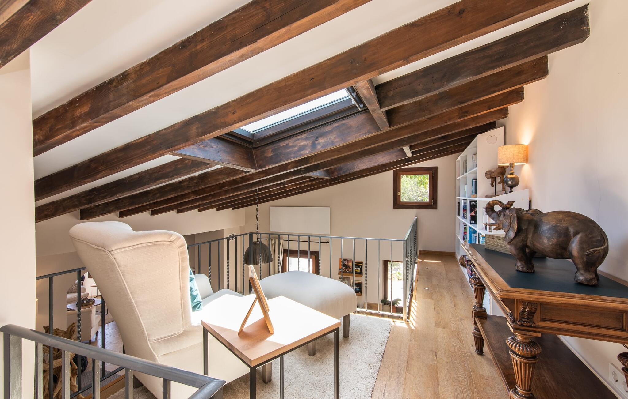 Het interieur van de vakantievilla is ingericht met aangenaam meubilair van hoge kwaliteit en biedt veel comfort. De woonkamer op de begane grond bevindt zich in de toren. Het is ingericht met gezellige banken en biedt een fantastisch uitzicht door de ronde ramen. Twee treden hoger en verbonden met de woonkamer via een boog ligt de ruime, moderne keuken met geïntegreerde eetkamer en toegang tot de buitenruimte. Een van de vele architectonische hoogtepunten van dit vakantiehuis is de galerij boven de keuken. Deze herbergt een kleine bibliotheek en een uitnodigende leeshoek. Op de begane grond bevindt zich ook een van de vier tweepersoonsslaapkamers met een eigen badkamer en een gastentoilet. De overige drie slaapgedeeltes bevinden zich op de bovenverdieping. Dankzij de ligging op een heuvel biedt de bovenverdieping ook directe toegang tot verdere zonneterrassen en heerlijke plekken om te ontspannen in de schaduw. Het hele huis is voorzien van airconditioning en verwarming en biedt het hele jaar door een aangenaam binnenklimaat. Het kleine dorpje Galilea ligt op slechts 30 km ten westen van Palma in het hart van het Tramuntana-gebergte. Winkelmogelijkheden zijn te vinden in Puigpunyent, op 5 km afstand, of in Calviá, op 10 km afstand. De zandstranden van Peguera en Santa Ponsa zijn met de auto in 25 tot 30 minuten te bereiken.