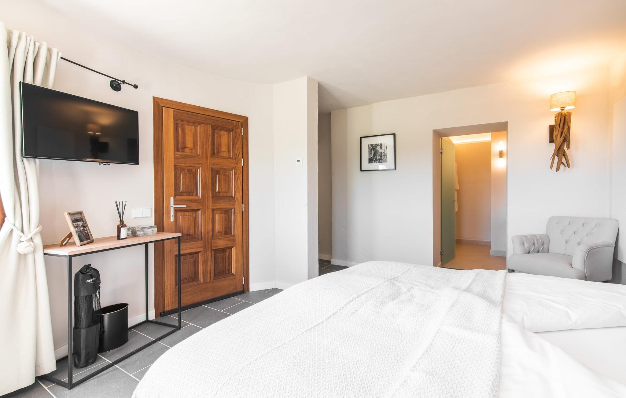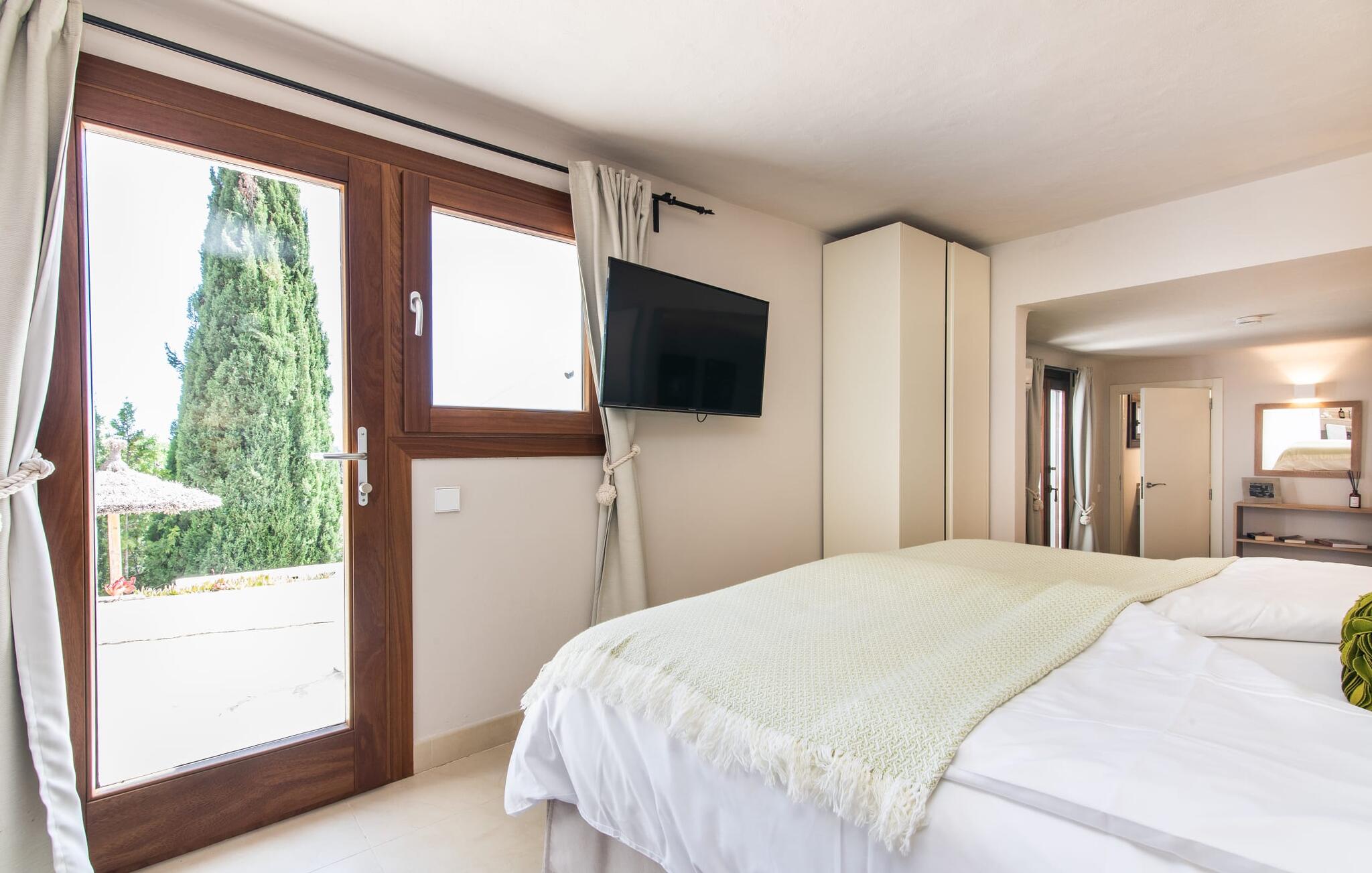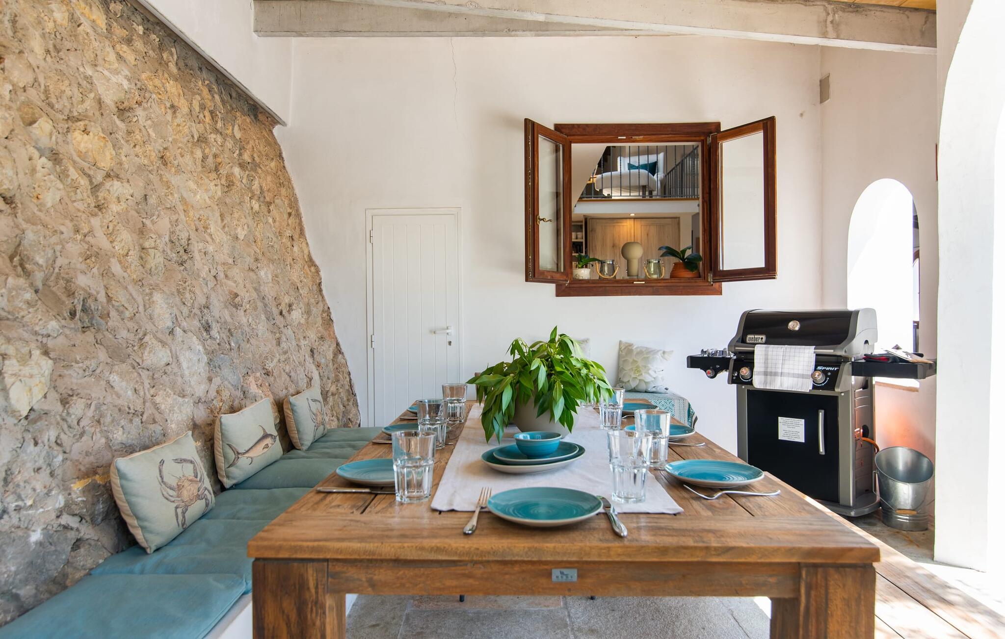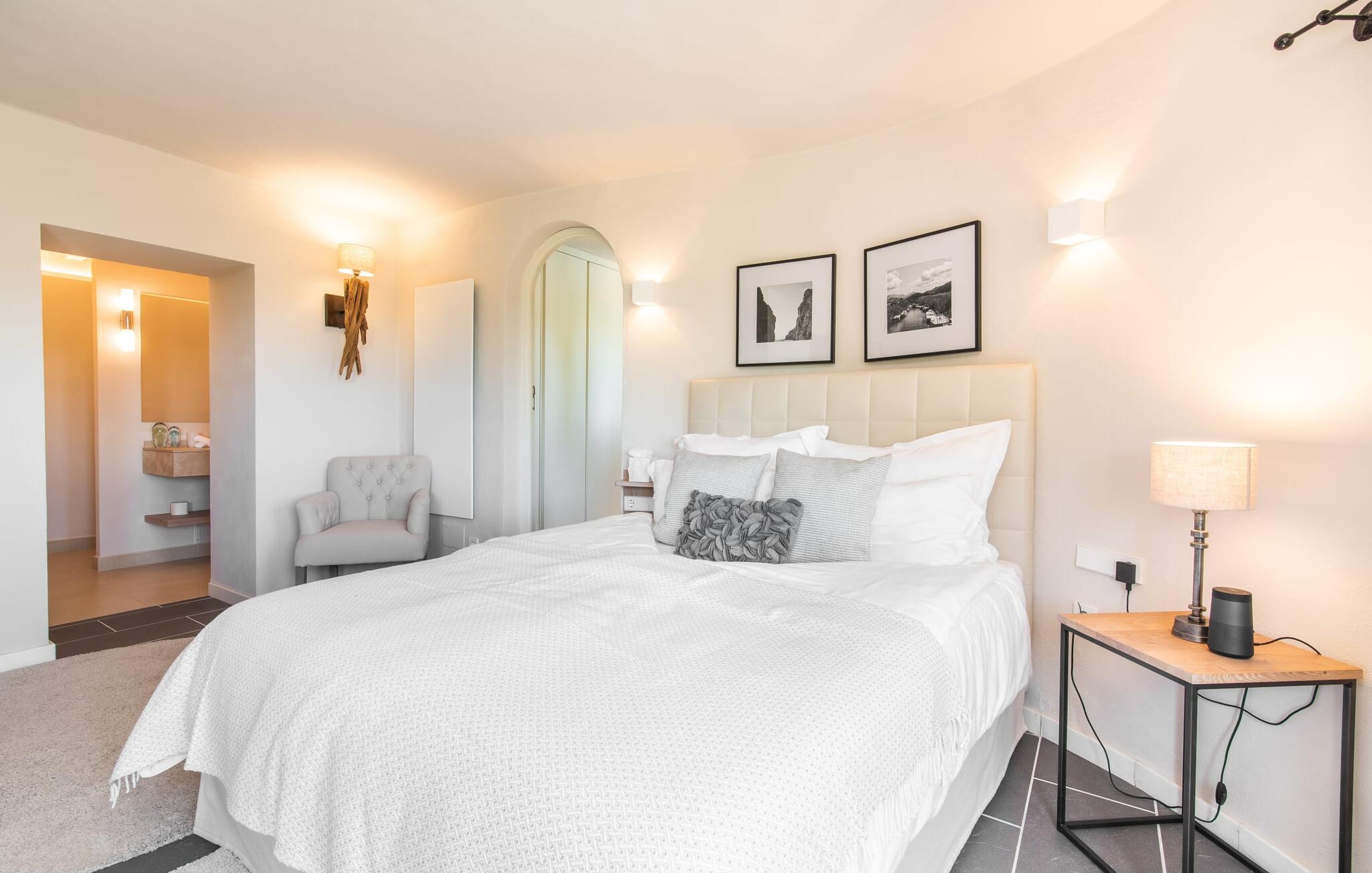 Het interieur van de vakantievilla is ingericht met aangenaam meubilair van hoge kwaliteit en biedt veel comfort. De woonkamer op de begane grond bevindt zich in de toren. Het is ingericht met gezellige banken en biedt een fantastisch uitzicht door de ronde ramen. Twee treden hoger en verbonden met de woonkamer via een boog ligt de ruime, moderne keuken met geïntegreerde eetkamer en toegang tot de buitenruimte. Een van de vele architectonische hoogtepunten van dit vakantiehuis is de galerij boven de keuken. Deze herbergt een kleine bibliotheek en een uitnodigende leeshoek. Op de begane grond bevindt zich ook een van de vier tweepersoonsslaapkamers met een eigen badkamer en een gastentoilet. De overige drie slaapgedeeltes bevinden zich op de bovenverdieping. Dankzij de ligging op een heuvel biedt de bovenverdieping ook directe toegang tot verdere zonneterrassen en heerlijke plekken om te ontspannen in de schaduw. Het hele huis is voorzien van airconditioning en verwarming en biedt het hele jaar door een aangenaam binnenklimaat. Het kleine dorpje Galilea ligt op slechts 30 km ten westen van Palma in het hart van het Tramuntana-gebergte. Winkelmogelijkheden zijn te vinden in Puigpunyent, op 5 km afstand, of in Calviá, op 10 km afstand. De zandstranden van Peguera en Santa Ponsa zijn met de auto in 25 tot 30 minuten te bereiken.