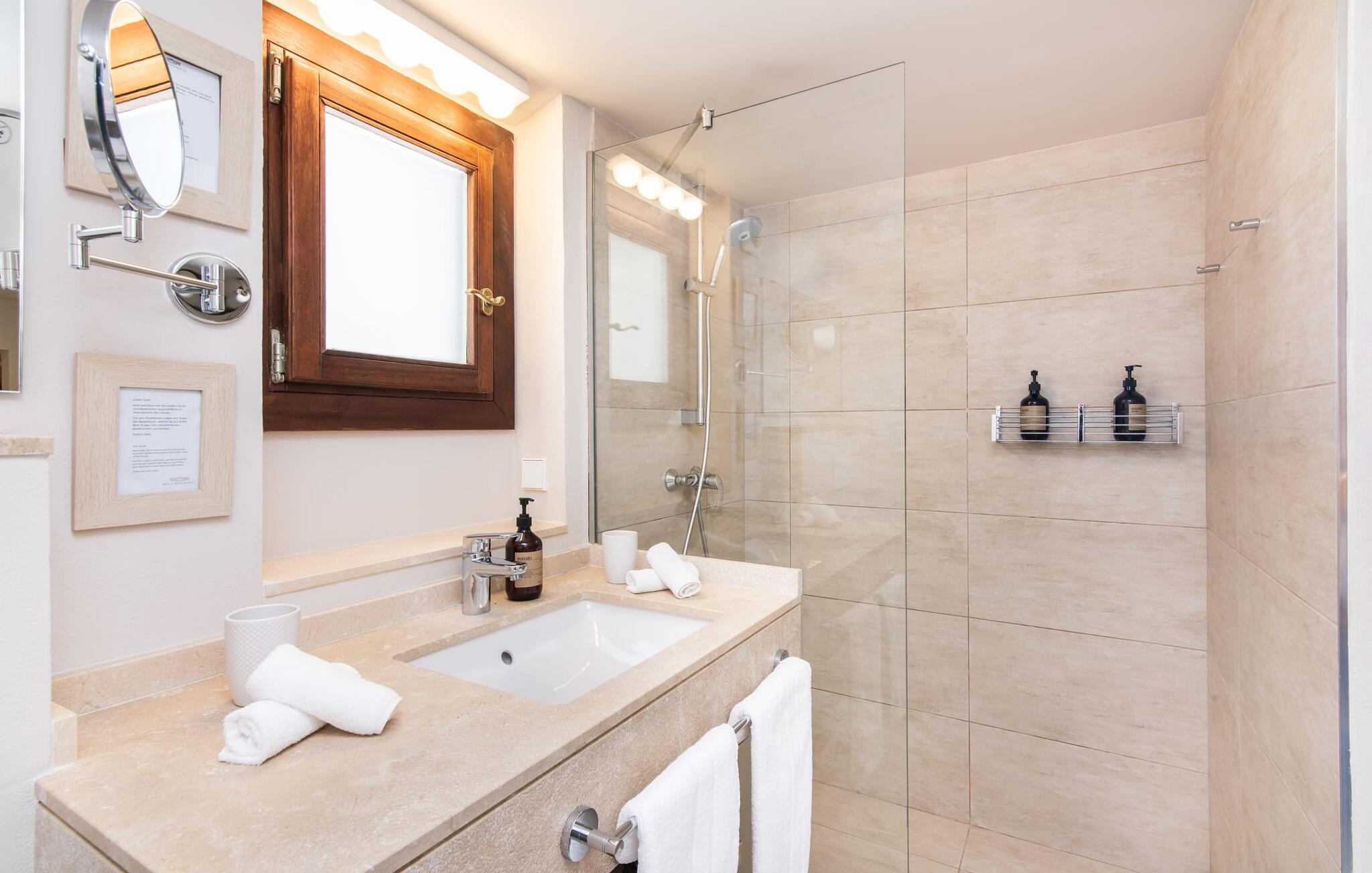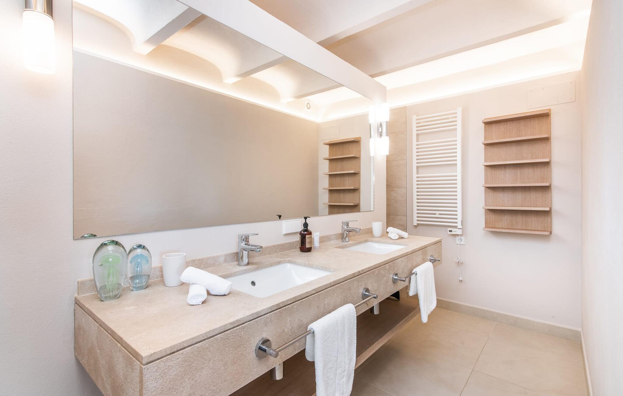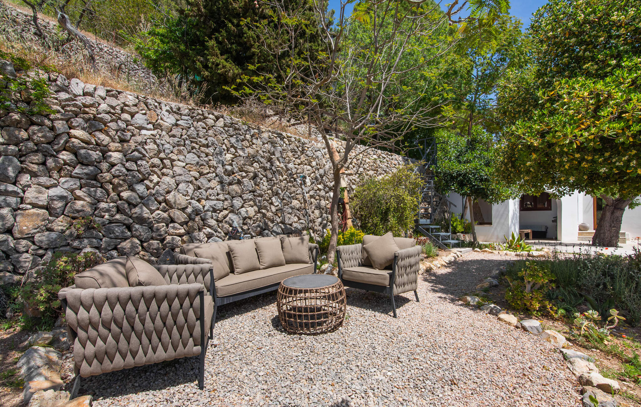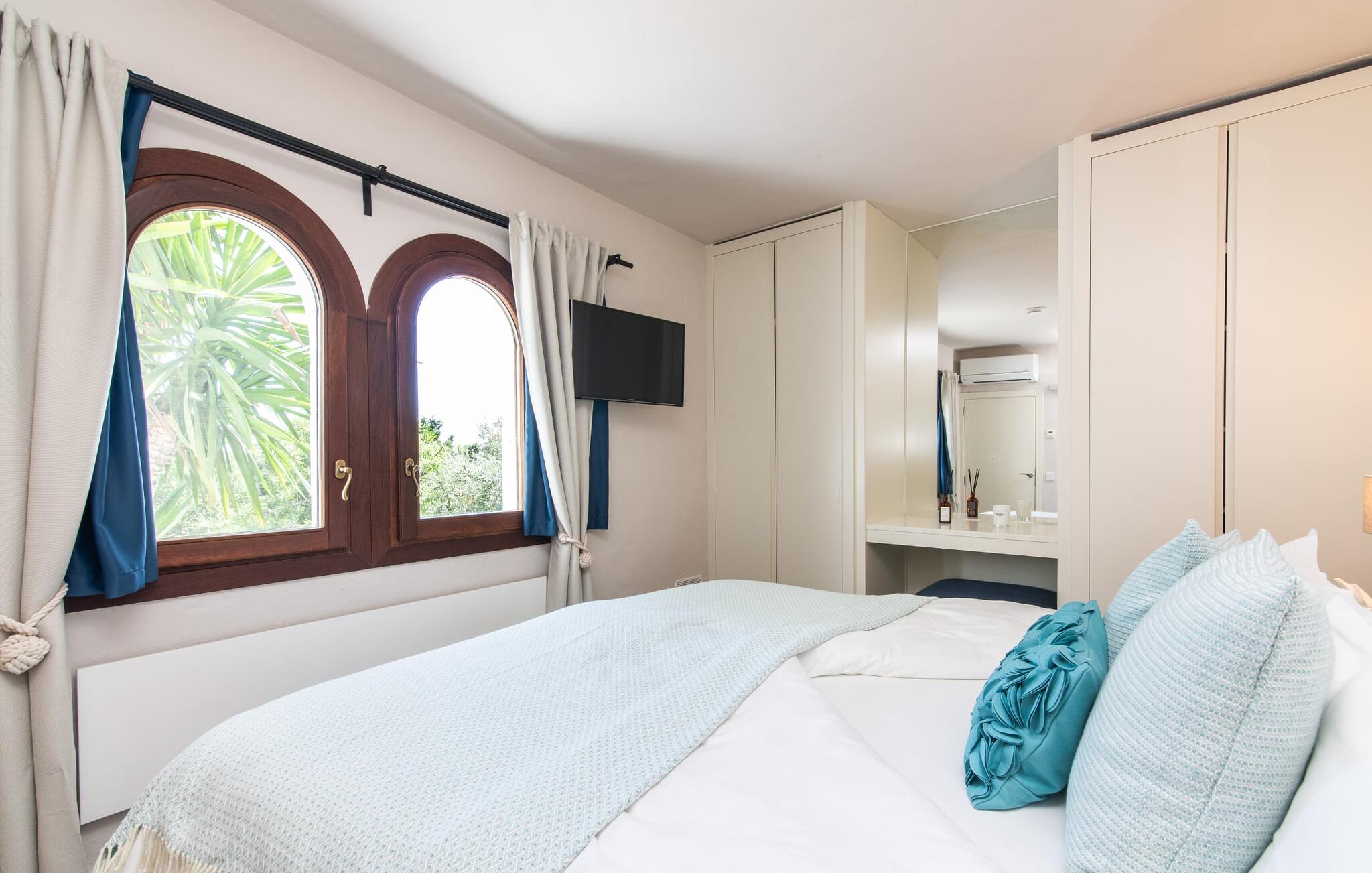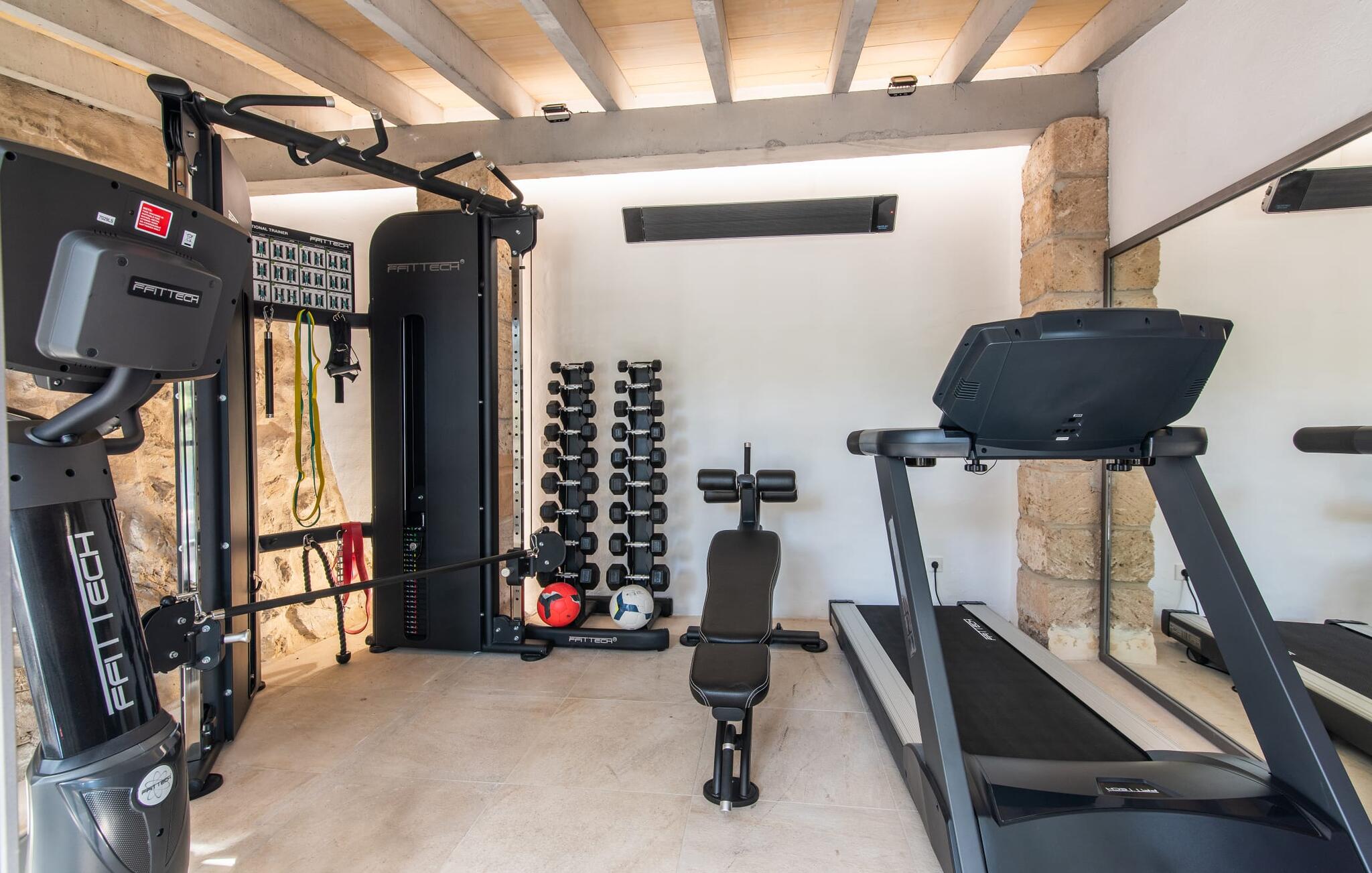Het interieur van de vakantievilla is ingericht met aangenaam meubilair van hoge kwaliteit en biedt veel comfort. De woonkamer op de begane grond bevindt zich in de toren. Het is ingericht met gezellige banken en biedt een fantastisch uitzicht door de ronde ramen. Twee treden hoger en verbonden met de woonkamer via een boog ligt de ruime, moderne keuken met geïntegreerde eetkamer en toegang tot de buitenruimte. Een van de vele architectonische hoogtepunten van dit vakantiehuis is de galerij boven de keuken. Deze herbergt een kleine bibliotheek en een uitnodigende leeshoek. Op de begane grond bevindt zich ook een van de vier tweepersoonsslaapkamers met een eigen badkamer en een gastentoilet. De overige drie slaapgedeeltes bevinden zich op de bovenverdieping. Dankzij de ligging op een heuvel biedt de bovenverdieping ook directe toegang tot verdere zonneterrassen en heerlijke plekken om te ontspannen in de schaduw. Het hele huis is voorzien van airconditioning en verwarming en biedt het hele jaar door een aangenaam binnenklimaat. Het kleine dorpje Galilea ligt op slechts 30 km ten westen van Palma in het hart van het Tramuntana-gebergte. Winkelmogelijkheden zijn te vinden in Puigpunyent, op 5 km afstand, of in Calviá, op 10 km afstand. De zandstranden van Peguera en Santa Ponsa zijn met de auto in 25 tot 30 minuten te bereiken.