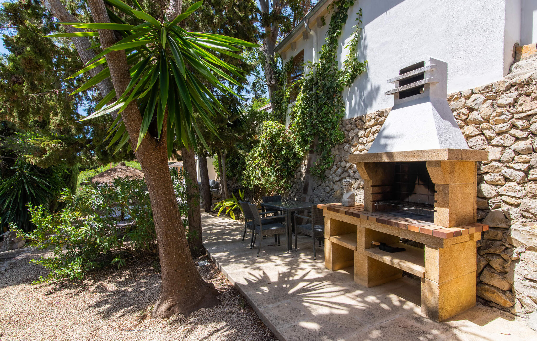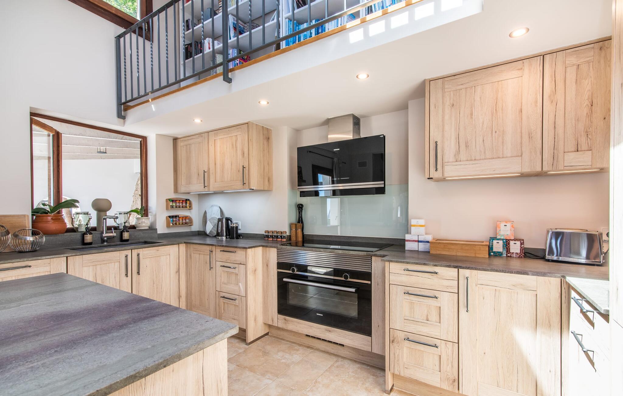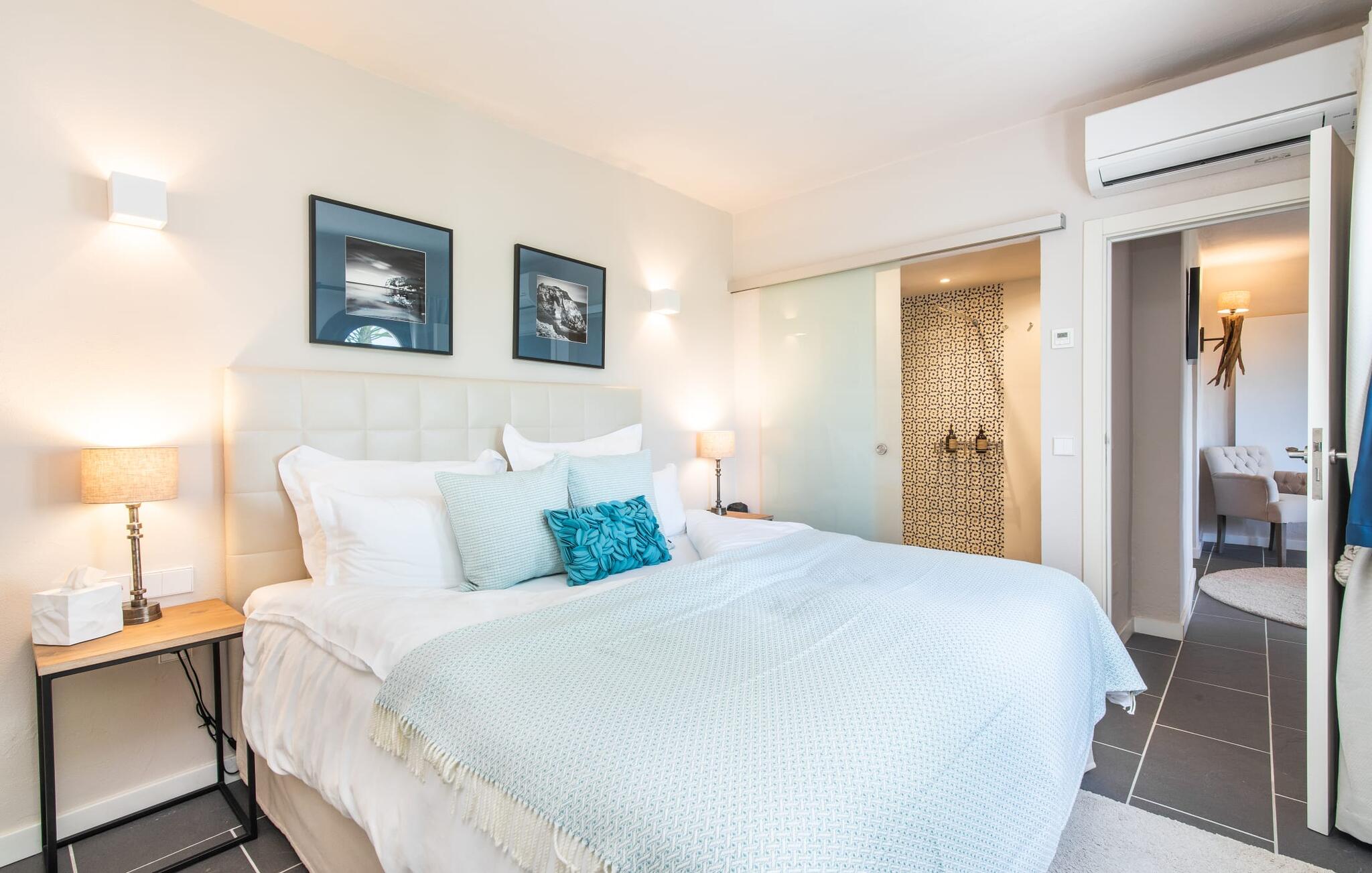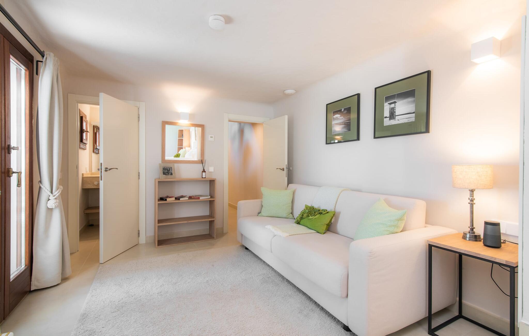 Het interieur van de vakantievilla is ingericht met aangenaam meubilair van hoge kwaliteit en biedt veel comfort. De woonkamer op de begane grond bevindt zich in de toren. Het is ingericht met gezellige banken en biedt een fantastisch uitzicht door de ronde ramen. Twee treden hoger en verbonden met de woonkamer via een boog ligt de ruime, moderne keuken met geïntegreerde eetkamer en toegang tot de buitenruimte. Een van de vele architectonische hoogtepunten van dit vakantiehuis is de galerij boven de keuken. Deze herbergt een kleine bibliotheek en een uitnodigende leeshoek. Op de begane grond bevindt zich ook een van de vier tweepersoonsslaapkamers met een eigen badkamer en een gastentoilet. De overige drie slaapgedeeltes bevinden zich op de bovenverdieping. Dankzij de ligging op een heuvel biedt de bovenverdieping ook directe toegang tot verdere zonneterrassen en heerlijke plekken om te ontspannen in de schaduw. Het hele huis is voorzien van airconditioning en verwarming en biedt het hele jaar door een aangenaam binnenklimaat. Het kleine dorpje Galilea ligt op slechts 30 km ten westen van Palma in het hart van het Tramuntana-gebergte. Winkelmogelijkheden zijn te vinden in Puigpunyent, op 5 km afstand, of in Calviá, op 10 km afstand. De zandstranden van Peguera en Santa Ponsa zijn met de auto in 25 tot 30 minuten te bereiken.