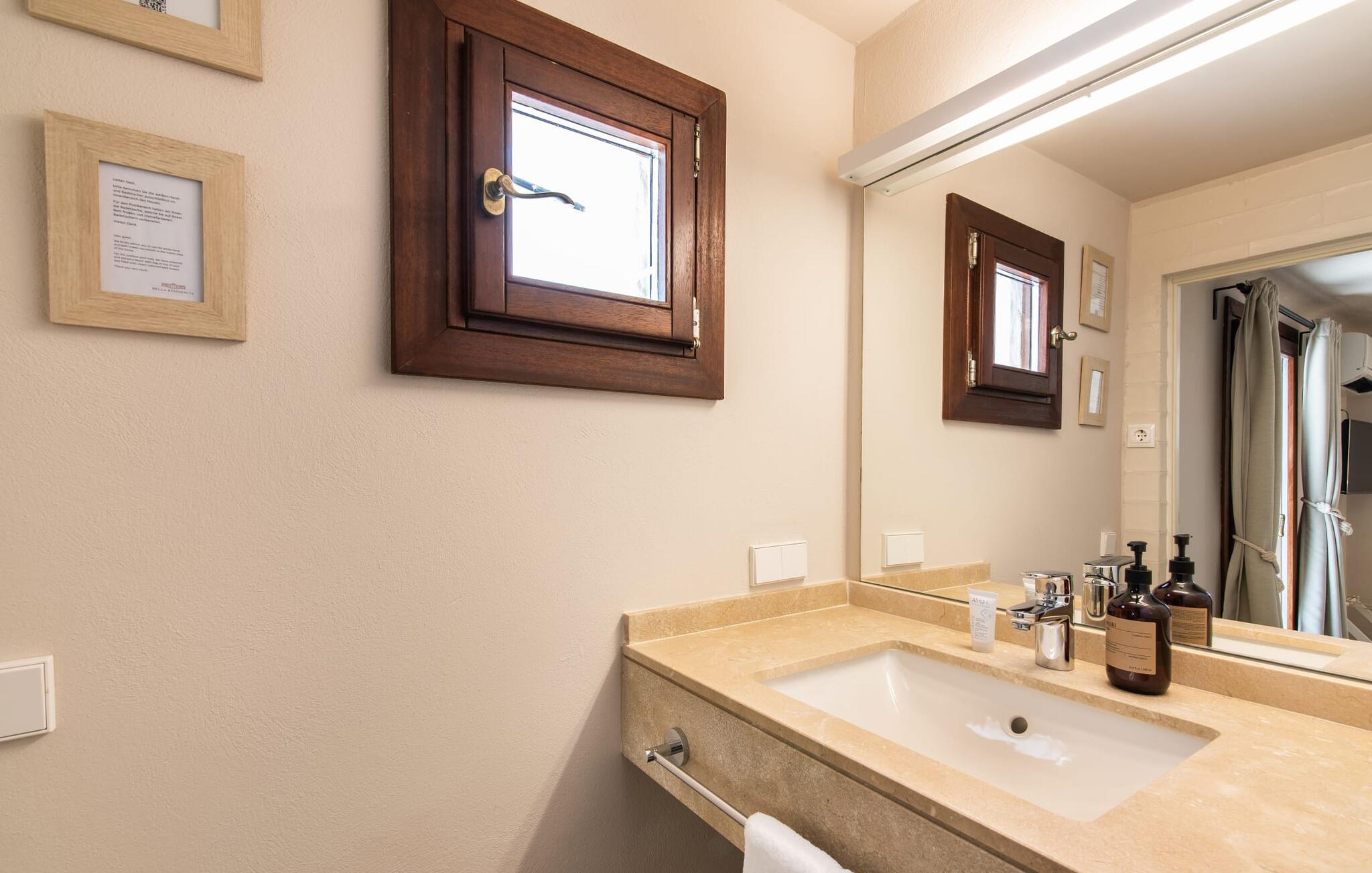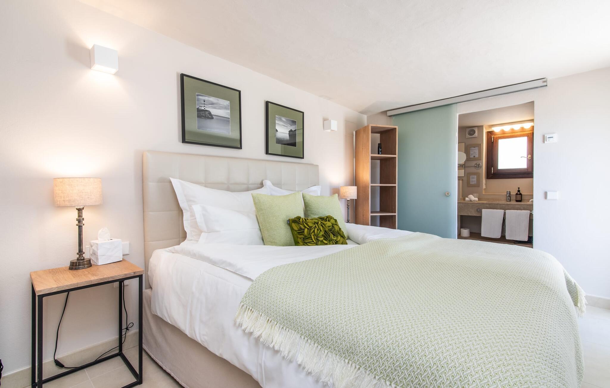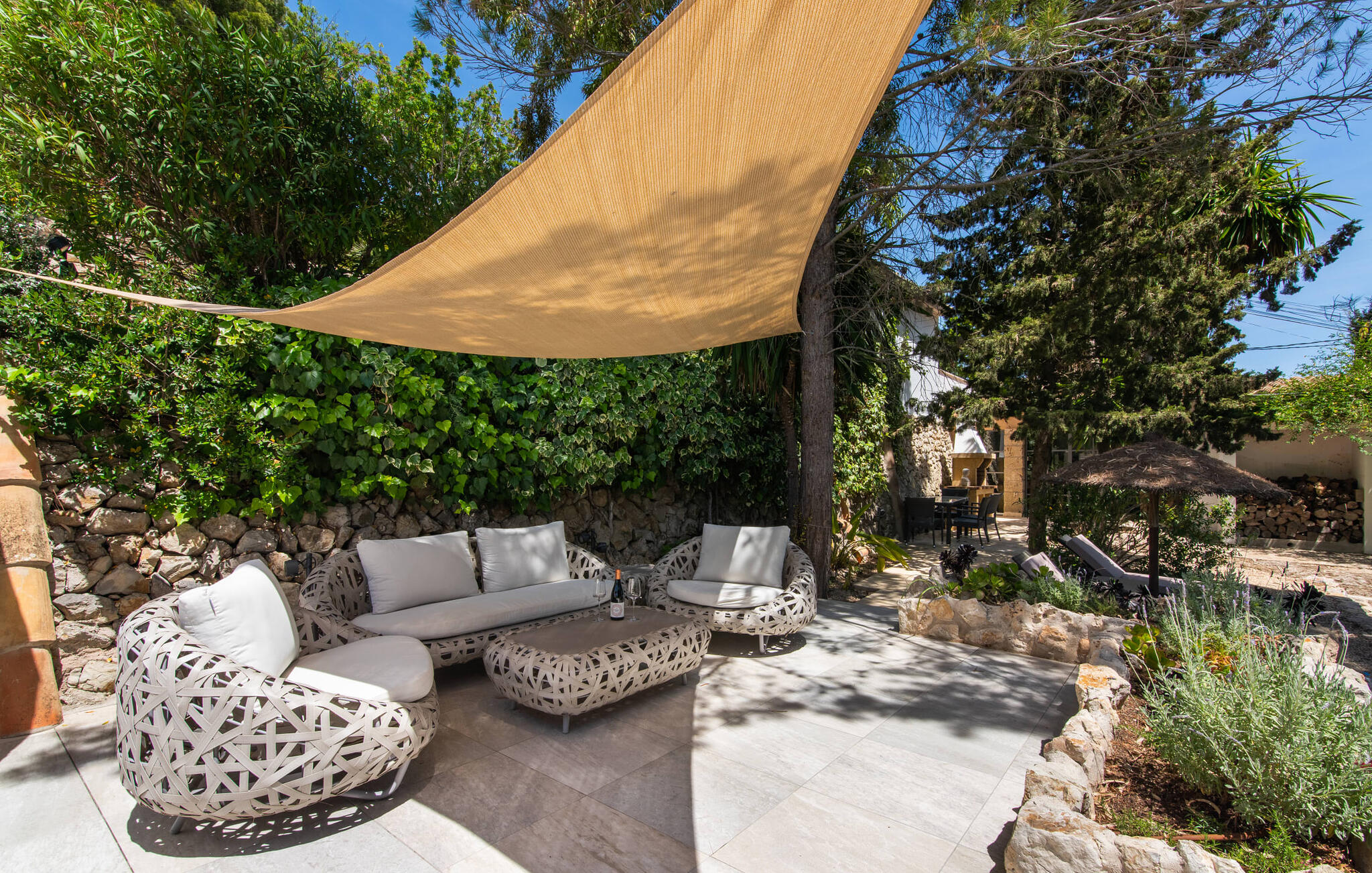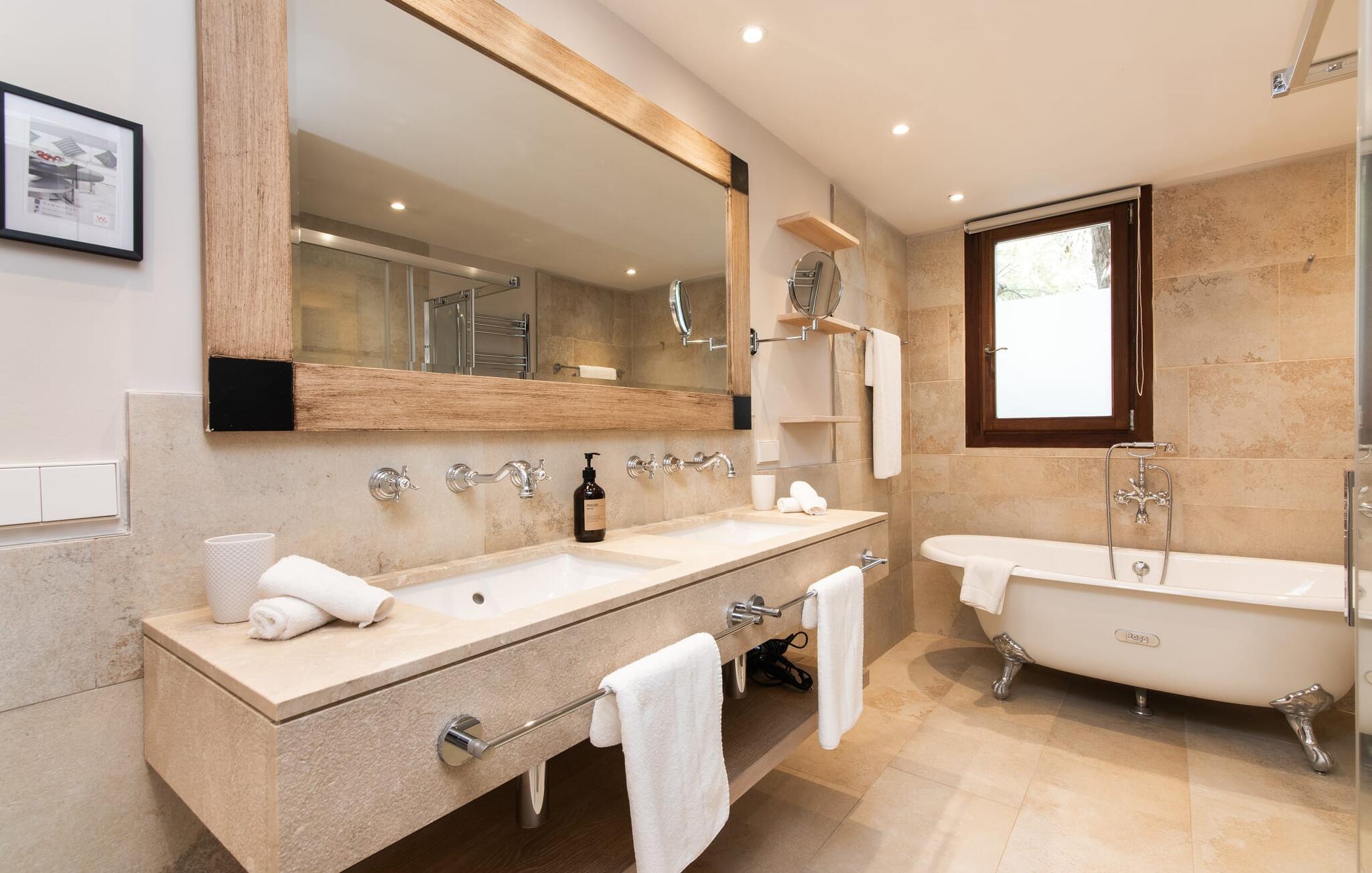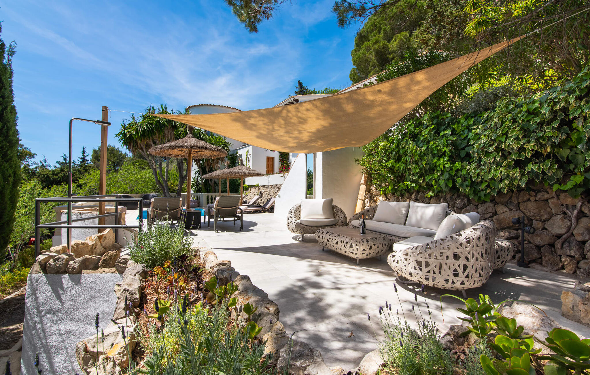 Het interieur van de vakantievilla is ingericht met aangenaam meubilair van hoge kwaliteit en biedt veel comfort. De woonkamer op de begane grond bevindt zich in de toren. Het is ingericht met gezellige banken en biedt een fantastisch uitzicht door de ronde ramen. Twee treden hoger en verbonden met de woonkamer via een boog ligt de ruime, moderne keuken met geïntegreerde eetkamer en toegang tot de buitenruimte. Een van de vele architectonische hoogtepunten van dit vakantiehuis is de galerij boven de keuken. Deze herbergt een kleine bibliotheek en een uitnodigende leeshoek. Op de begane grond bevindt zich ook een van de vier tweepersoonsslaapkamers met een eigen badkamer en een gastentoilet. De overige drie slaapgedeeltes bevinden zich op de bovenverdieping. Dankzij de ligging op een heuvel biedt de bovenverdieping ook directe toegang tot verdere zonneterrassen en heerlijke plekken om te ontspannen in de schaduw. Het hele huis is voorzien van airconditioning en verwarming en biedt het hele jaar door een aangenaam binnenklimaat. Het kleine dorpje Galilea ligt op slechts 30 km ten westen van Palma in het hart van het Tramuntana-gebergte. Winkelmogelijkheden zijn te vinden in Puigpunyent, op 5 km afstand, of in Calviá, op 10 km afstand. De zandstranden van Peguera en Santa Ponsa zijn met de auto in 25 tot 30 minuten te bereiken.