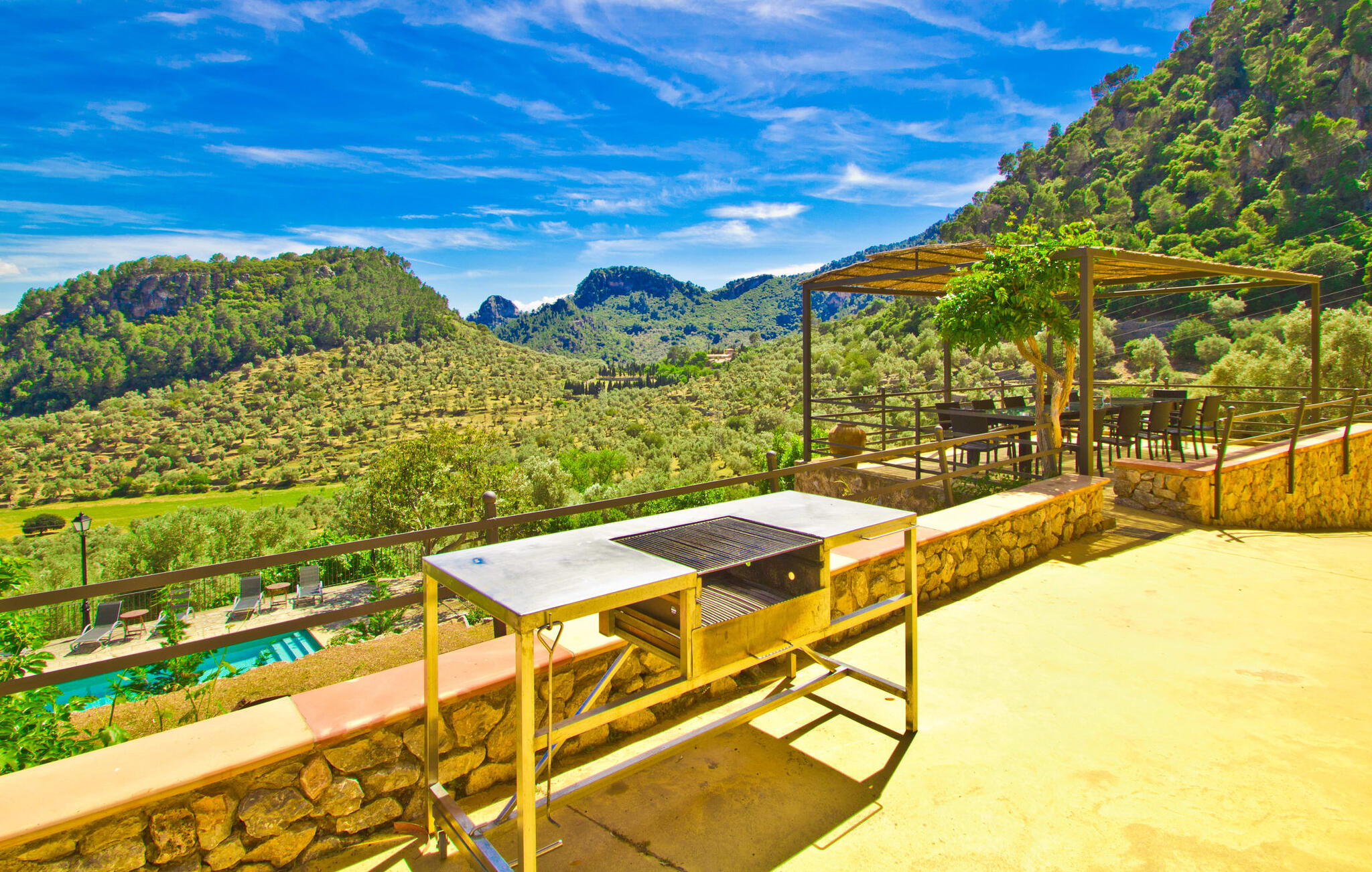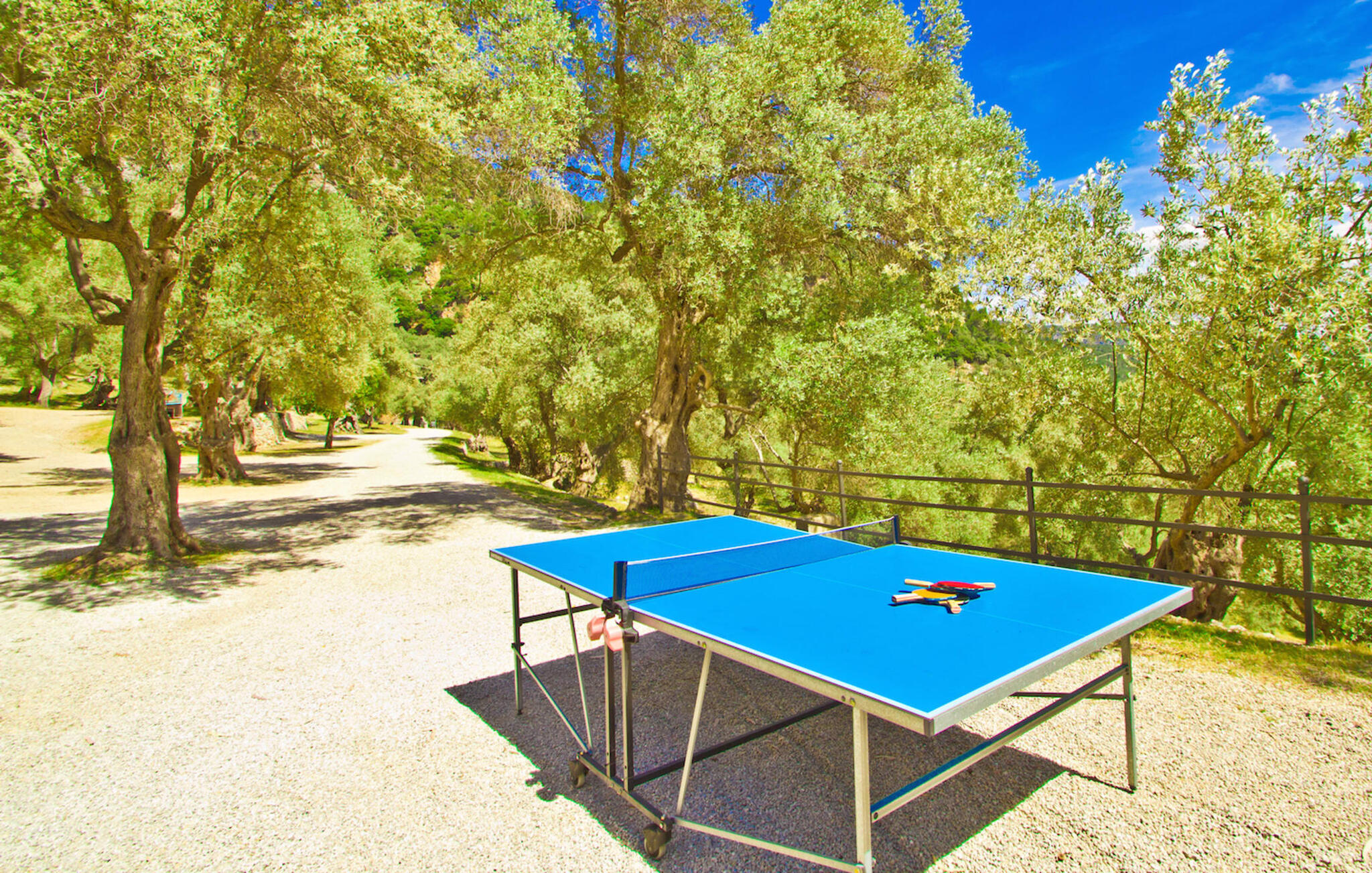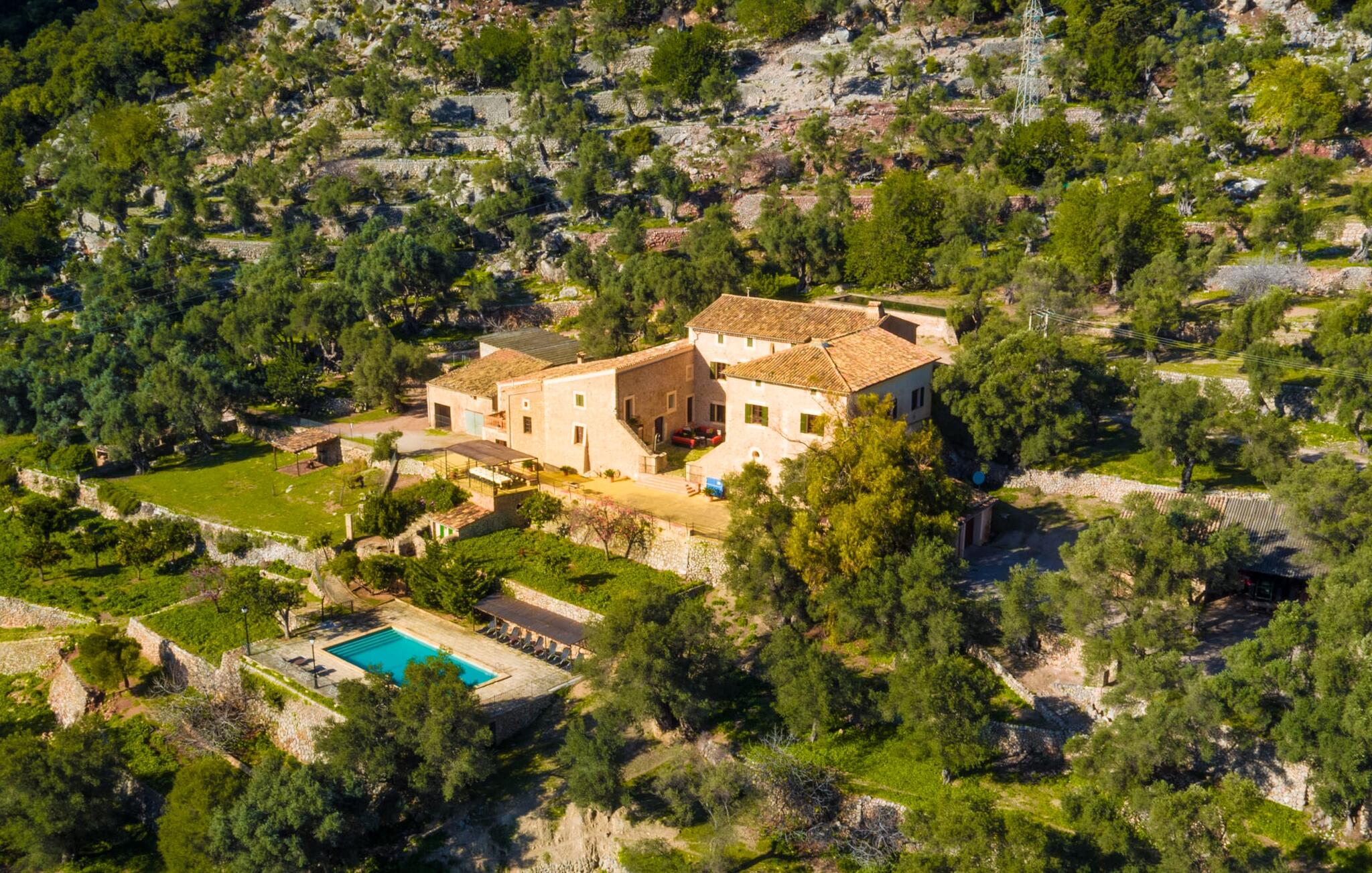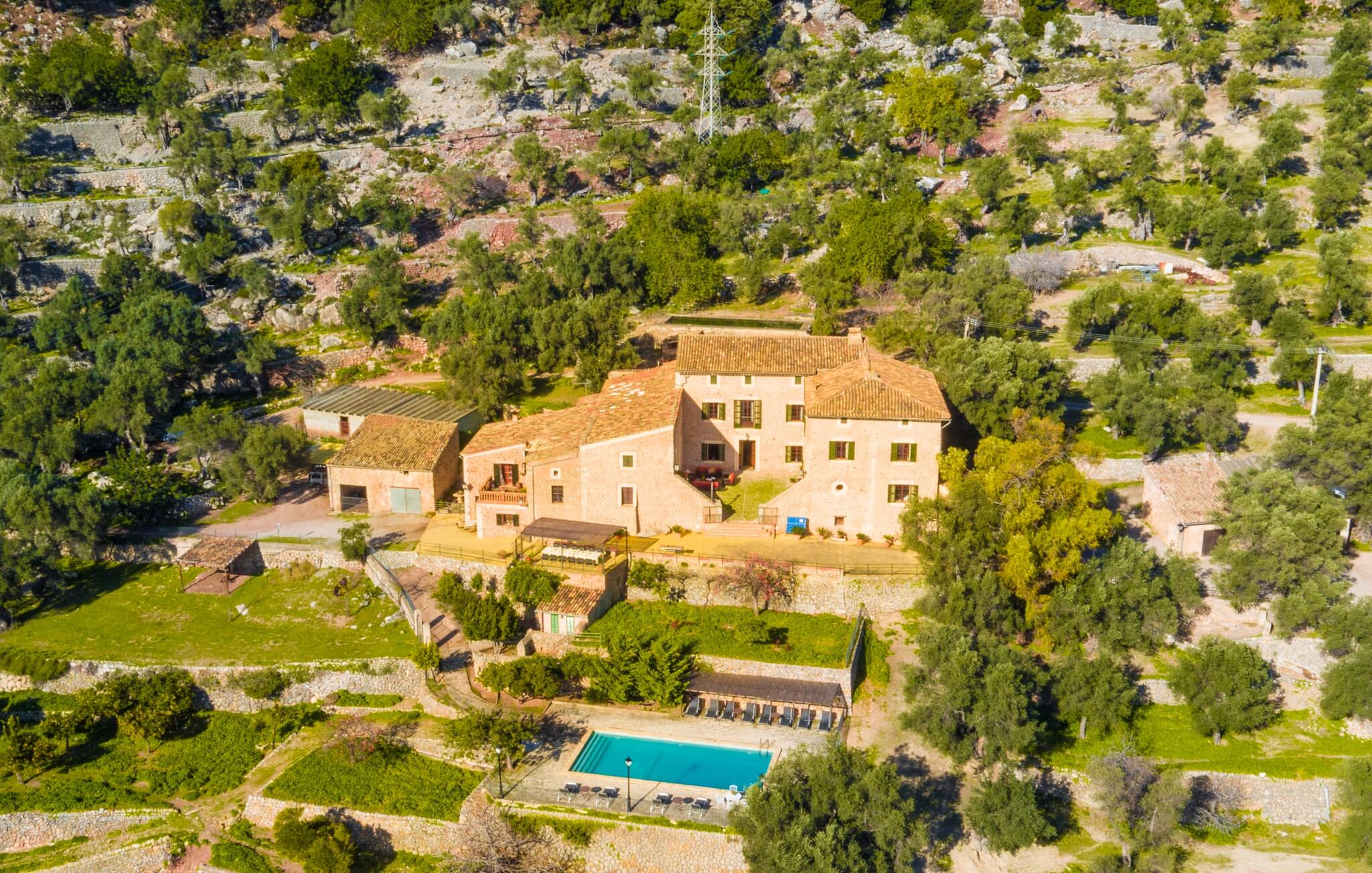 De rit naar de prachtig gelegen, rustieke Finca Biniforani Nou voert ons over de oude bergweg die de hoofdstad Palma verbindt met het mooie stadje Sóller. De kronkelige weg wordt vandaag de dag zelden bereden, maar voert je door het dramatisch mooie landschap van het Tramuntana-gebergte, dat is uitgeroepen tot UNESCO Werelderfgoed. De villa ligt midden in deze unieke natuurlijke omgeving op een enorm stuk grond, vlakbij een van de grootste steden van Mallorca, Sóller. Het is absoluut rustig, volledig afgelegen en omgeven door groene heuvels die een geweldig uitzicht bieden waarvan je kunt genieten vanaf talloze plekken op het terrein. Een ideale vakantiebestemming voor gasten die met een grote groep reizen, bijvoorbeeld om te wandelen, en die hun vakantie in volledige privacy willen doorbrengen in een comfortabele, ruime finca. Het buitengedeelte van de finca biedt net zoveel als het interieur van de rustieke finca. Naast de grote, overdekte eethoek, die lijkt op een panoramisch terras, is er een ingebouwde barbecue. Ook vanaf hier kun je genieten van het unieke uitzicht op de natuurlijke omgeving, dat gewoon niet te overtreffen is. Net onder het hierboven beschreven panoramische terras met eethoek vind je het zwembad en de omgeving. Er staan 16 comfortabele ligstoelen rond het zwembad, dat je kunt beschaduwen met gedeeltelijke luifels of een parasol. Als je zin hebt, kun je je tafeltennisvaardigheden aanscherpen en vrienden of familie uitnodigen voor een wedstrijdje.