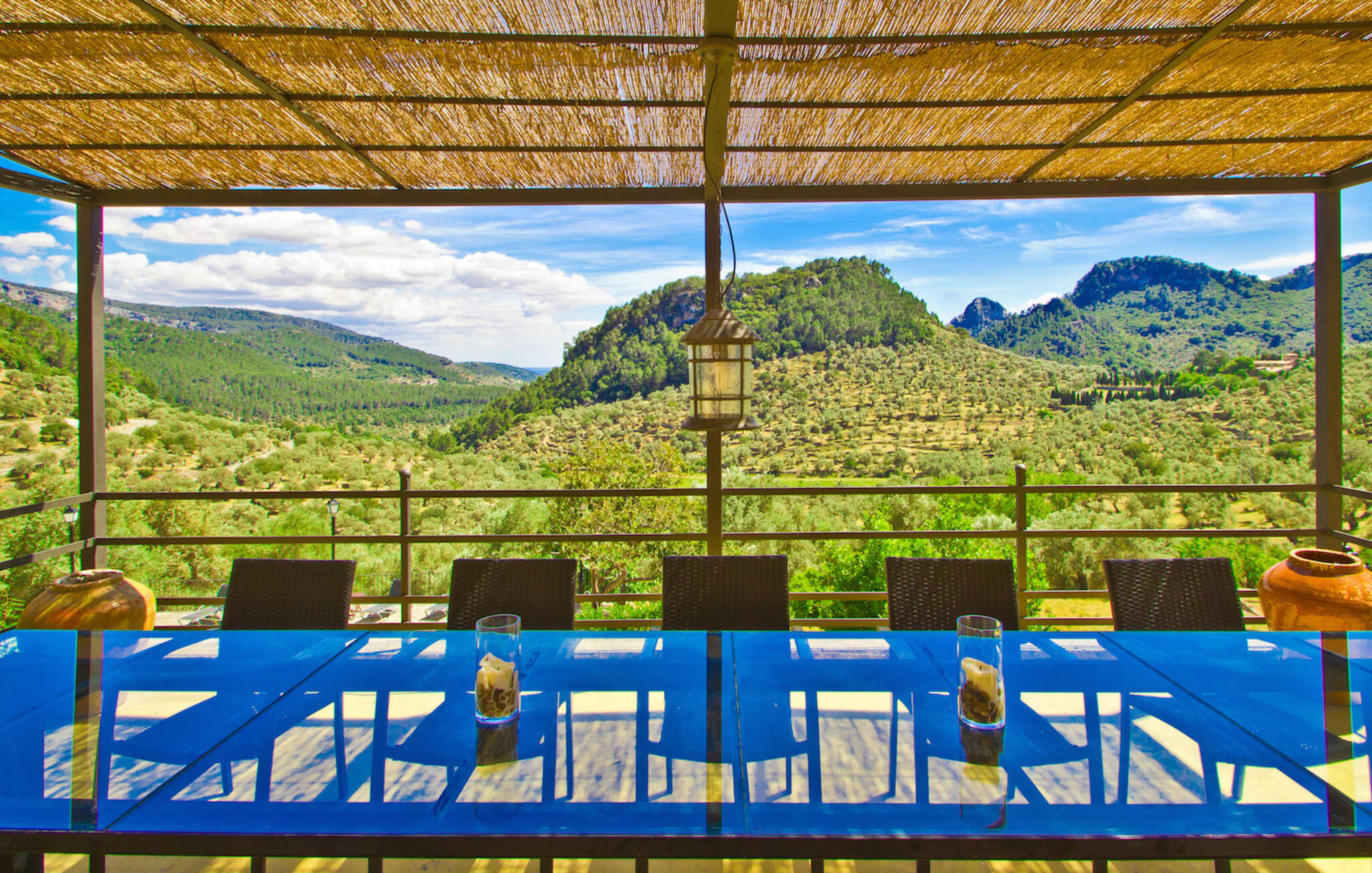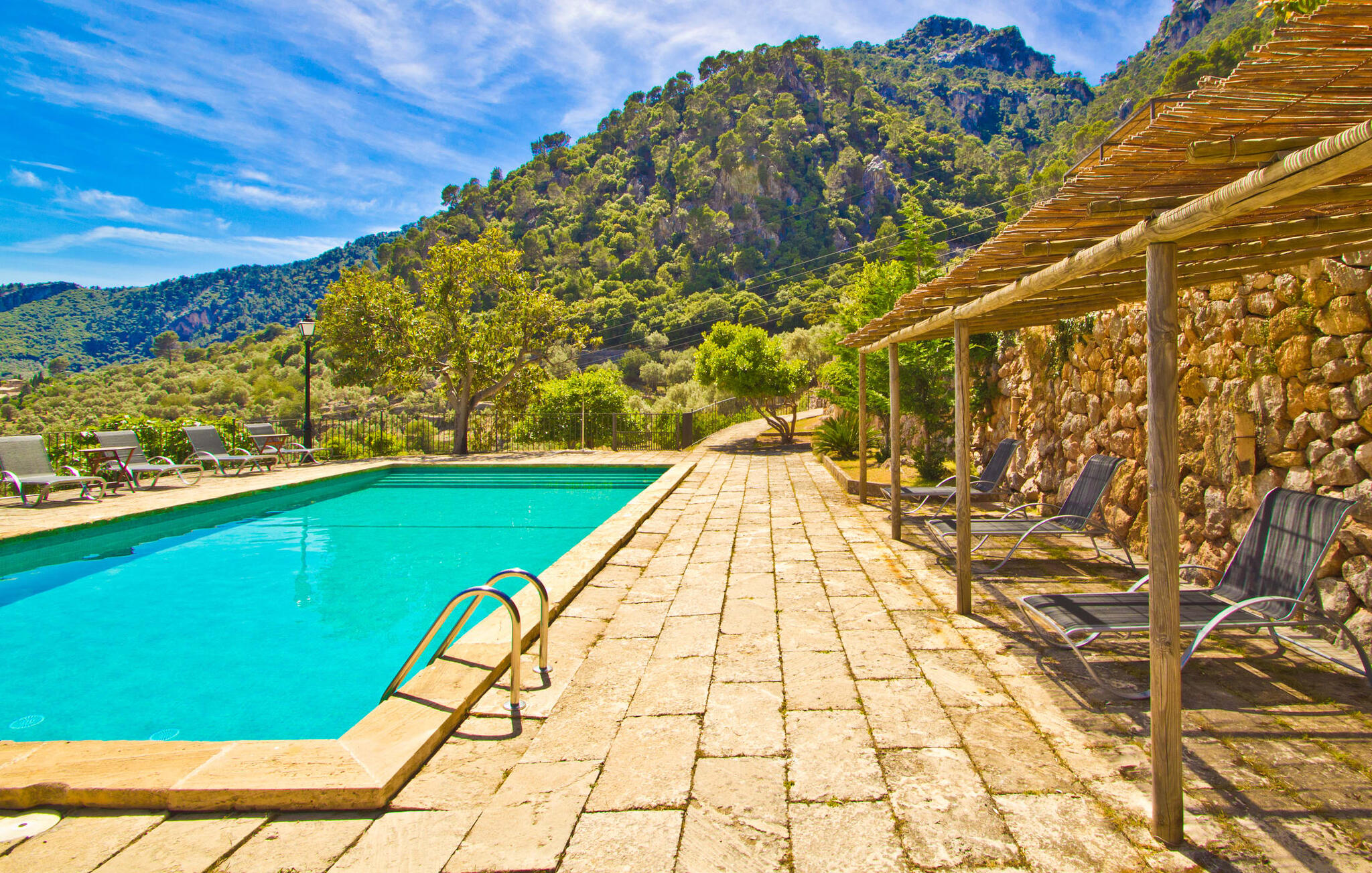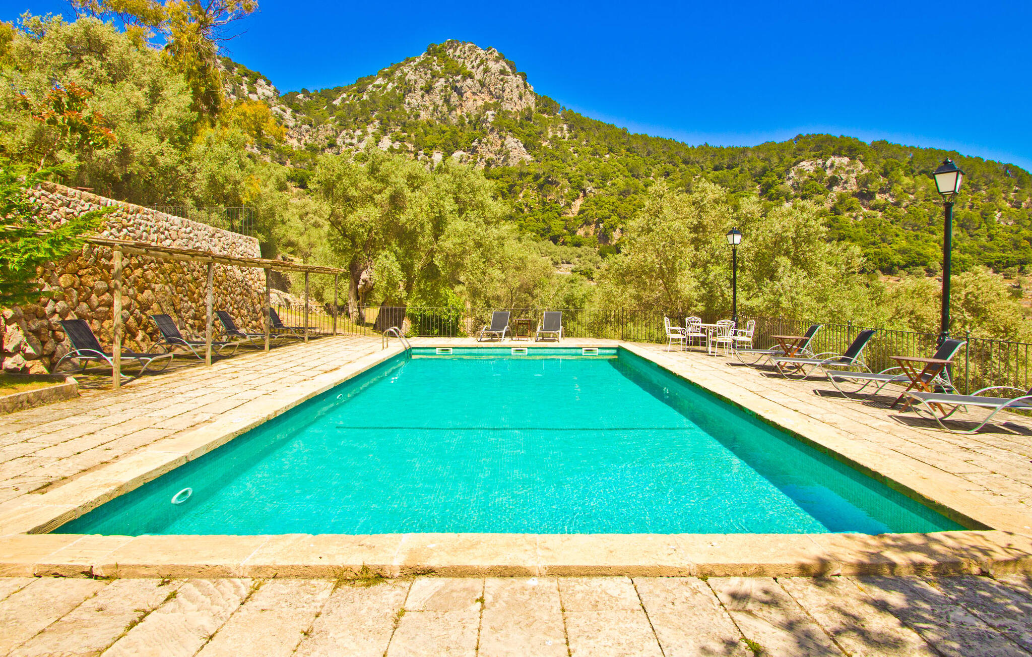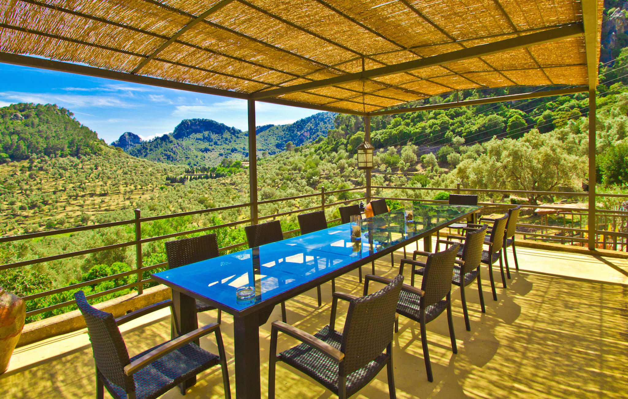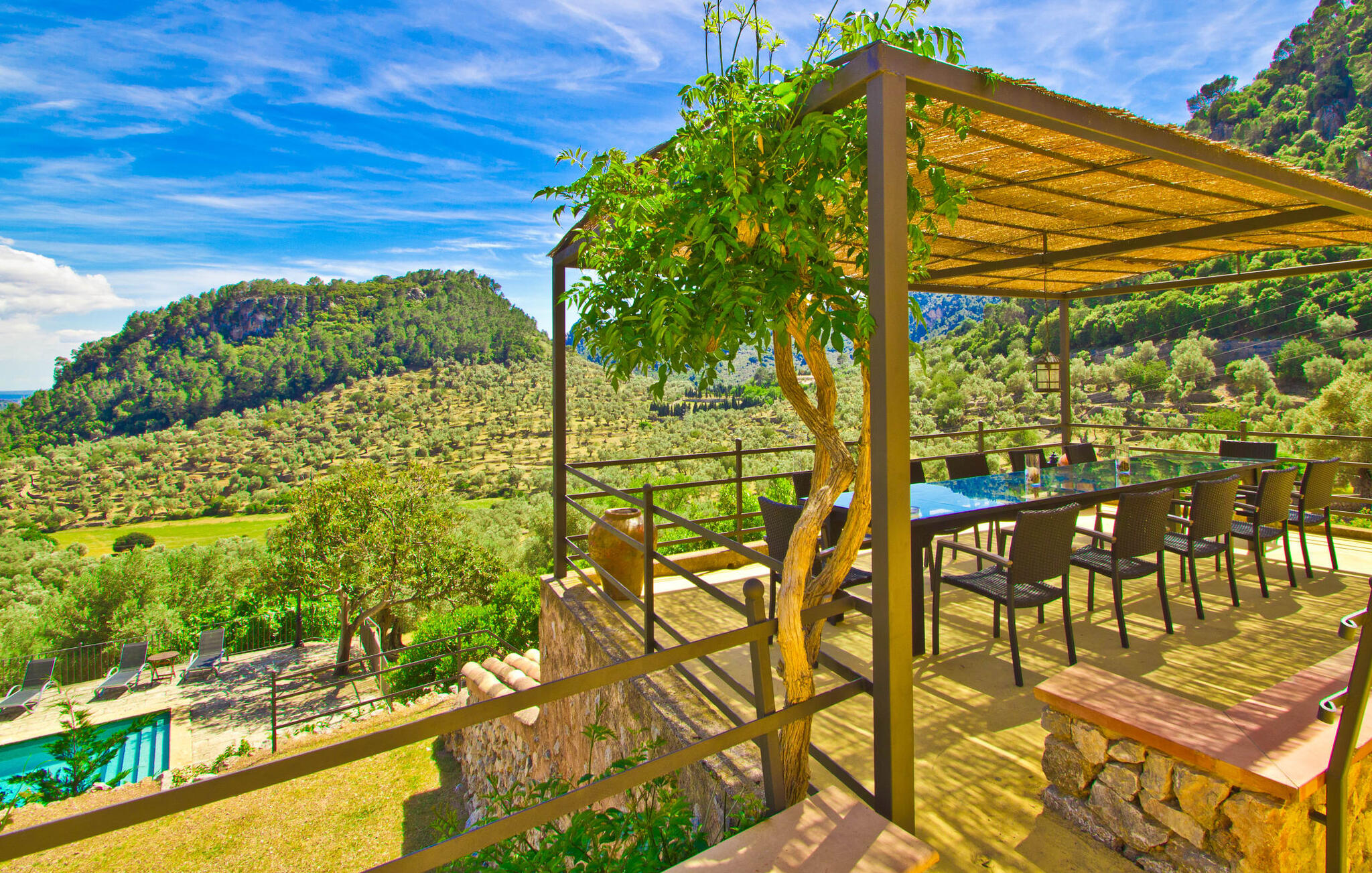 De rit naar de prachtig gelegen, rustieke Finca Biniforani Nou voert ons over de oude bergweg die de hoofdstad Palma verbindt met het mooie stadje Sóller. De kronkelige weg wordt vandaag de dag zelden bereden, maar voert je door het dramatisch mooie landschap van het Tramuntana-gebergte, dat is uitgeroepen tot UNESCO Werelderfgoed. De villa ligt midden in deze unieke natuurlijke omgeving op een enorm stuk grond, vlakbij een van de grootste steden van Mallorca, Sóller. Het is absoluut rustig, volledig afgelegen en omgeven door groene heuvels die een geweldig uitzicht bieden waarvan je kunt genieten vanaf talloze plekken op het terrein. Een ideale vakantiebestemming voor gasten die met een grote groep reizen, bijvoorbeeld om te wandelen, en die hun vakantie in volledige privacy willen doorbrengen in een comfortabele, ruime finca. Het buitengedeelte van de finca biedt net zoveel als het interieur van de rustieke finca. Naast de grote, overdekte eethoek, die lijkt op een panoramisch terras, is er een ingebouwde barbecue. Ook vanaf hier kun je genieten van het unieke uitzicht op de natuurlijke omgeving, dat gewoon niet te overtreffen is. Net onder het hierboven beschreven panoramische terras met eethoek vind je het zwembad en de omgeving. Er staan 16 comfortabele ligstoelen rond het zwembad, dat je kunt beschaduwen met gedeeltelijke luifels of een parasol. Als je zin hebt, kun je je tafeltennisvaardigheden aanscherpen en vrienden of familie uitnodigen voor een wedstrijdje.
