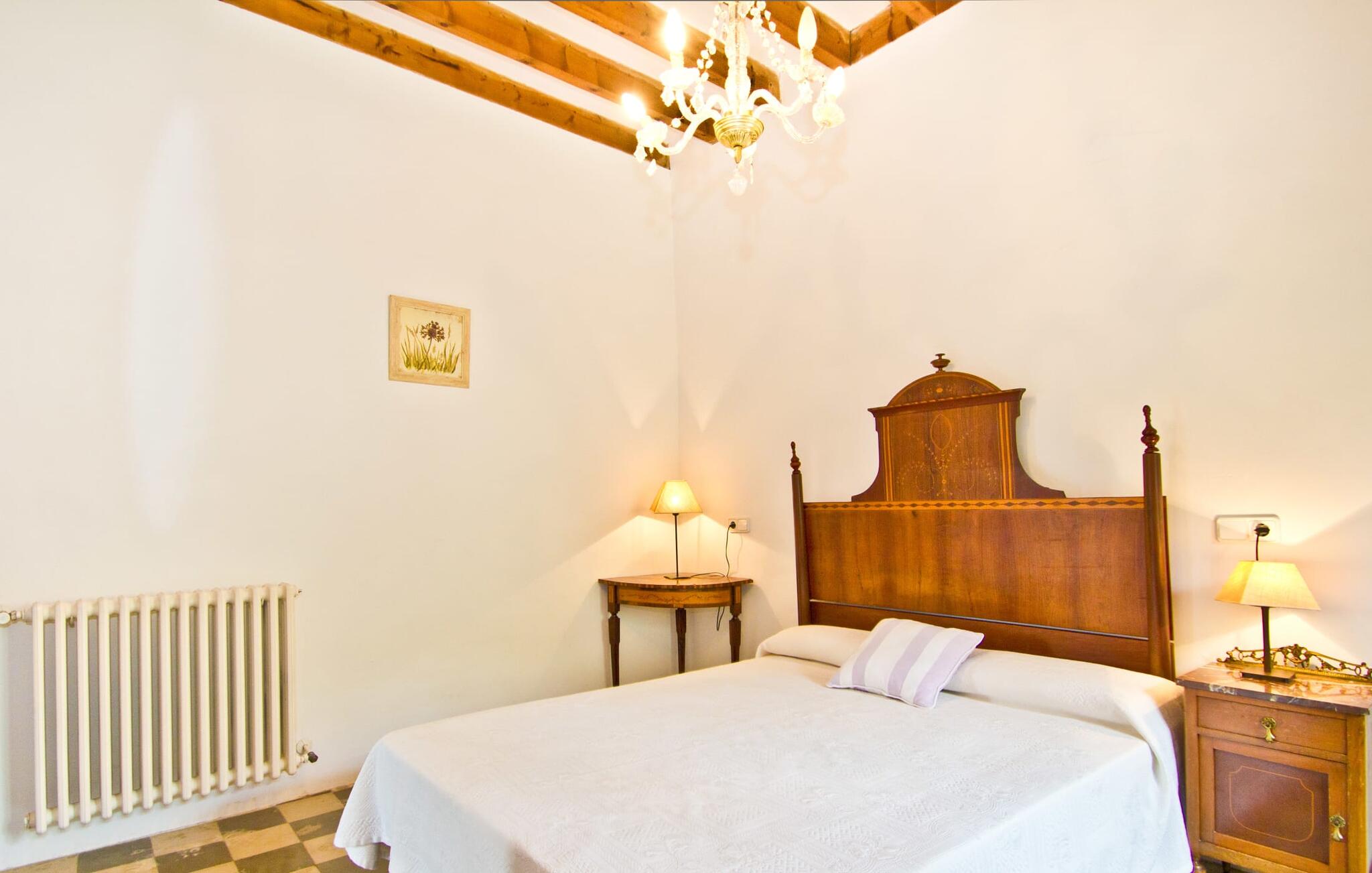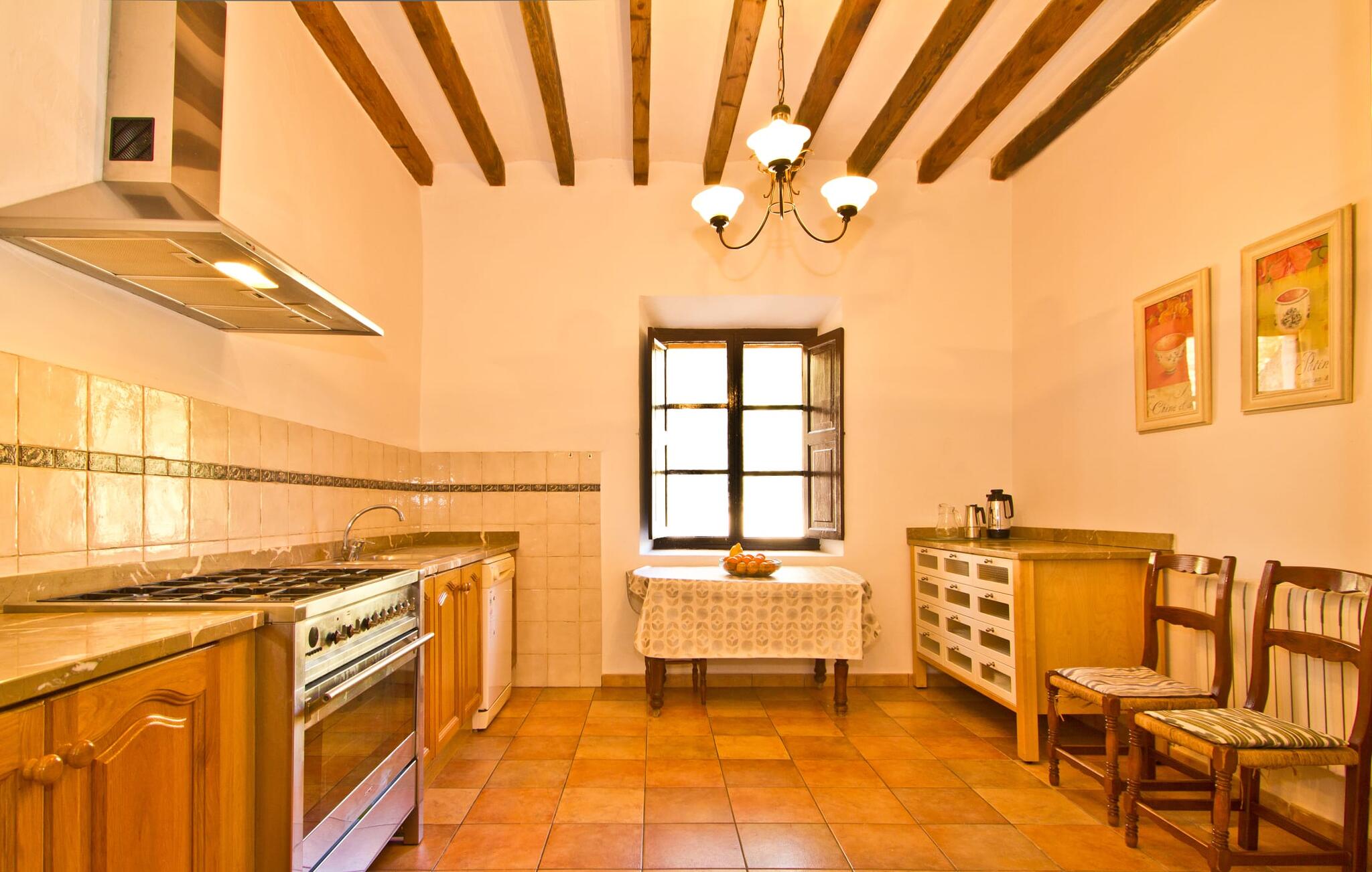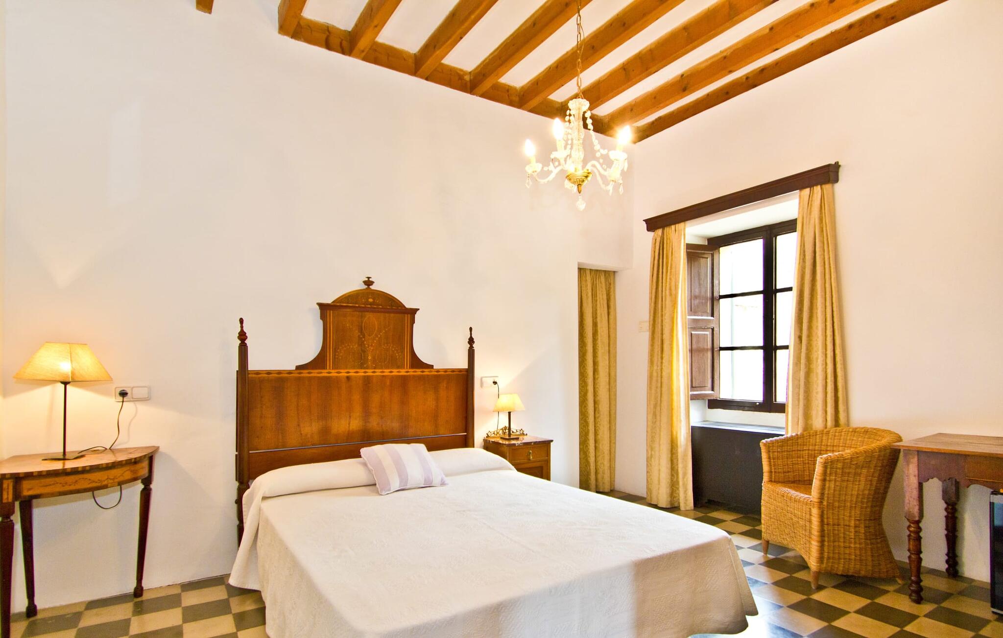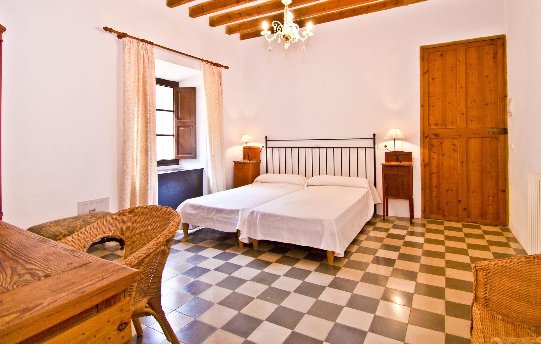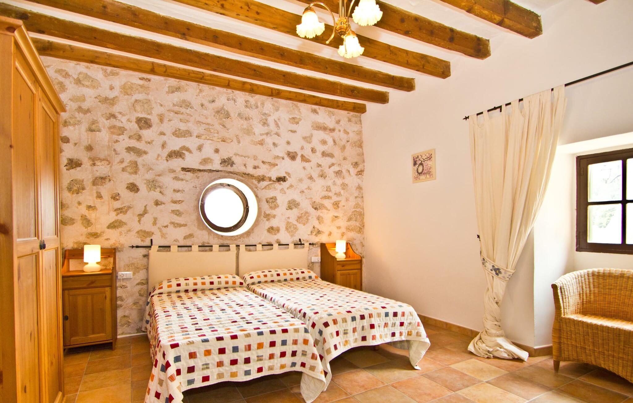 De uit breuksteen opgetrokken finca heeft een hoekige vorm. Een kleine ijzeren poort opent naar de binnenplaats, van waaruit de afzonderlijke delen van het gebouw toegankelijk zijn. Op het terras is een heerlijk beschutte, vrolijk gekleurde zithoek waar je met een grote groep mensen kunt genieten van de rust rondom de villa. Het huis zelf verwelkomt ons met grote, open kamers en leefruimtes. In de chique keuken staat een lange tafel met genoeg ruimte voor de hele groep. Aangezien de villa veel nadruk legt op het comfort van de gasten, is het niet verwonderlijk dat elk van de gezellige slaapkamers, waarvan sommige zijn ingericht met antieke bedsteden, een eigen badkamer heeft (met douche of bad). Omdat er veel ruimte is voor de gasten, kan elk stel hier toch van zijn privacy genieten. Huisdieren zijn natuurlijk ook welkom als gast.