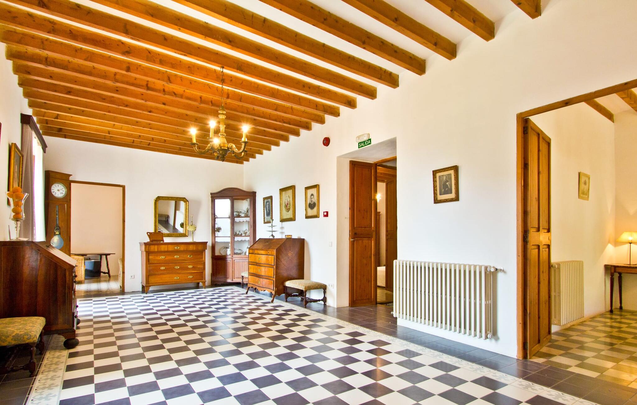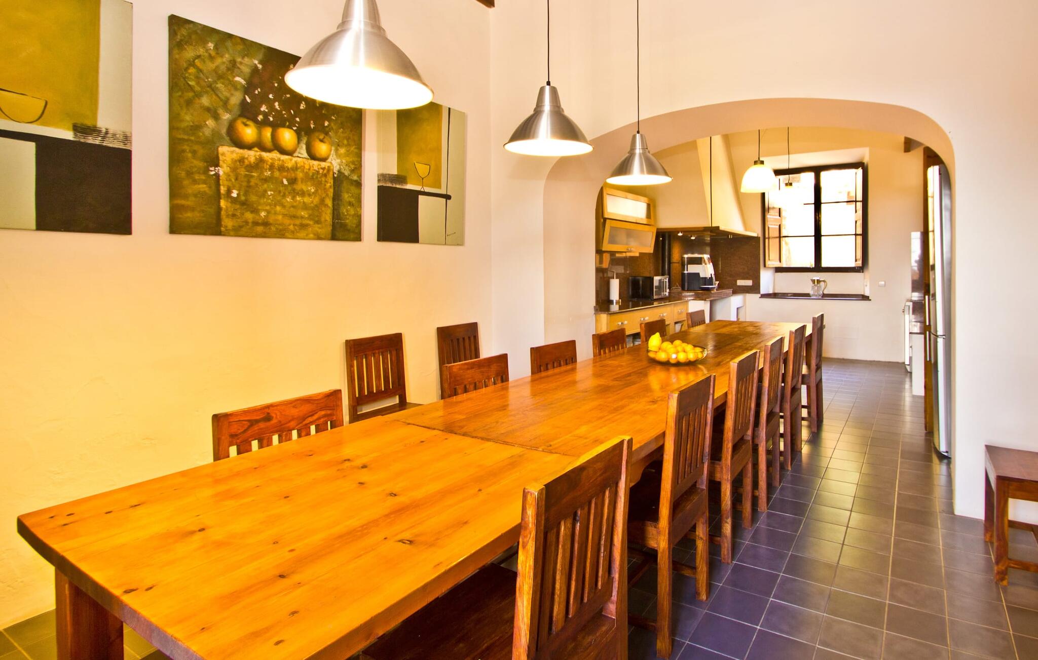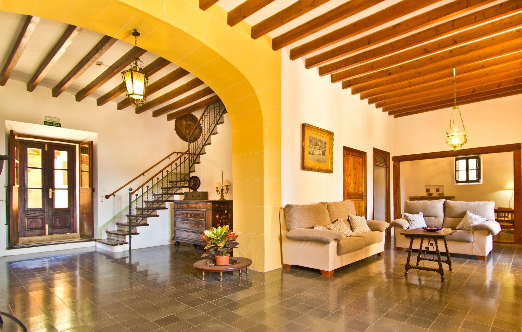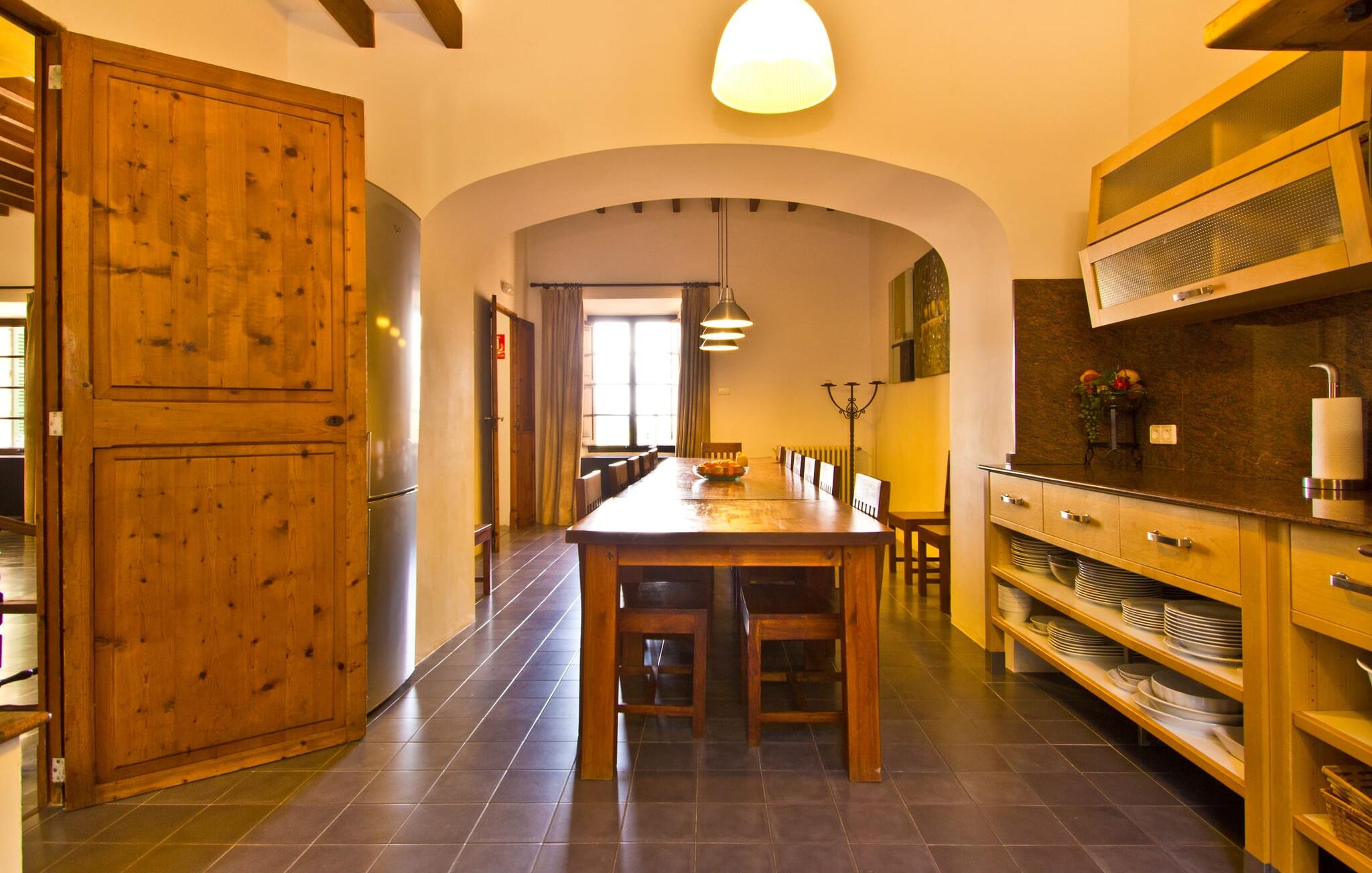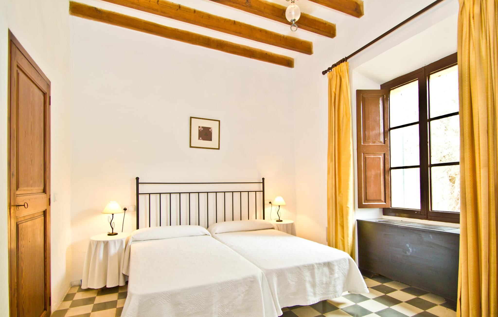 De uit breuksteen opgetrokken finca heeft een hoekige vorm. Een kleine ijzeren poort opent naar de binnenplaats, van waaruit de afzonderlijke delen van het gebouw toegankelijk zijn. Op het terras is een heerlijk beschutte, vrolijk gekleurde zithoek waar je met een grote groep mensen kunt genieten van de rust rondom de villa. Het huis zelf verwelkomt ons met grote, open kamers en leefruimtes. In de chique keuken staat een lange tafel met genoeg ruimte voor de hele groep. Aangezien de villa veel nadruk legt op het comfort van de gasten, is het niet verwonderlijk dat elk van de gezellige slaapkamers, waarvan sommige zijn ingericht met antieke bedsteden, een eigen badkamer heeft (met douche of bad). Omdat er veel ruimte is voor de gasten, kan elk stel hier toch van zijn privacy genieten. Huisdieren zijn natuurlijk ook welkom als gast.