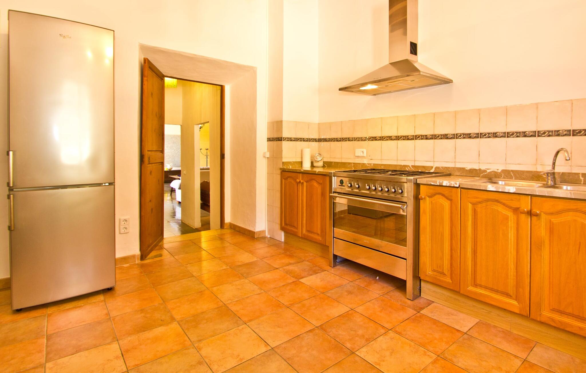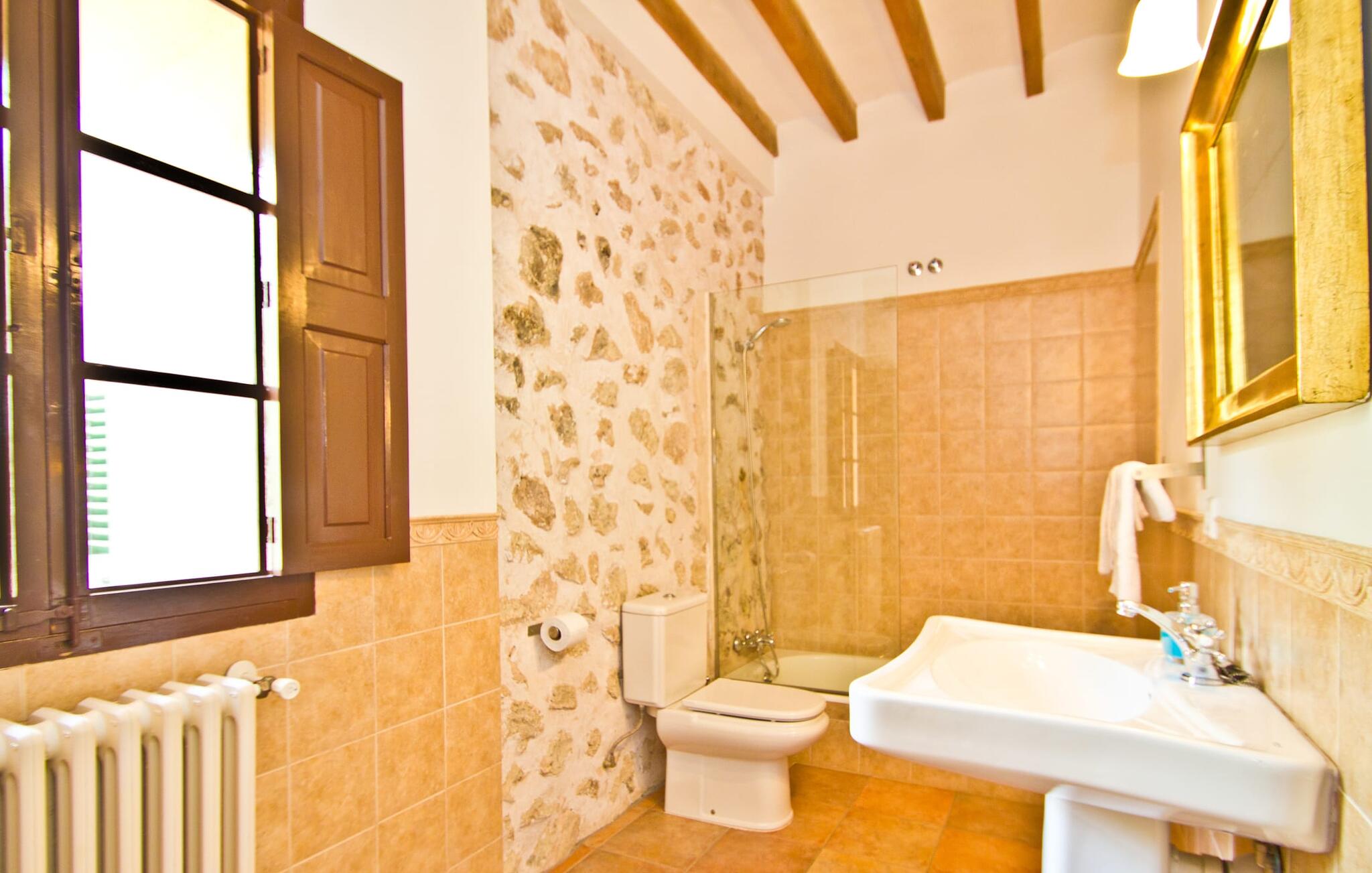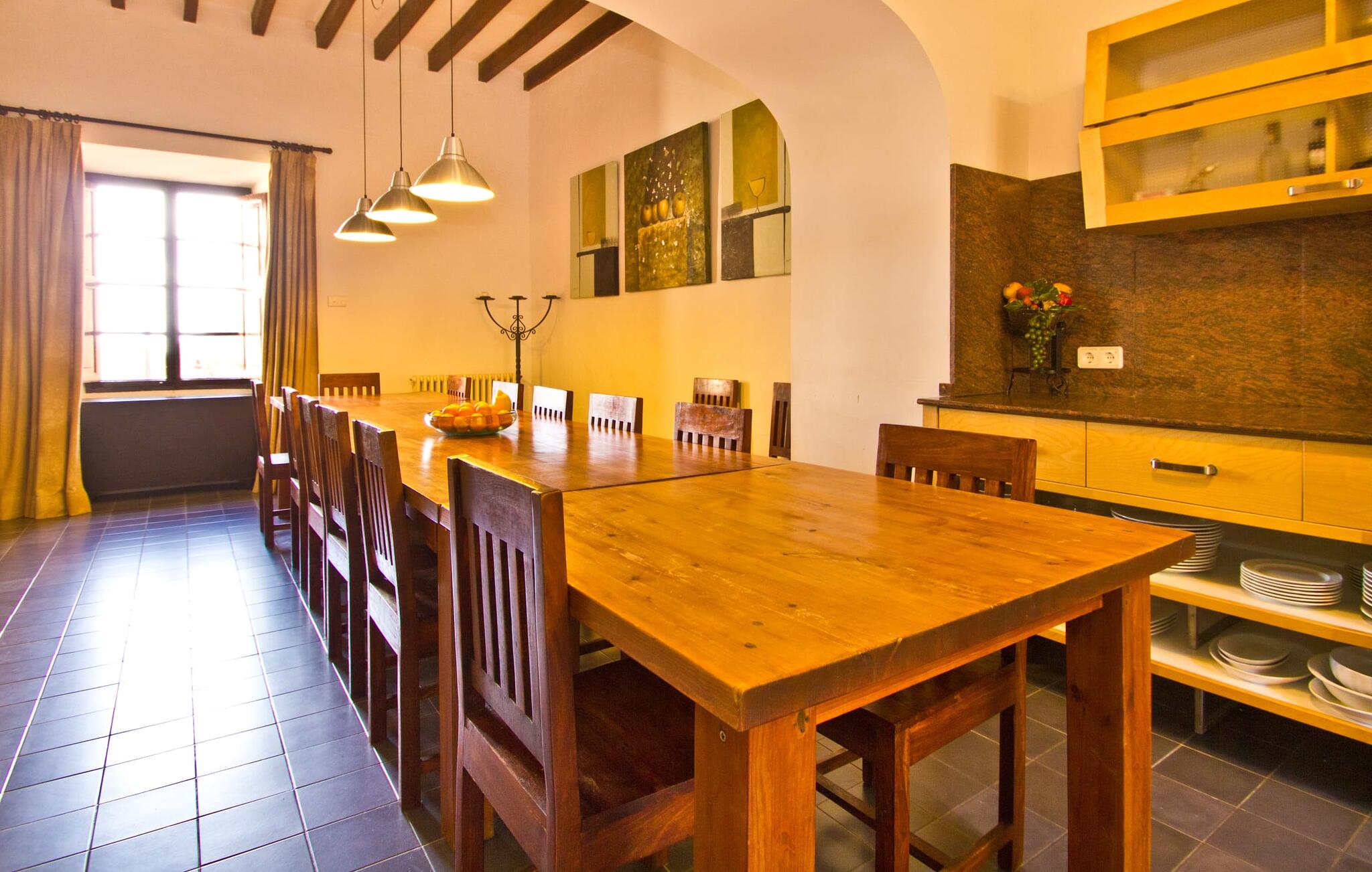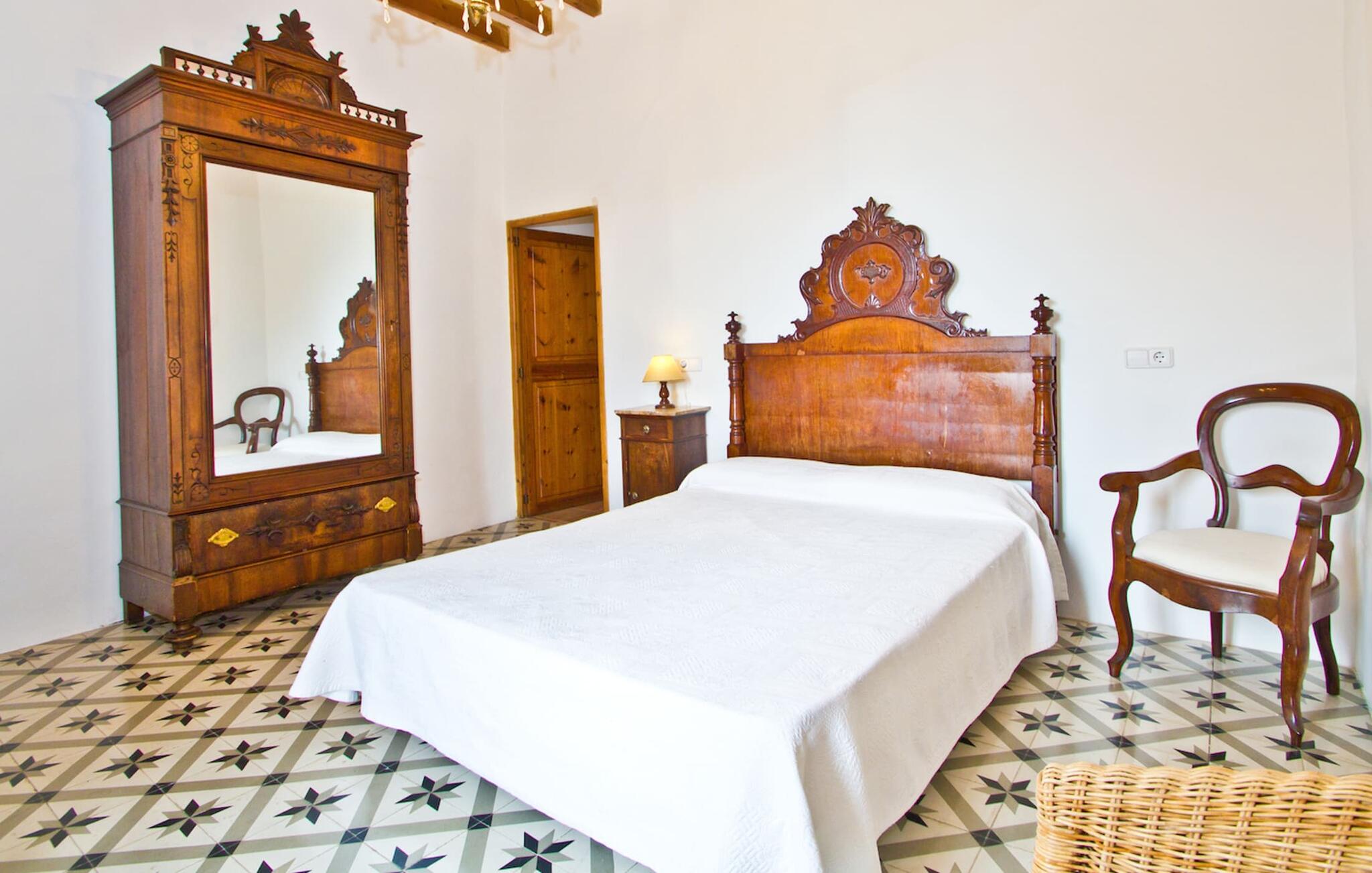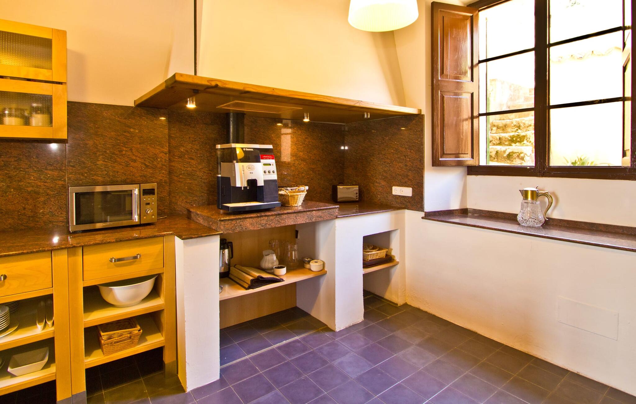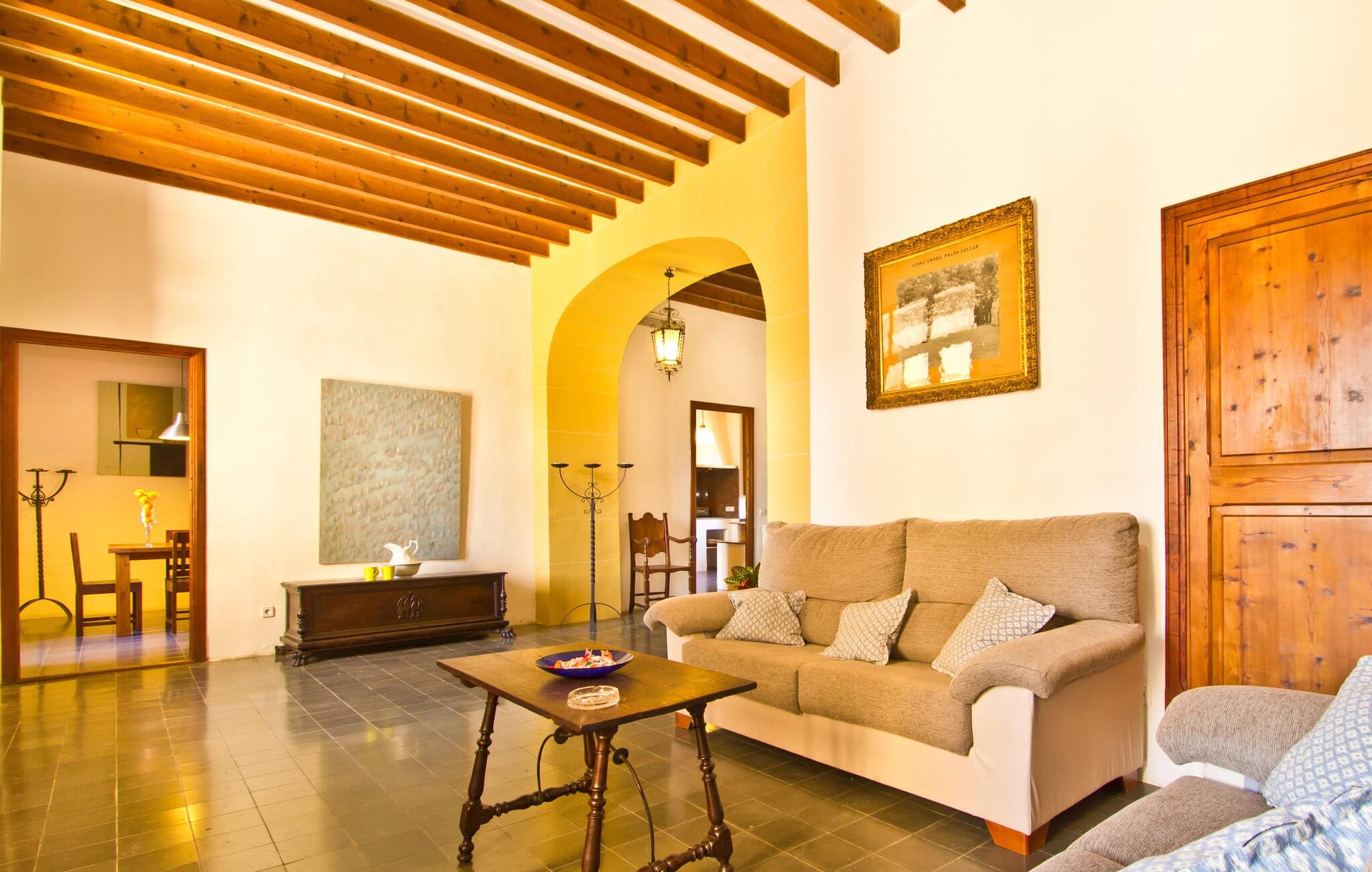 De uit breuksteen opgetrokken finca heeft een hoekige vorm. Een kleine ijzeren poort opent naar de binnenplaats, van waaruit de afzonderlijke delen van het gebouw toegankelijk zijn. Op het terras is een heerlijk beschutte, vrolijk gekleurde zithoek waar je met een grote groep mensen kunt genieten van de rust rondom de villa. Het huis zelf verwelkomt ons met grote, open kamers en leefruimtes. In de chique keuken staat een lange tafel met genoeg ruimte voor de hele groep. Aangezien de villa veel nadruk legt op het comfort van de gasten, is het niet verwonderlijk dat elk van de gezellige slaapkamers, waarvan sommige zijn ingericht met antieke bedsteden, een eigen badkamer heeft (met douche of bad). Omdat er veel ruimte is voor de gasten, kan elk stel hier toch van zijn privacy genieten. Huisdieren zijn natuurlijk ook welkom als gast.