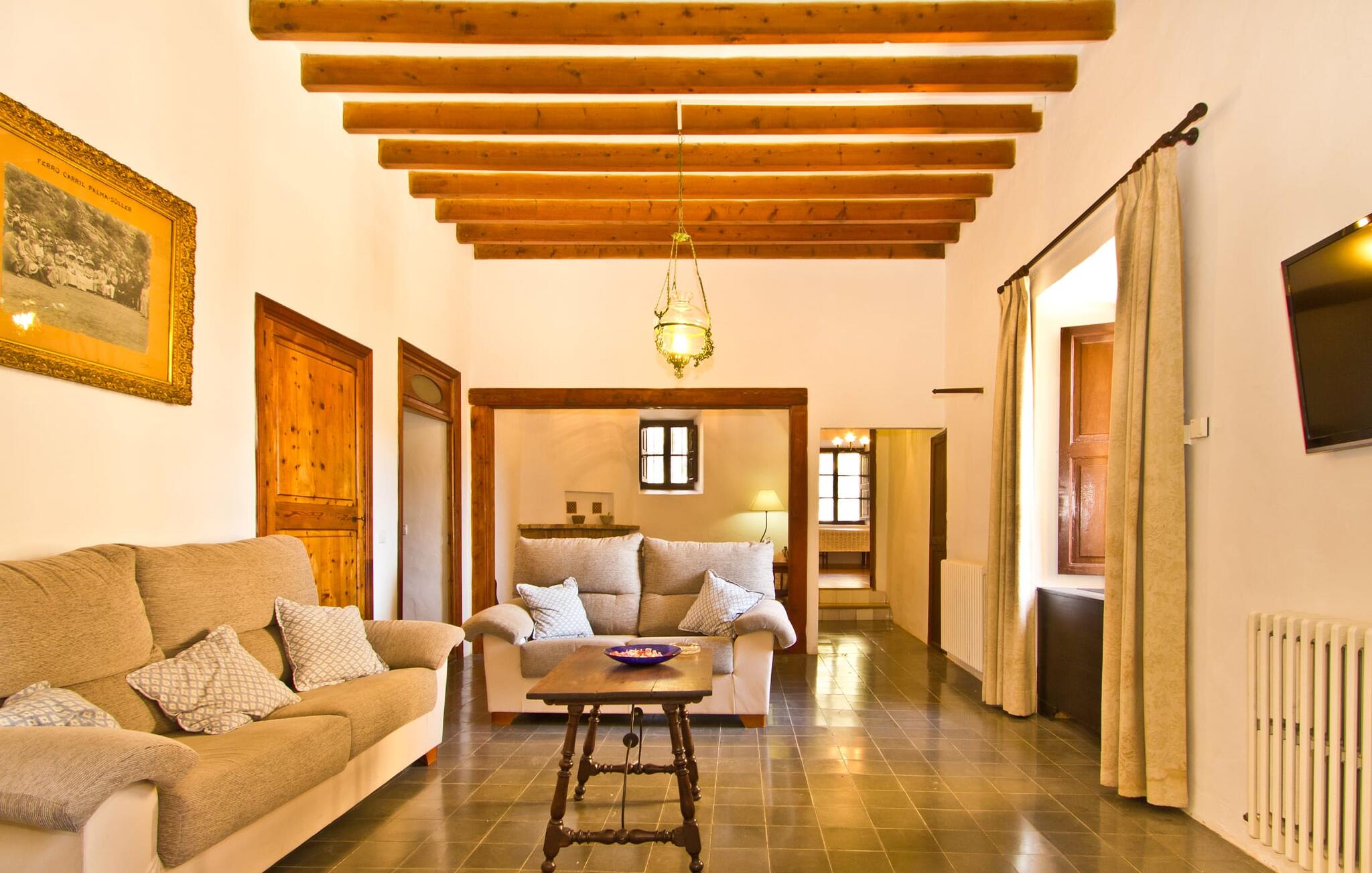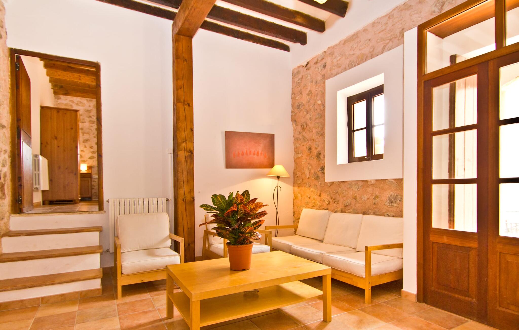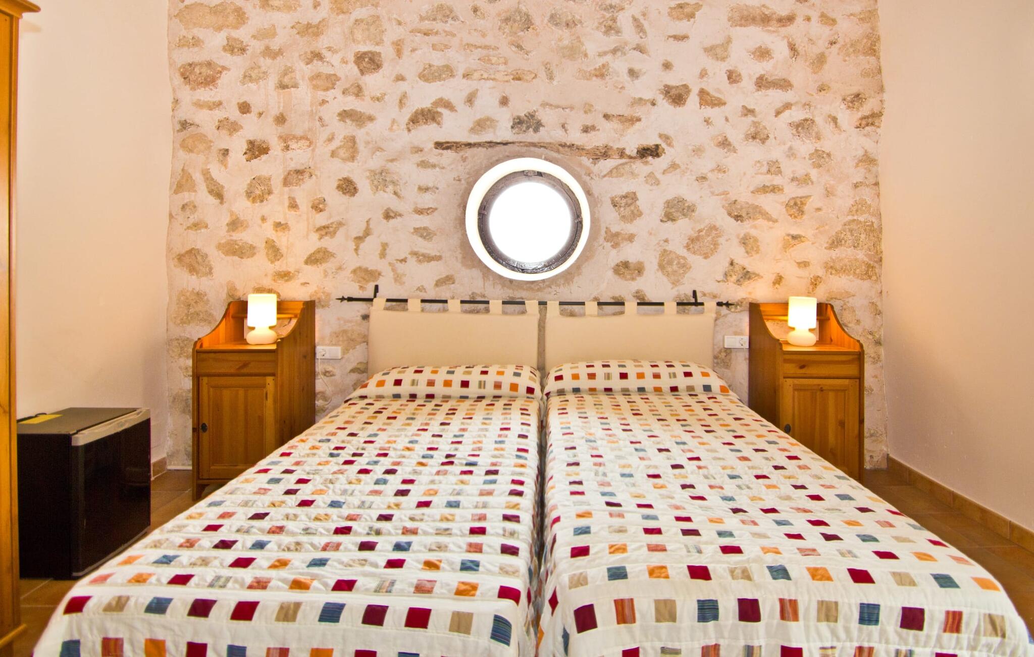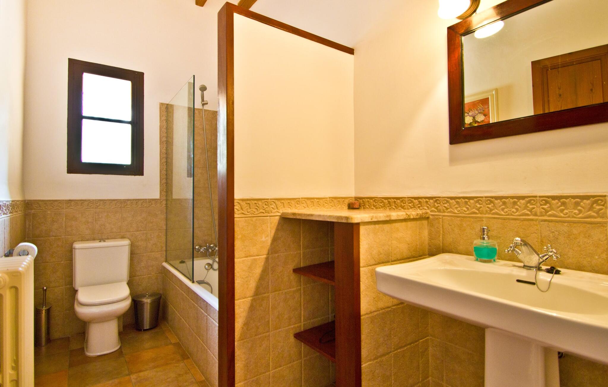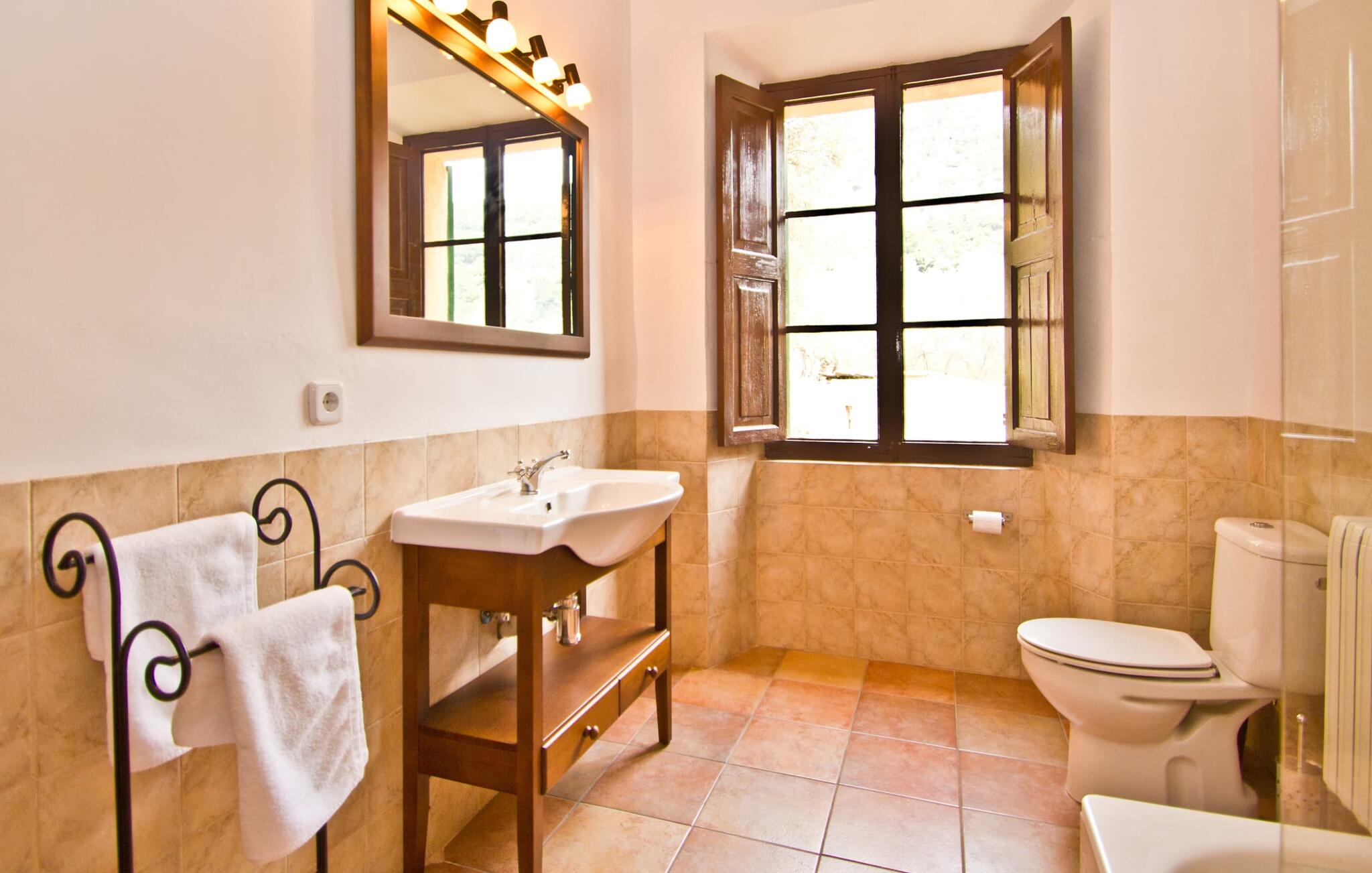 De uit breuksteen opgetrokken finca heeft een hoekige vorm. Een kleine ijzeren poort opent naar de binnenplaats, van waaruit de afzonderlijke delen van het gebouw toegankelijk zijn. Op het terras is een heerlijk beschutte, vrolijk gekleurde zithoek waar je met een grote groep mensen kunt genieten van de rust rondom de villa. Het huis zelf verwelkomt ons met grote, open kamers en leefruimtes. In de chique keuken staat een lange tafel met genoeg ruimte voor de hele groep. Aangezien de villa veel nadruk legt op het comfort van de gasten, is het niet verwonderlijk dat elk van de gezellige slaapkamers, waarvan sommige zijn ingericht met antieke bedsteden, een eigen badkamer heeft (met douche of bad). Omdat er veel ruimte is voor de gasten, kan elk stel hier toch van zijn privacy genieten. Huisdieren zijn natuurlijk ook welkom als gast.