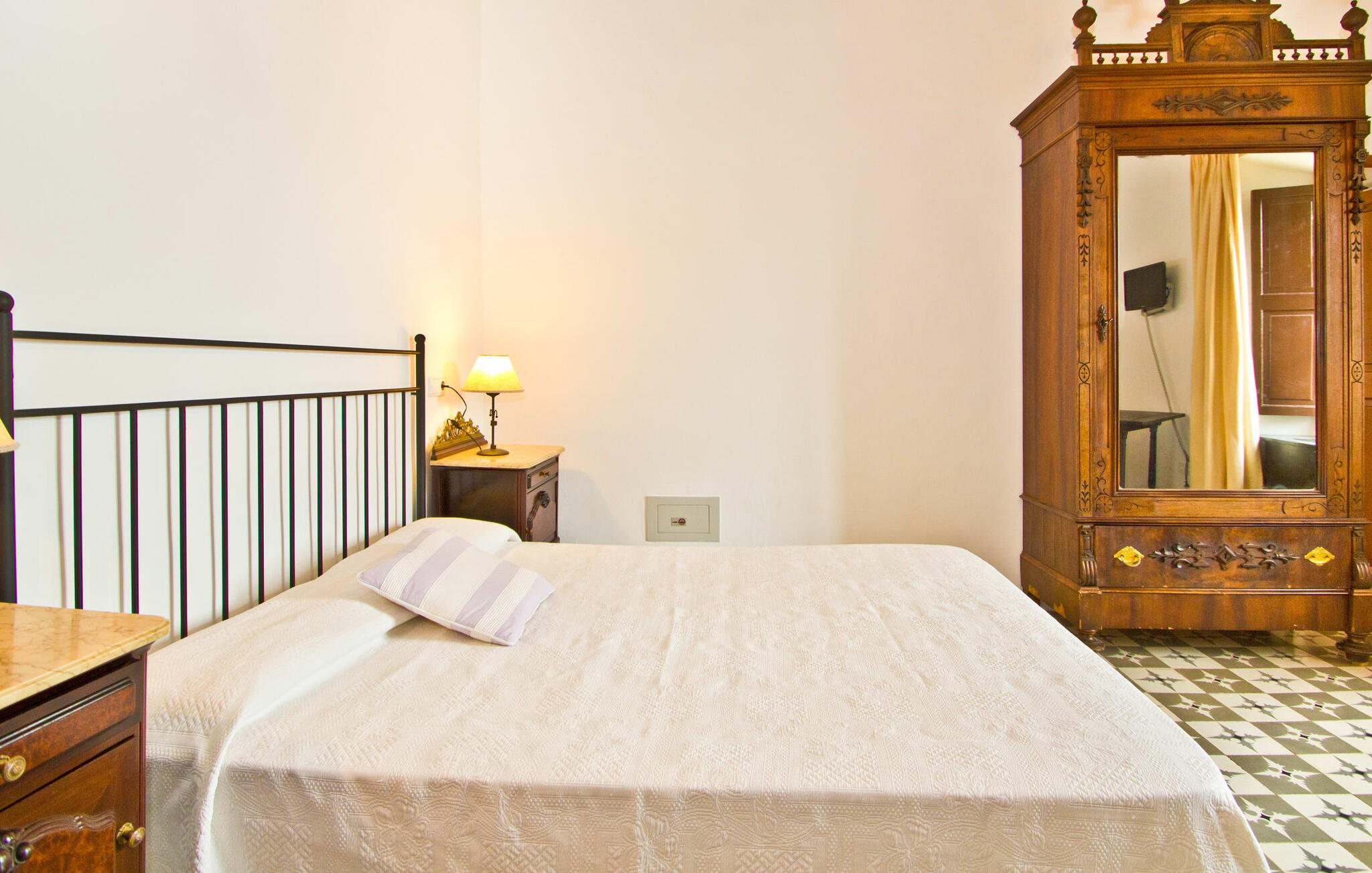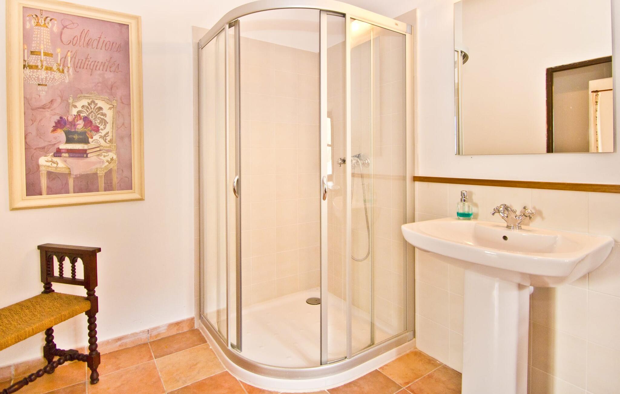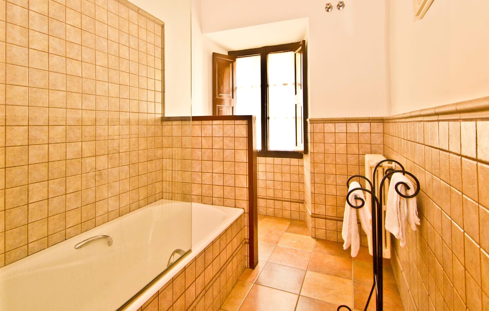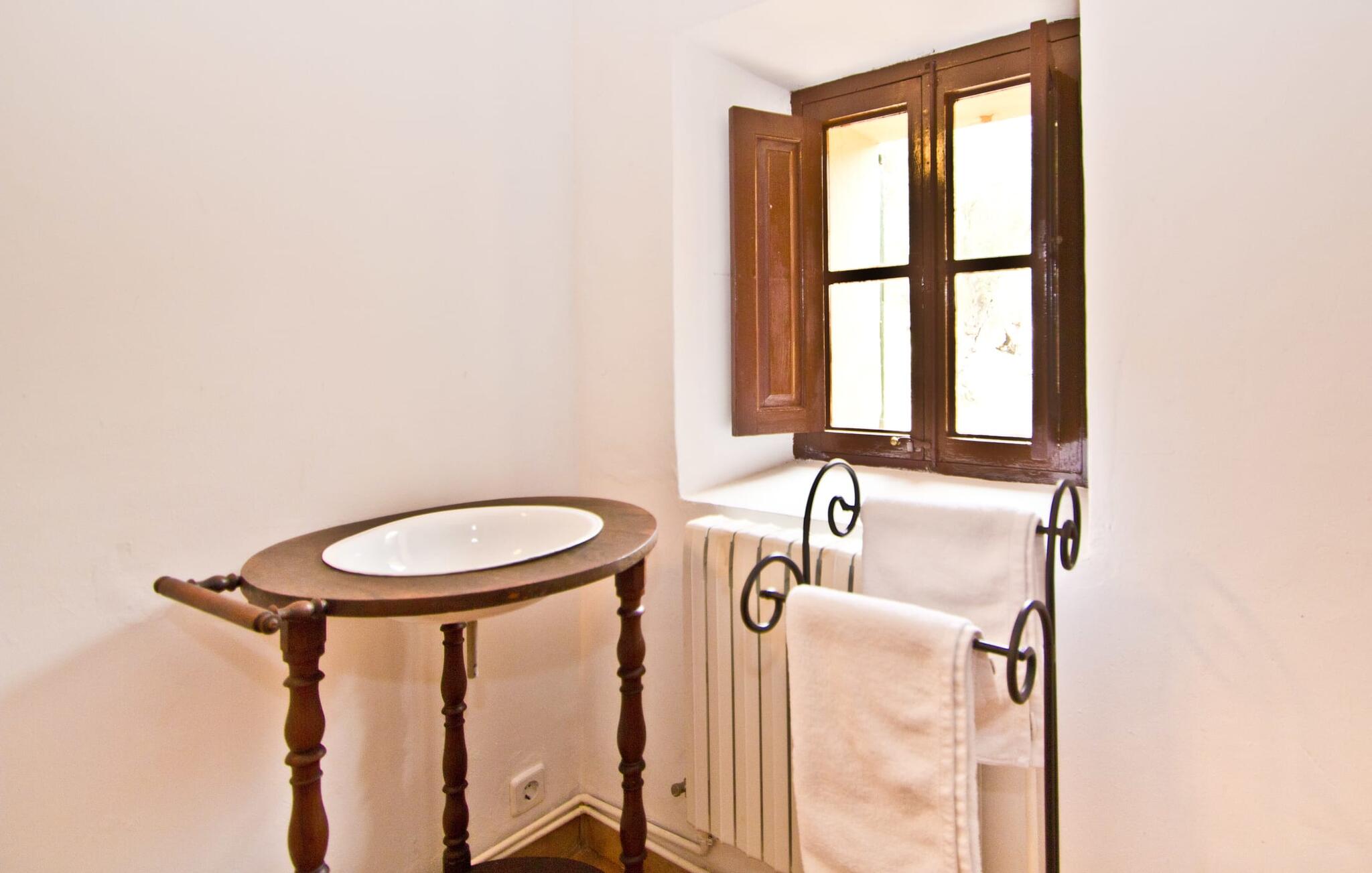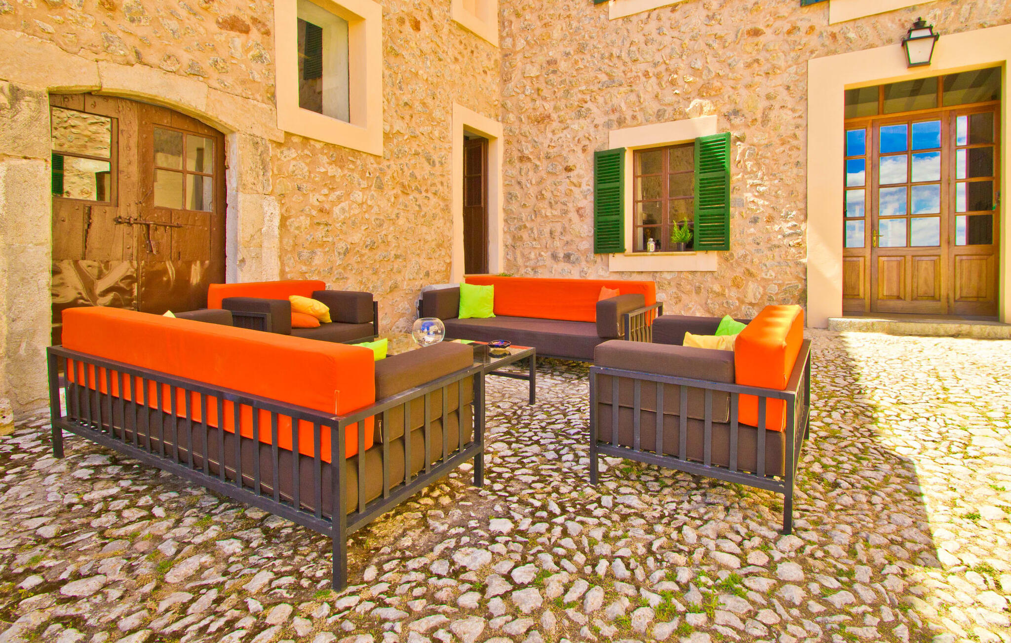 De uit breuksteen opgetrokken finca heeft een hoekige vorm. Een kleine ijzeren poort opent naar de binnenplaats, van waaruit de afzonderlijke delen van het gebouw toegankelijk zijn. Op het terras is een heerlijk beschutte, vrolijk gekleurde zithoek waar je met een grote groep mensen kunt genieten van de rust rondom de villa. Het huis zelf verwelkomt ons met grote, open kamers en leefruimtes. In de chique keuken staat een lange tafel met genoeg ruimte voor de hele groep. Aangezien de villa veel nadruk legt op het comfort van de gasten, is het niet verwonderlijk dat elk van de gezellige slaapkamers, waarvan sommige zijn ingericht met antieke bedsteden, een eigen badkamer heeft (met douche of bad). Omdat er veel ruimte is voor de gasten, kan elk stel hier toch van zijn privacy genieten. Huisdieren zijn natuurlijk ook welkom als gast.