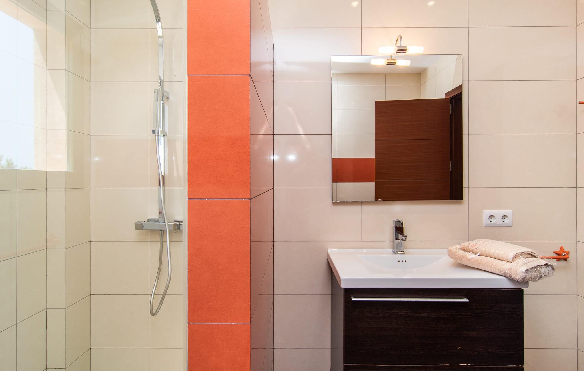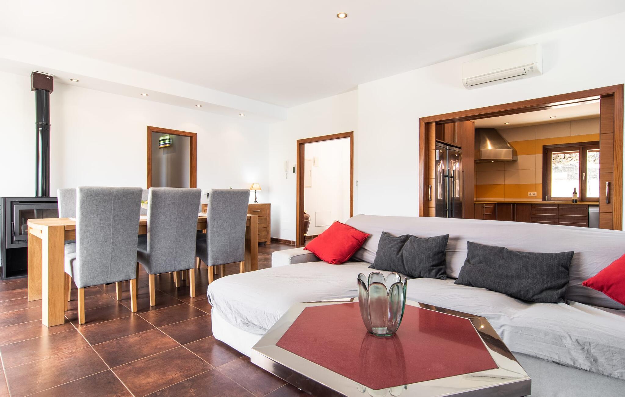 Zodra je binnenkomt, presenteert de villa op de begane grond zijn esthetische interieur en de elegante flair die daarbij hoort. In de gecombineerde, zeer vrolijk ingerichte woon- en eetkamer vormen bruintinten een zeer geslaagd contrast met de felgekleurde plafonds en muren. Grote ramen laten veel licht binnen. Hier kun je tijd doorbrengen met lezen, spelletjes spelen of tv kijken en altijd in het centrum van de actie blijven. Als je verbonden wilt blijven met de buitenwereld via het internet, kun je gebruik maken van de snelle WLAN-internetverbinding. Het eetgedeelte is geïntegreerd in de woonkamer en biedt genoeg ruimte voor alle reizigers. Vanaf de grote houten tafel kun je genieten van een uitzicht op de bergen via de open toegang tot het terras. In de ruime keuken zorgt moderne apparatuur van hoge kwaliteit ervoor dat koken een plezier is, zelfs op vakantie. De volledig uitgeruste keuken bevat een waterkoker en een filterkoffiezetapparaat. Zeer verschillende slaapkamers, allemaal liefdevol ingericht, bieden een ideale basis voor een goede nachtrust. Er zijn vier bedden van 0,90 x 2,00 meter en een van 1,80 x 2,00 meter. De met licht overgoten badkamers maken indruk met hun ultramoderne en smaakvolle design en hebben een bad of douche. Een strijkijzer en haardroger zijn beschikbaar in het huis, dus je hoeft ze niet mee te nemen.