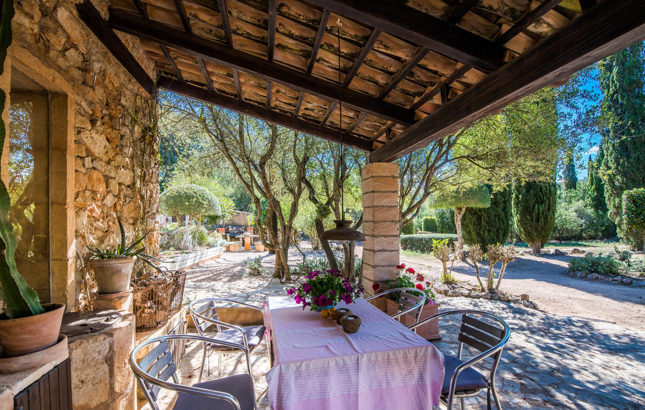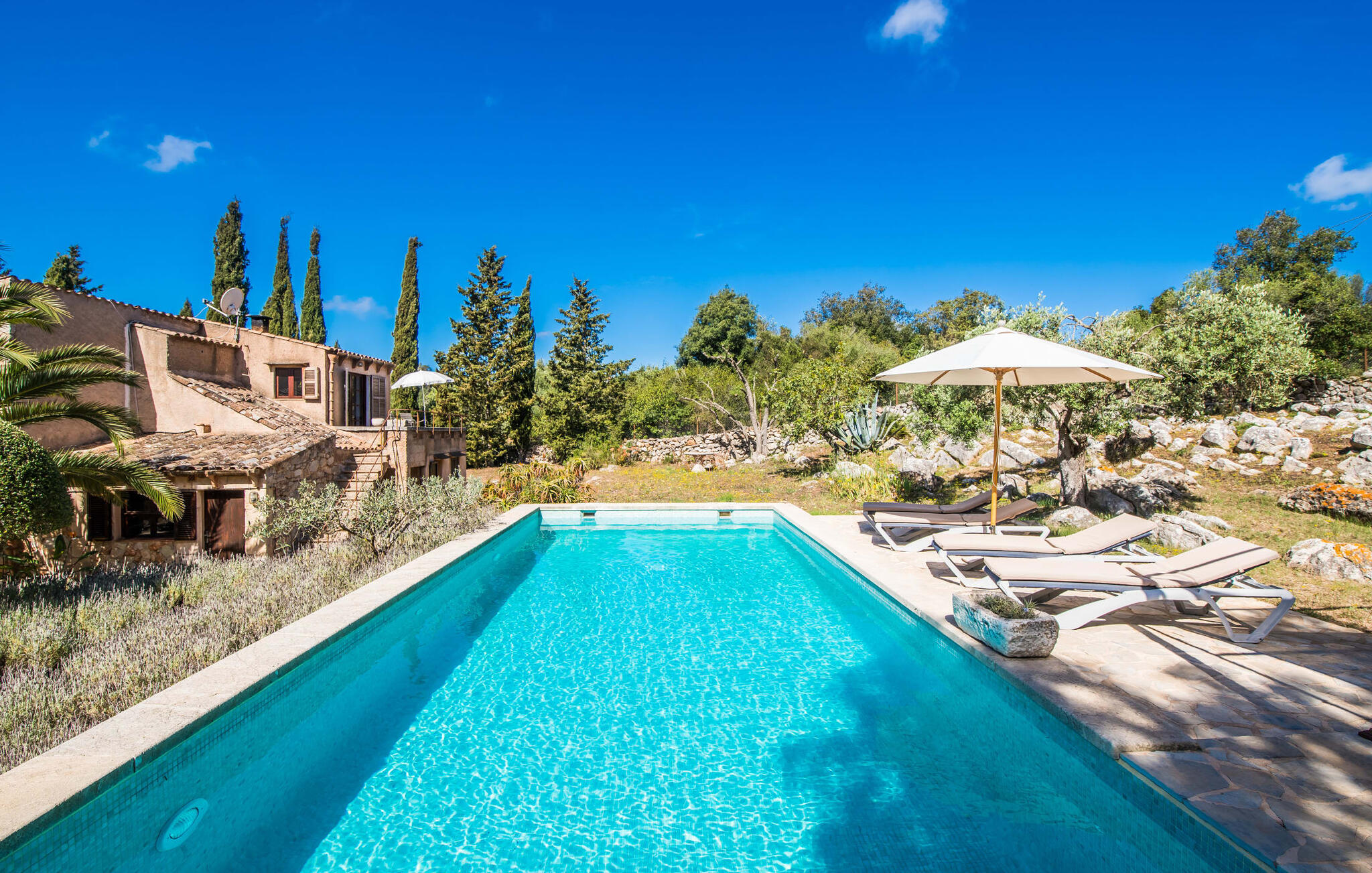 Bona Feina, wat goed gedaan betekent in het Catalaans, beschrijft treffend deze betoverende villa in het oosten van Mallorca. Dit charmante natuurstenen huis heeft een unieke indeling en wordt omringd door een prachtig aangelegde tuin met oude olijfbomen en hoge cipressen.