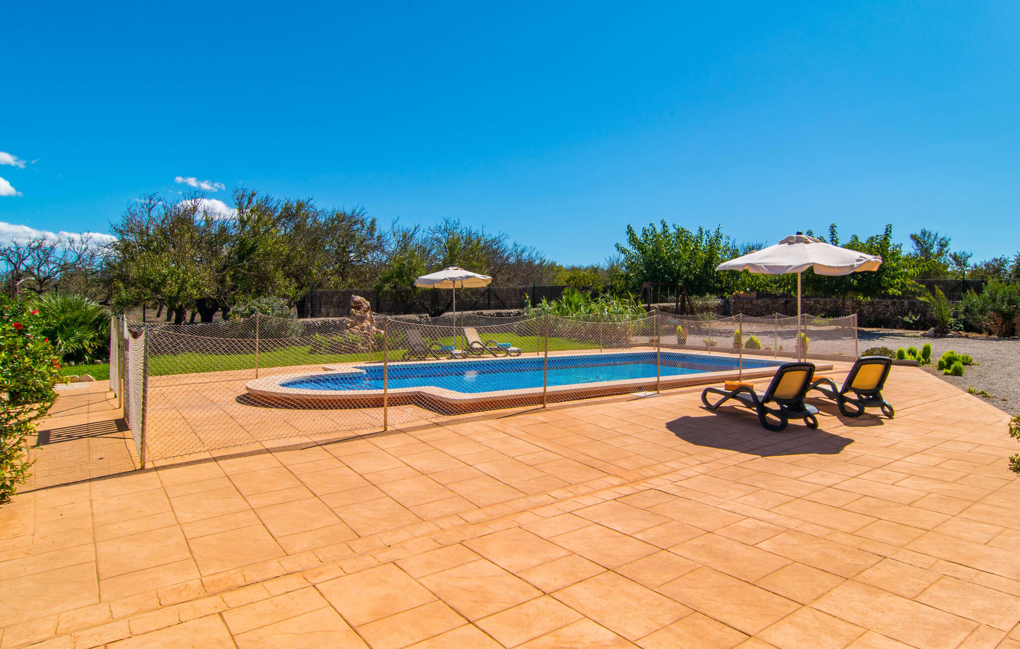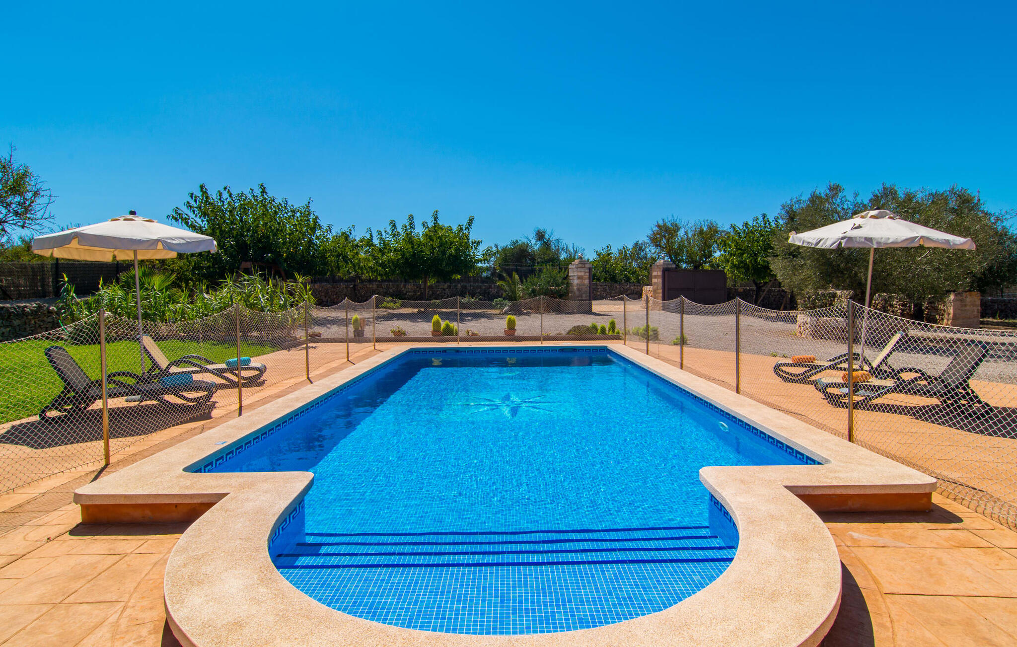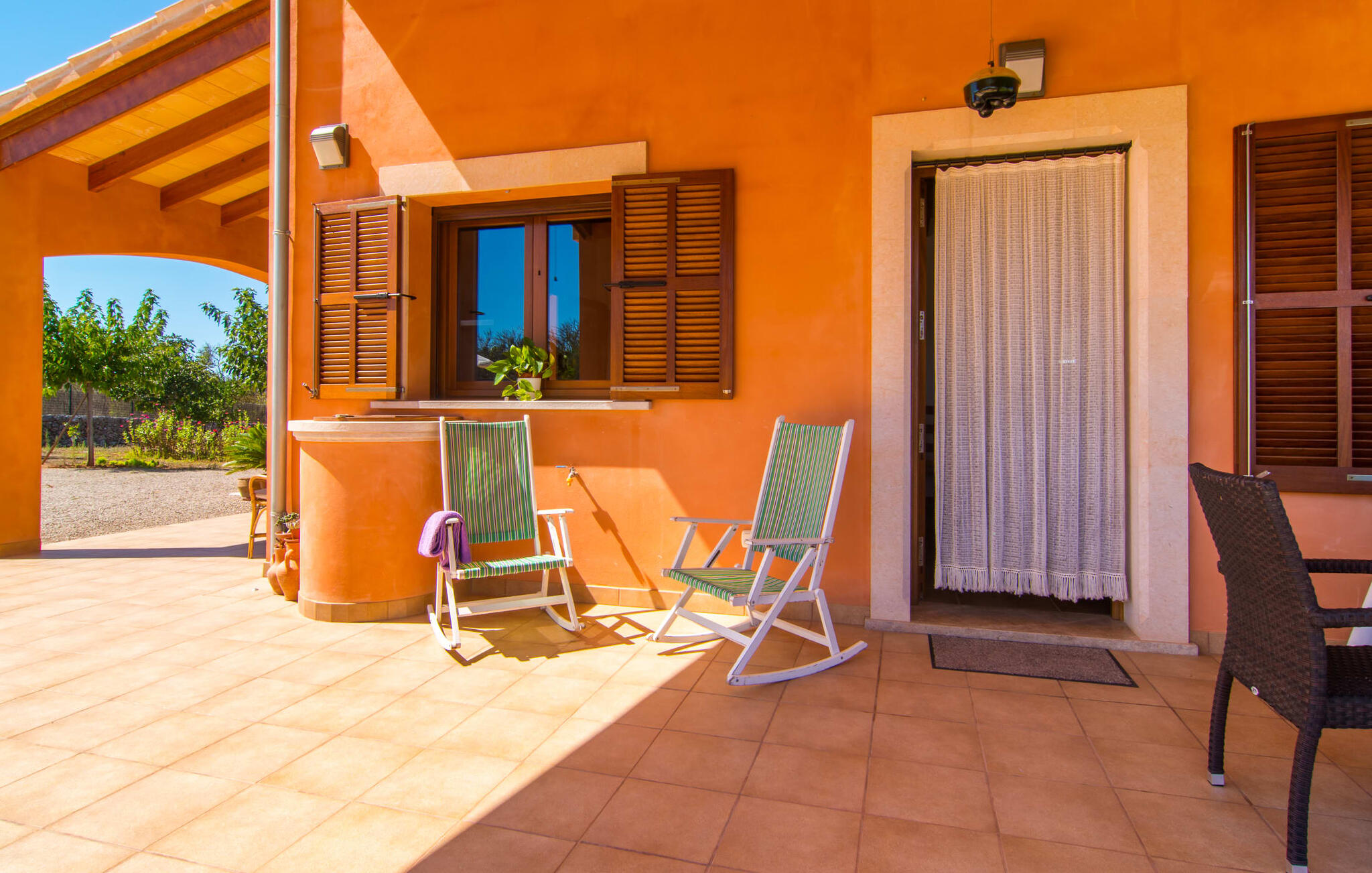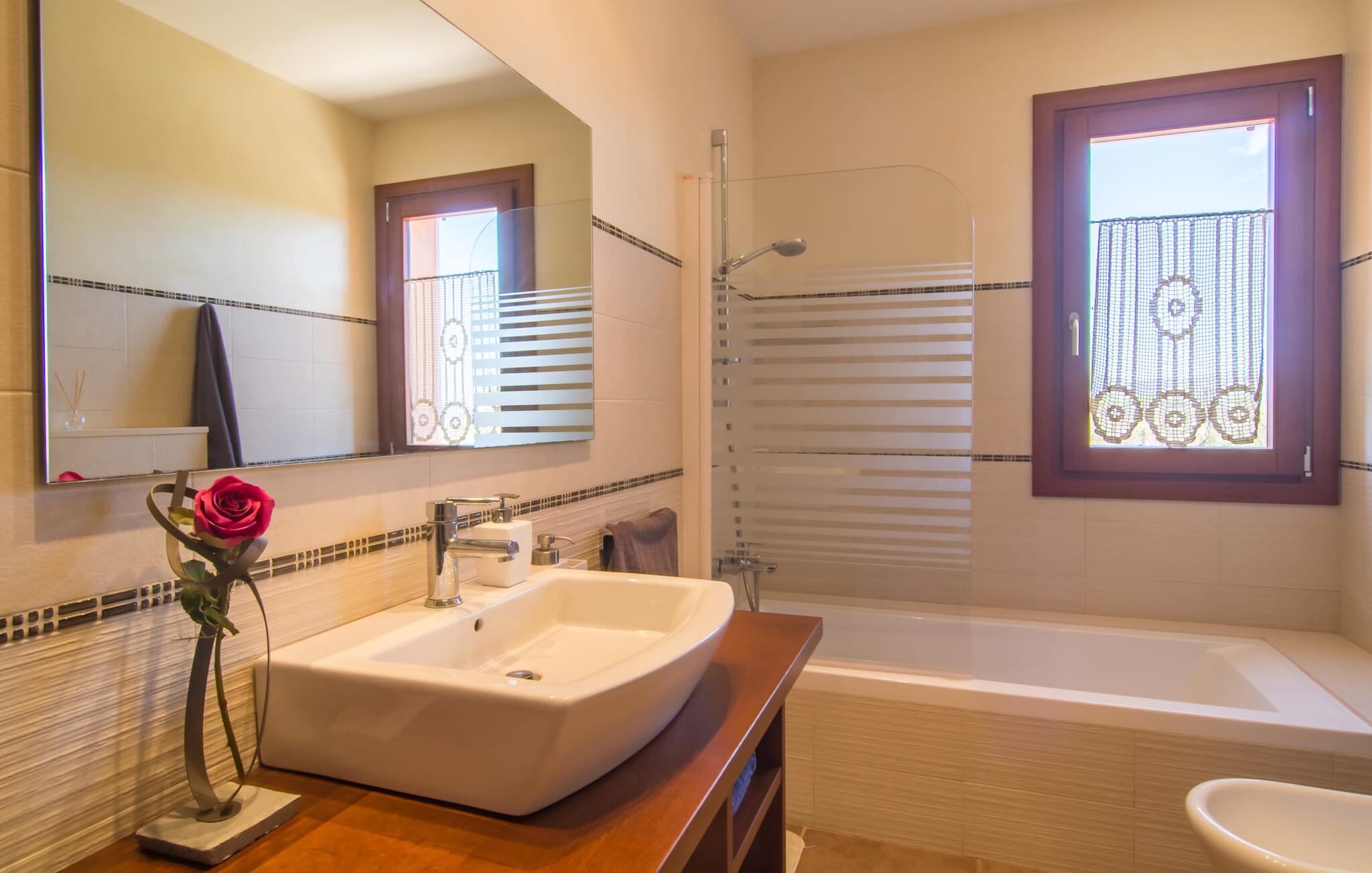 Vanaf het dakterras uitkijken over het groene landschap in het noorden van Mallorca en simpelweg genieten van het adembenemende uitzicht is hoe je je kostbare vakantietijd in de charmante Villa Ca Na Poveta zou kunnen doorbrengen. Het is volledig afgelegen en biedt absolute privacy, aangezien de dichtstbijzijnde buur zich op 160 m afstand bevindt. Het ruime en kindvriendelijke terrein nodigt de kleintjes uit om zich uit te leven. Er is niet alleen een mooie, goed onderhouden tuin met een speeltuin, maar ook een schommel en een kinderglijbaan. Wie daarna verkoeling wil zoeken, kan een paar baantjes trekken in het aparte zwembad met trapsgewijze bodem. Er zijn ook enkele comfortabele ligstoelen en parasols beschikbaar om daarna in de schaduw te zonnebaden. Mochten de temperaturen in het zuiden iets te warm worden, dan biedt het overdekte terras aan de voorkant van de villa een schuilplaats tegen de hitte. Het heeft ook een kleine, stijlvolle buitenkeuken met een vaste barbecue, ideaal voor een gezamenlijk feest om de avond af te ronden. Bovendien kun je in de zandsteenkleurige villa je huurauto voor de deur of in de garage parkeren, die direct toegang biedt tot het ruime en goed uitgeruste interieur van de woning.