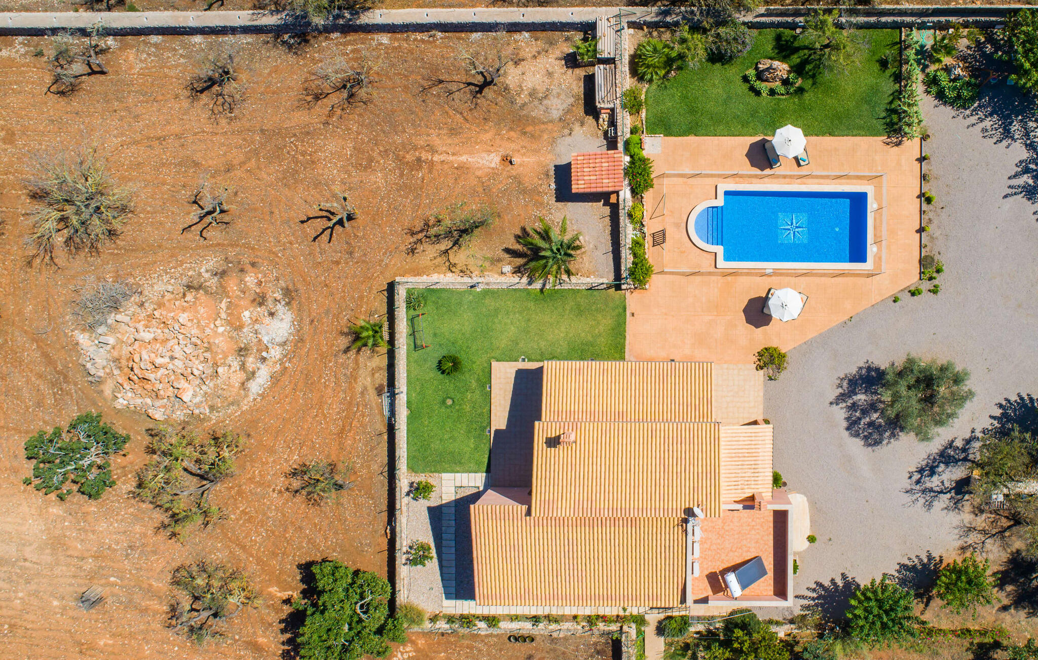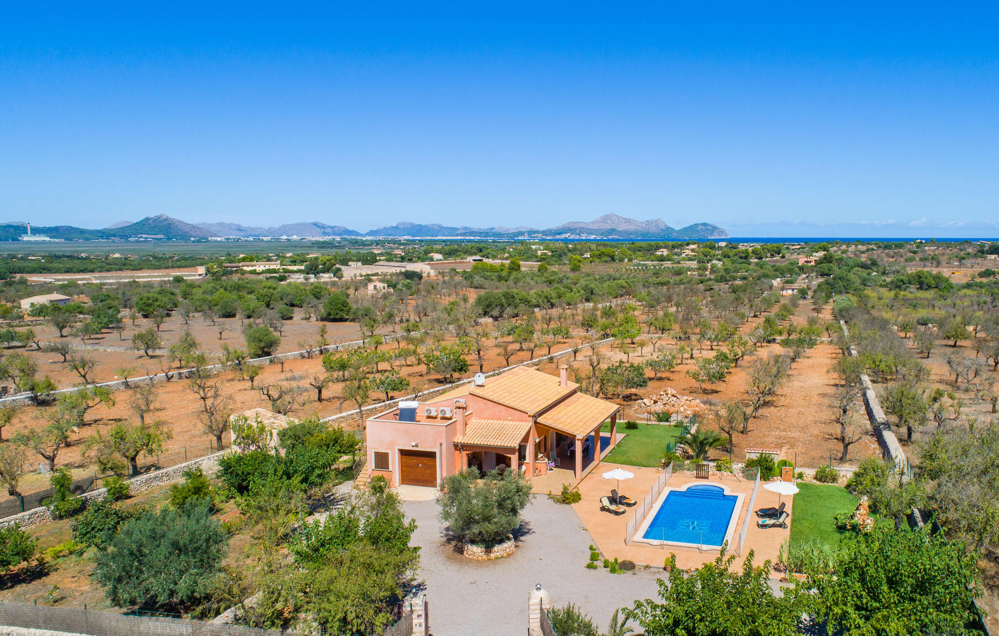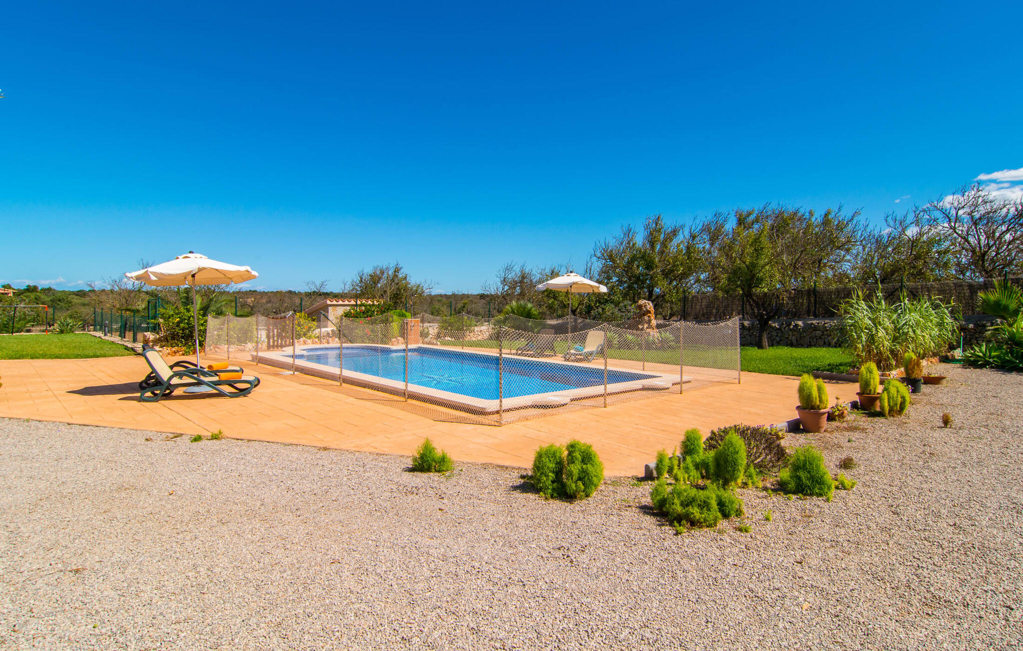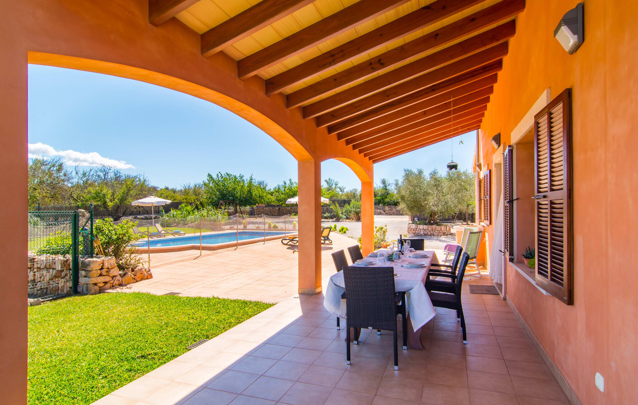Vanaf het dakterras uitkijken over het groene landschap in het noorden van Mallorca en simpelweg genieten van het adembenemende uitzicht is hoe je je kostbare vakantietijd in de charmante Villa Ca Na Poveta zou kunnen doorbrengen. Het is volledig afgelegen en biedt absolute privacy, aangezien de dichtstbijzijnde buur zich op 160 m afstand bevindt. Het ruime en kindvriendelijke terrein nodigt de kleintjes uit om zich uit te leven. Er is niet alleen een mooie, goed onderhouden tuin met een speeltuin, maar ook een schommel en een kinderglijbaan. Wie daarna verkoeling wil zoeken, kan een paar baantjes trekken in het aparte zwembad met trapsgewijze bodem. Er zijn ook enkele comfortabele ligstoelen en parasols beschikbaar om daarna in de schaduw te zonnebaden. Mochten de temperaturen in het zuiden iets te warm worden, dan biedt het overdekte terras aan de voorkant van de villa een schuilplaats tegen de hitte. Het heeft ook een kleine, stijlvolle buitenkeuken met een vaste barbecue, ideaal voor een gezamenlijk feest om de avond af te ronden. Bovendien kun je in de zandsteenkleurige villa je huurauto voor de deur of in de garage parkeren, die direct toegang biedt tot het ruime en goed uitgeruste interieur van de woning.