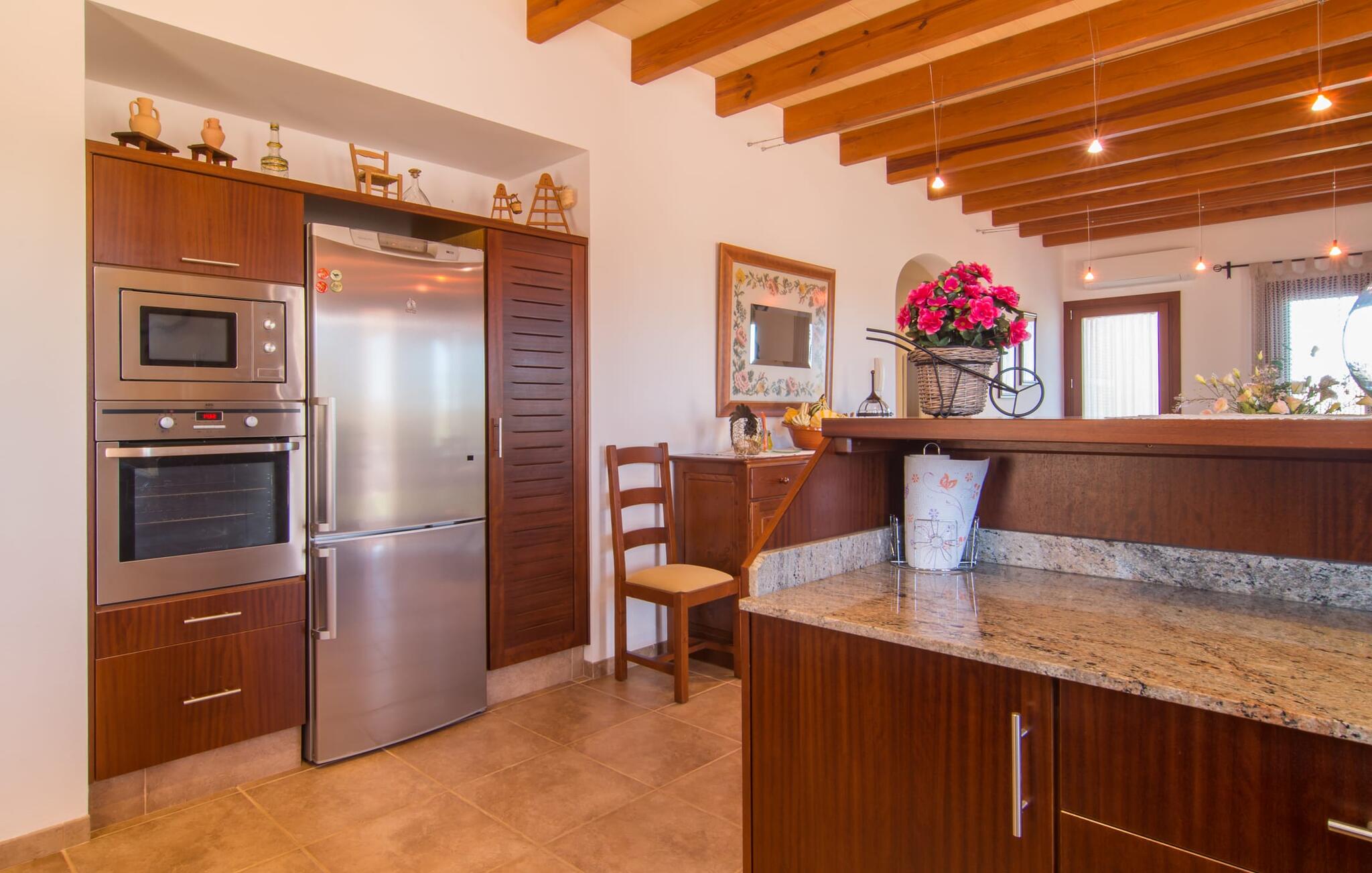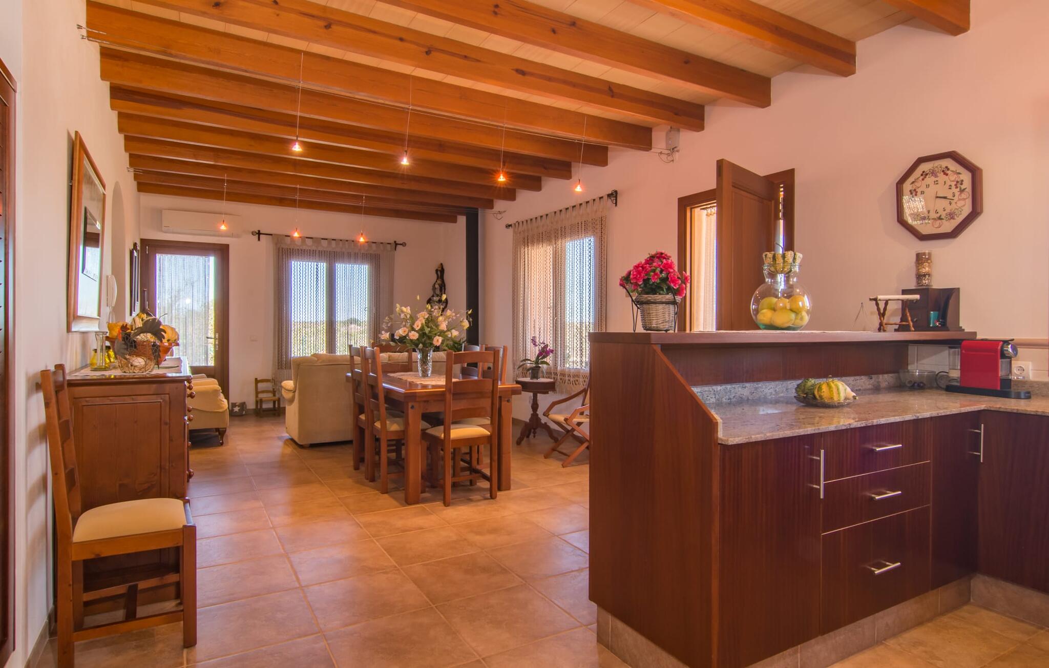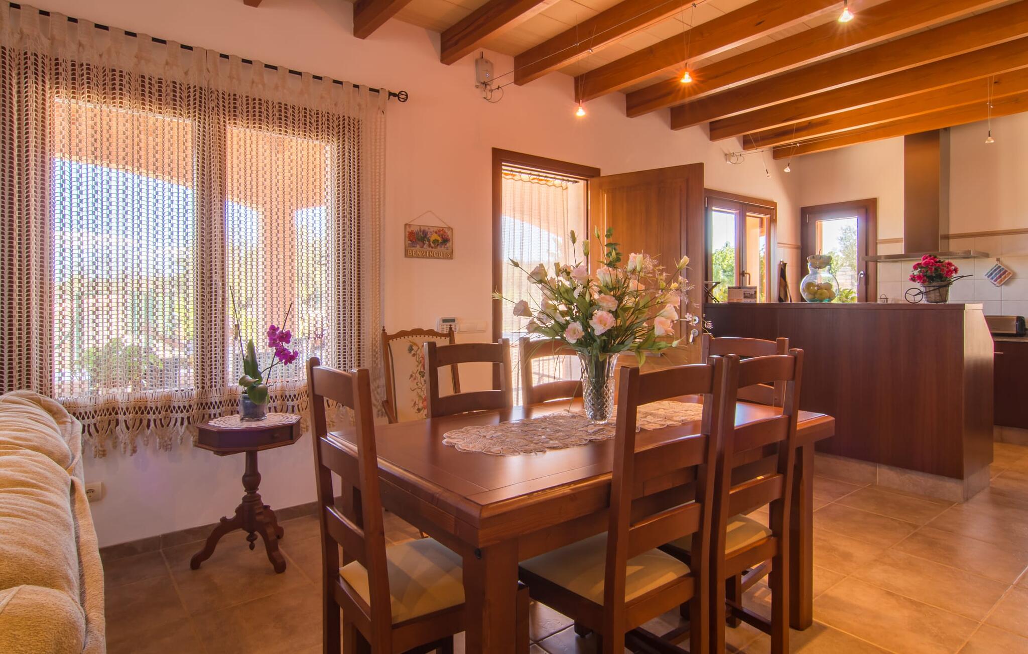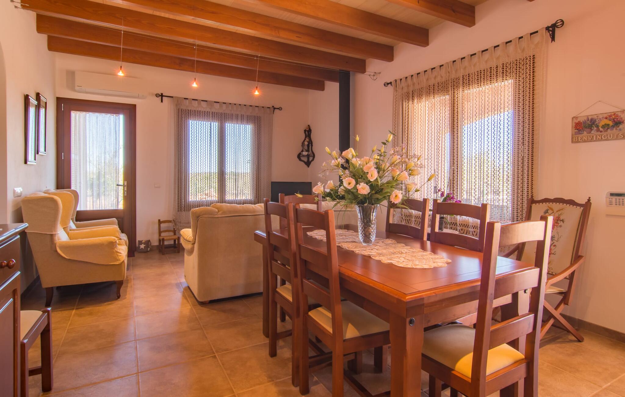 Het is niet alleen het exterieur dat je een compleet zorgeloos gevoel zal geven, ook het interieur van het huis biedt bijna alles wat je hartje begeert. De klassieke Mallorcaanse keuken met aangrenzende woon/eetkamer biedt ruimte voor veel dingen tegelijk. Terwijl de ene persoon in de keuken een heerlijk diner in elkaar flanst, kan de andere ervoor zorgen dat ze een belangrijke wedstrijd of hun favoriete tv-serie niet missen. Dankzij het ontwerp van de villa op de begane grond zijn de drie liefdevol ingerichte tweepersoonskamers niet ver weg, die stuk voor stuk een glimlach op je gezicht toveren. De muskietennetten voor de ramen, de vier draagbare ventilatoren en de airconditioning garanderen rustige nachten. Maar zelfs op koudere dagen voldoet deze gezinsvriendelijke villa aan alle wensen en creëert een heerlijke sfeer dankzij de open haard. Dit is een fantastische plek om te ontspannen en tot rust te komen, perfect voor gezinnen met kinderen.