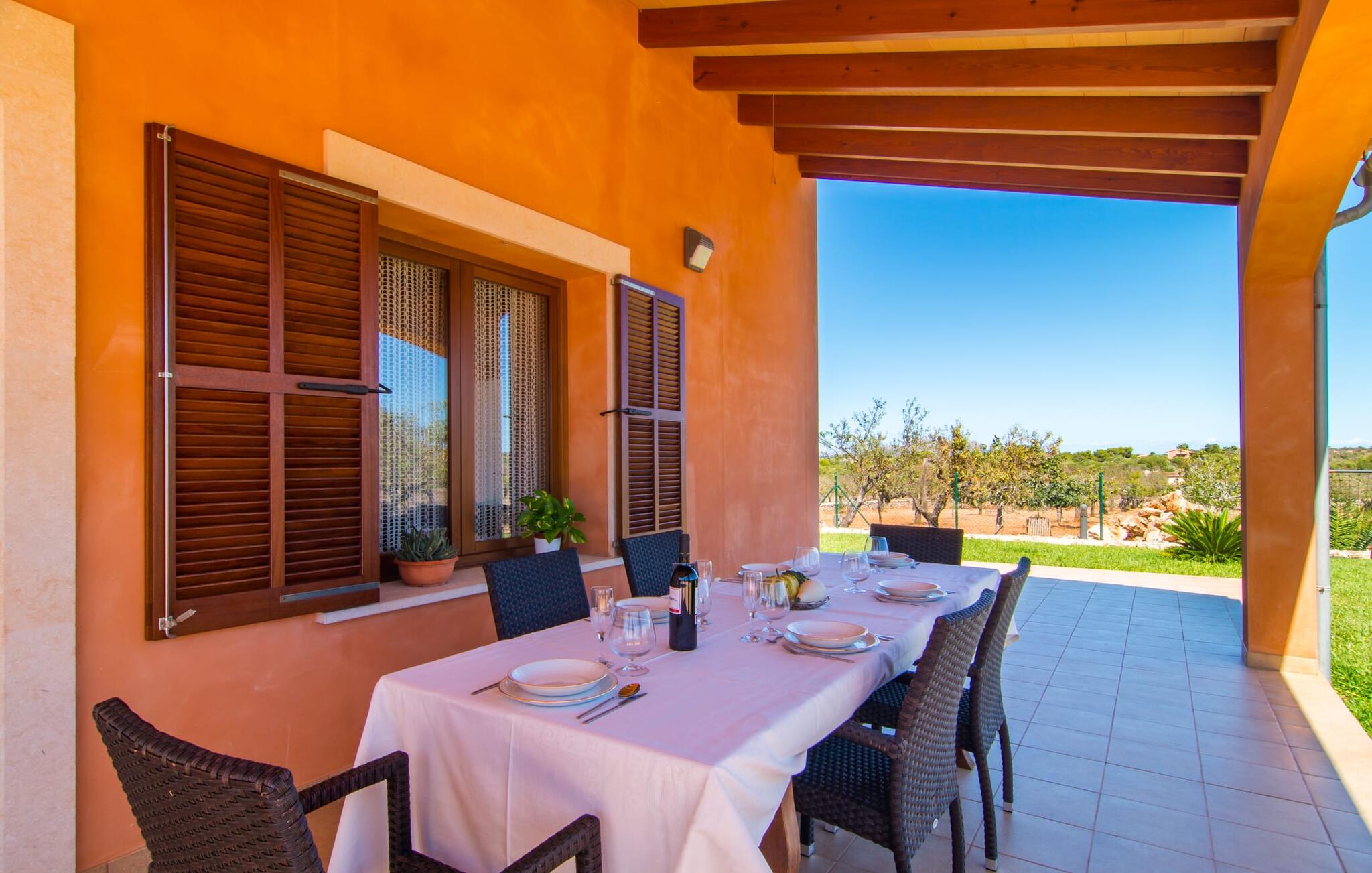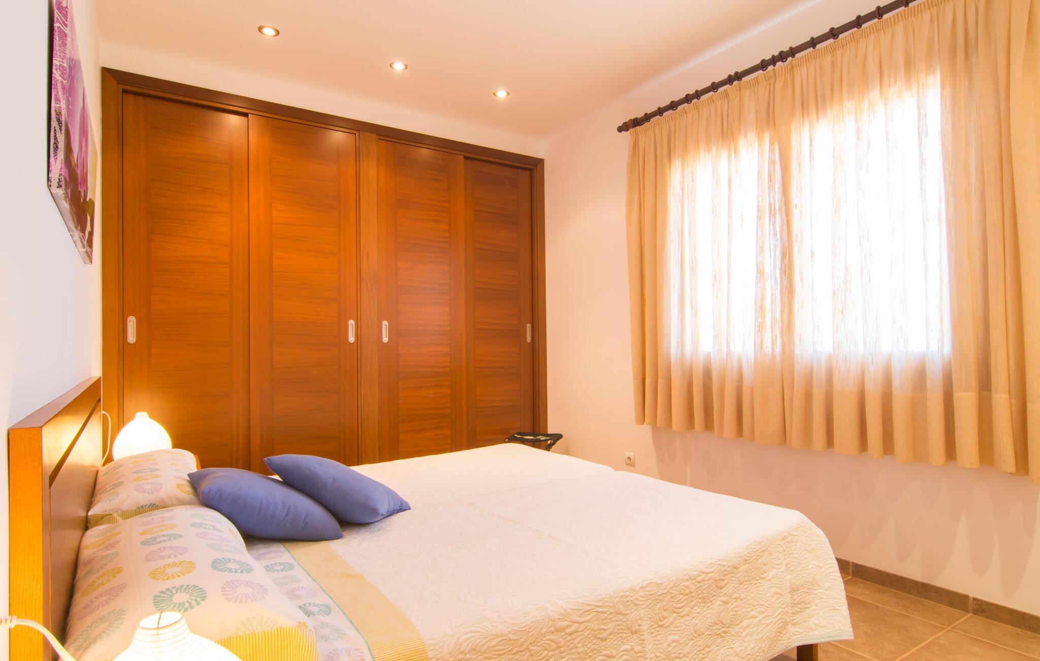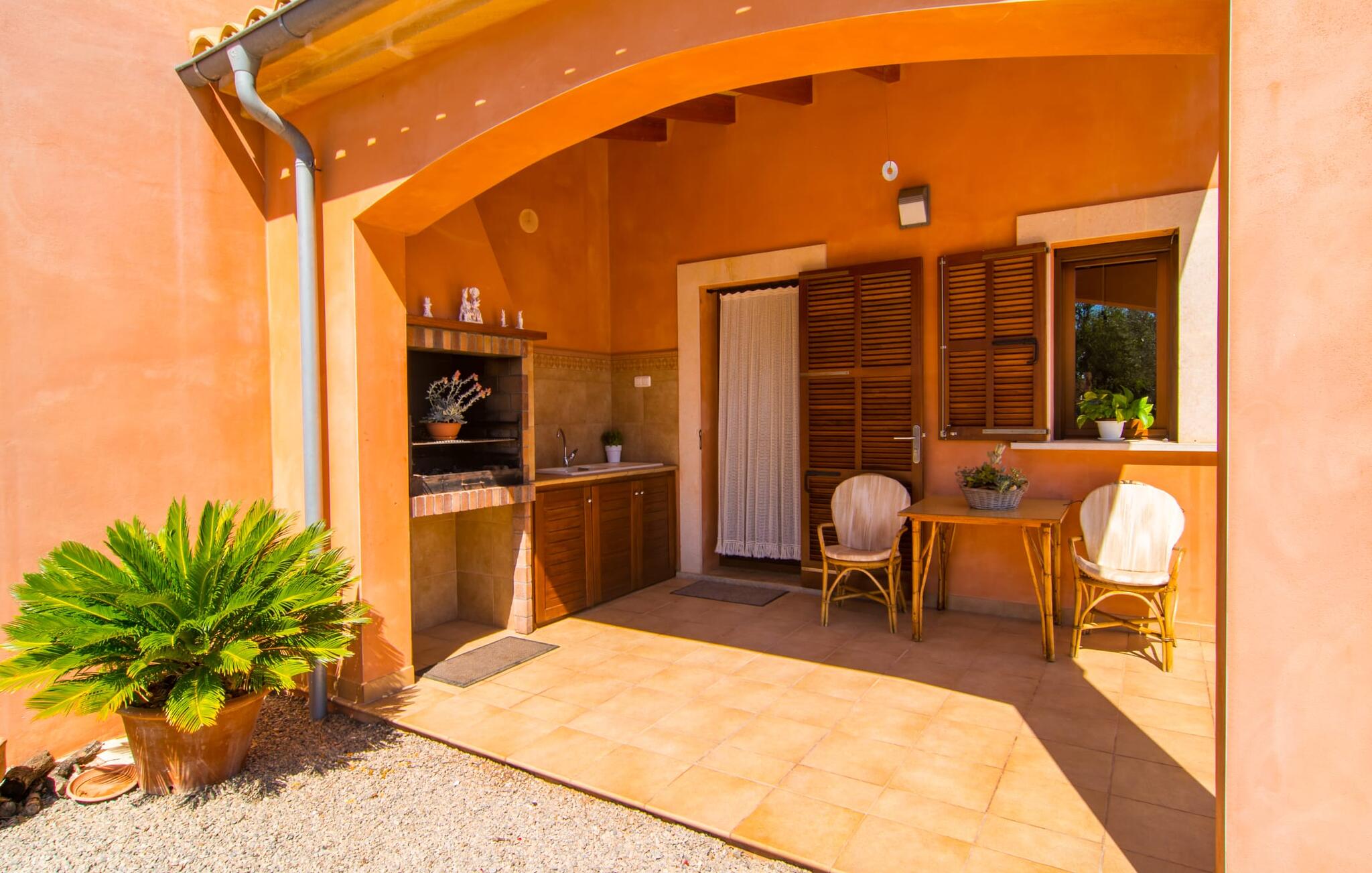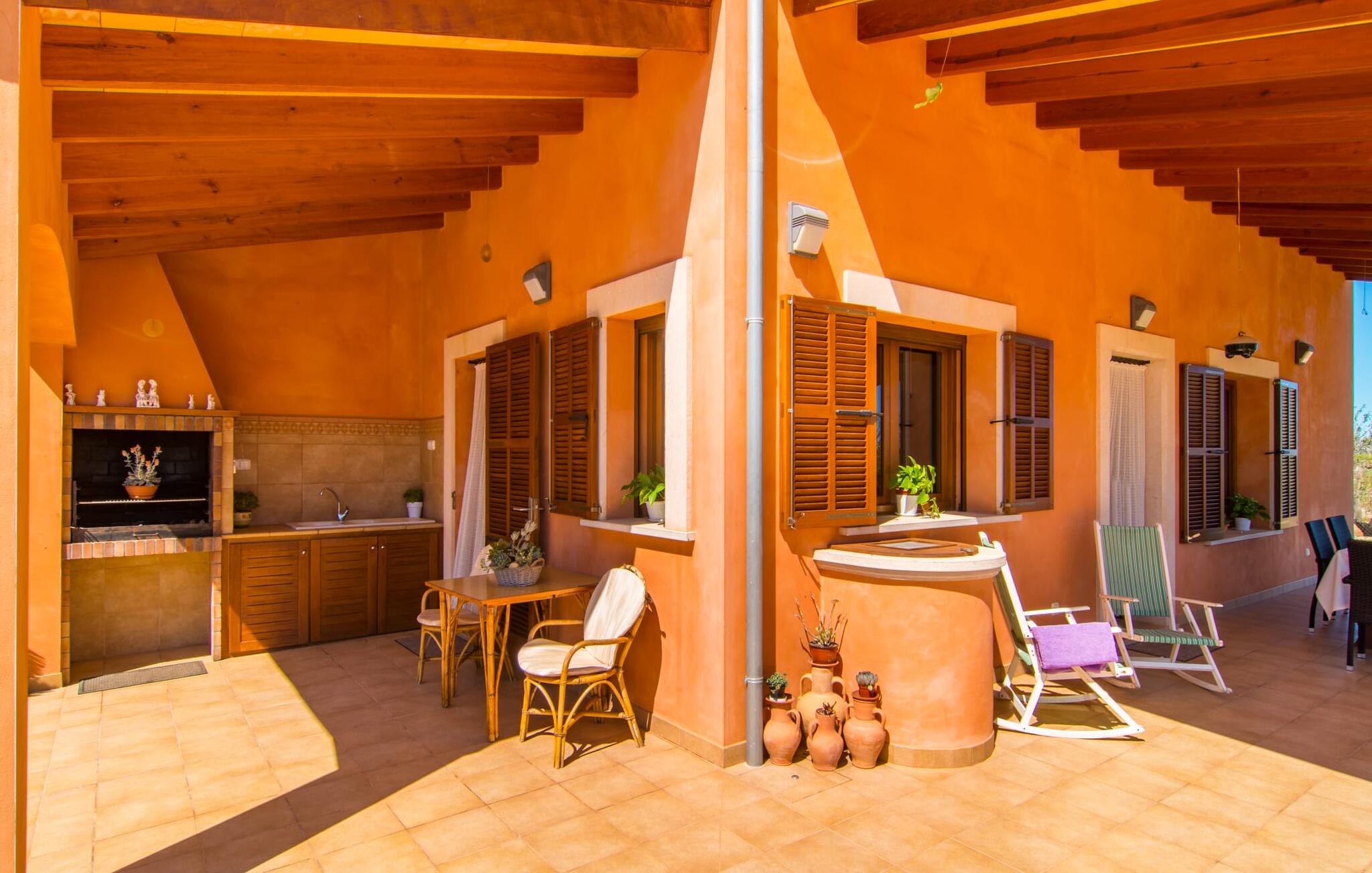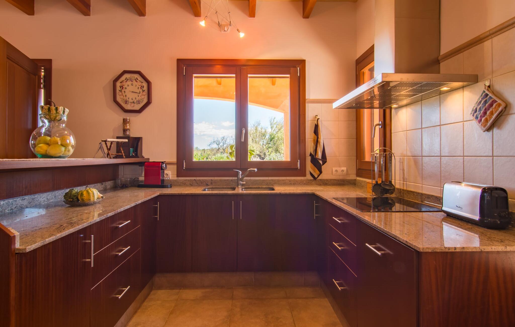 Het is niet alleen het exterieur dat je een compleet zorgeloos gevoel zal geven, ook het interieur van het huis biedt bijna alles wat je hartje begeert. De klassieke Mallorcaanse keuken met aangrenzende woon/eetkamer biedt ruimte voor veel dingen tegelijk. Terwijl de ene persoon in de keuken een heerlijk diner in elkaar flanst, kan de andere ervoor zorgen dat ze een belangrijke wedstrijd of hun favoriete tv-serie niet missen. Dankzij het ontwerp van de villa op de begane grond zijn de drie liefdevol ingerichte tweepersoonskamers niet ver weg, die stuk voor stuk een glimlach op je gezicht toveren. De muskietennetten voor de ramen, de vier draagbare ventilatoren en de airconditioning garanderen rustige nachten. Maar zelfs op koudere dagen voldoet deze gezinsvriendelijke villa aan alle wensen en creëert een heerlijke sfeer dankzij de open haard. Dit is een fantastische plek om te ontspannen en tot rust te komen, perfect voor gezinnen met kinderen.