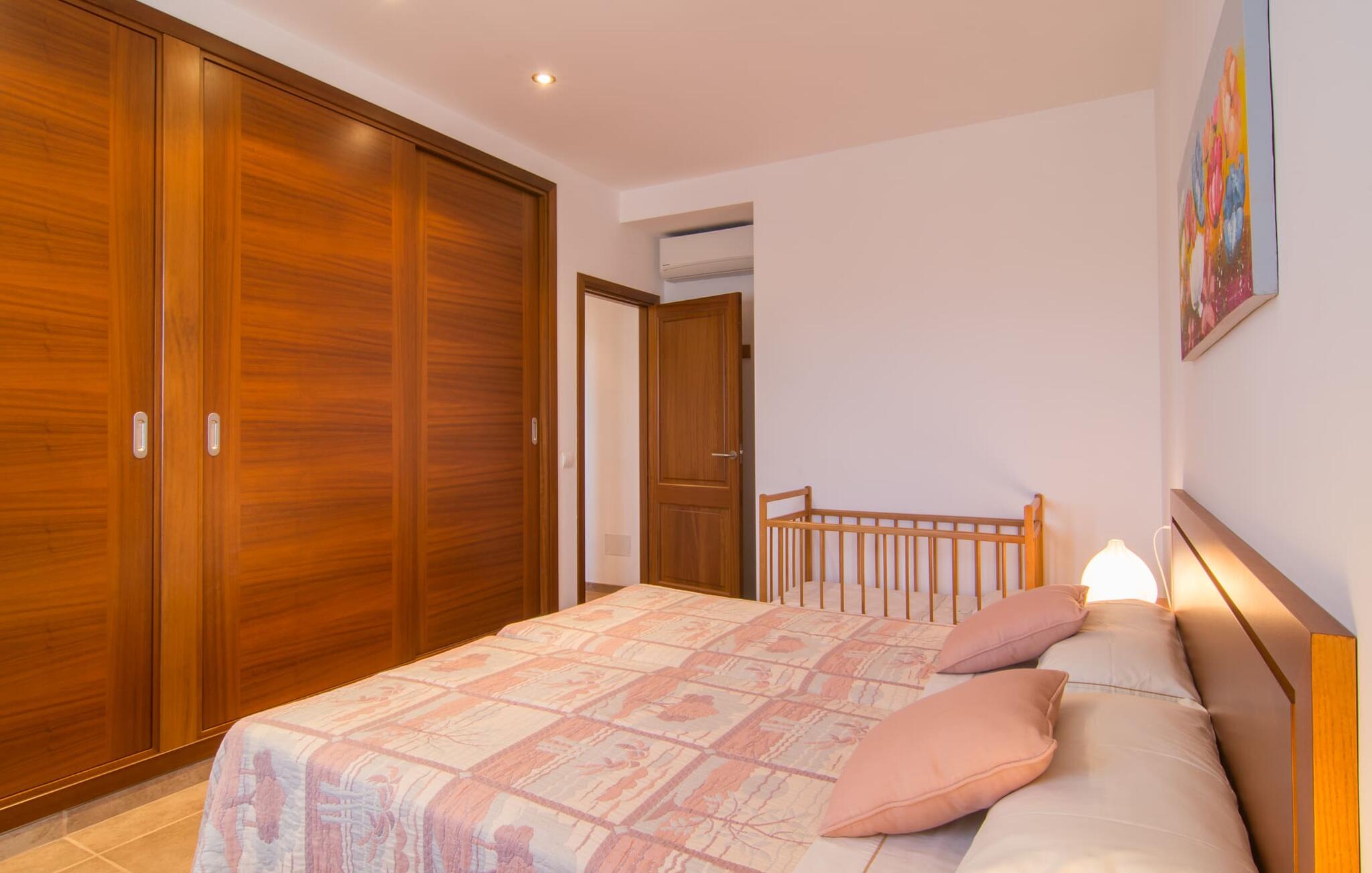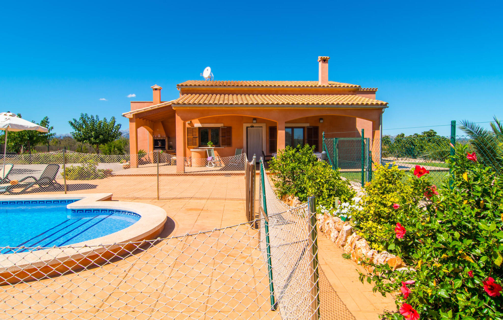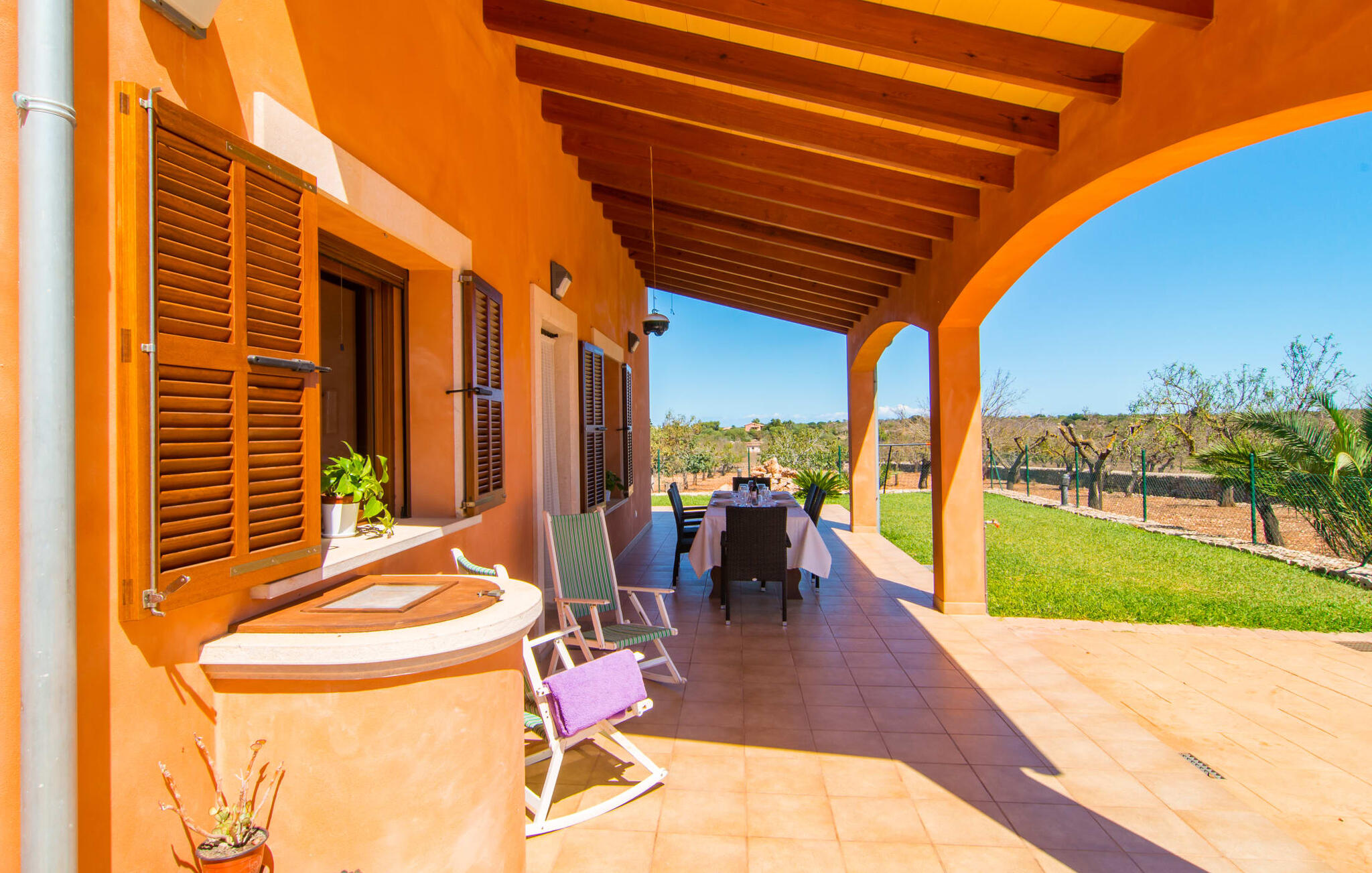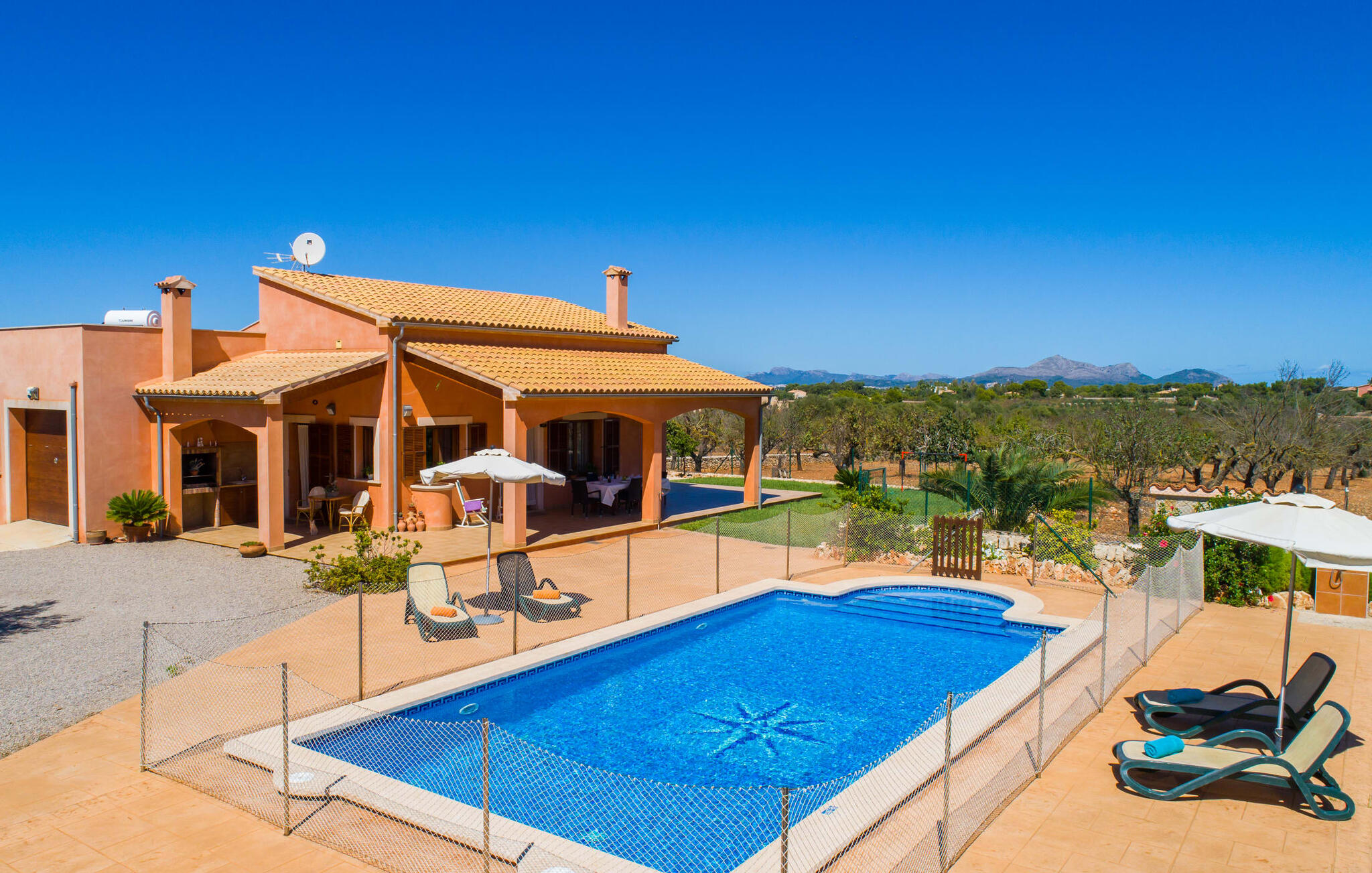Het is niet alleen het exterieur dat je een compleet zorgeloos gevoel zal geven, ook het interieur van het huis biedt bijna alles wat je hartje begeert. De klassieke Mallorcaanse keuken met aangrenzende woon/eetkamer biedt ruimte voor veel dingen tegelijk. Terwijl de ene persoon in de keuken een heerlijk diner in elkaar flanst, kan de andere ervoor zorgen dat ze een belangrijke wedstrijd of hun favoriete tv-serie niet missen. Dankzij het ontwerp van de villa op de begane grond zijn de drie liefdevol ingerichte tweepersoonskamers niet ver weg, die stuk voor stuk een glimlach op je gezicht toveren. De muskietennetten voor de ramen, de vier draagbare ventilatoren en de airconditioning garanderen rustige nachten. Maar zelfs op koudere dagen voldoet deze gezinsvriendelijke villa aan alle wensen en creëert een heerlijke sfeer dankzij de open haard. Dit is een fantastische plek om te ontspannen en tot rust te komen, perfect voor gezinnen met kinderen.