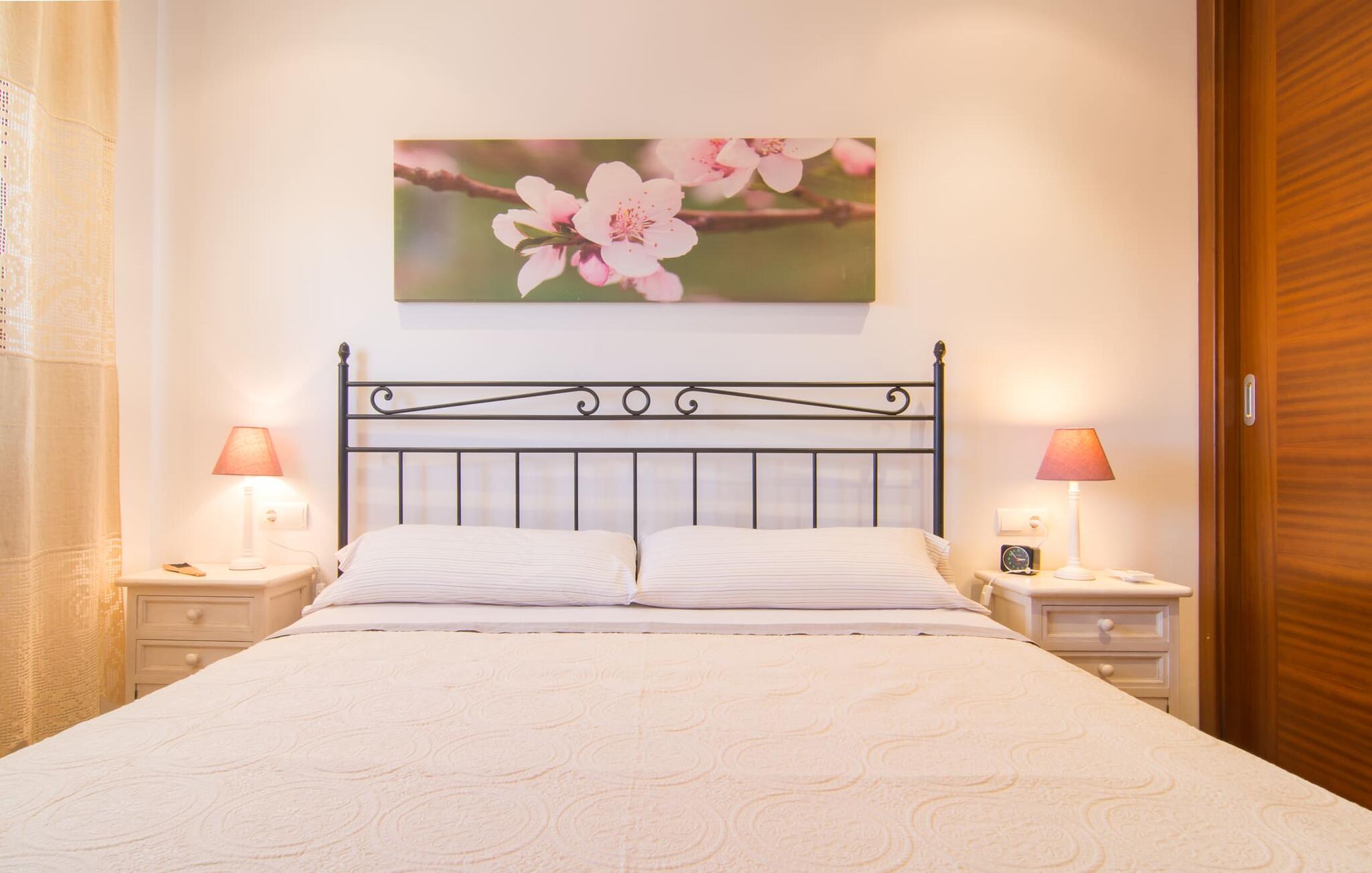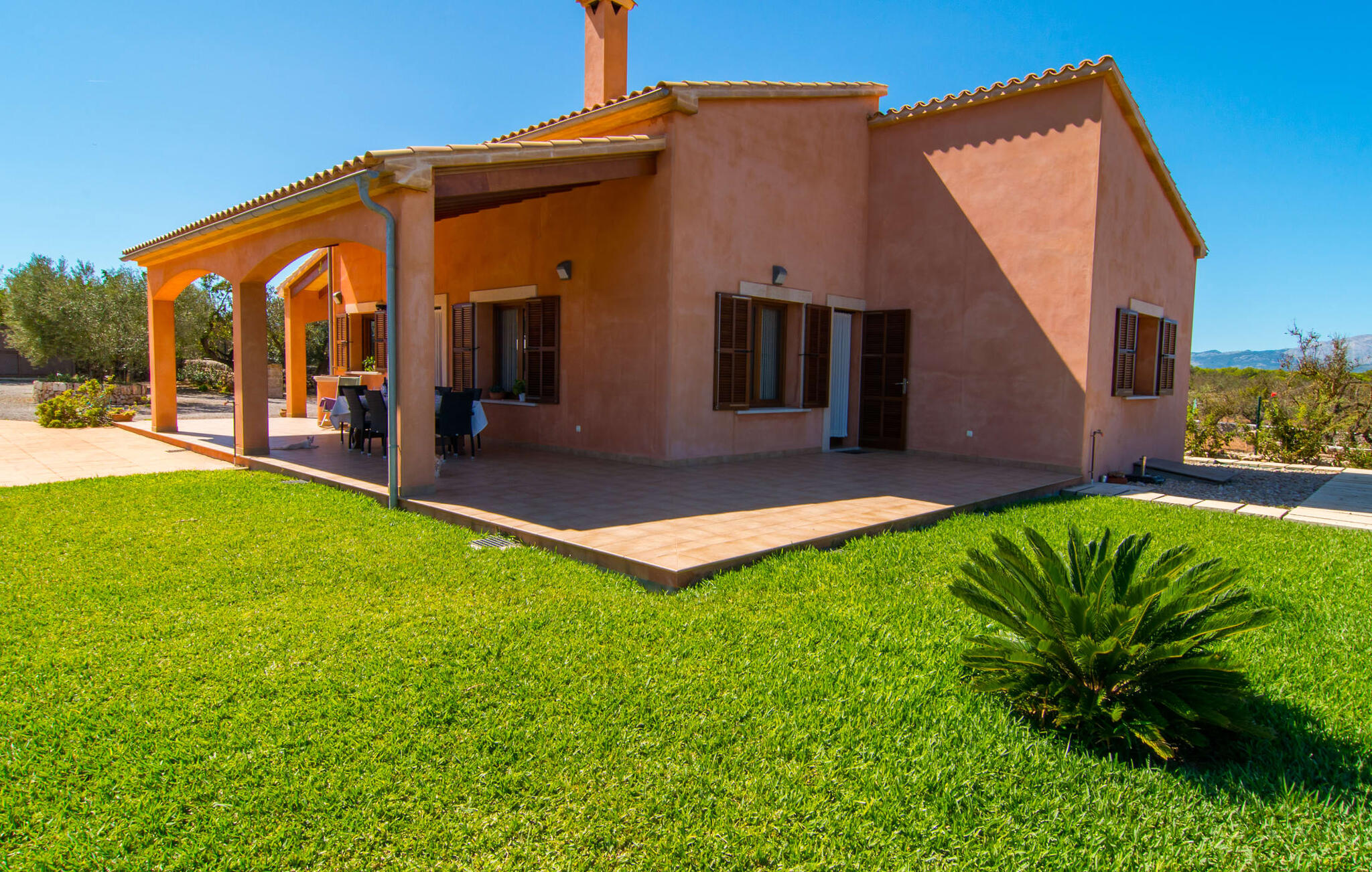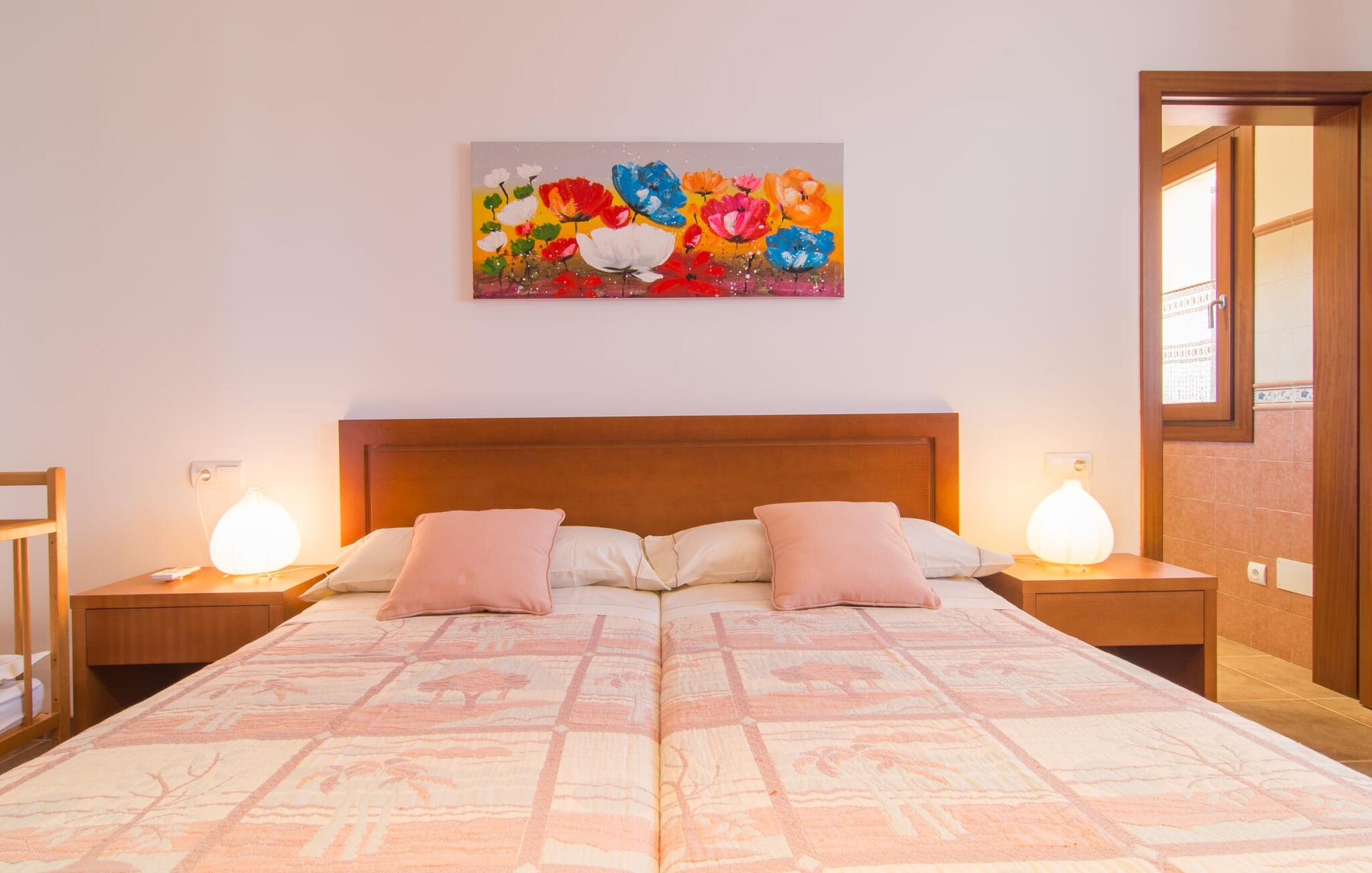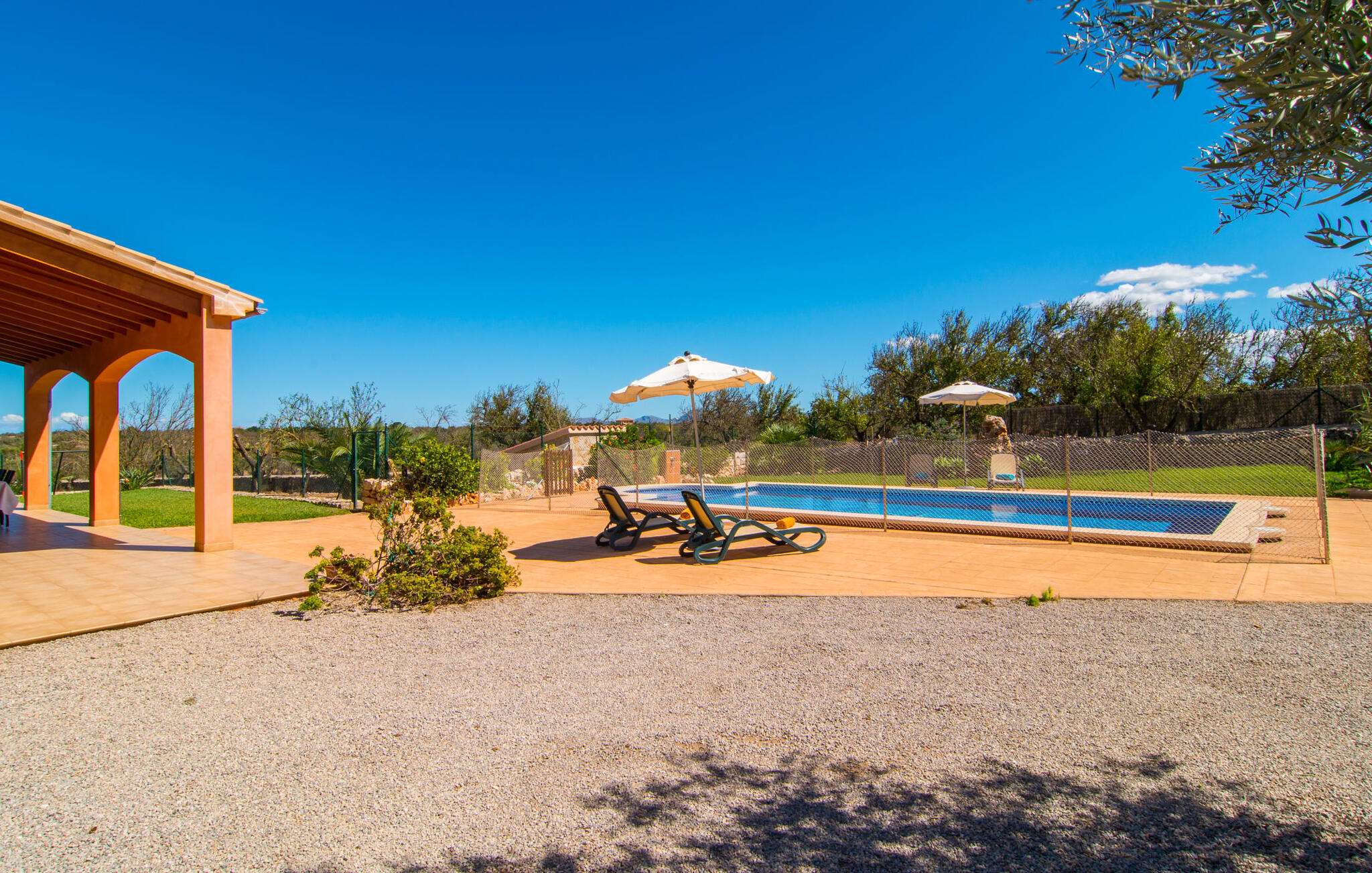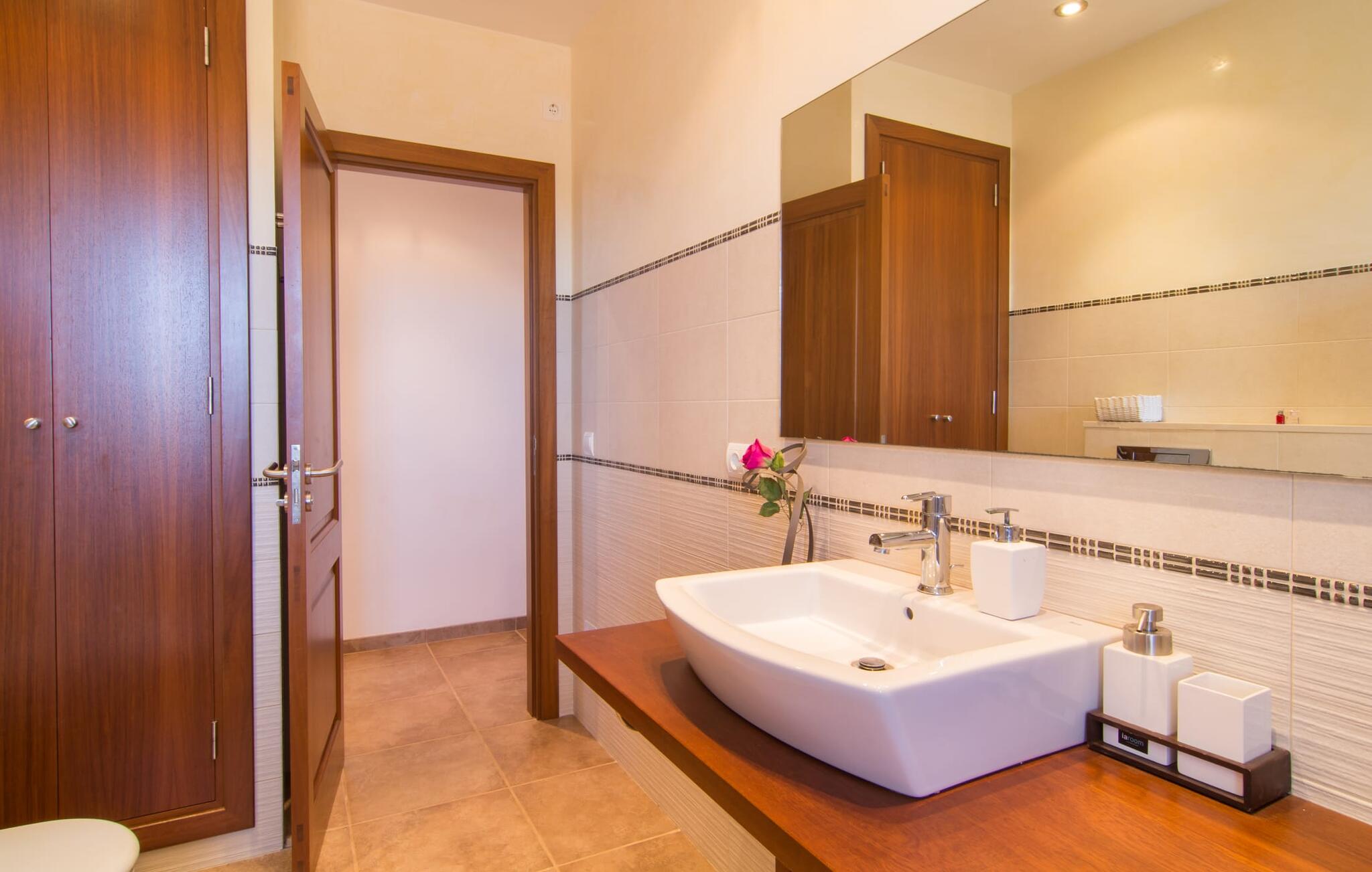 Het is niet alleen het exterieur dat je een compleet zorgeloos gevoel zal geven, ook het interieur van het huis biedt bijna alles wat je hartje begeert. De klassieke Mallorcaanse keuken met aangrenzende woon/eetkamer biedt ruimte voor veel dingen tegelijk. Terwijl de ene persoon in de keuken een heerlijk diner in elkaar flanst, kan de andere ervoor zorgen dat ze een belangrijke wedstrijd of hun favoriete tv-serie niet missen. Dankzij het ontwerp van de villa op de begane grond zijn de drie liefdevol ingerichte tweepersoonskamers niet ver weg, die stuk voor stuk een glimlach op je gezicht toveren. De muskietennetten voor de ramen, de vier draagbare ventilatoren en de airconditioning garanderen rustige nachten. Maar zelfs op koudere dagen voldoet deze gezinsvriendelijke villa aan alle wensen en creëert een heerlijke sfeer dankzij de open haard. Dit is een fantastische plek om te ontspannen en tot rust te komen, perfect voor gezinnen met kinderen.