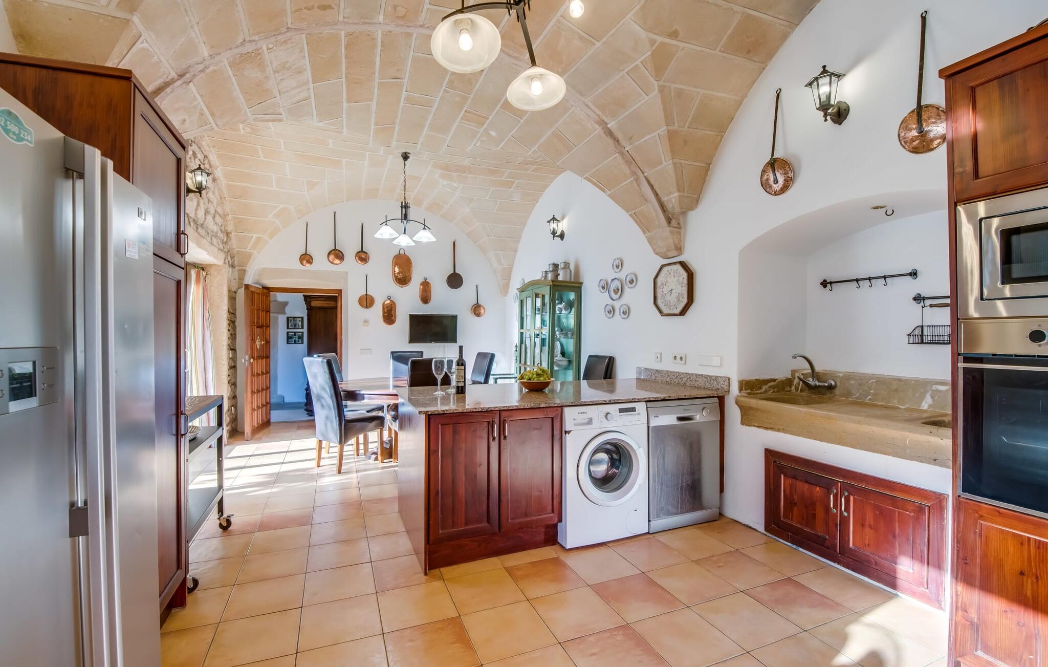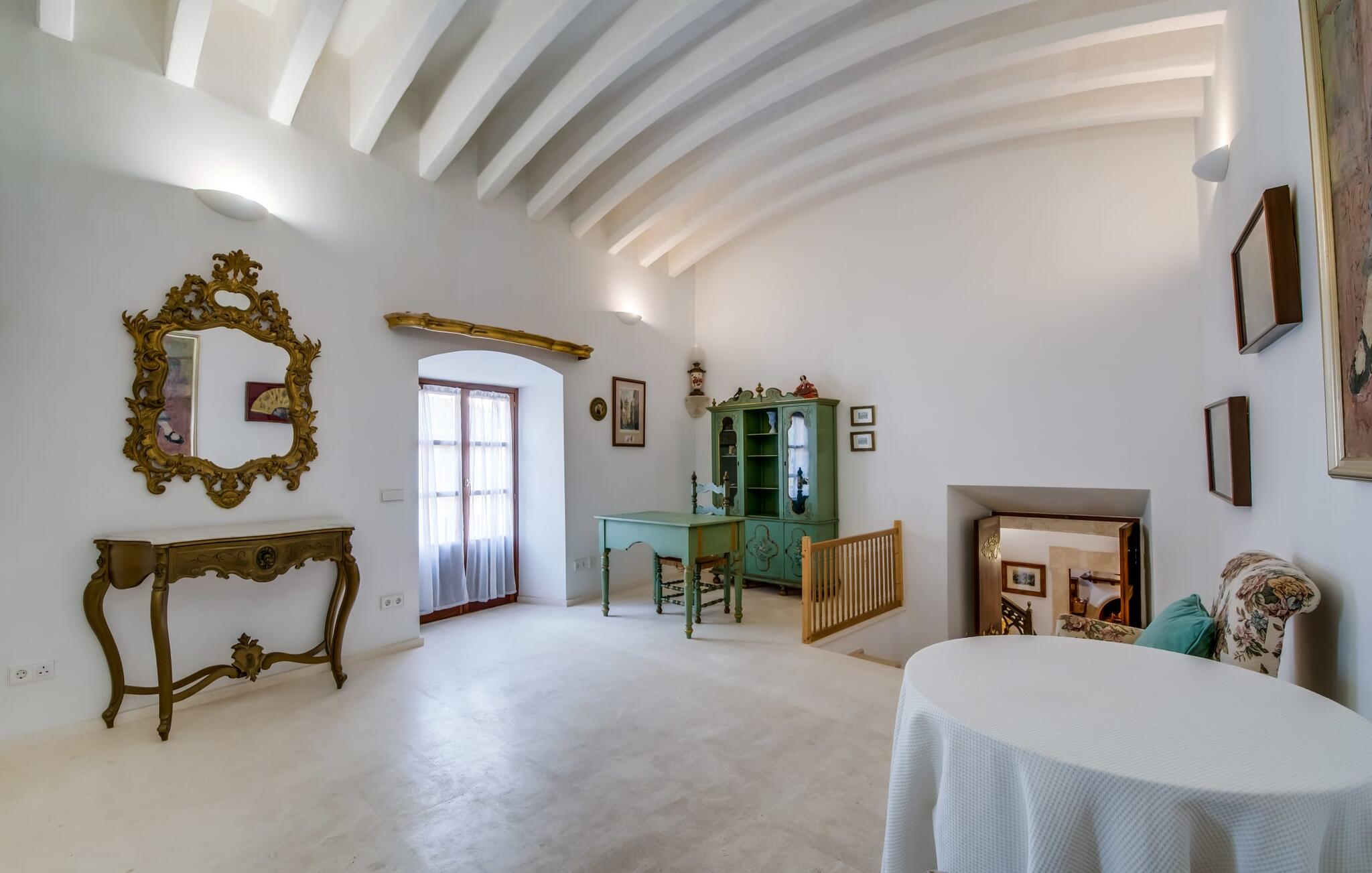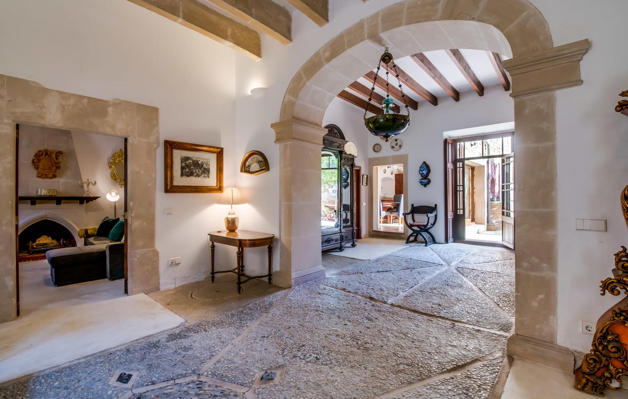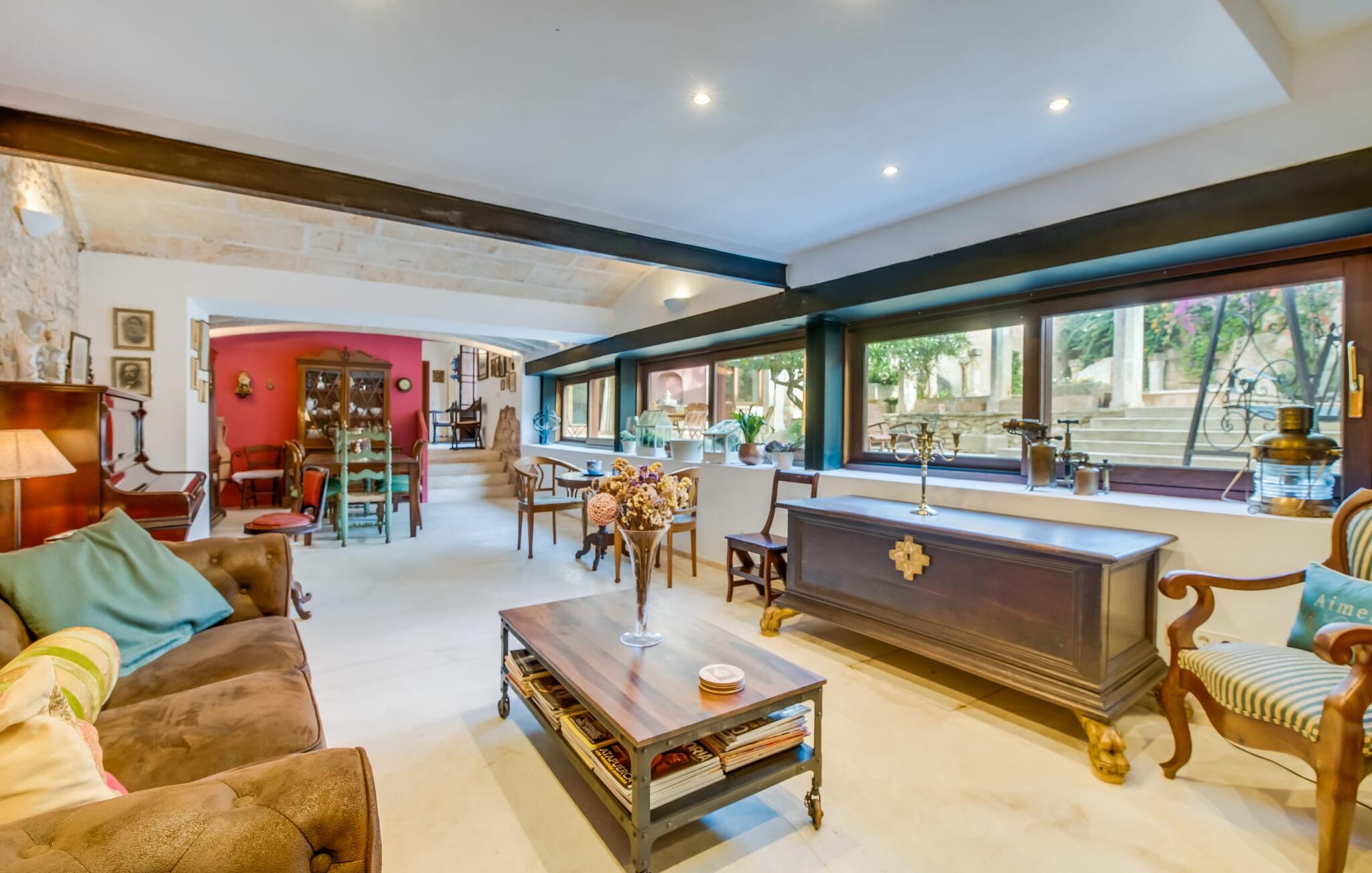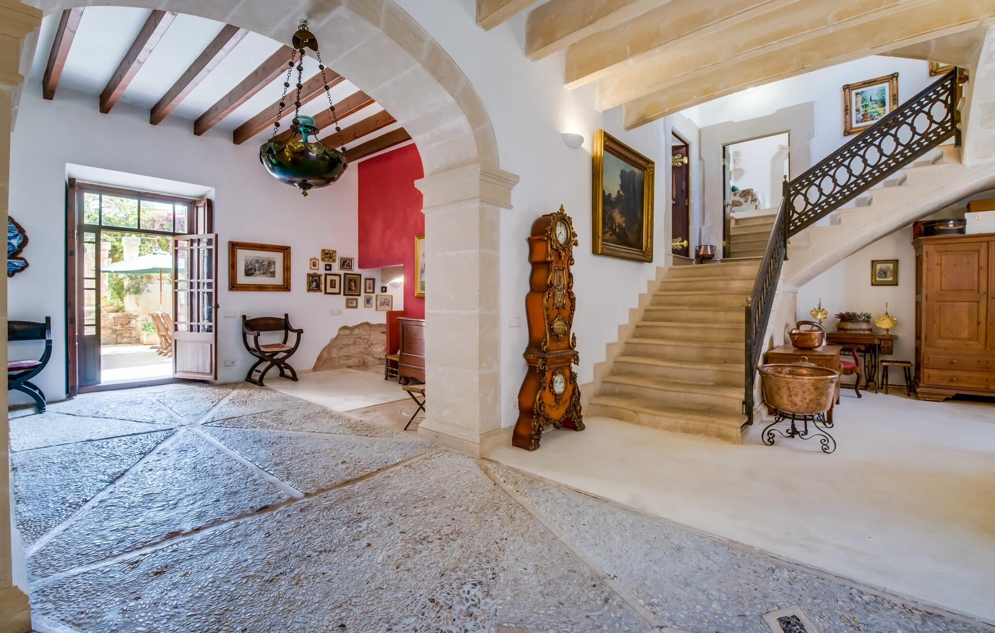 Natuurlijk kun je dit ook binnen doen, in een niet minder euforische sfeer. Mares bogen, breuksteen, gewelfde plafonds en verspringende niveaus vormen de basis voor dit traditionele Mallorcaanse vakantiehuis van absolute topklasse. De combinatie van antieke details en modern comfort, barok en hedendaags design is bijzonder geslaagd. Bezwijk gewoon voor dit charmeoffensief dat je te wachten staat op het gehele verhuurbare oppervlak van een royale 636 m² op vier niveaus. Op de begane grond is er een foyer in overeenstemming met de status van het gebouw, een lichte woonkamer met uitzicht op de binnenplaats, een gezellige lounge met een open haard, een volledig uitgeruste eetkeuken met moderne gemakken en een gastentoilet. De slaapvertrekken zijn verdeeld over de drie bovenste verdiepingen op verspringende niveaus. De slaapkamers vervullen niet alleen hun oorspronkelijke functie, maar zijn door hun grootte ook plekken om je terug te trekken. Ze zijn ook uitgerust met tv`s, sommige met open haard, zithoekjes en inloopkasten enz. De zolderstudio biedt ook een enorme ruimte met fitness- en speeltoestellen tegen de achtergrond van een fantastisch terras. Neem ook zeker een kijkje in de badkamers met hun coole betonlook design en hoogtepunten zoals inloopdouches en het bad in de vloer. Dit spectaculaire herenhuis met zijn doordachte indeling is ideaal om met meerdere gezinnen van je vakantie te genieten!