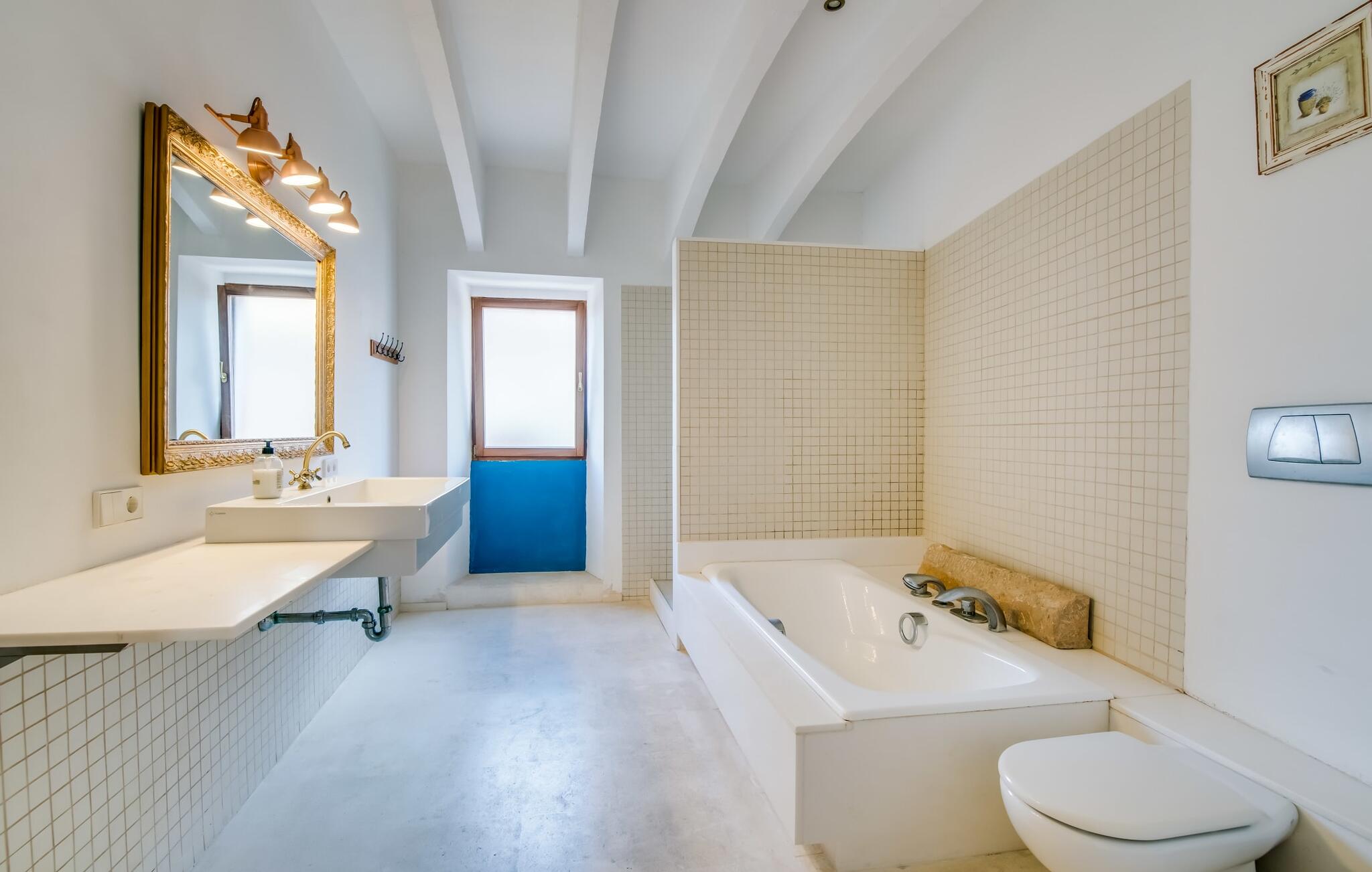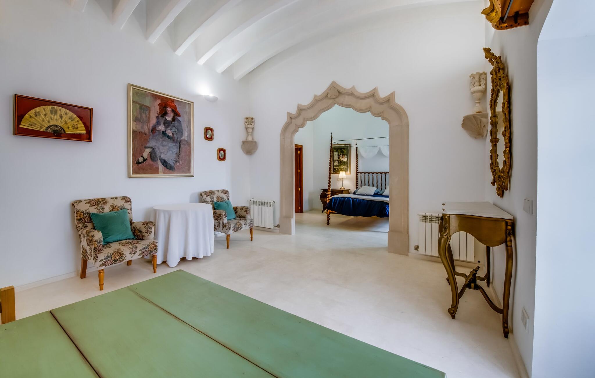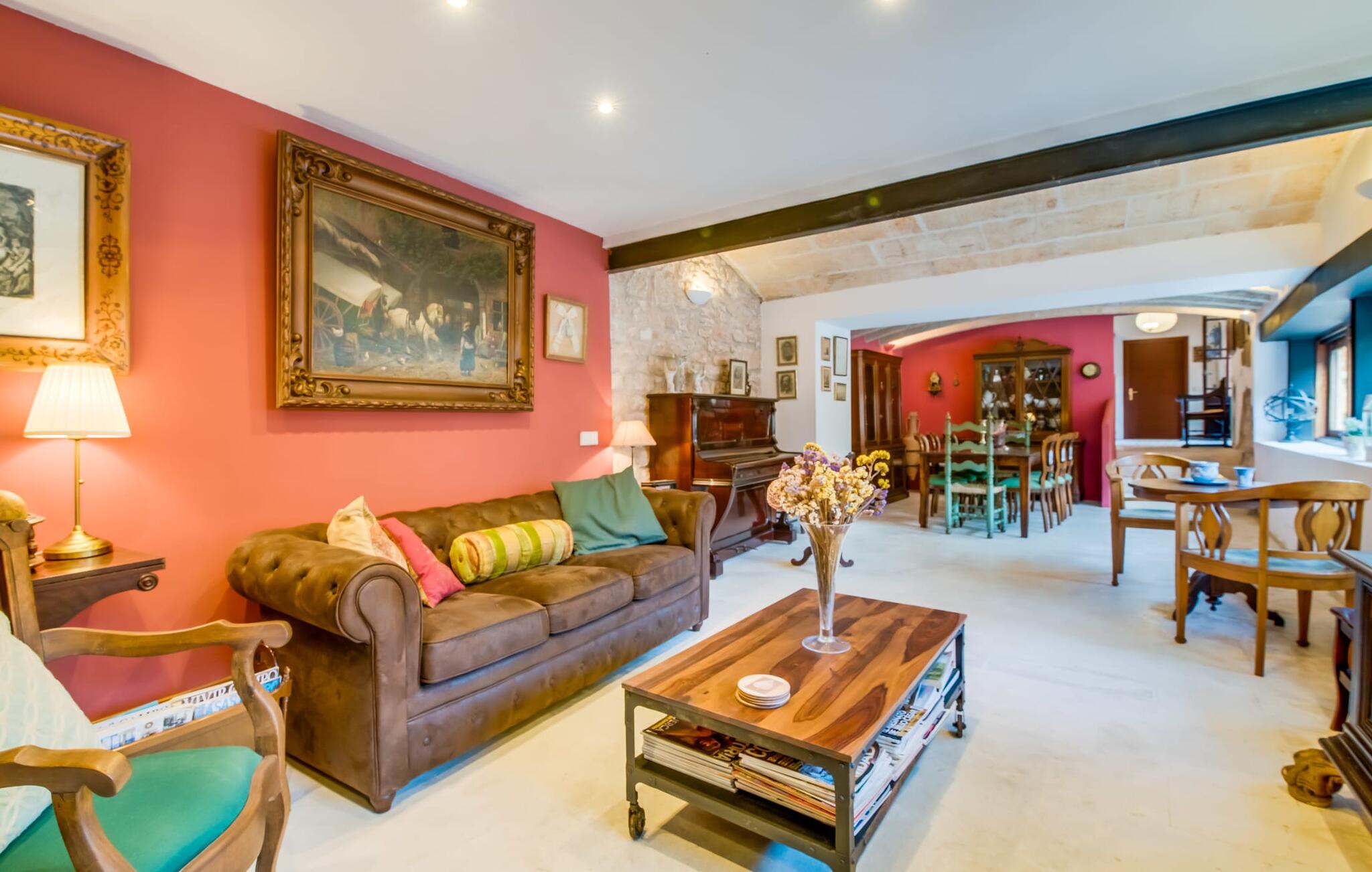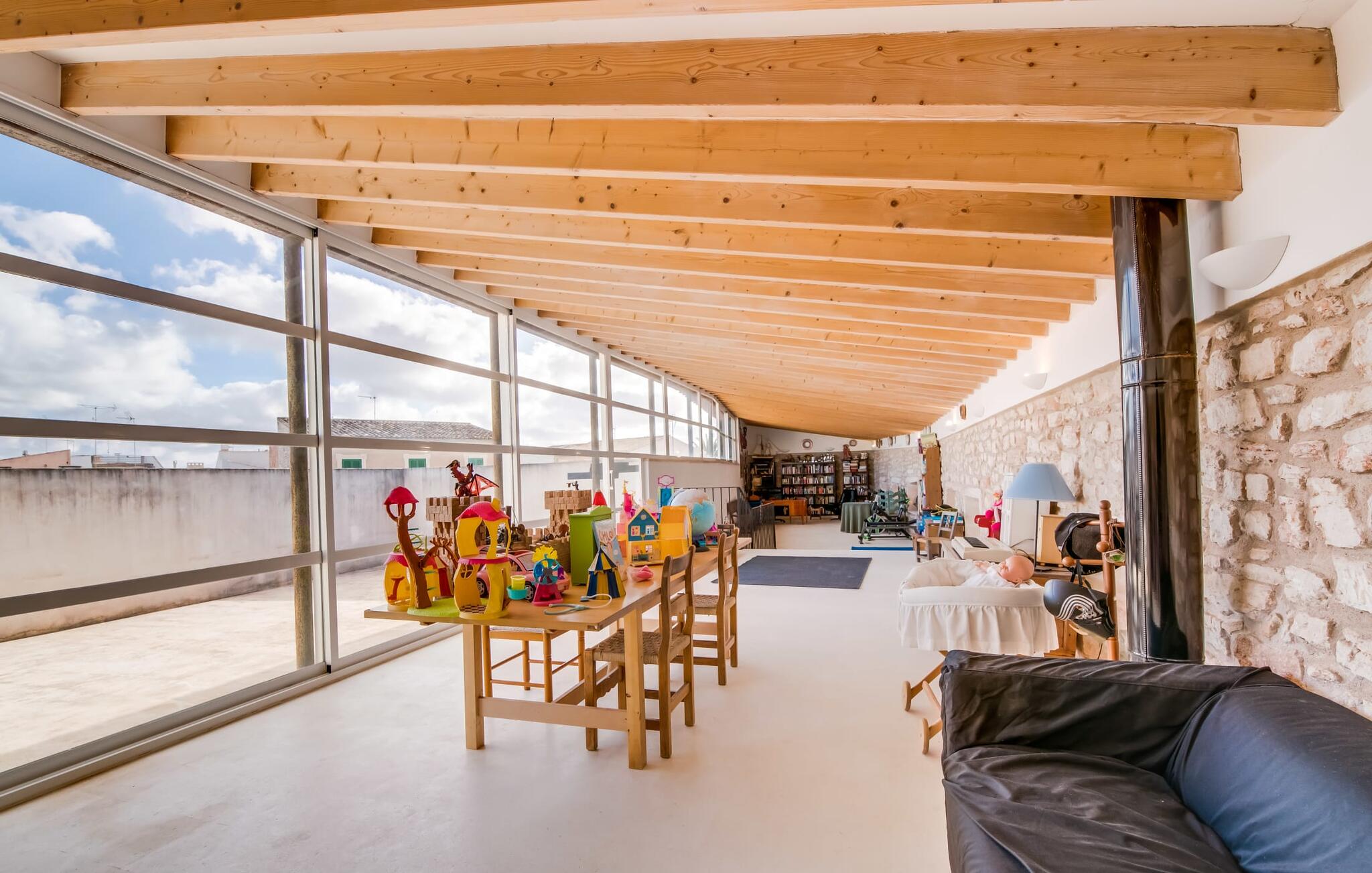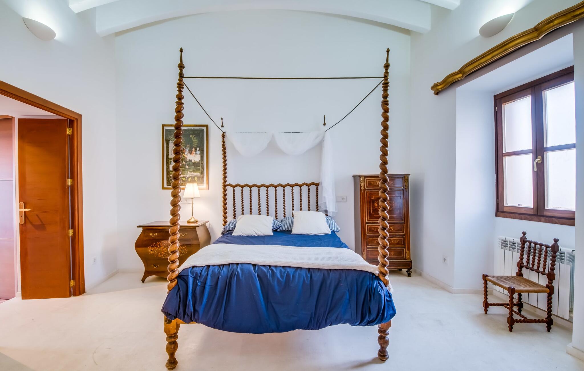 Natuurlijk kun je dit ook binnen doen, in een niet minder euforische sfeer. Mares bogen, breuksteen, gewelfde plafonds en verspringende niveaus vormen de basis voor dit traditionele Mallorcaanse vakantiehuis van absolute topklasse. De combinatie van antieke details en modern comfort, barok en hedendaags design is bijzonder geslaagd. Bezwijk gewoon voor dit charmeoffensief dat je te wachten staat op het gehele verhuurbare oppervlak van een royale 636 m² op vier niveaus. Op de begane grond is er een foyer in overeenstemming met de status van het gebouw, een lichte woonkamer met uitzicht op de binnenplaats, een gezellige lounge met een open haard, een volledig uitgeruste eetkeuken met moderne gemakken en een gastentoilet. De slaapvertrekken zijn verdeeld over de drie bovenste verdiepingen op verspringende niveaus. De slaapkamers vervullen niet alleen hun oorspronkelijke functie, maar zijn door hun grootte ook plekken om je terug te trekken. Ze zijn ook uitgerust met tv`s, sommige met open haard, zithoekjes en inloopkasten enz. De zolderstudio biedt ook een enorme ruimte met fitness- en speeltoestellen tegen de achtergrond van een fantastisch terras. Neem ook zeker een kijkje in de badkamers met hun coole betonlook design en hoogtepunten zoals inloopdouches en het bad in de vloer. Dit spectaculaire herenhuis met zijn doordachte indeling is ideaal om met meerdere gezinnen van je vakantie te genieten!