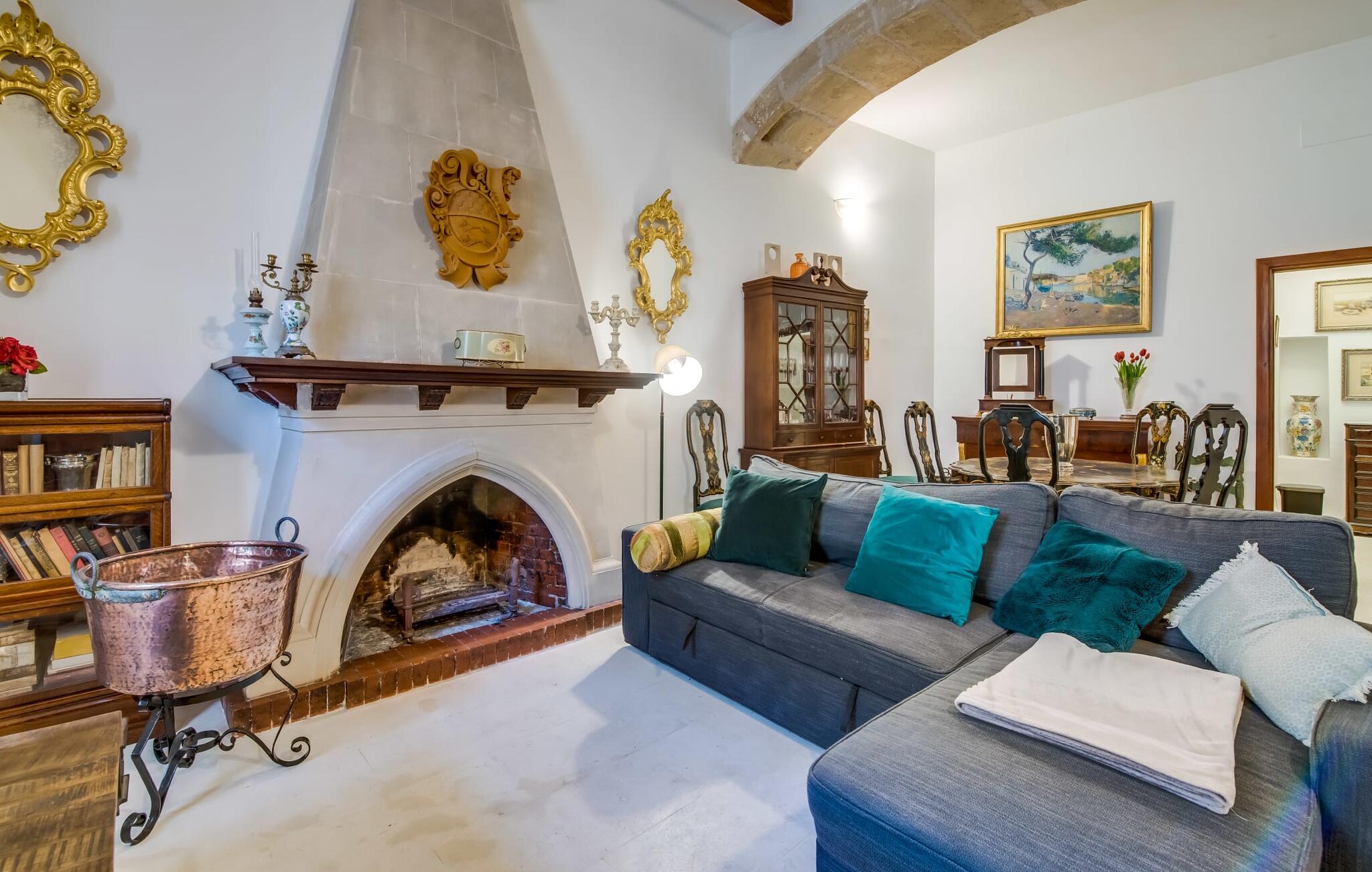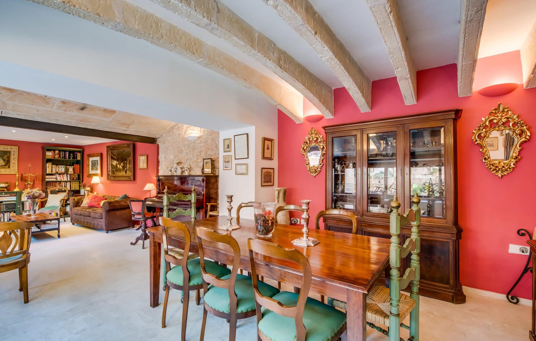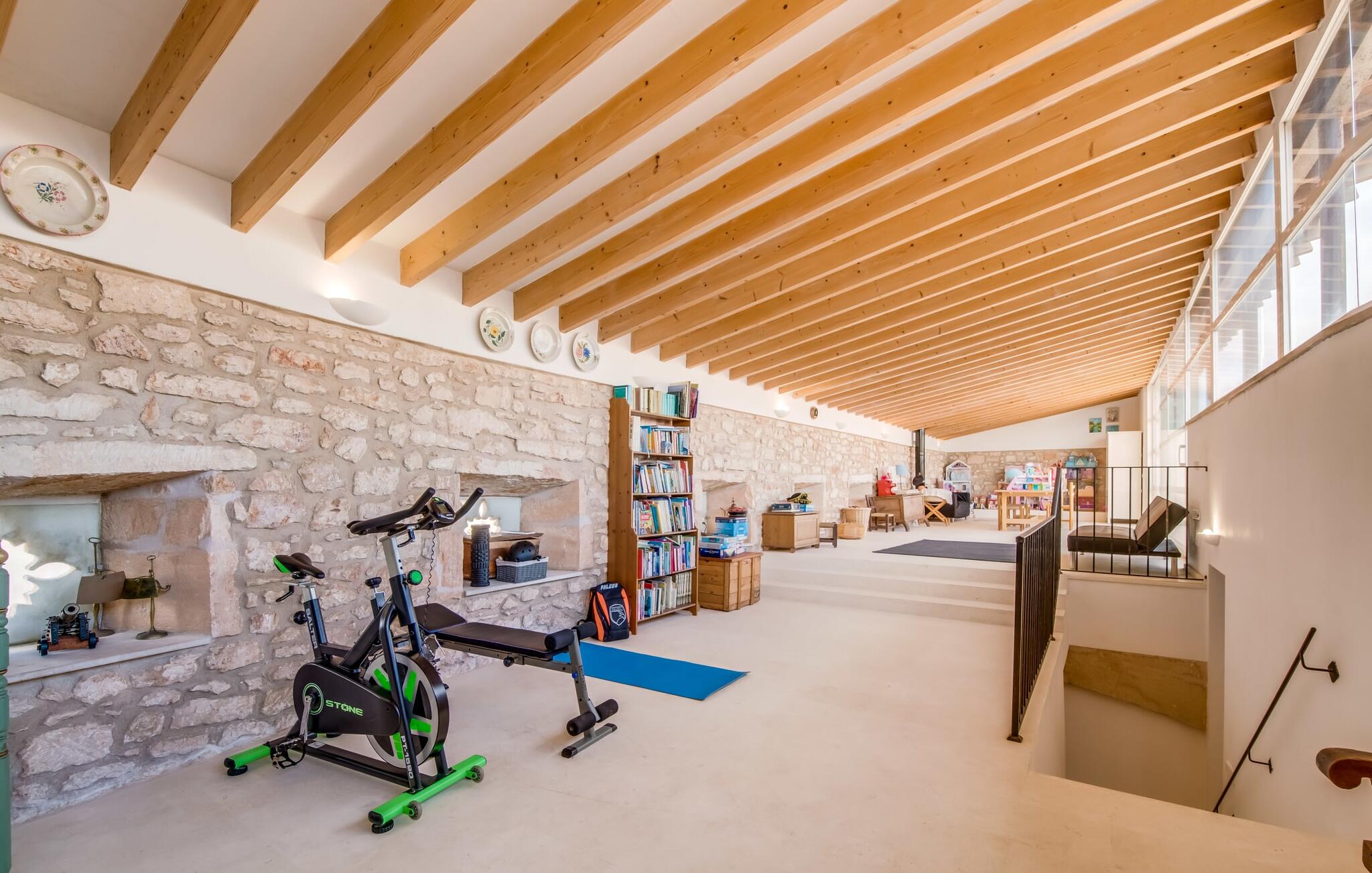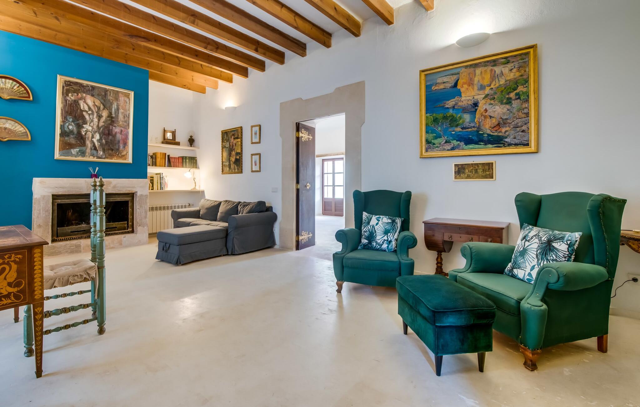 Natuurlijk kun je dit ook binnen doen, in een niet minder euforische sfeer. Mares bogen, breuksteen, gewelfde plafonds en verspringende niveaus vormen de basis voor dit traditionele Mallorcaanse vakantiehuis van absolute topklasse. De combinatie van antieke details en modern comfort, barok en hedendaags design is bijzonder geslaagd. Bezwijk gewoon voor dit charmeoffensief dat je te wachten staat op het gehele verhuurbare oppervlak van een royale 636 m² op vier niveaus. Op de begane grond is er een foyer in overeenstemming met de status van het gebouw, een lichte woonkamer met uitzicht op de binnenplaats, een gezellige lounge met een open haard, een volledig uitgeruste eetkeuken met moderne gemakken en een gastentoilet. De slaapvertrekken zijn verdeeld over de drie bovenste verdiepingen op verspringende niveaus. De slaapkamers vervullen niet alleen hun oorspronkelijke functie, maar zijn door hun grootte ook plekken om je terug te trekken. Ze zijn ook uitgerust met tv`s, sommige met open haard, zithoekjes en inloopkasten enz. De zolderstudio biedt ook een enorme ruimte met fitness- en speeltoestellen tegen de achtergrond van een fantastisch terras. Neem ook zeker een kijkje in de badkamers met hun coole betonlook design en hoogtepunten zoals inloopdouches en het bad in de vloer. Dit spectaculaire herenhuis met zijn doordachte indeling is ideaal om met meerdere gezinnen van je vakantie te genieten!