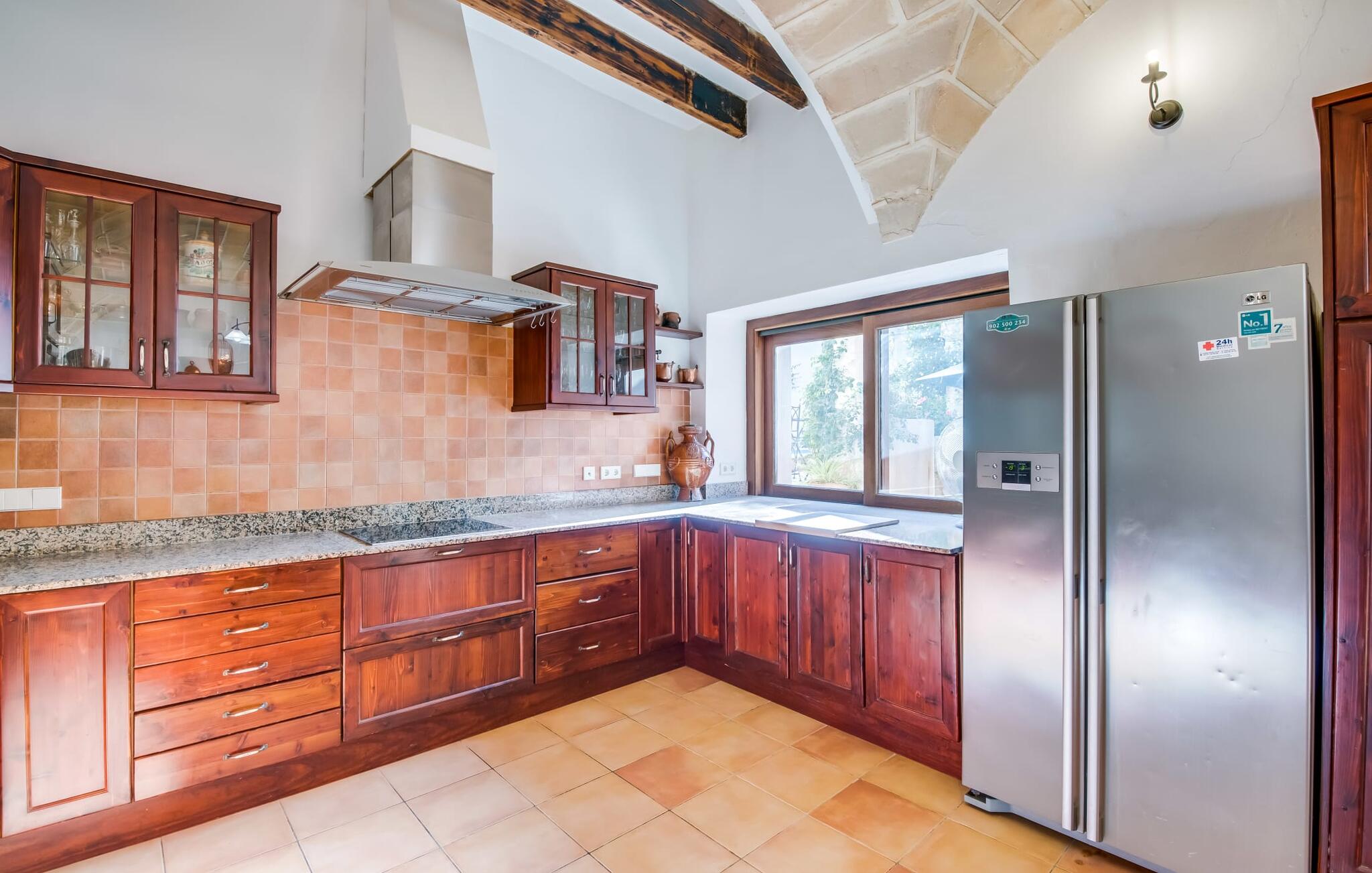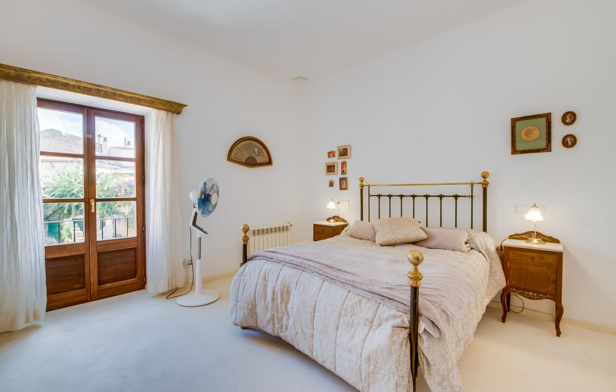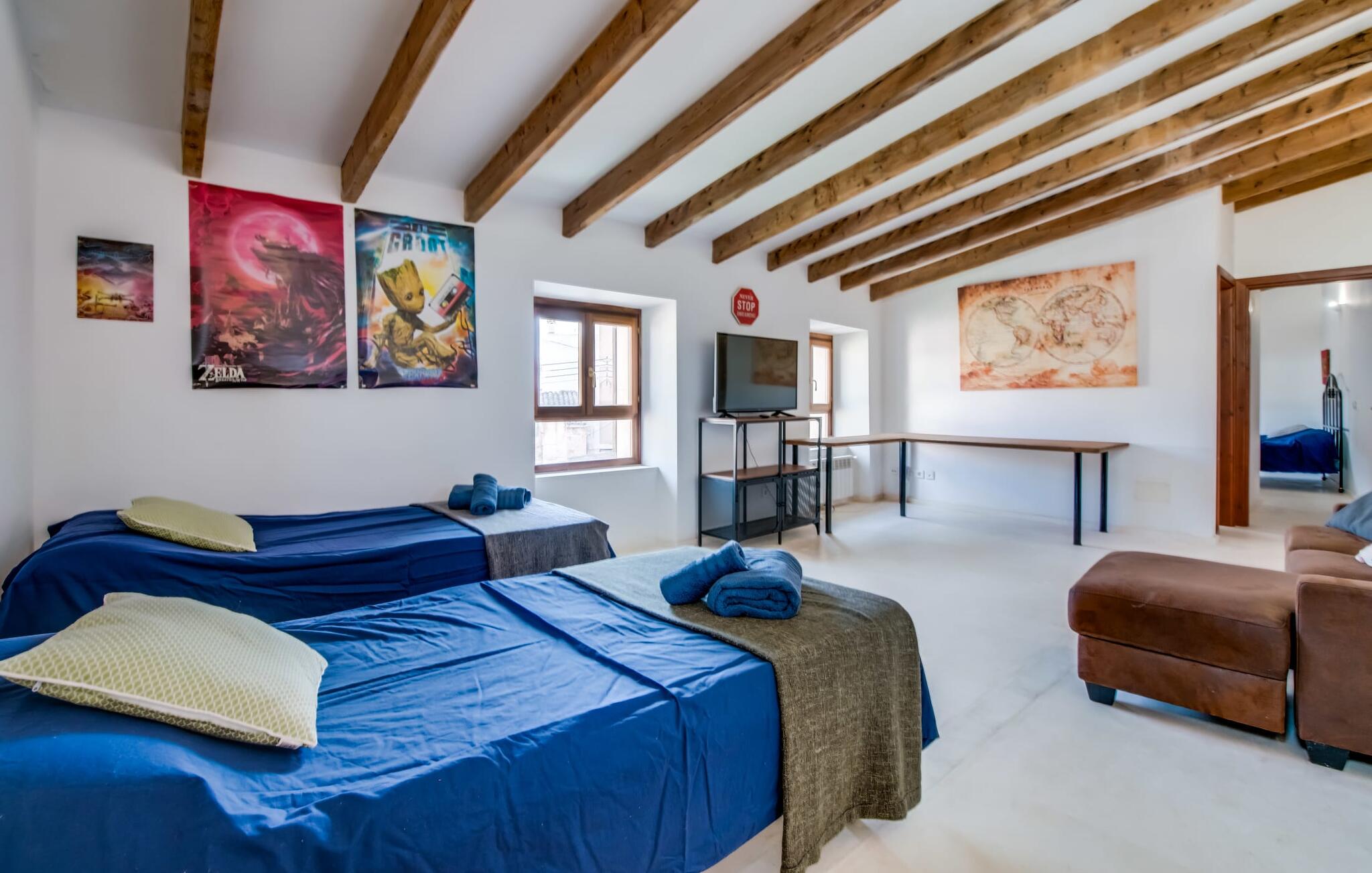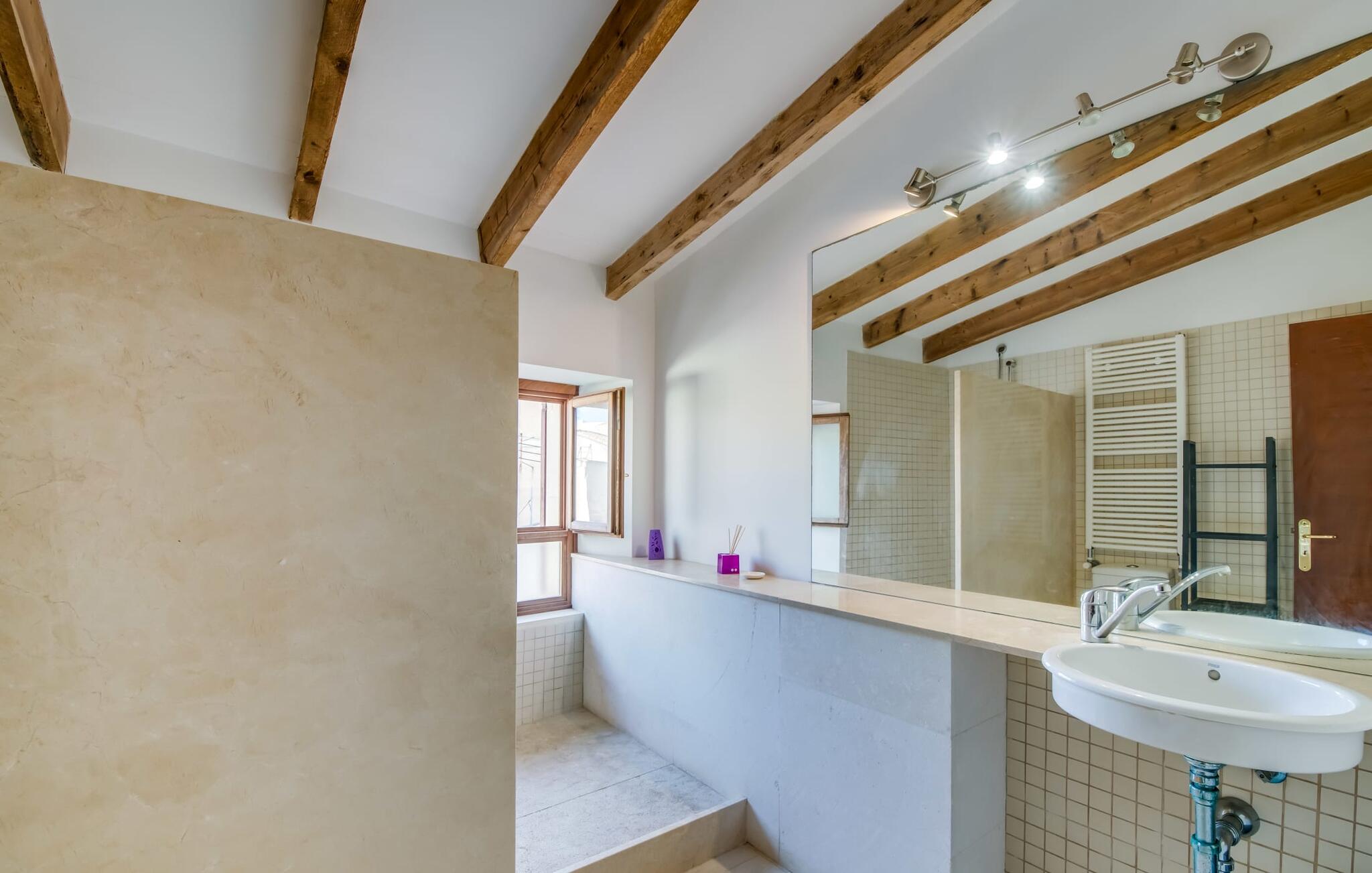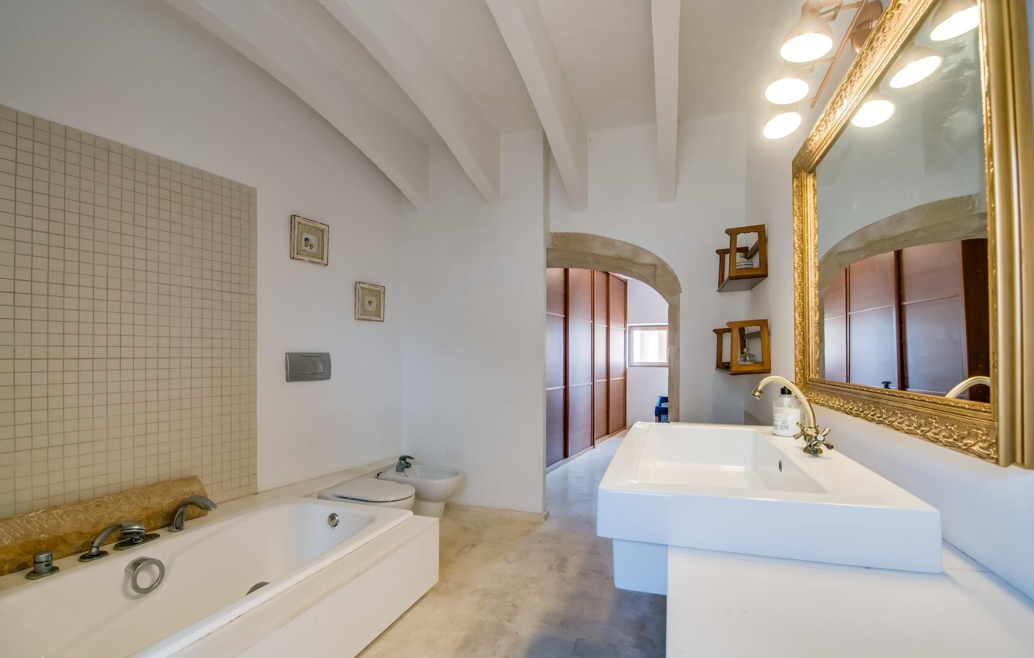 Natuurlijk kun je dit ook binnen doen, in een niet minder euforische sfeer. Mares bogen, breuksteen, gewelfde plafonds en verspringende niveaus vormen de basis voor dit traditionele Mallorcaanse vakantiehuis van absolute topklasse. De combinatie van antieke details en modern comfort, barok en hedendaags design is bijzonder geslaagd. Bezwijk gewoon voor dit charmeoffensief dat je te wachten staat op het gehele verhuurbare oppervlak van een royale 636 m² op vier niveaus. Op de begane grond is er een foyer in overeenstemming met de status van het gebouw, een lichte woonkamer met uitzicht op de binnenplaats, een gezellige lounge met een open haard, een volledig uitgeruste eetkeuken met moderne gemakken en een gastentoilet. De slaapvertrekken zijn verdeeld over de drie bovenste verdiepingen op verspringende niveaus. De slaapkamers vervullen niet alleen hun oorspronkelijke functie, maar zijn door hun grootte ook plekken om je terug te trekken. Ze zijn ook uitgerust met tv`s, sommige met open haard, zithoekjes en inloopkasten enz. De zolderstudio biedt ook een enorme ruimte met fitness- en speeltoestellen tegen de achtergrond van een fantastisch terras. Neem ook zeker een kijkje in de badkamers met hun coole betonlook design en hoogtepunten zoals inloopdouches en het bad in de vloer. Dit spectaculaire herenhuis met zijn doordachte indeling is ideaal om met meerdere gezinnen van je vakantie te genieten!