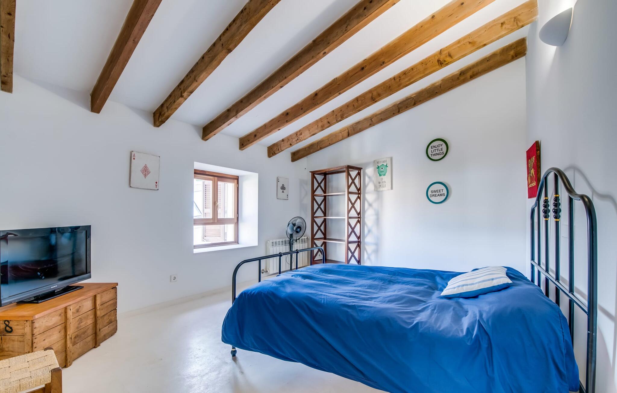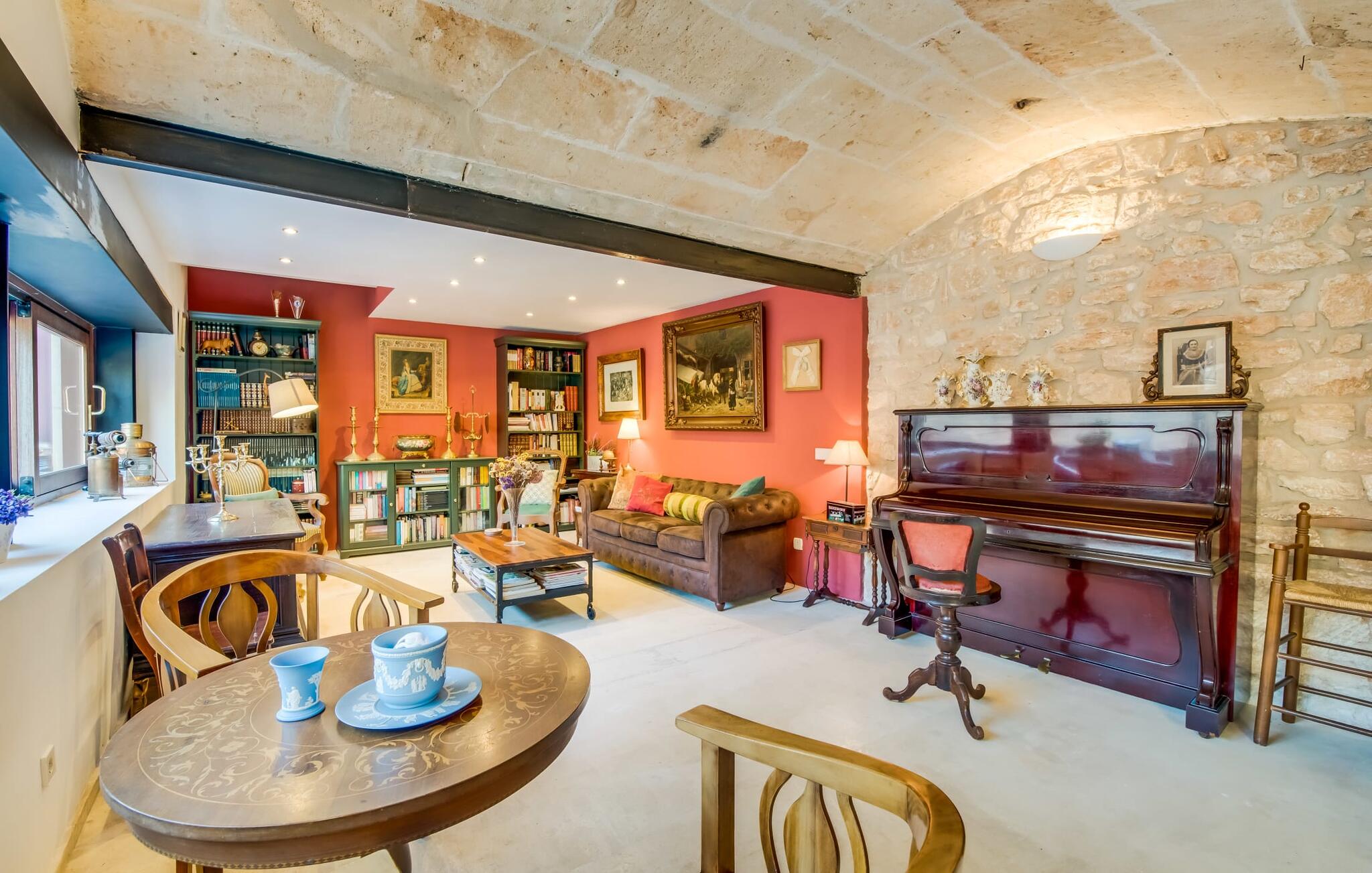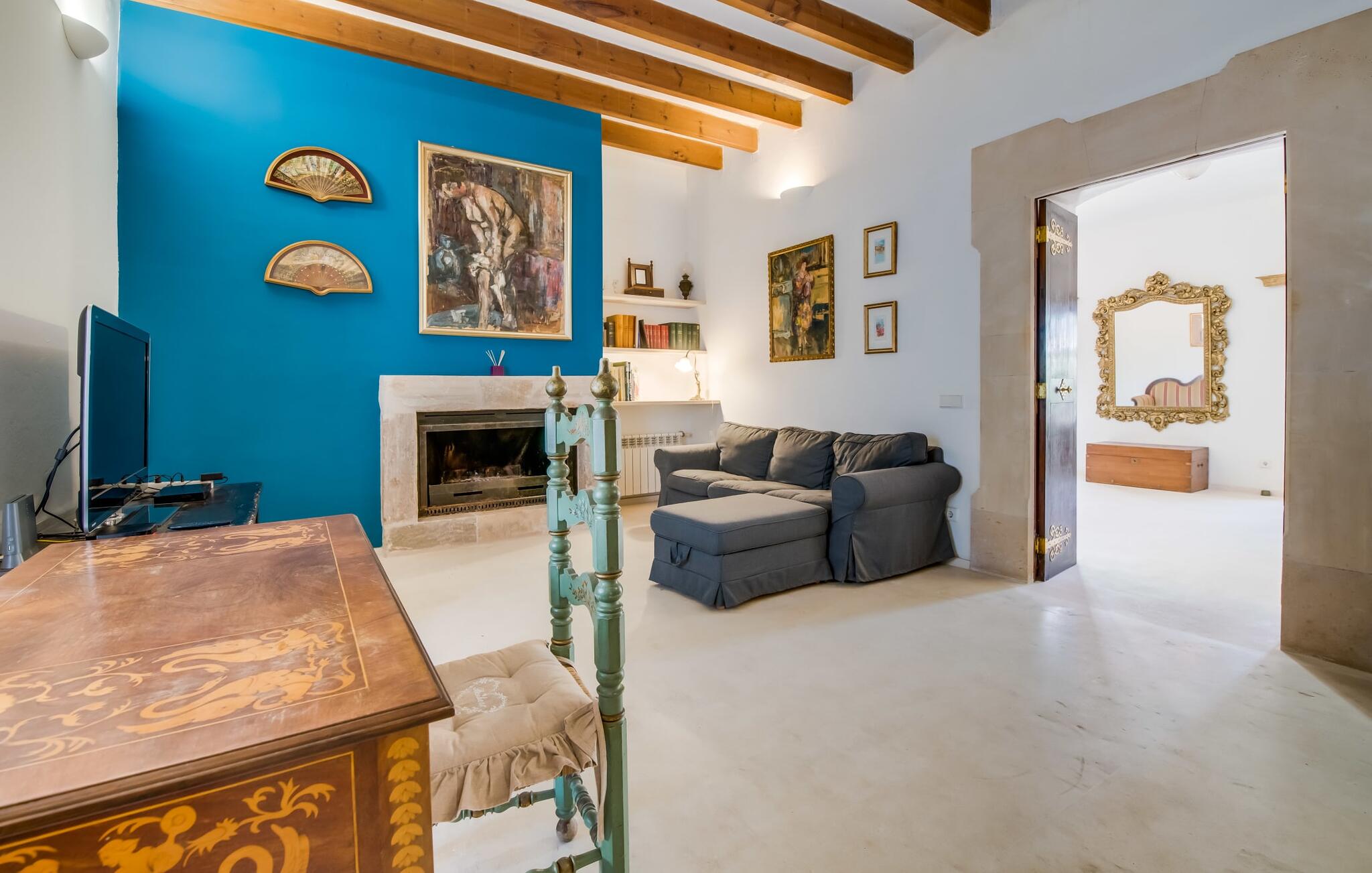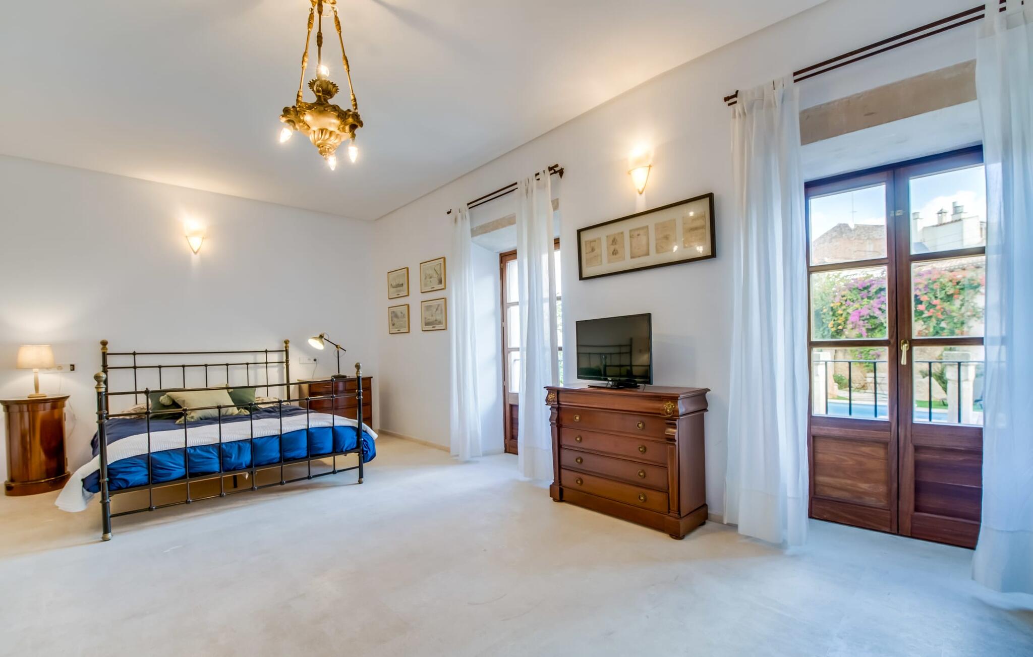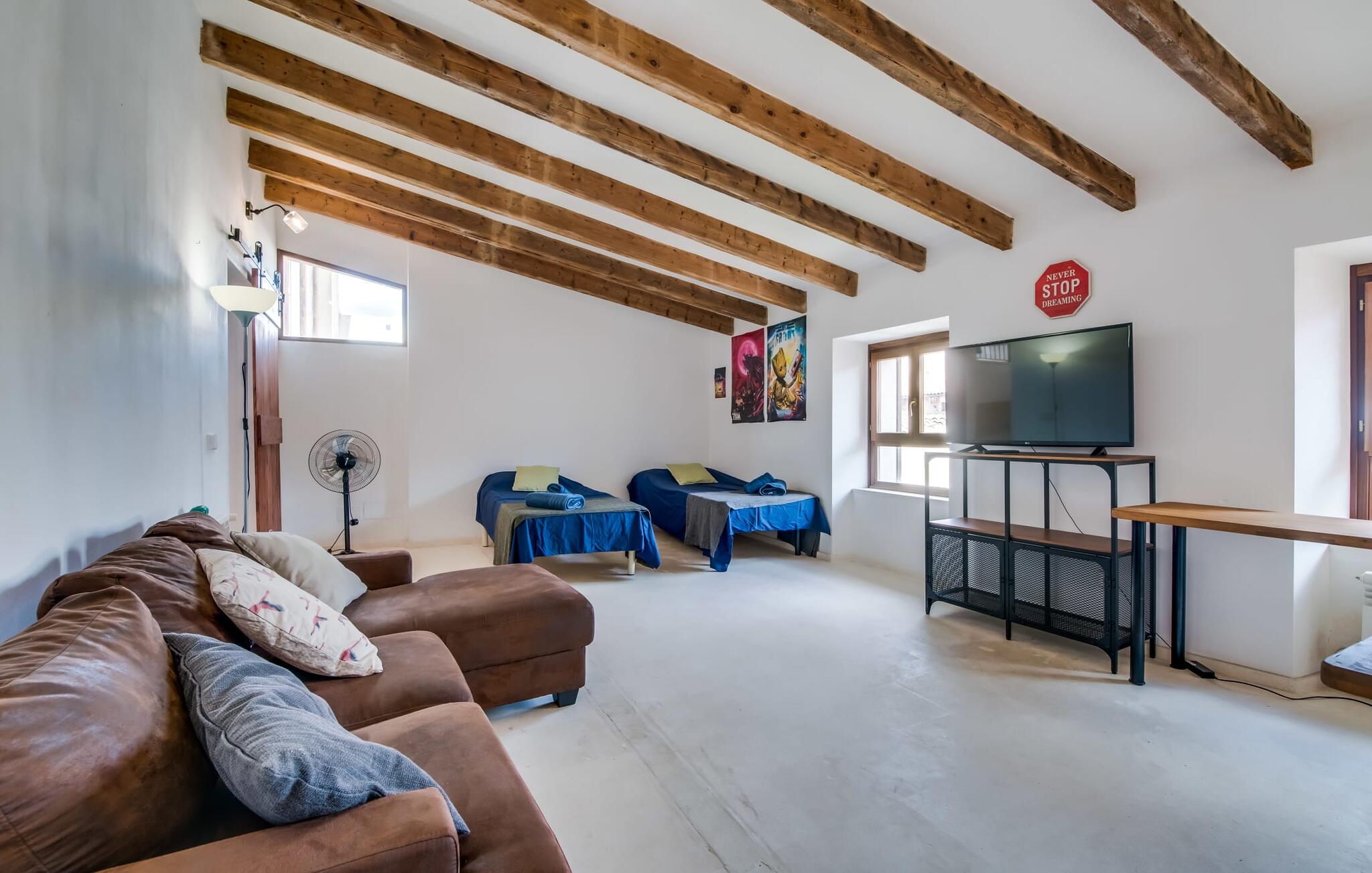 Natuurlijk kun je dit ook binnen doen, in een niet minder euforische sfeer. Mares bogen, breuksteen, gewelfde plafonds en verspringende niveaus vormen de basis voor dit traditionele Mallorcaanse vakantiehuis van absolute topklasse. De combinatie van antieke details en modern comfort, barok en hedendaags design is bijzonder geslaagd. Bezwijk gewoon voor dit charmeoffensief dat je te wachten staat op het gehele verhuurbare oppervlak van een royale 636 m² op vier niveaus. Op de begane grond is er een foyer in overeenstemming met de status van het gebouw, een lichte woonkamer met uitzicht op de binnenplaats, een gezellige lounge met een open haard, een volledig uitgeruste eetkeuken met moderne gemakken en een gastentoilet. De slaapvertrekken zijn verdeeld over de drie bovenste verdiepingen op verspringende niveaus. De slaapkamers vervullen niet alleen hun oorspronkelijke functie, maar zijn door hun grootte ook plekken om je terug te trekken. Ze zijn ook uitgerust met tv`s, sommige met open haard, zithoekjes en inloopkasten enz. De zolderstudio biedt ook een enorme ruimte met fitness- en speeltoestellen tegen de achtergrond van een fantastisch terras. Neem ook zeker een kijkje in de badkamers met hun coole betonlook design en hoogtepunten zoals inloopdouches en het bad in de vloer. Dit spectaculaire herenhuis met zijn doordachte indeling is ideaal om met meerdere gezinnen van je vakantie te genieten!