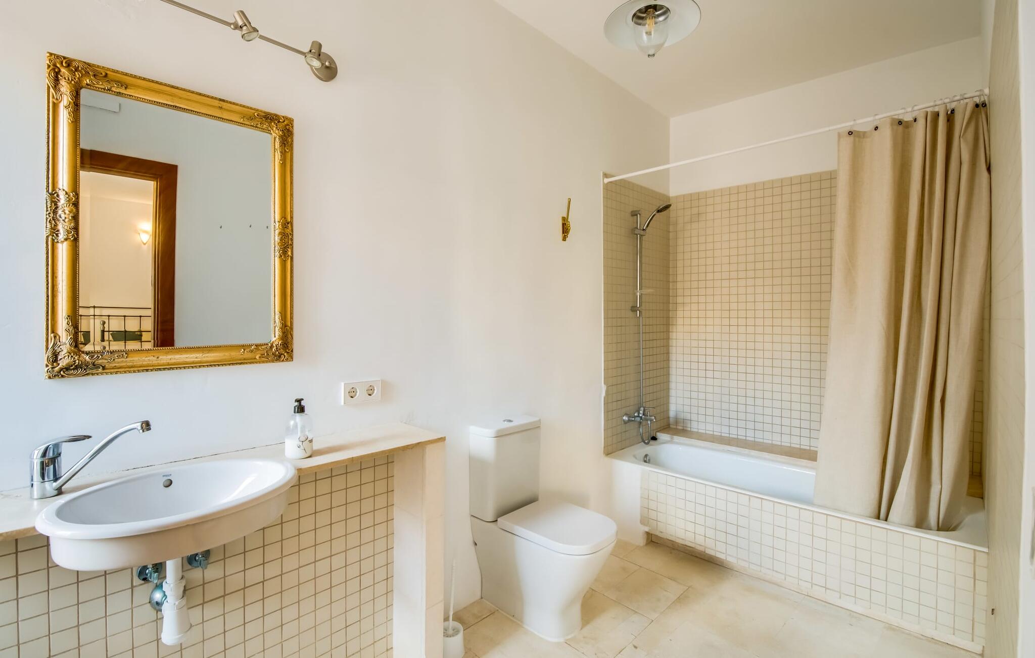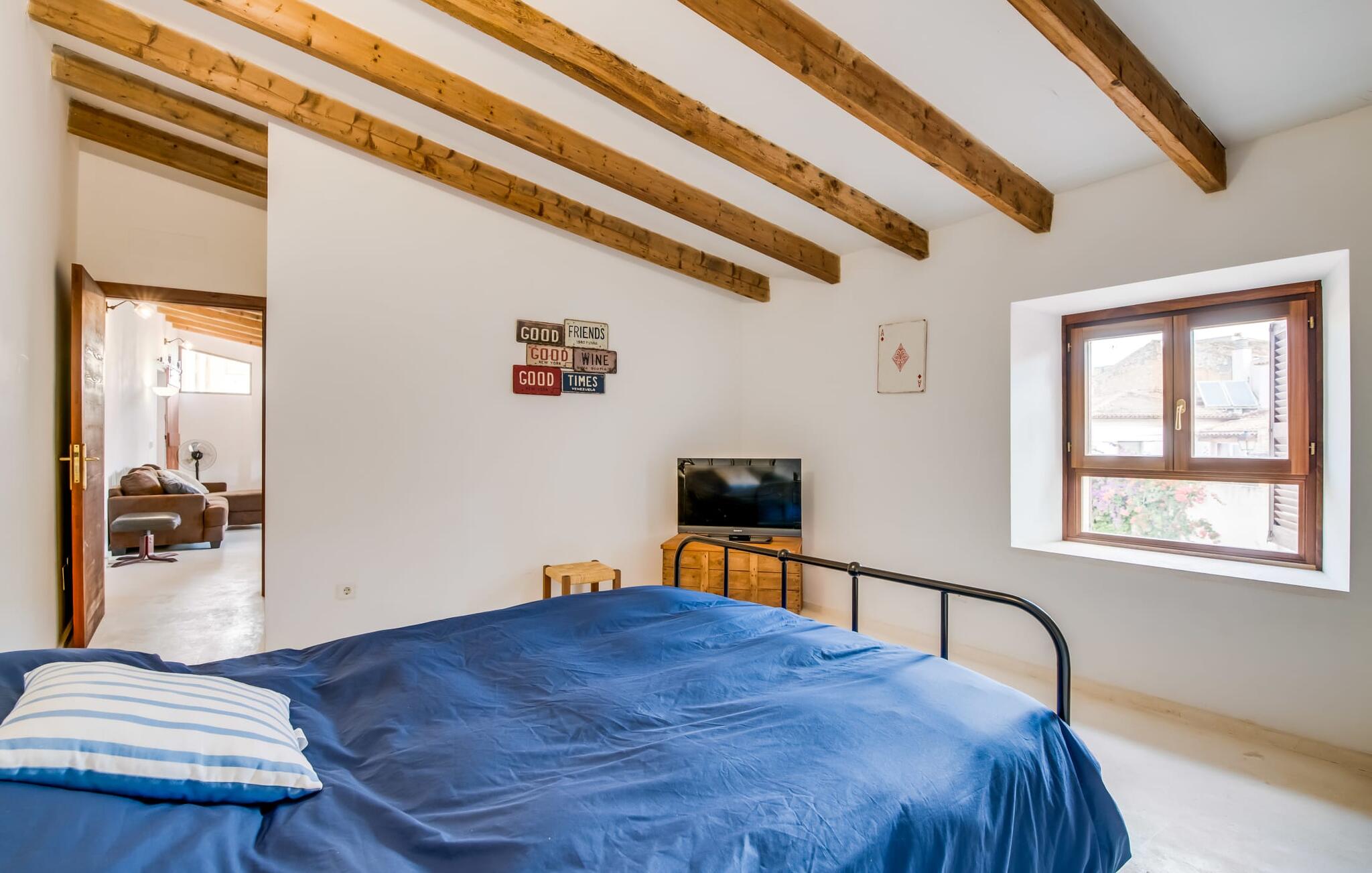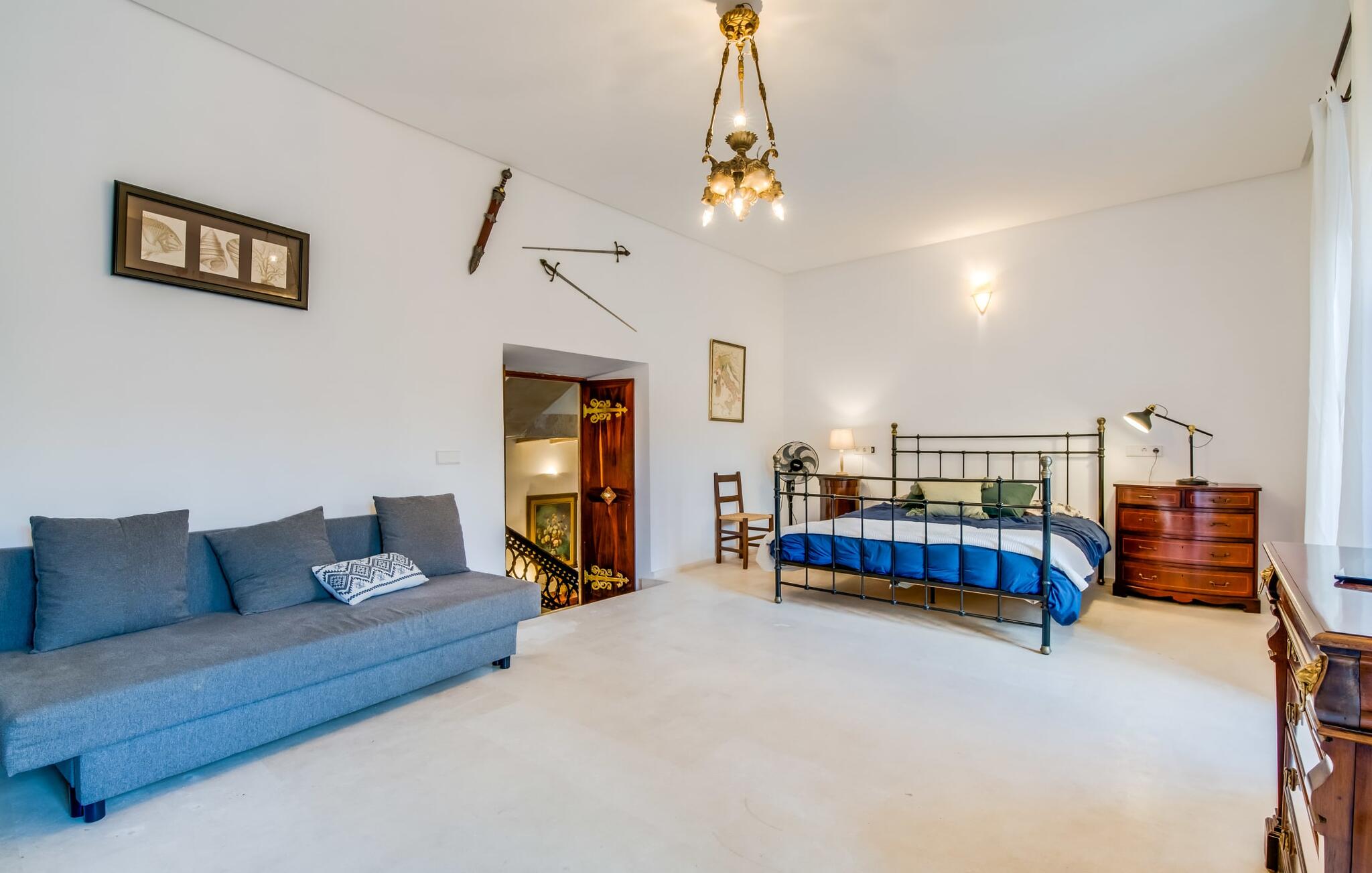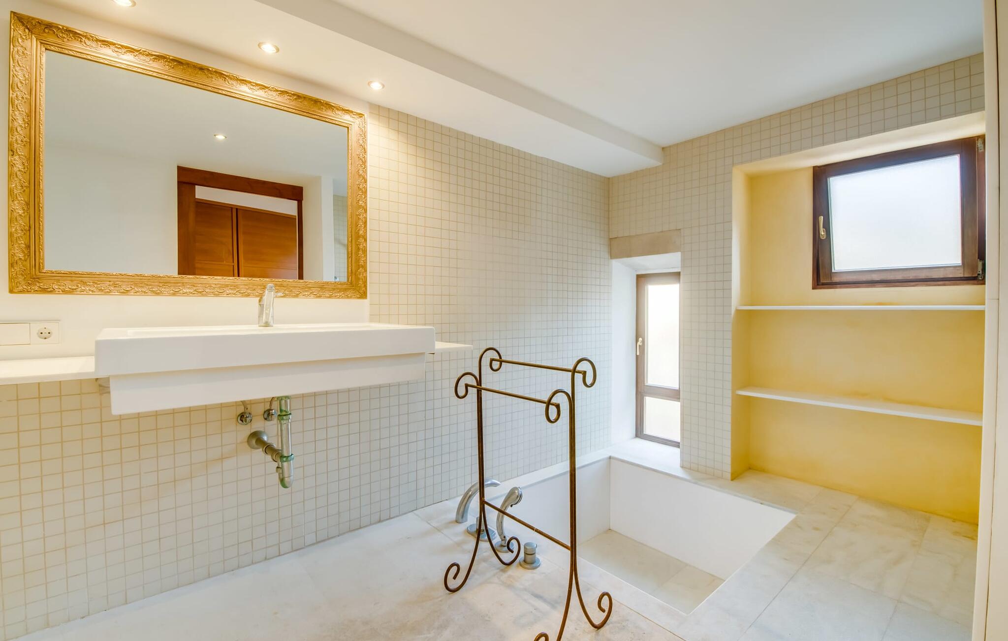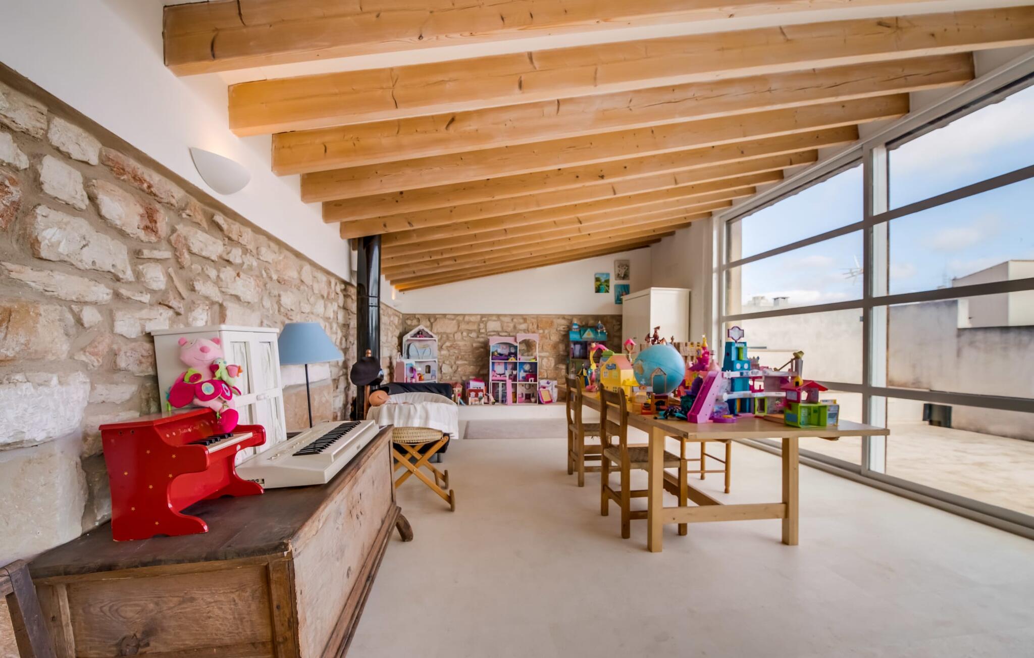 Natuurlijk kun je dit ook binnen doen, in een niet minder euforische sfeer. Mares bogen, breuksteen, gewelfde plafonds en verspringende niveaus vormen de basis voor dit traditionele Mallorcaanse vakantiehuis van absolute topklasse. De combinatie van antieke details en modern comfort, barok en hedendaags design is bijzonder geslaagd. Bezwijk gewoon voor dit charmeoffensief dat je te wachten staat op het gehele verhuurbare oppervlak van een royale 636 m² op vier niveaus. Op de begane grond is er een foyer in overeenstemming met de status van het gebouw, een lichte woonkamer met uitzicht op de binnenplaats, een gezellige lounge met een open haard, een volledig uitgeruste eetkeuken met moderne gemakken en een gastentoilet. De slaapvertrekken zijn verdeeld over de drie bovenste verdiepingen op verspringende niveaus. De slaapkamers vervullen niet alleen hun oorspronkelijke functie, maar zijn door hun grootte ook plekken om je terug te trekken. Ze zijn ook uitgerust met tv`s, sommige met open haard, zithoekjes en inloopkasten enz. De zolderstudio biedt ook een enorme ruimte met fitness- en speeltoestellen tegen de achtergrond van een fantastisch terras. Neem ook zeker een kijkje in de badkamers met hun coole betonlook design en hoogtepunten zoals inloopdouches en het bad in de vloer. Dit spectaculaire herenhuis met zijn doordachte indeling is ideaal om met meerdere gezinnen van je vakantie te genieten!