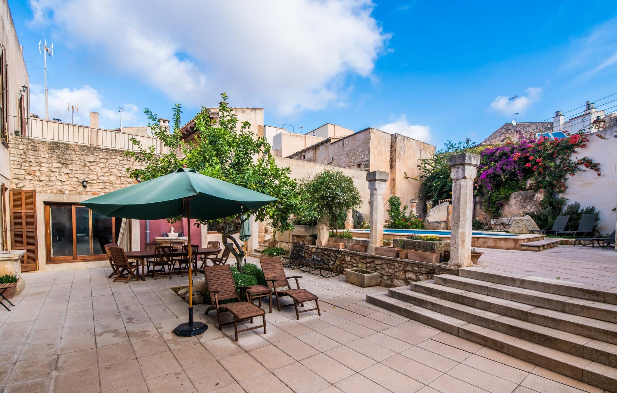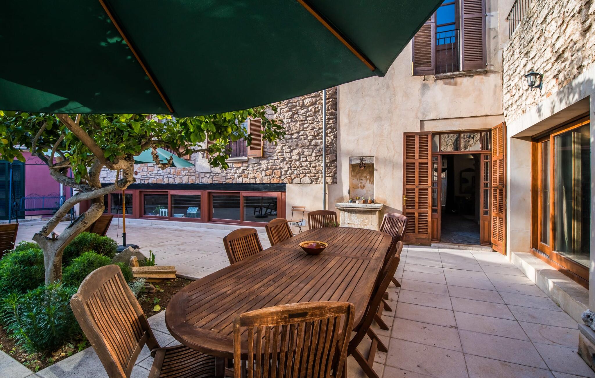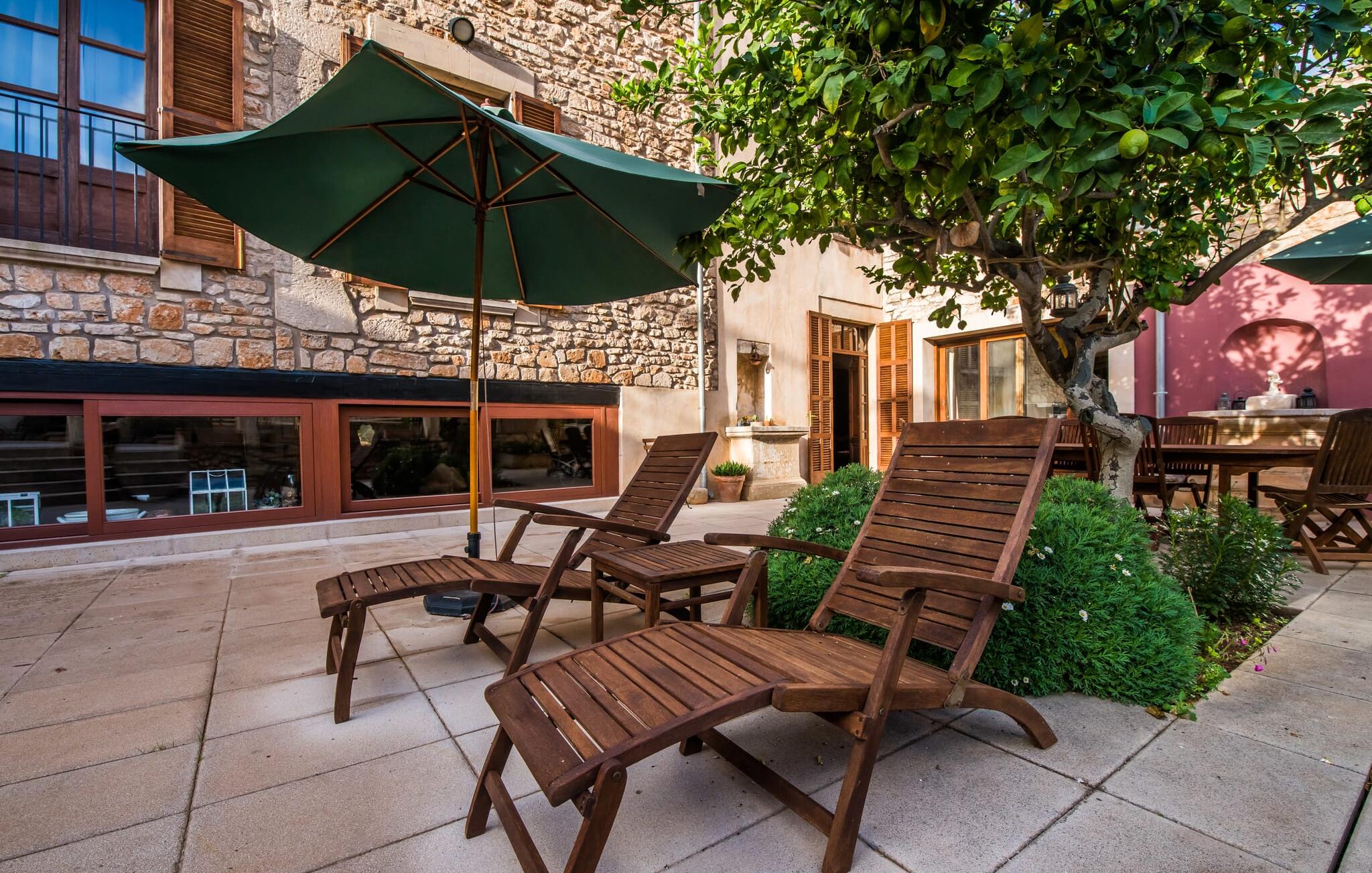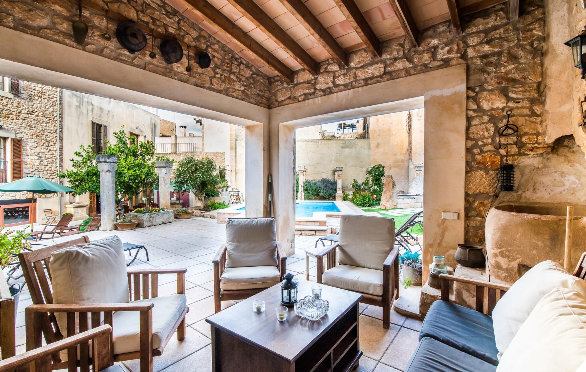 De term "herenhuis" is een bijna ontoereikende beschrijving van de overweldigende schoonheid van het traditionele landgoed Cal Senyor Damia. Dit statige pand met meer dan 600 m² woonoppervlak is een van die huizen van goudkleurig zandsteen die je normaal gesproken alleen van de buitenkant kunt bewonderen tijdens een dagtrip naar Santanyí. Wat je van buiten niet ziet, is de absoluut privacy-beschermde binnenplaats in al zijn pracht en praal. Dit biedt een privé-retraite in een ongelooflijk charmante sfeer. Je leert het echte Mallorca kennen in zijn spannende geschiedenis. Cal Senyor Damia zal je iets vertellen over het niet altijd rustige leven in de stad zoals het gisteren was en nu nog steeds is. Weelderige bloeiende planten, citrusbomen en talloze planten sieren het historische zandsteen en bieden je heerlijke privacy. Mooie zitgroepen langs oude muren, terrassen, cafétafels en een gemetselde barbecue geven de binnenplaats zijn prachtige uitstraling. Het licht en de sfeer worden versterkt door antieke relikwieën zoals zuilen, fonteinen op de binnenplaats, landbouwwerktuigen en een overdekte lounge. Je kunt kiezen uit verschillende eethoeken om op elk moment van de dag te genieten van de hartige lekkernijen van de gemetselde barbecue.