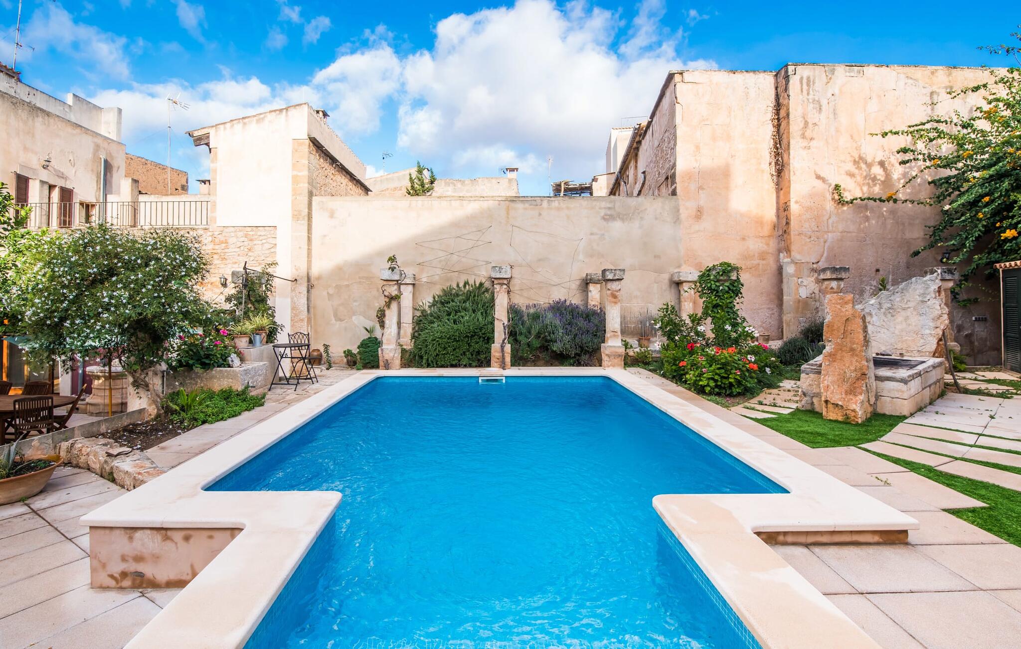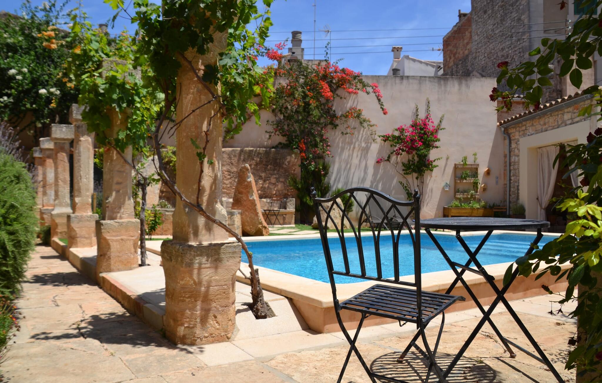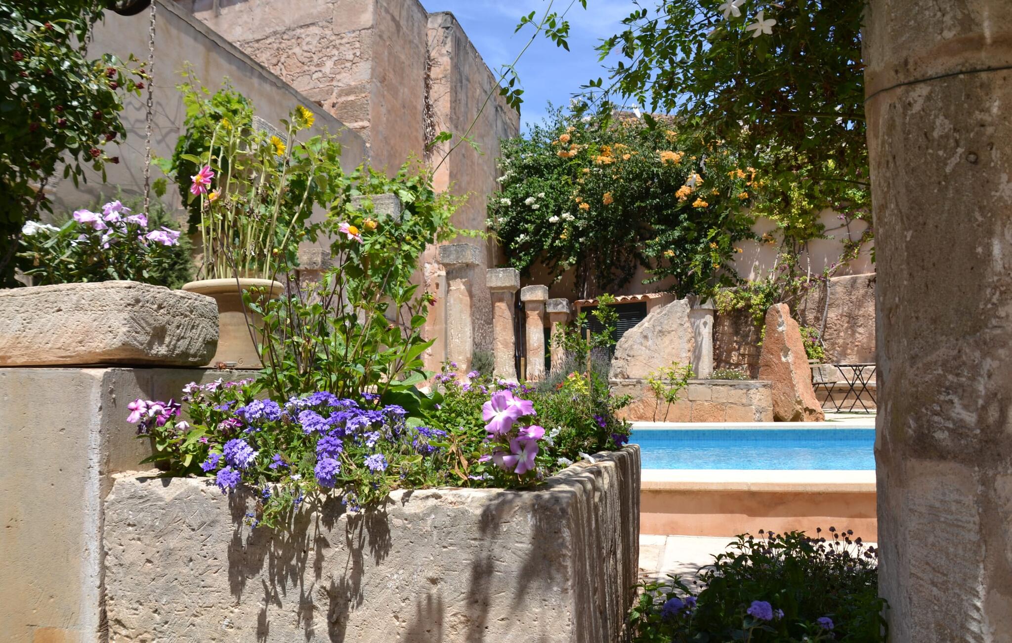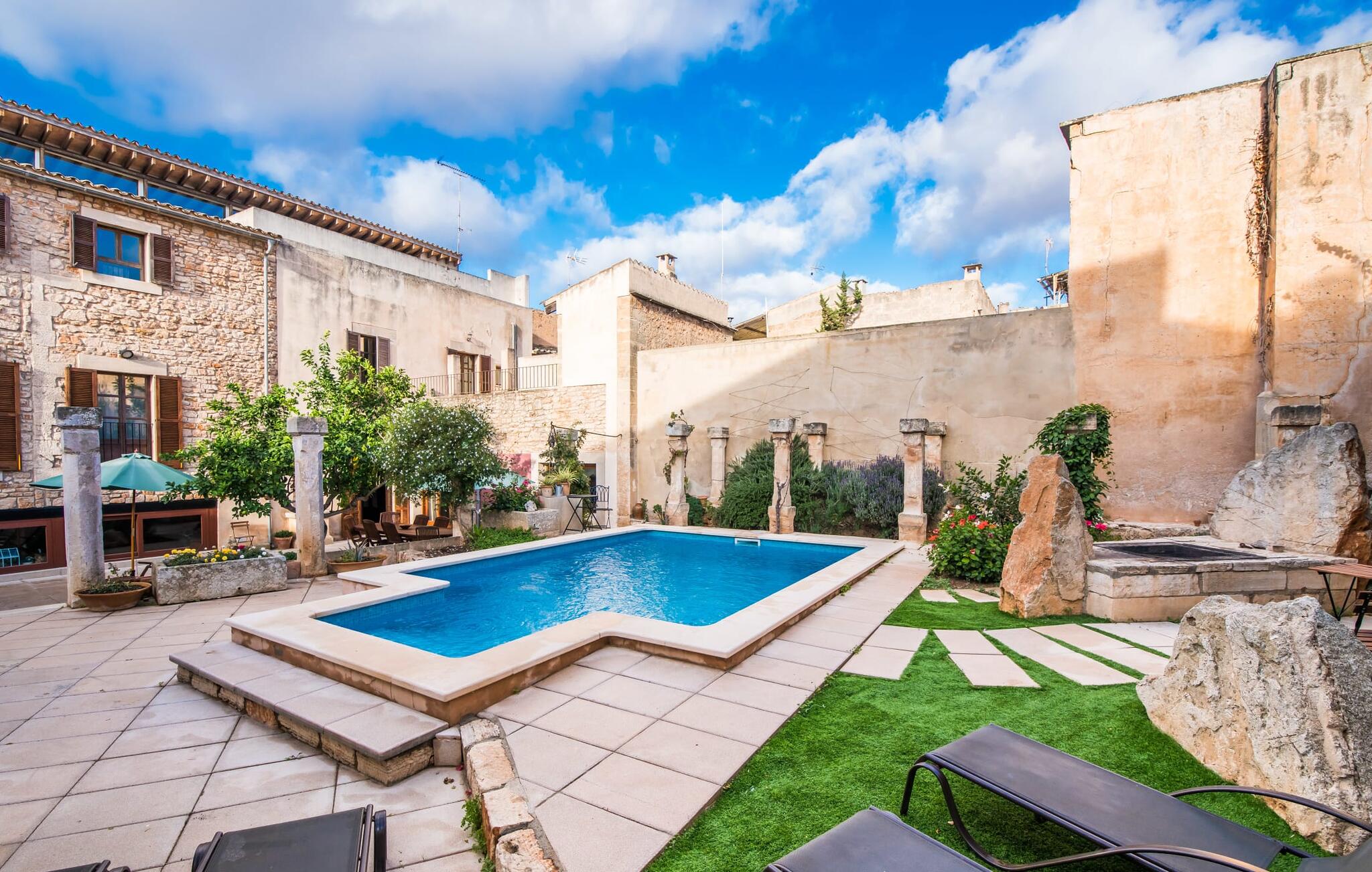 De term "herenhuis" is een bijna ontoereikende beschrijving van de overweldigende schoonheid van het traditionele landgoed Cal Senyor Damia. Dit statige pand met meer dan 600 m² woonoppervlak is een van die huizen van goudkleurig zandsteen die je normaal gesproken alleen van de buitenkant kunt bewonderen tijdens een dagtrip naar Santanyí. Wat je van buiten niet ziet, is de absoluut privacy-beschermde binnenplaats in al zijn pracht en praal. Dit biedt een privé-retraite in een ongelooflijk charmante sfeer. Je leert het echte Mallorca kennen in zijn spannende geschiedenis. Cal Senyor Damia zal je iets vertellen over het niet altijd rustige leven in de stad zoals het gisteren was en nu nog steeds is. Weelderige bloeiende planten, citrusbomen en talloze planten sieren het historische zandsteen en bieden je heerlijke privacy. Mooie zitgroepen langs oude muren, terrassen, cafétafels en een gemetselde barbecue geven de binnenplaats zijn prachtige uitstraling. Het licht en de sfeer worden versterkt door antieke relikwieën zoals zuilen, fonteinen op de binnenplaats, landbouwwerktuigen en een overdekte lounge. Je kunt kiezen uit verschillende eethoeken om op elk moment van de dag te genieten van de hartige lekkernijen van de gemetselde barbecue.