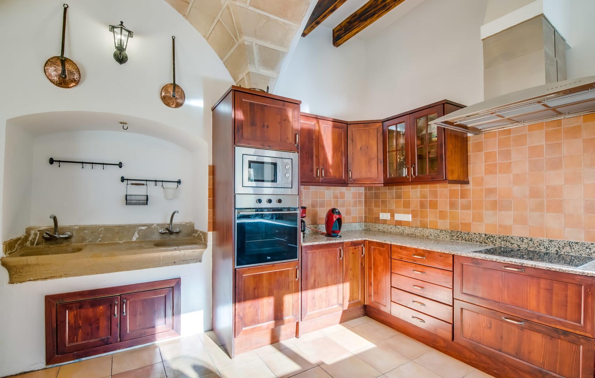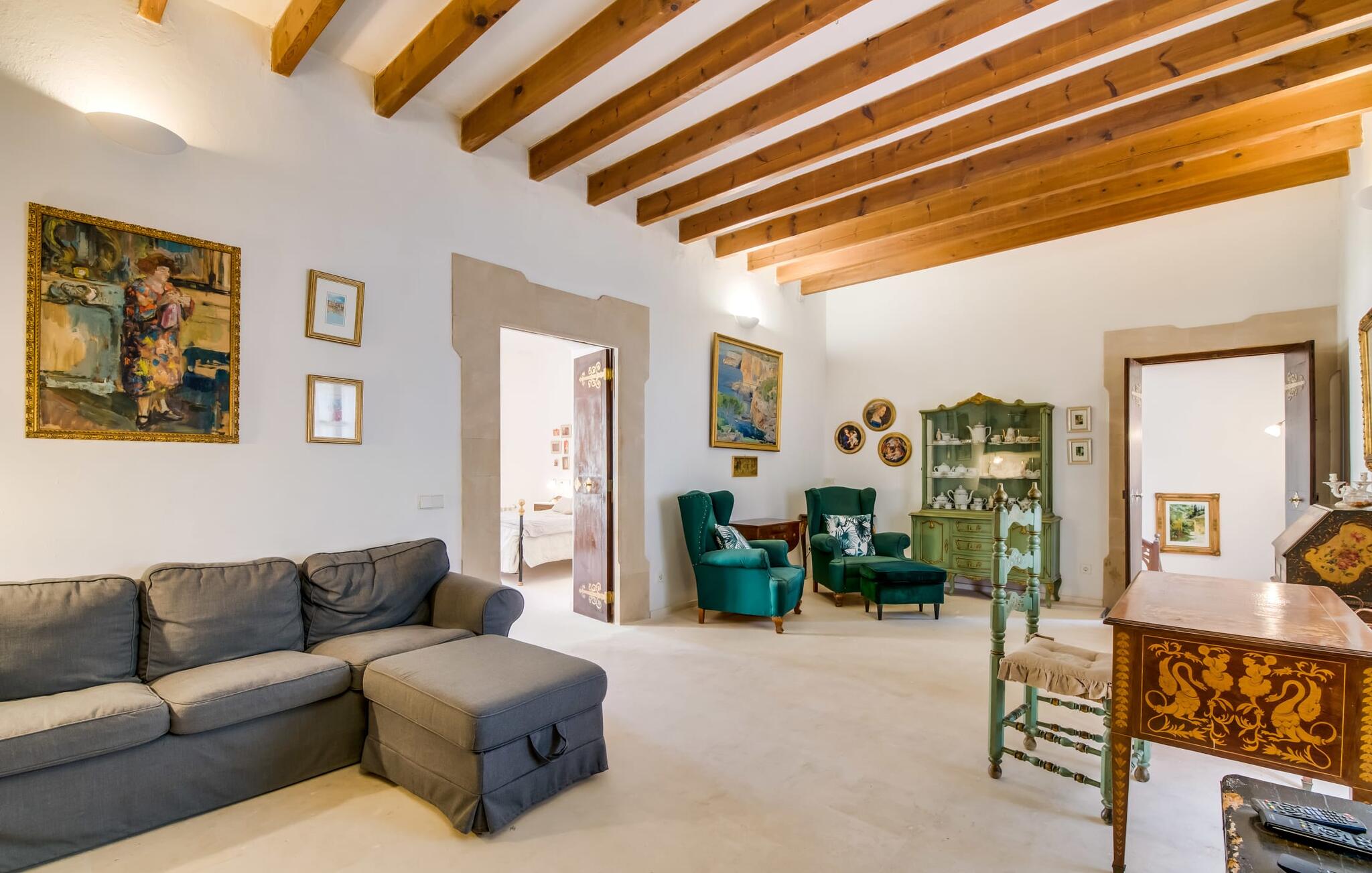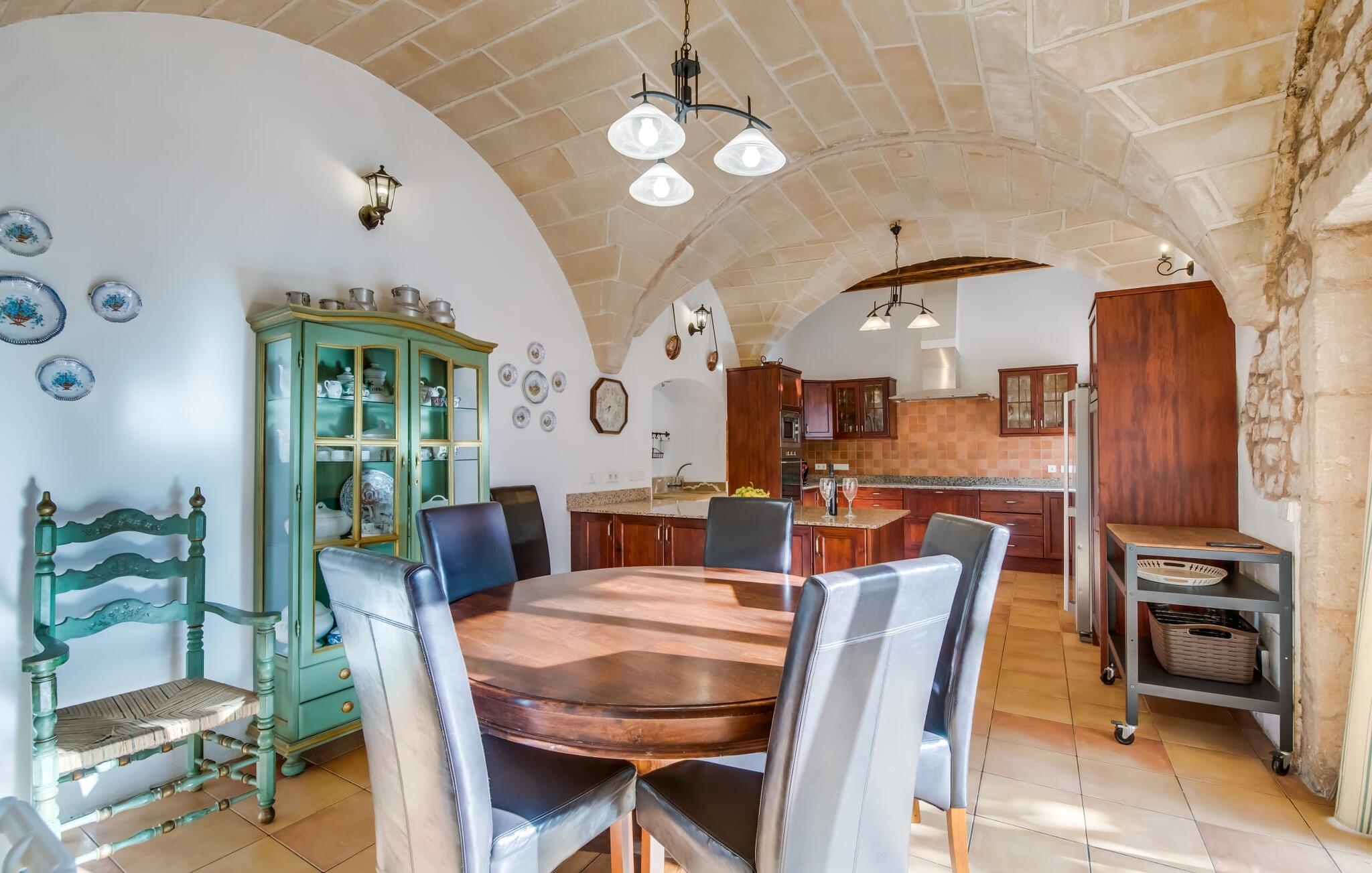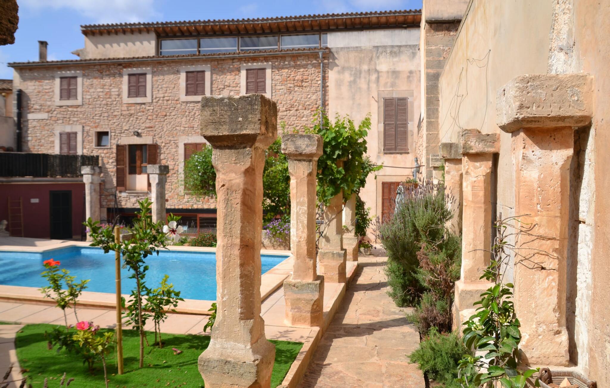 De term "herenhuis" is een bijna ontoereikende beschrijving van de overweldigende schoonheid van het traditionele landgoed Cal Senyor Damia. Dit statige pand met meer dan 600 m² woonoppervlak is een van die huizen van goudkleurig zandsteen die je normaal gesproken alleen van de buitenkant kunt bewonderen tijdens een dagtrip naar Santanyí. Wat je van buiten niet ziet, is de absoluut privacy-beschermde binnenplaats in al zijn pracht en praal. Dit biedt een privé-retraite in een ongelooflijk charmante sfeer. Je leert het echte Mallorca kennen in zijn spannende geschiedenis. Cal Senyor Damia zal je iets vertellen over het niet altijd rustige leven in de stad zoals het gisteren was en nu nog steeds is. Weelderige bloeiende planten, citrusbomen en talloze planten sieren het historische zandsteen en bieden je heerlijke privacy. Mooie zitgroepen langs oude muren, terrassen, cafétafels en een gemetselde barbecue geven de binnenplaats zijn prachtige uitstraling. Het licht en de sfeer worden versterkt door antieke relikwieën zoals zuilen, fonteinen op de binnenplaats, landbouwwerktuigen en een overdekte lounge. Je kunt kiezen uit verschillende eethoeken om op elk moment van de dag te genieten van de hartige lekkernijen van de gemetselde barbecue.