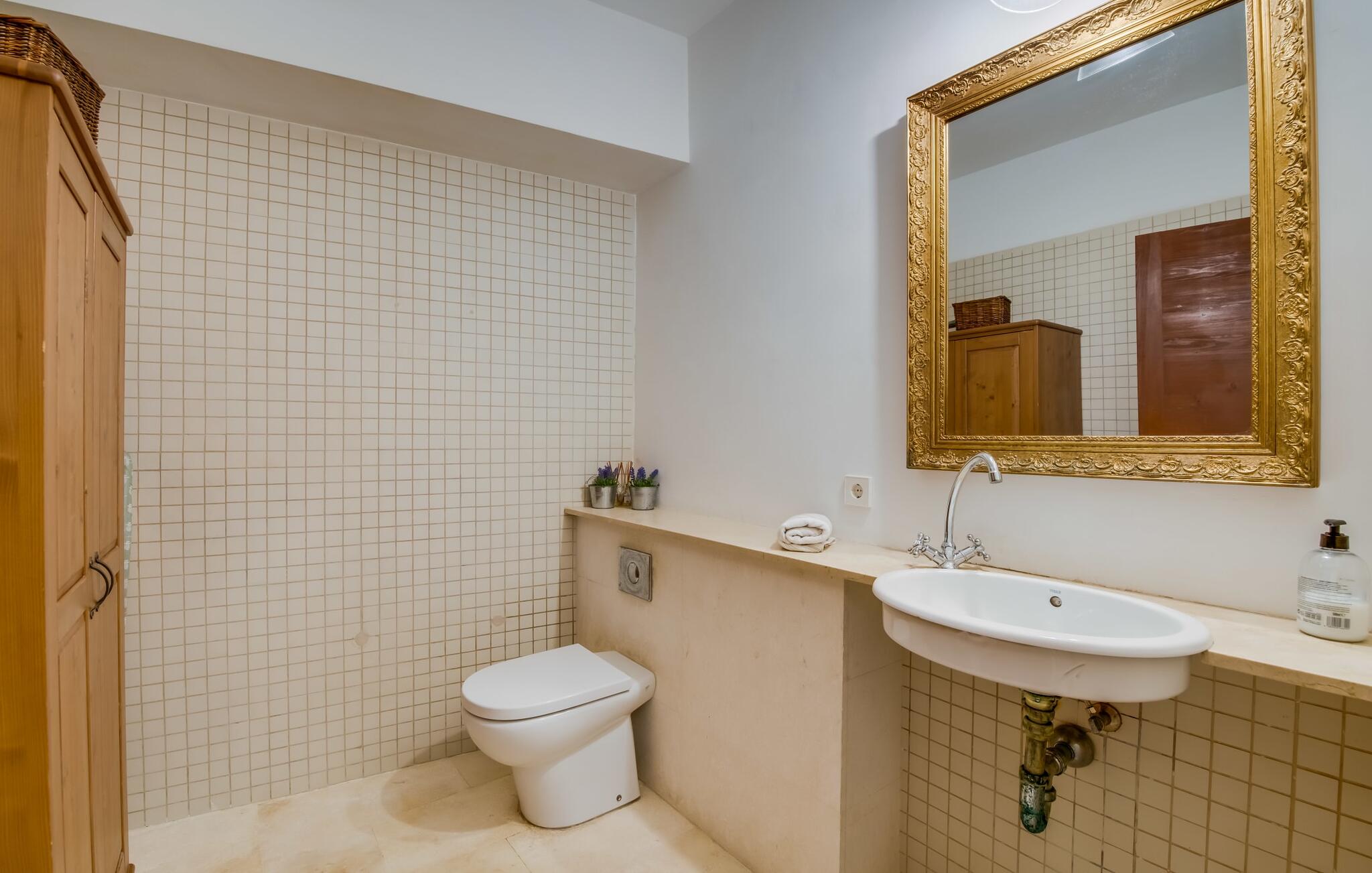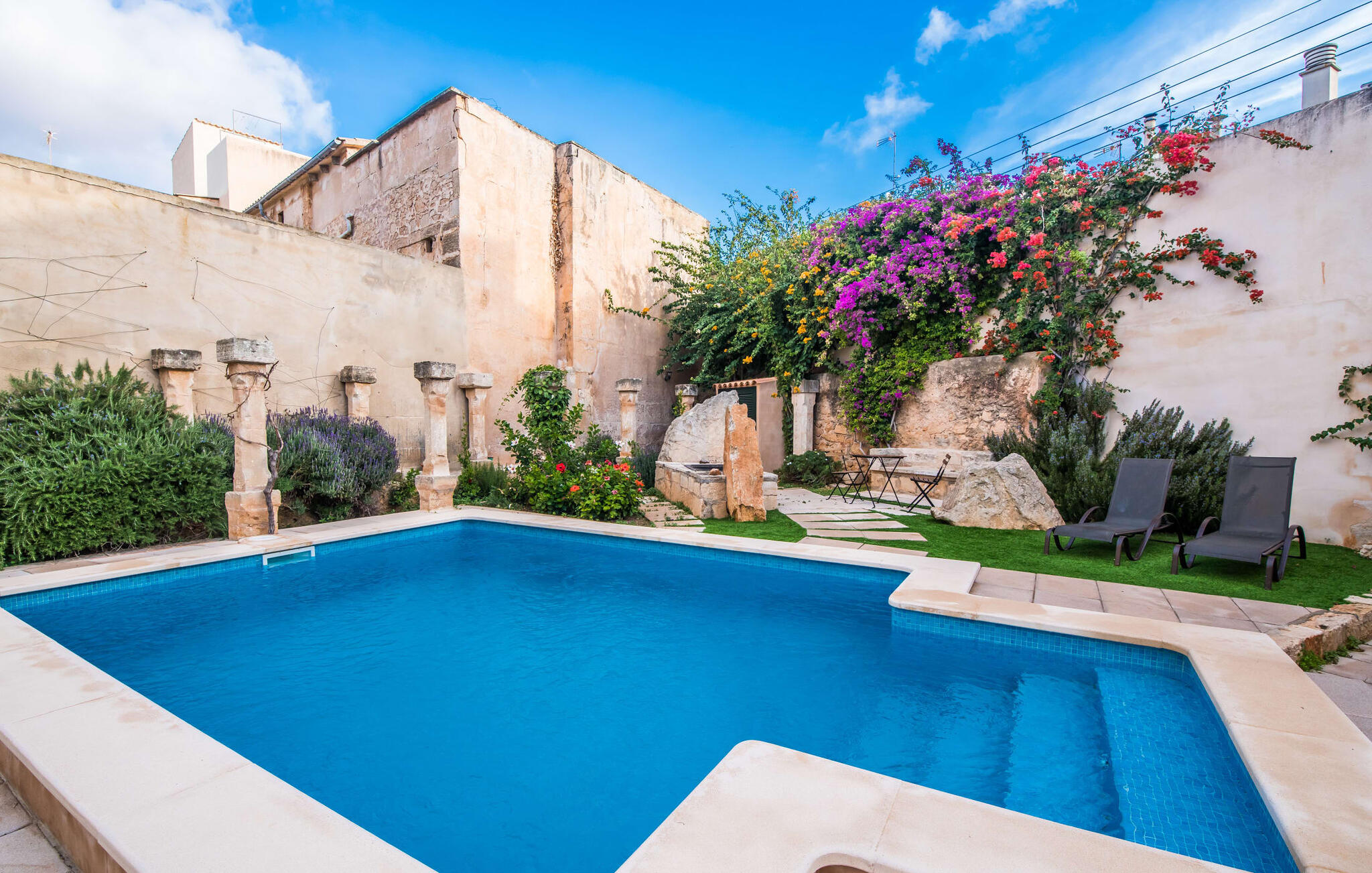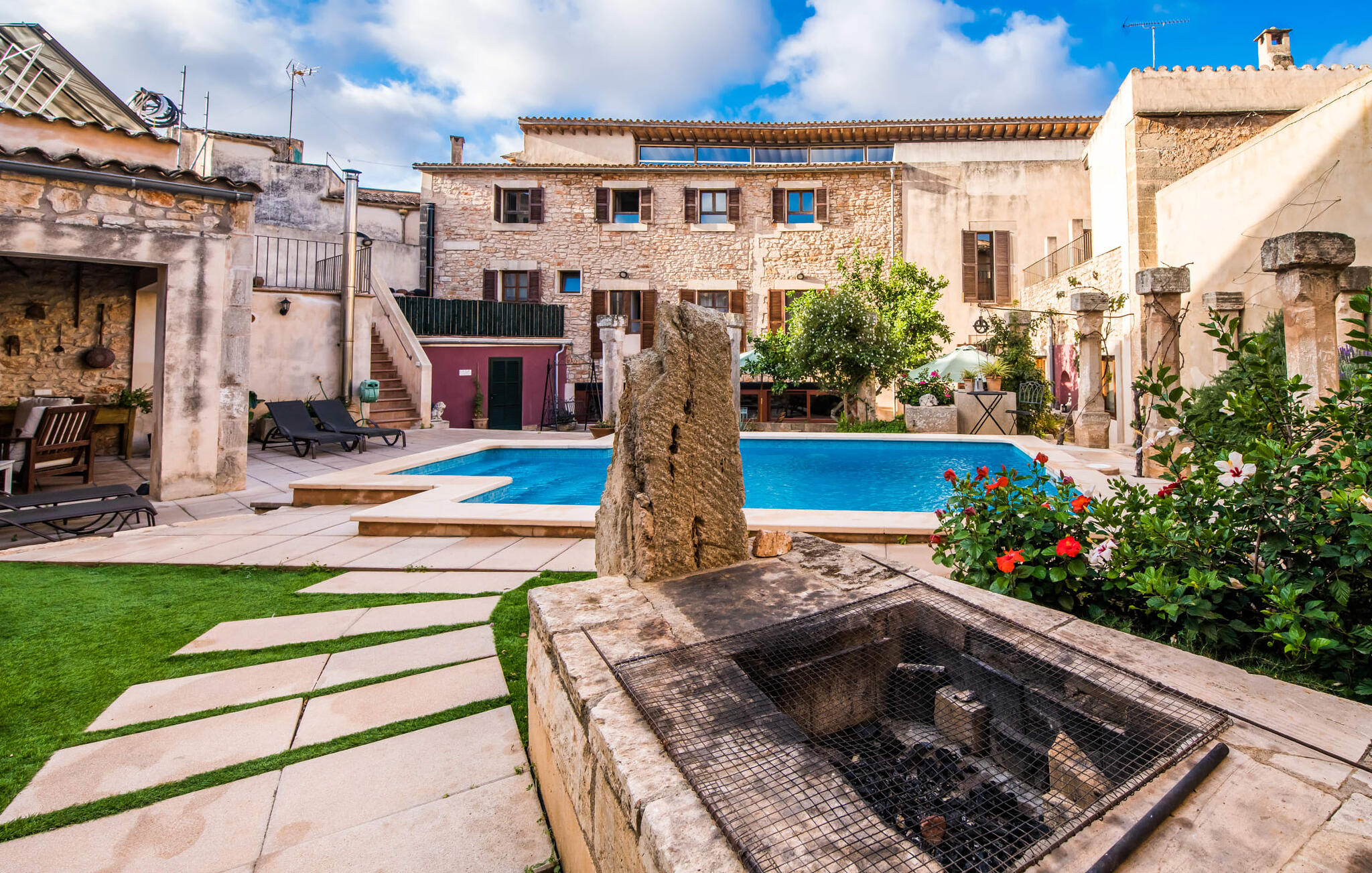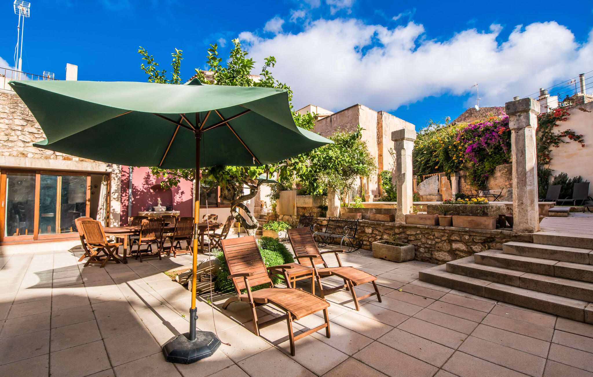 De term "herenhuis" is een bijna ontoereikende beschrijving van de overweldigende schoonheid van het traditionele landgoed Cal Senyor Damia. Dit statige pand met meer dan 600 m² woonoppervlak is een van die huizen van goudkleurig zandsteen die je normaal gesproken alleen van de buitenkant kunt bewonderen tijdens een dagtrip naar Santanyí. Wat je van buiten niet ziet, is de absoluut privacy-beschermde binnenplaats in al zijn pracht en praal. Dit biedt een privé-retraite in een ongelooflijk charmante sfeer. Je leert het echte Mallorca kennen in zijn spannende geschiedenis. Cal Senyor Damia zal je iets vertellen over het niet altijd rustige leven in de stad zoals het gisteren was en nu nog steeds is. Weelderige bloeiende planten, citrusbomen en talloze planten sieren het historische zandsteen en bieden je heerlijke privacy. Mooie zitgroepen langs oude muren, terrassen, cafétafels en een gemetselde barbecue geven de binnenplaats zijn prachtige uitstraling. Het licht en de sfeer worden versterkt door antieke relikwieën zoals zuilen, fonteinen op de binnenplaats, landbouwwerktuigen en een overdekte lounge. Je kunt kiezen uit verschillende eethoeken om op elk moment van de dag te genieten van de hartige lekkernijen van de gemetselde barbecue.