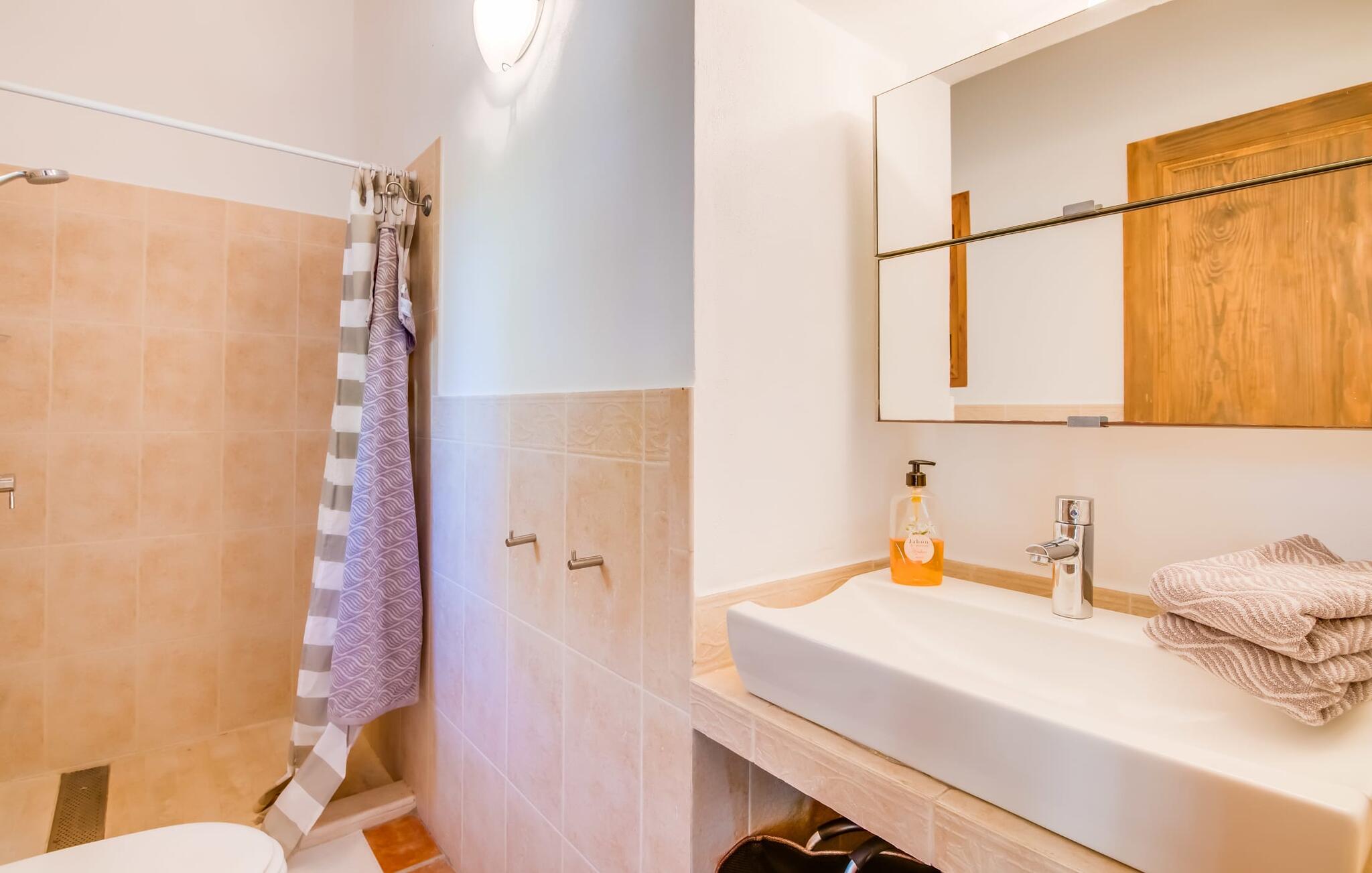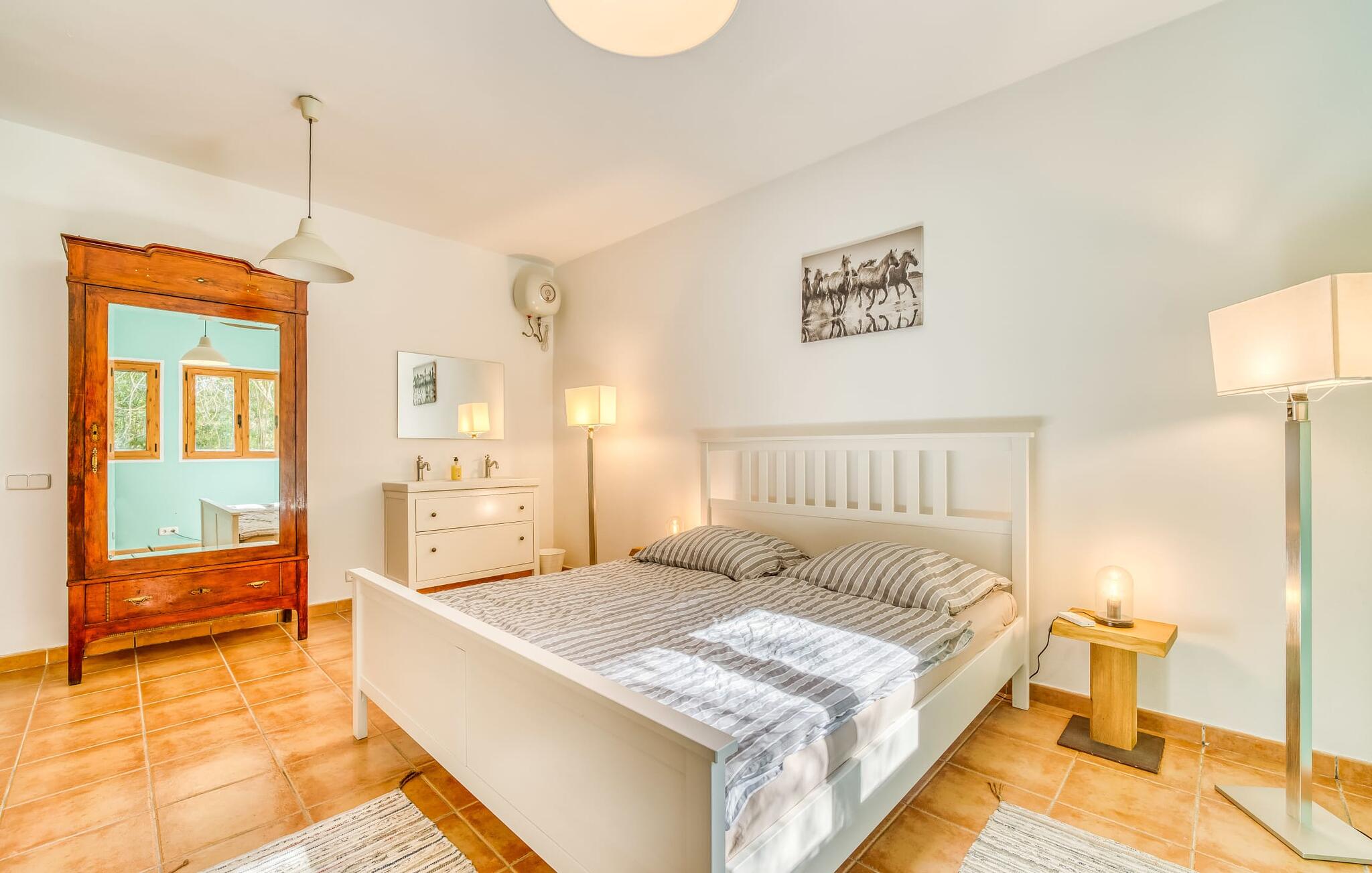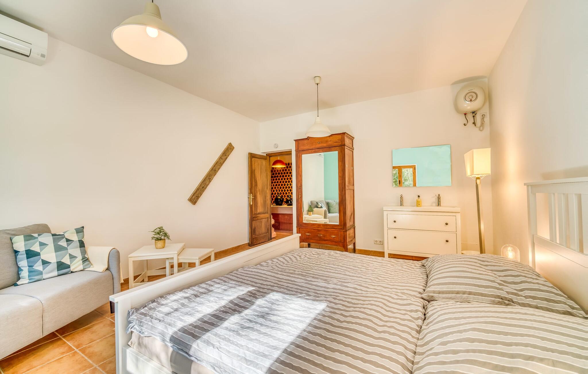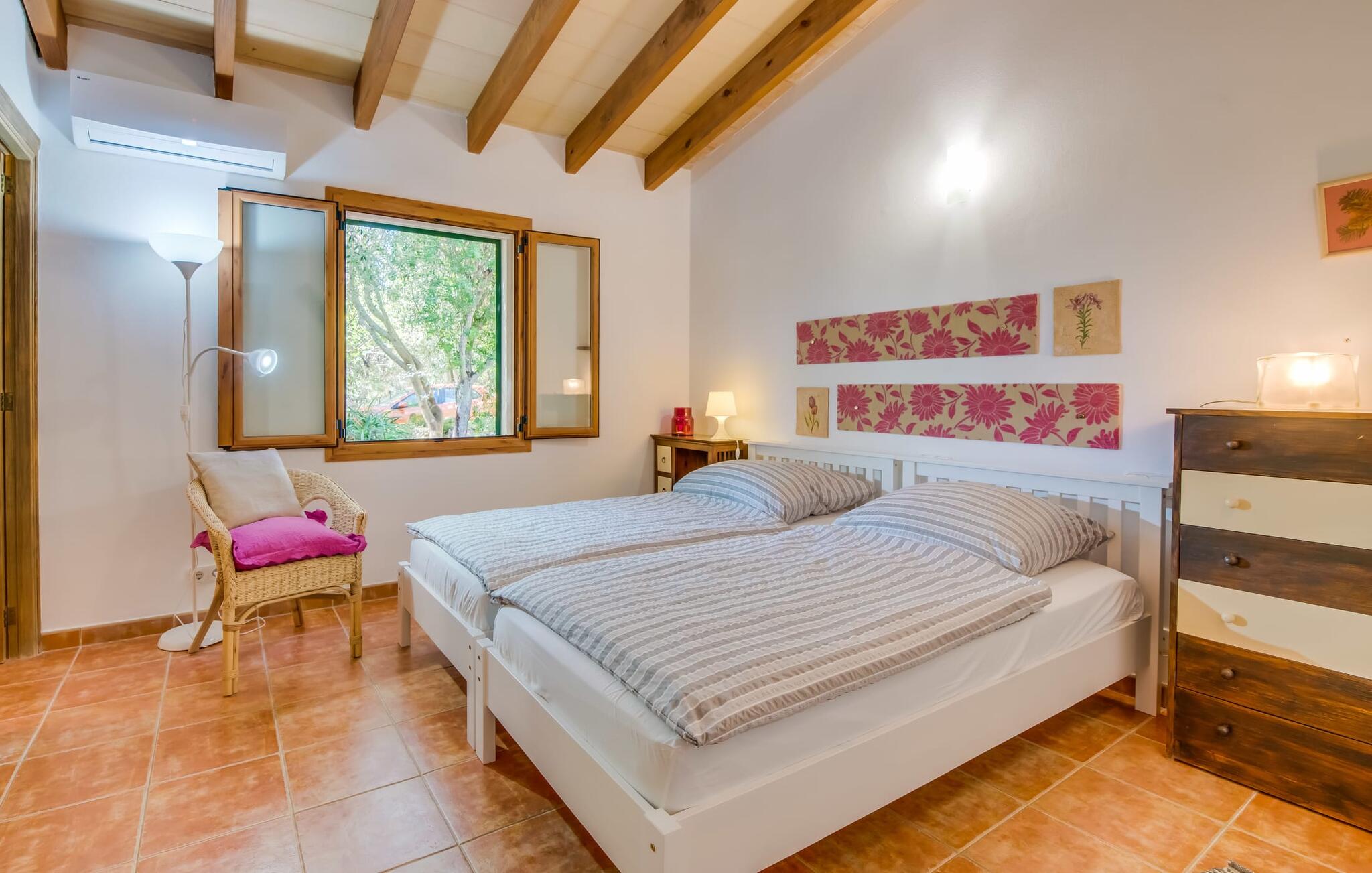 De belangrijkste woonruimte heeft een lichte, open indeling met een gezellige woonkamer met open haard en directe toegang tot het terras bij het zwembad. Een uitnodigende eethoek grenst aan een van de natuurstenen terrassen, terwijl de lichte keuken een eigen eethoek heeft en toegang tot het zwembad. Er zijn drie tweepersoonsslaapkamers op dit niveau, waarvan twee met en-suite badkamer, evenals een aparte badkamer. Een vierde tweepersoonsslaapkamer met wastafel is toegankelijk vanuit de tuin. Het huis is uitgerust met airconditioning en verwarming, waardoor Can Baldo ideaal is voor twee gezinnen of vrienden die samen een ontspannen vakantie willen doorbrengen.