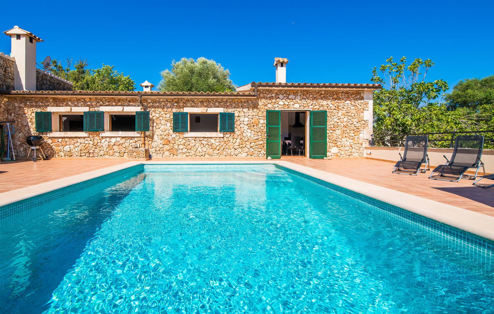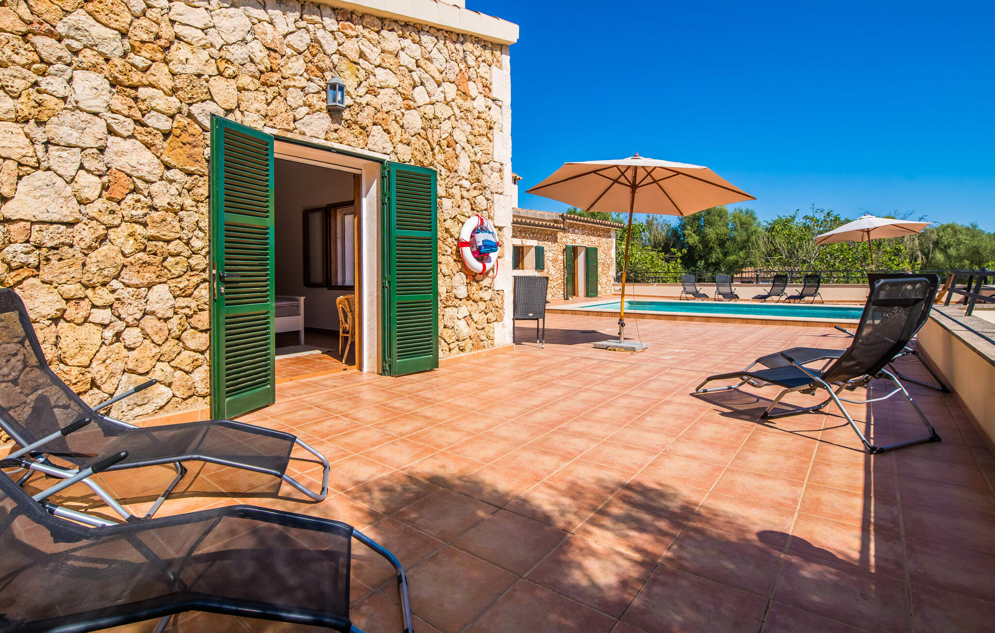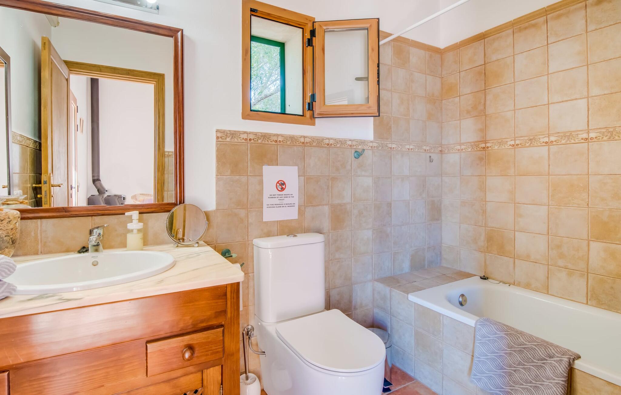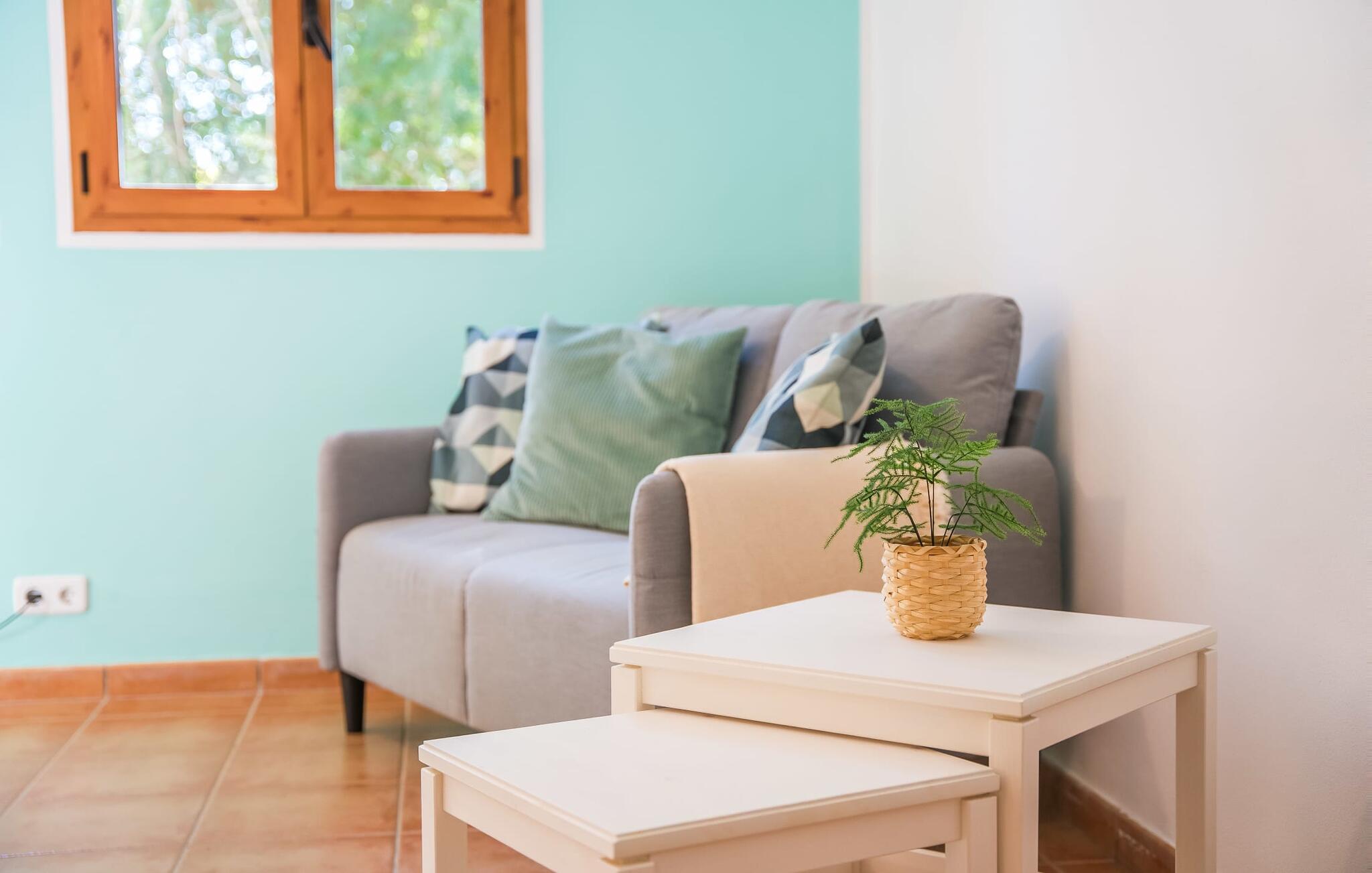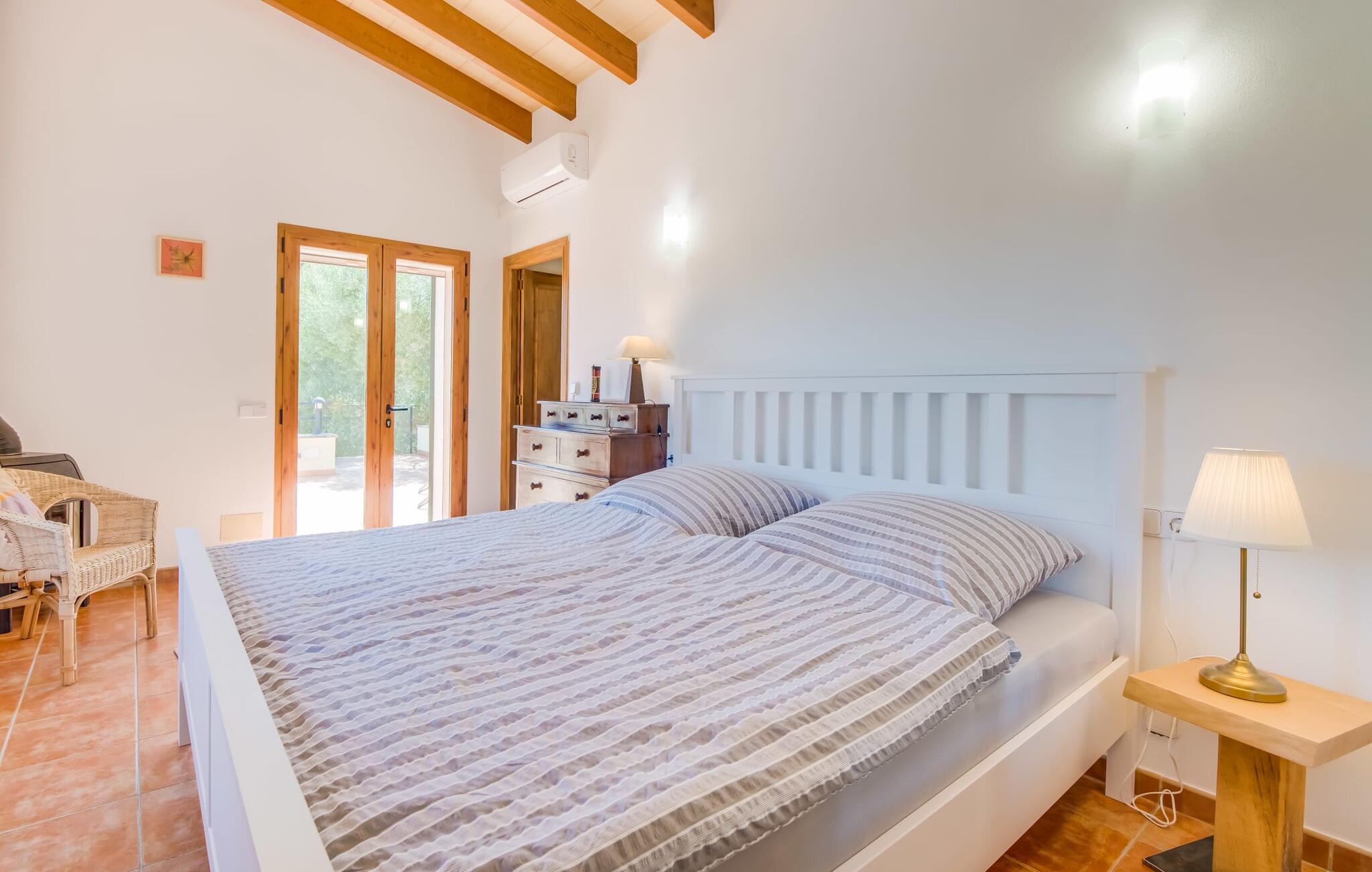 De belangrijkste woonruimte heeft een lichte, open indeling met een gezellige woonkamer met open haard en directe toegang tot het terras bij het zwembad. Een uitnodigende eethoek grenst aan een van de natuurstenen terrassen, terwijl de lichte keuken een eigen eethoek heeft en toegang tot het zwembad. Er zijn drie tweepersoonsslaapkamers op dit niveau, waarvan twee met en-suite badkamer, evenals een aparte badkamer. Een vierde tweepersoonsslaapkamer met wastafel is toegankelijk vanuit de tuin. Het huis is uitgerust met airconditioning en verwarming, waardoor Can Baldo ideaal is voor twee gezinnen of vrienden die samen een ontspannen vakantie willen doorbrengen.