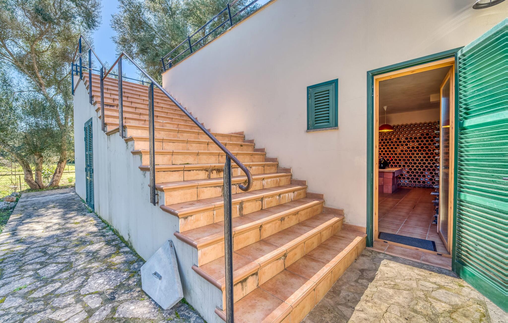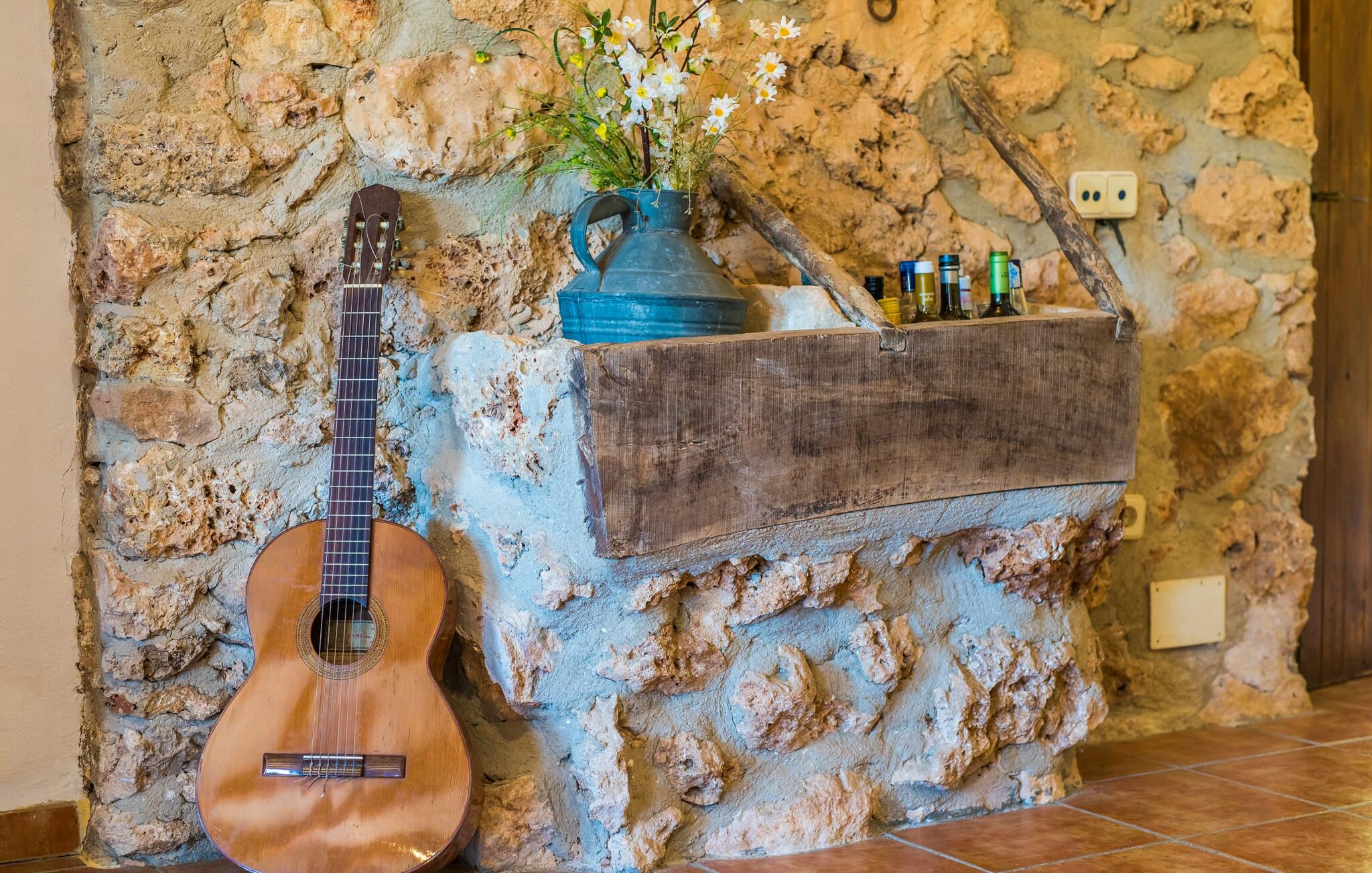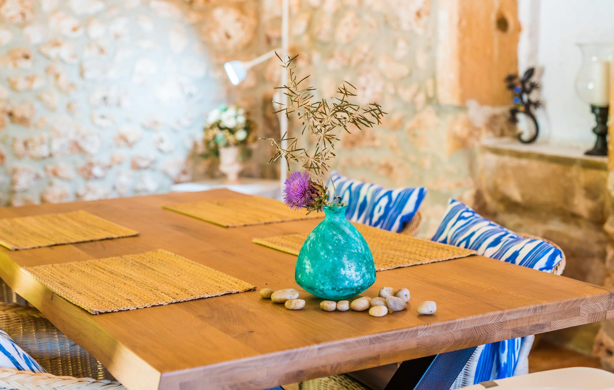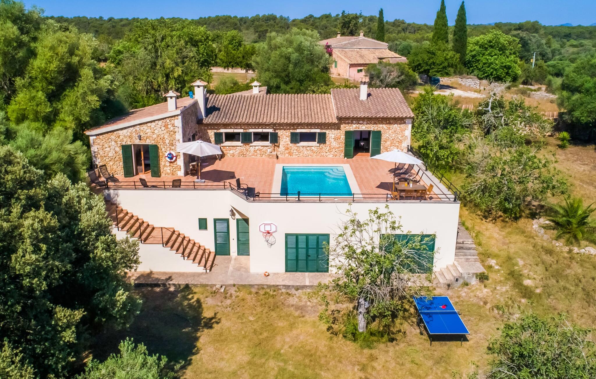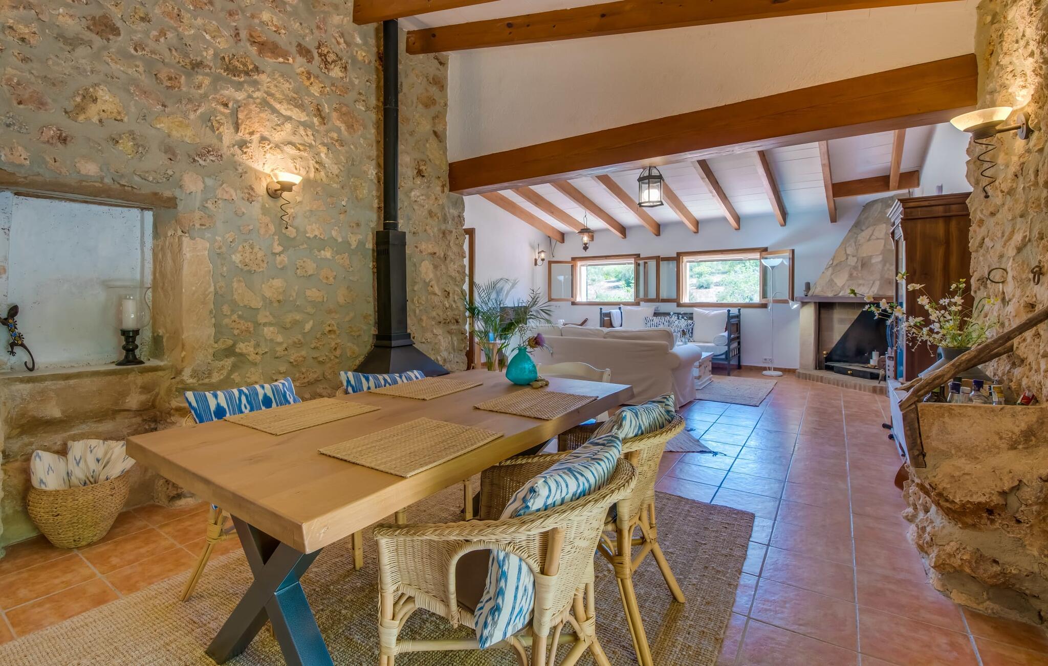 Het vakantiehuis Can Baldo, genesteld op een lichte helling, biedt een betoverend toevluchtsoord in het hart van Mallorca. Het belangrijkste woongedeelte heeft een betoverende natuurstenen gevel en biedt een adembenemend uitzicht op het omliggende landschap van pijnbomen en velden.